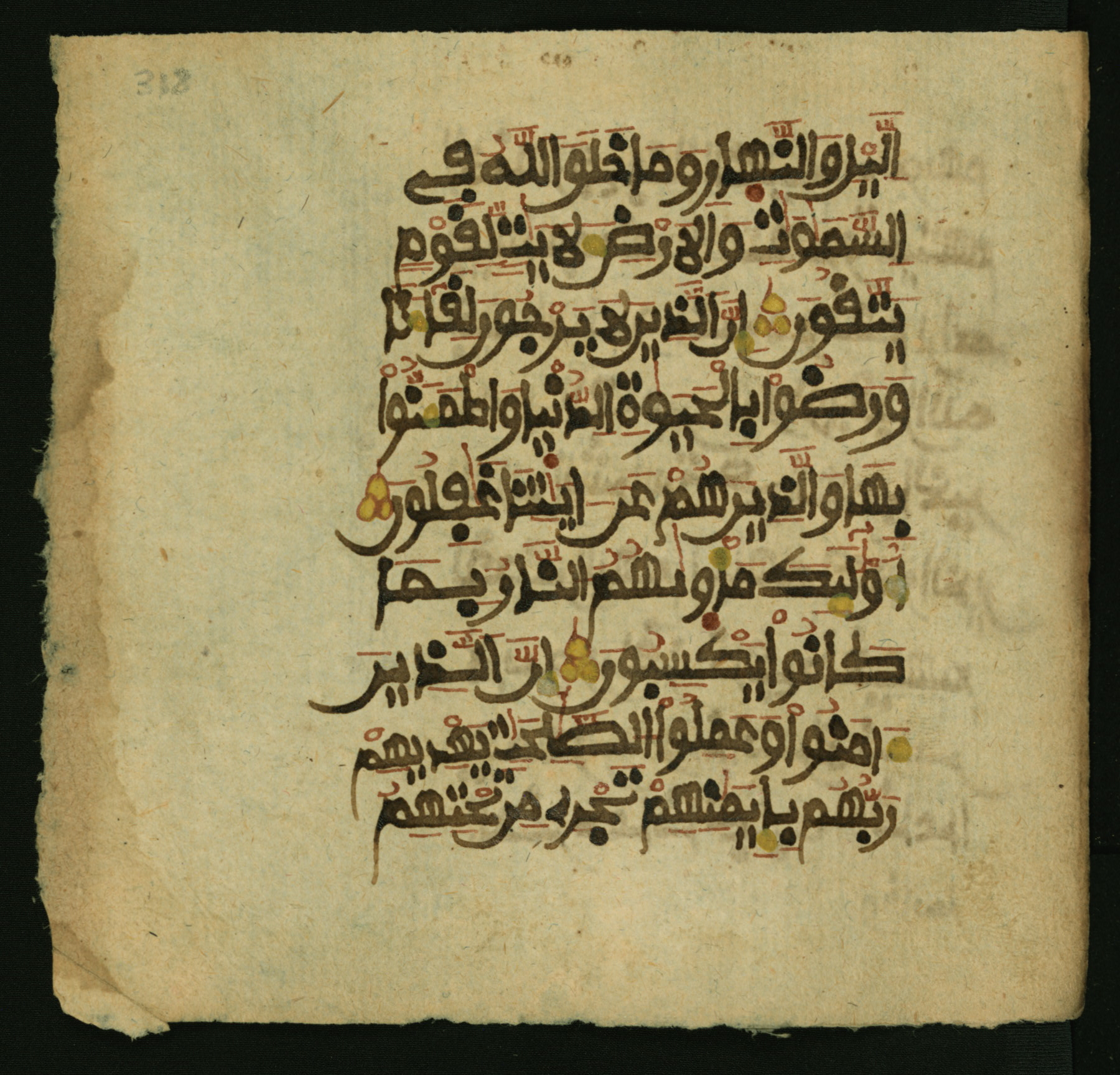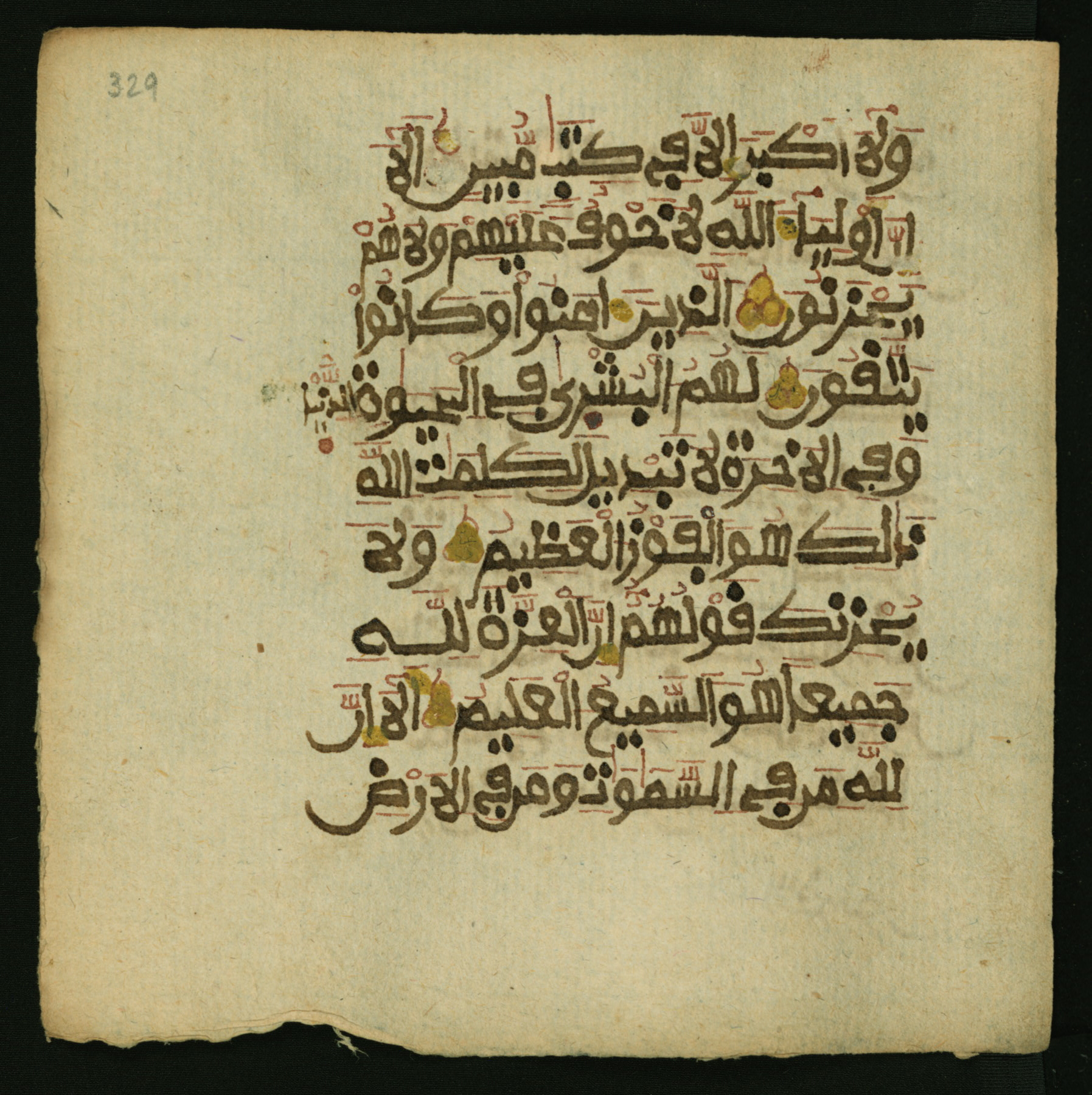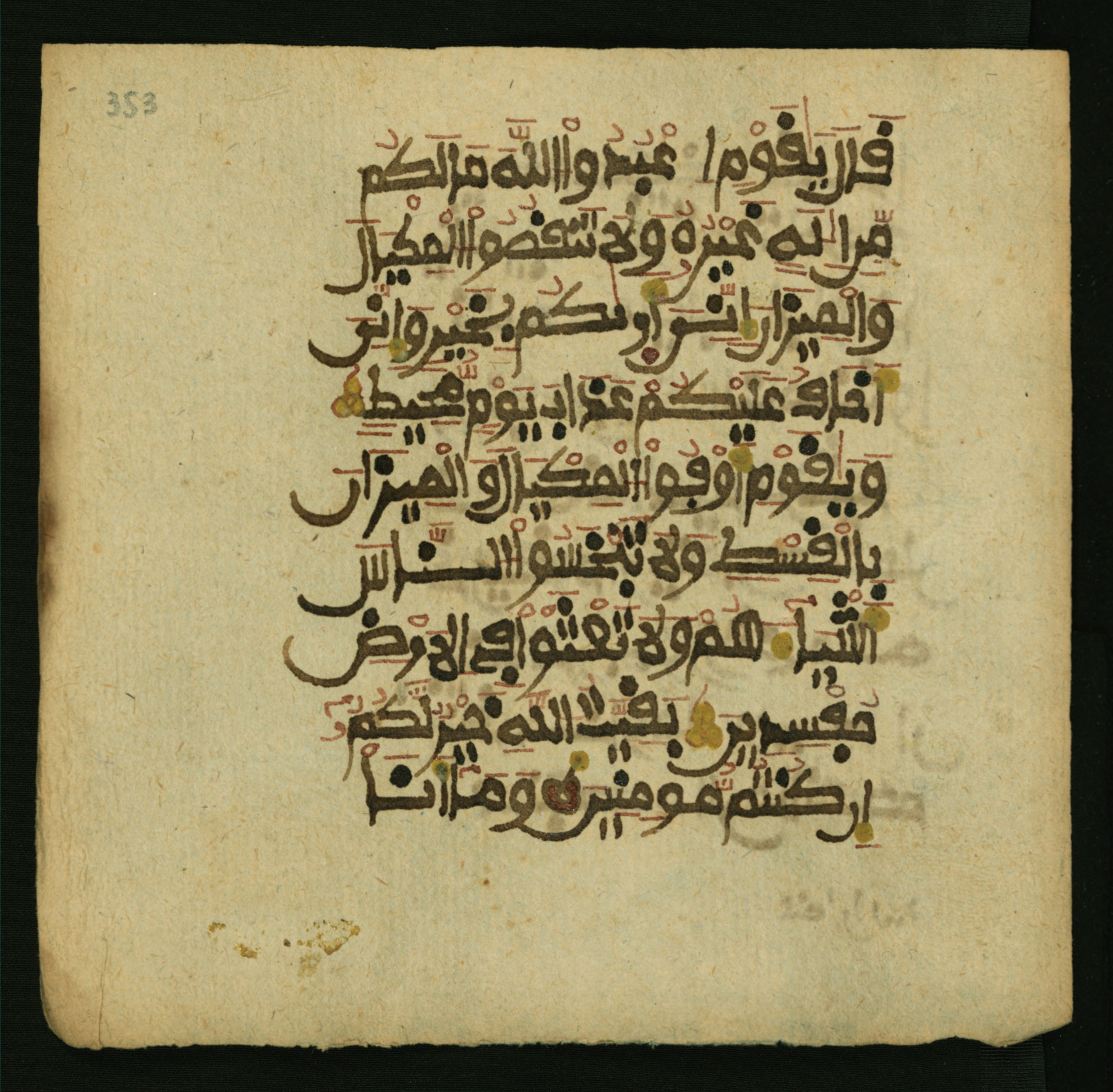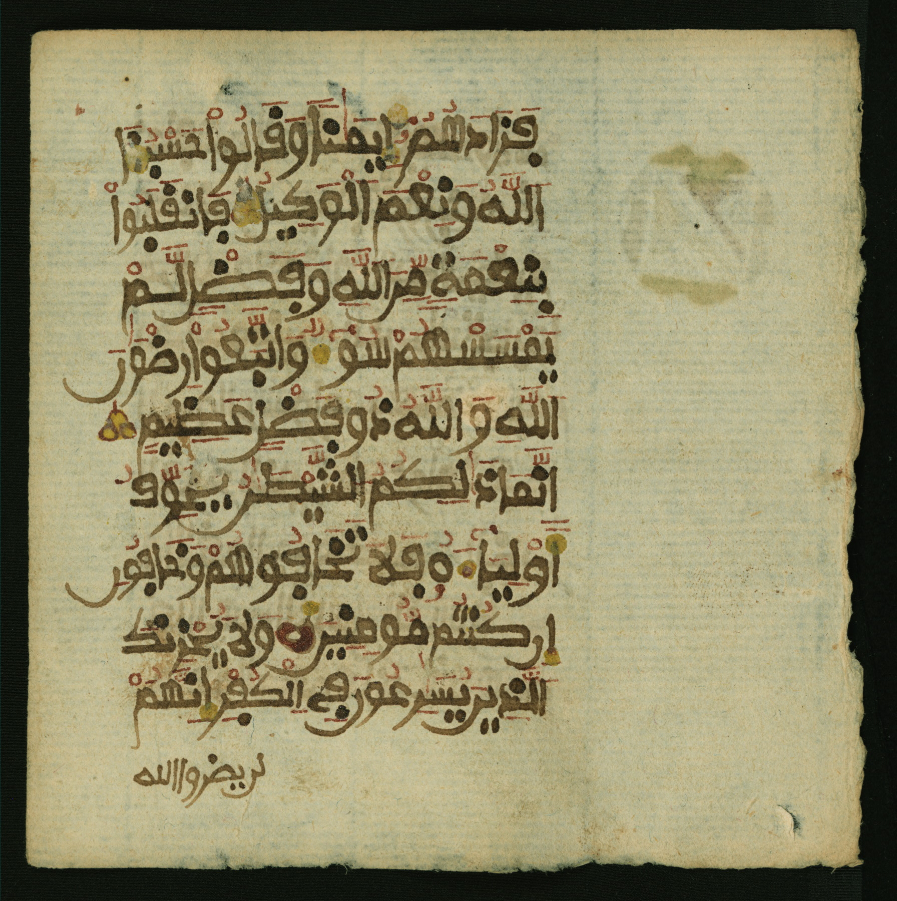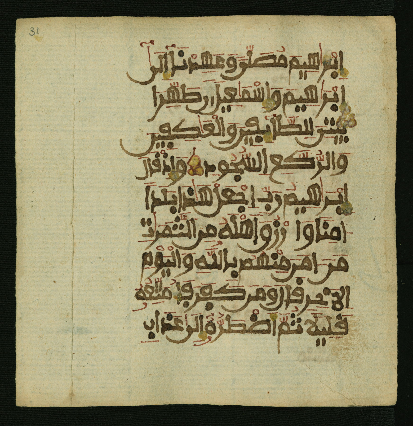 This square-format manuscript is volume 1, containing chapters 1-18 (Sūrat al-fātiḥah through Sūrat al-kahf), of an illuminated two-volume Qur'an produced in Sub-Saharan (West) Africa in the thirteenth century AH / nineteenth CE. The text is written in Sūdānī script in dark brown ink with vocalization in red on loose leaves. Chapter headings are in reddish-brown ink. Three yellow dots outlined in red arranged in a triangular form separate verses. Polychrome circular medallions as well as square and rectangular devices in a variety of patterns and colors mark textual divisions. The leaves of the text are organized between two decorated boards with geometric compositions. The pages and boards are housed in a leather pouch (satchel).