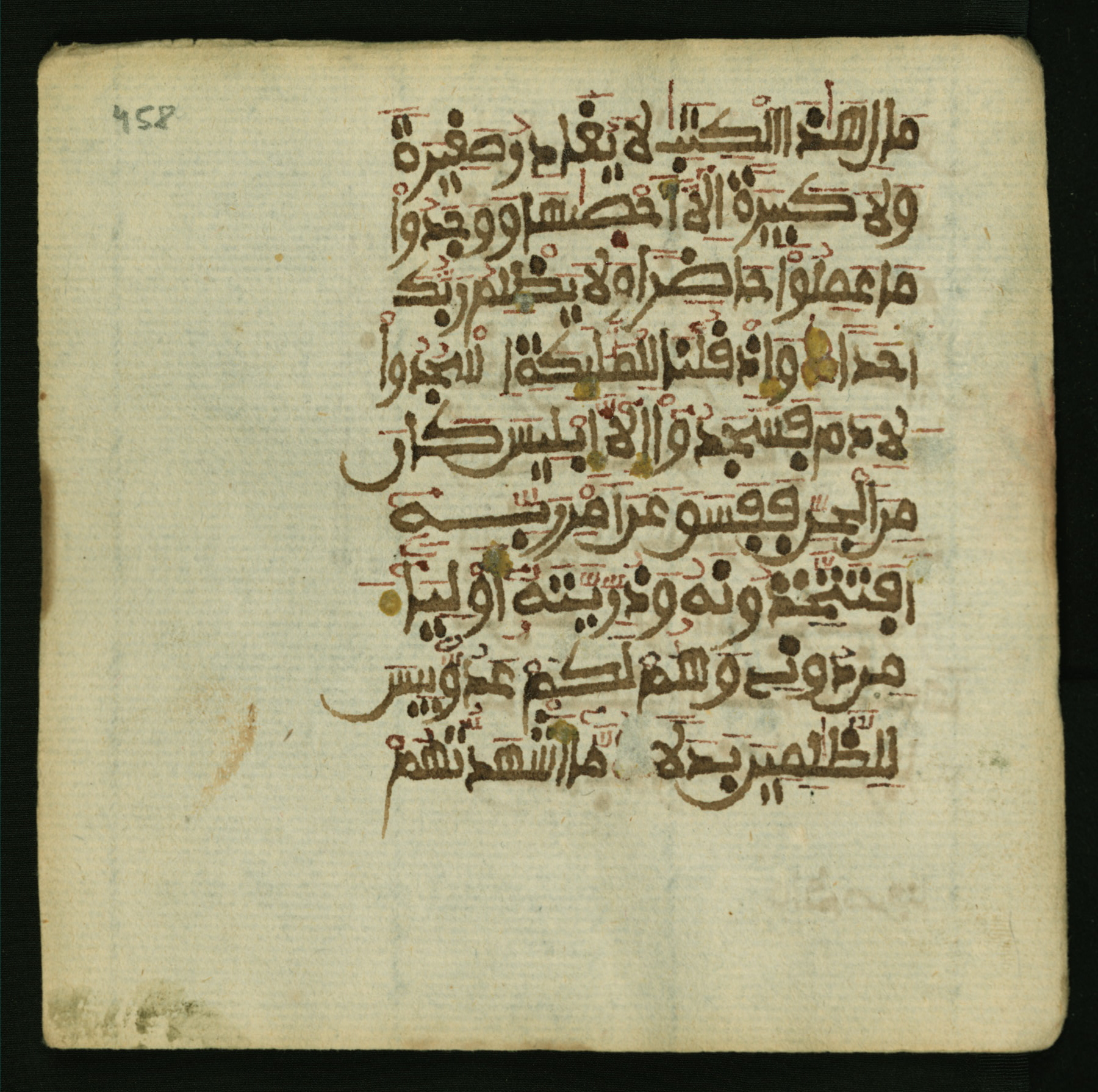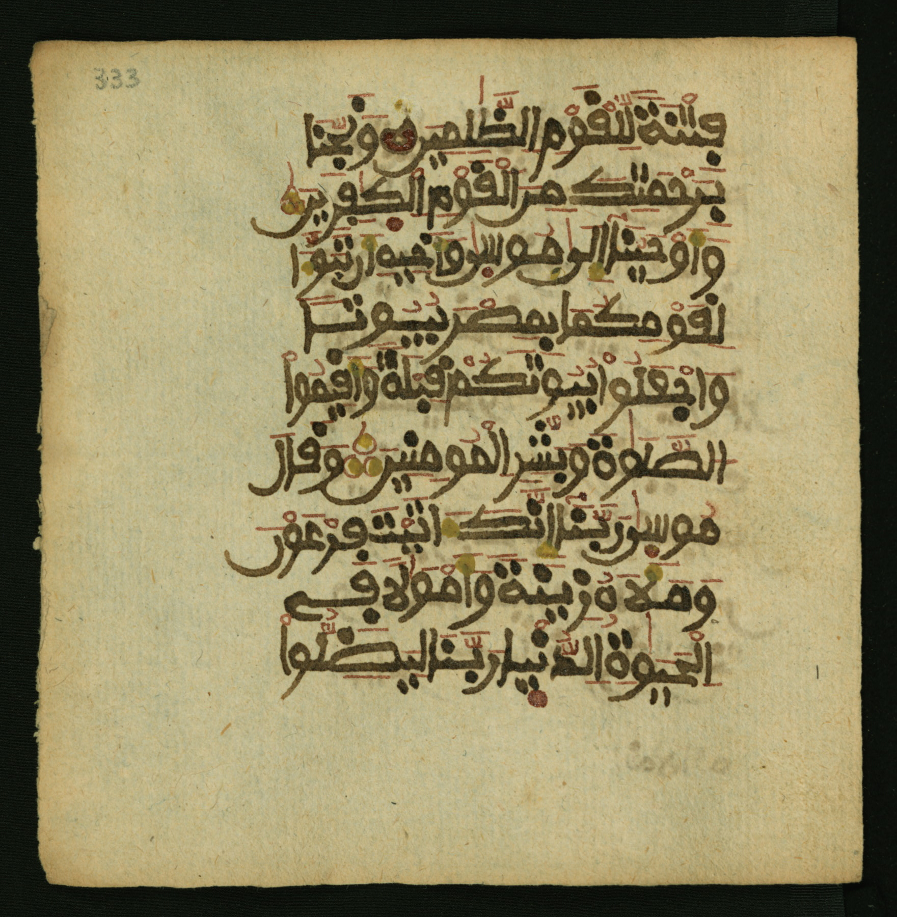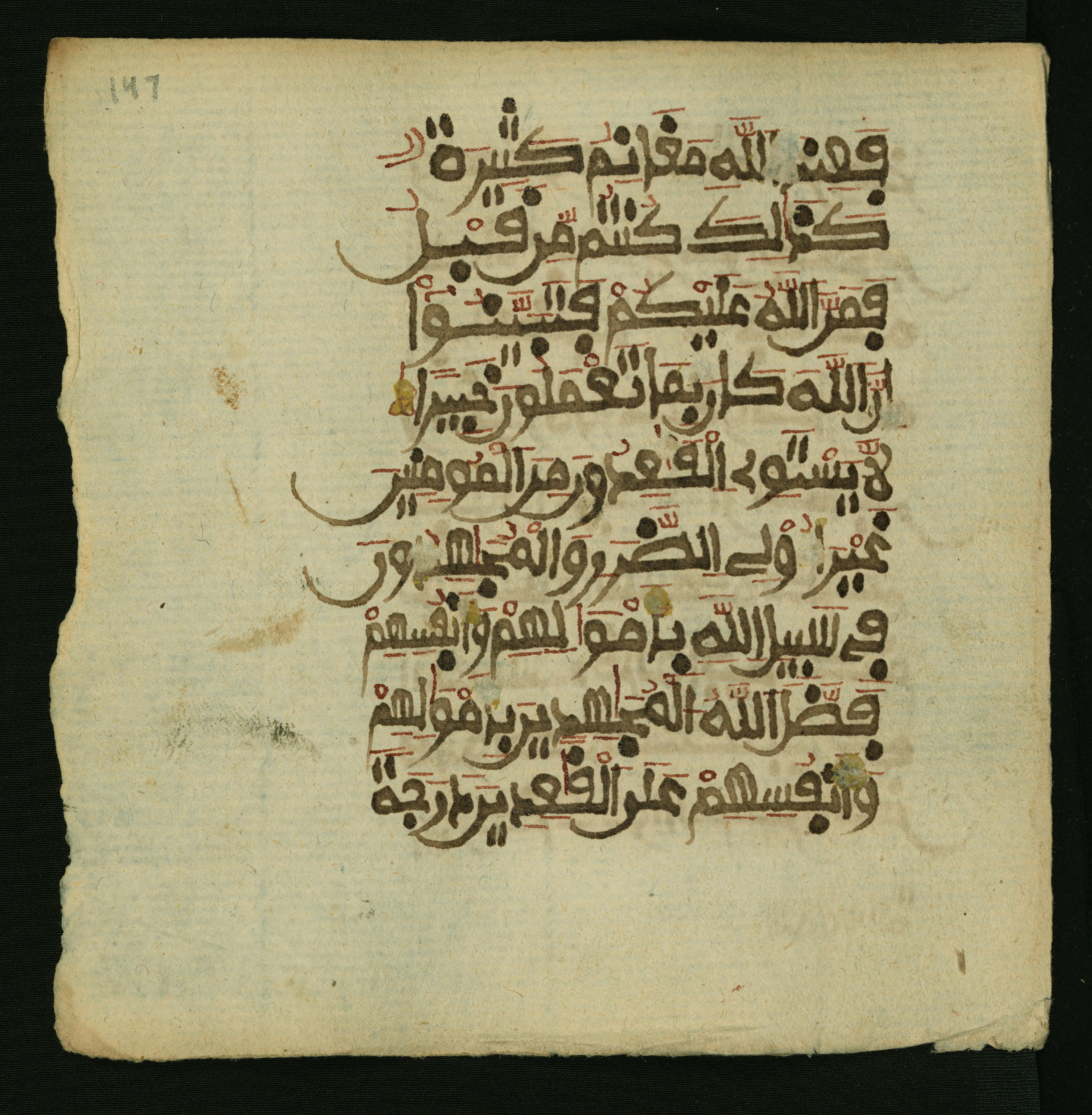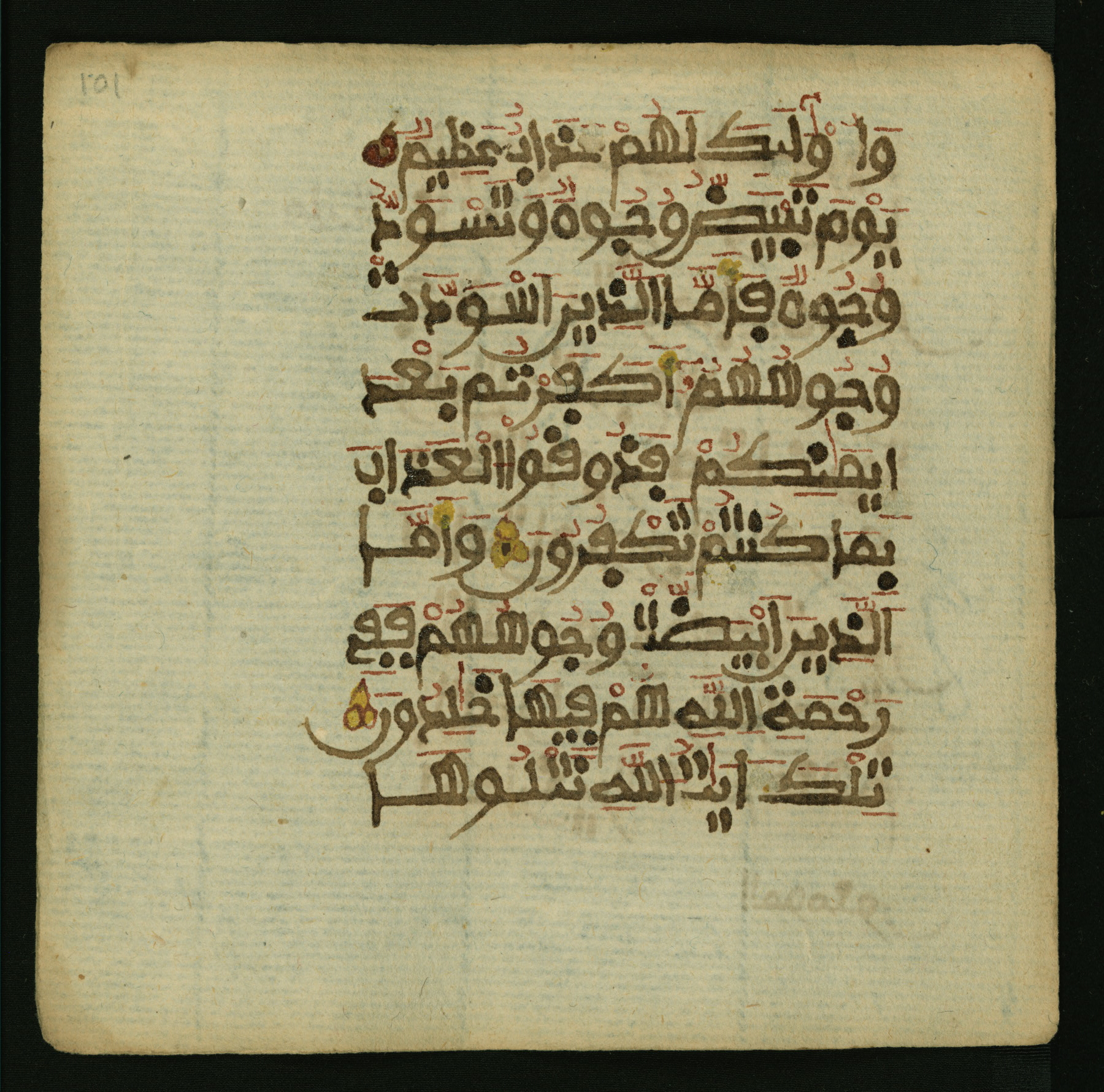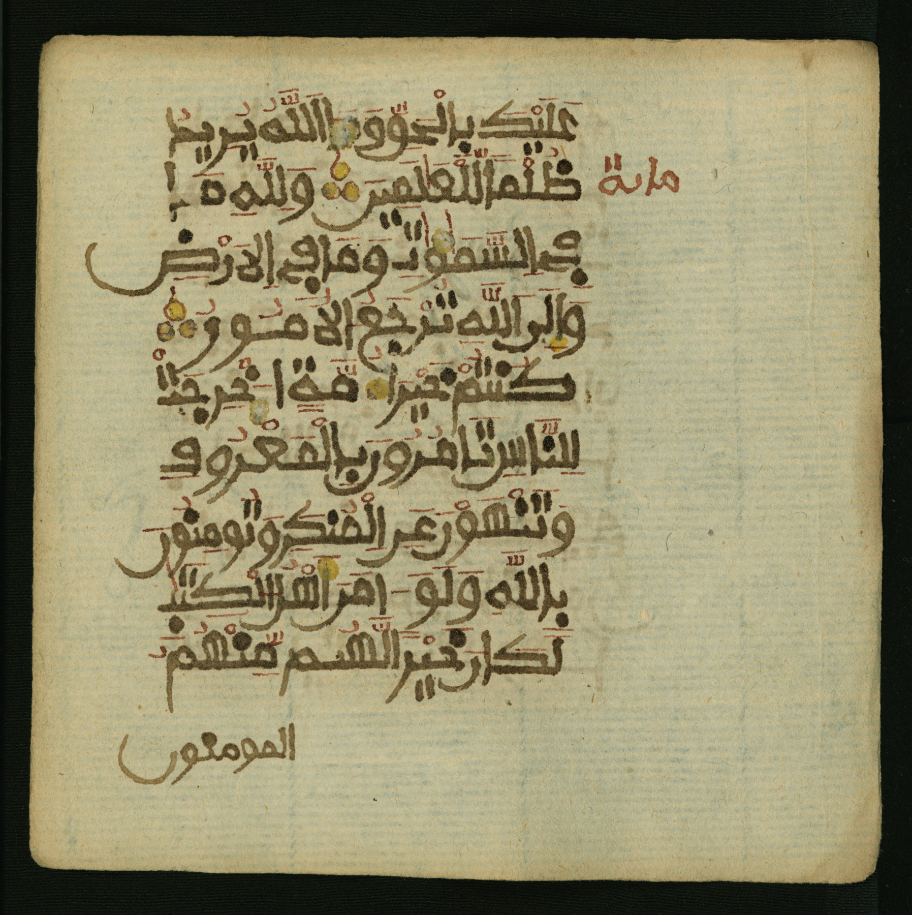 This square-format manuscript is volume 1, containing chapters 1-18 (Sūrat al-fātiḥah through Sūrat al-kahf), of an illuminated two-volume Qur'an produced in Sub-Saharan (West) Africa in the thirteenth century AH / nineteenth CE. The text is written in Sūdānī script in dark brown ink with vocalization in red on loose leaves. Chapter headings are in reddish-brown ink. Three yellow dots outlined in red arranged in a triangular form separate verses. Polychrome circular medallions as well as square and rectangular devices in a variety of patterns and colors mark textual divisions. The leaves of the text are organized between two decorated boards with geometric compositions. The pages and boards are housed in a leather pouch (satchel).