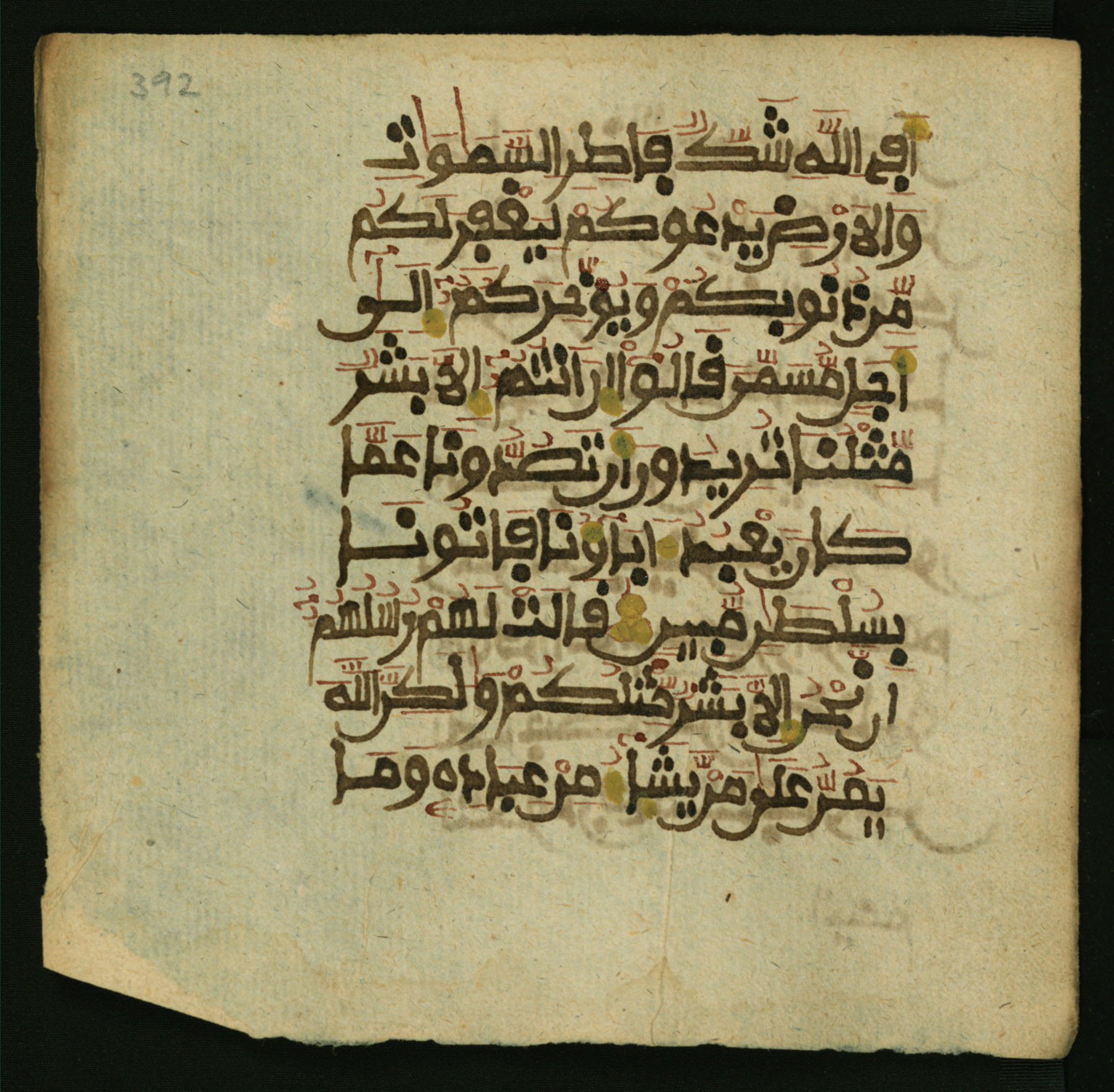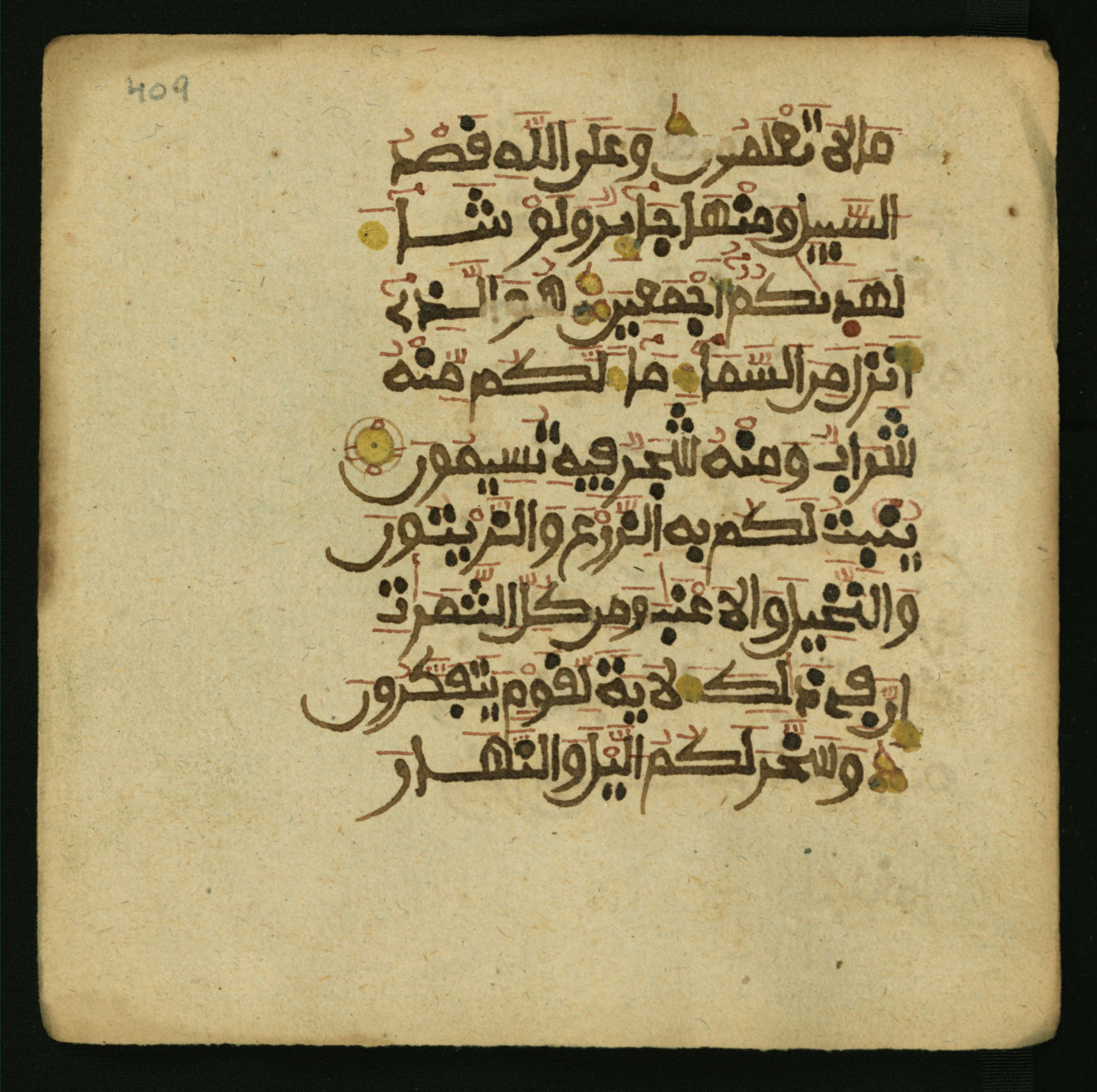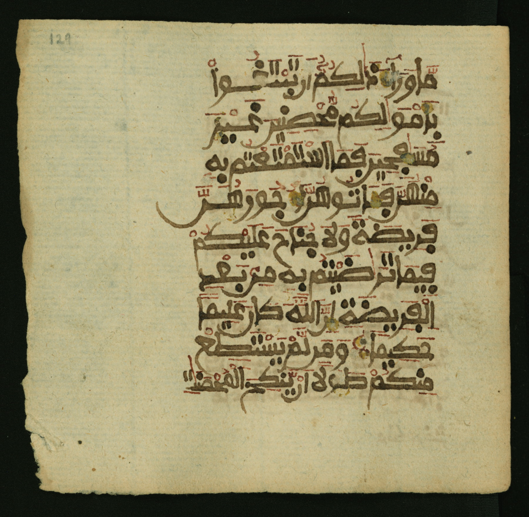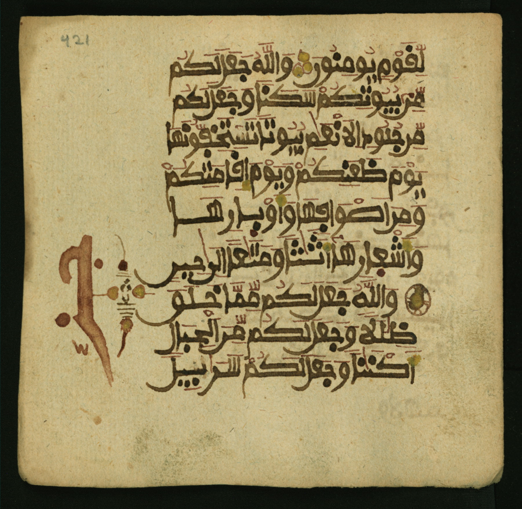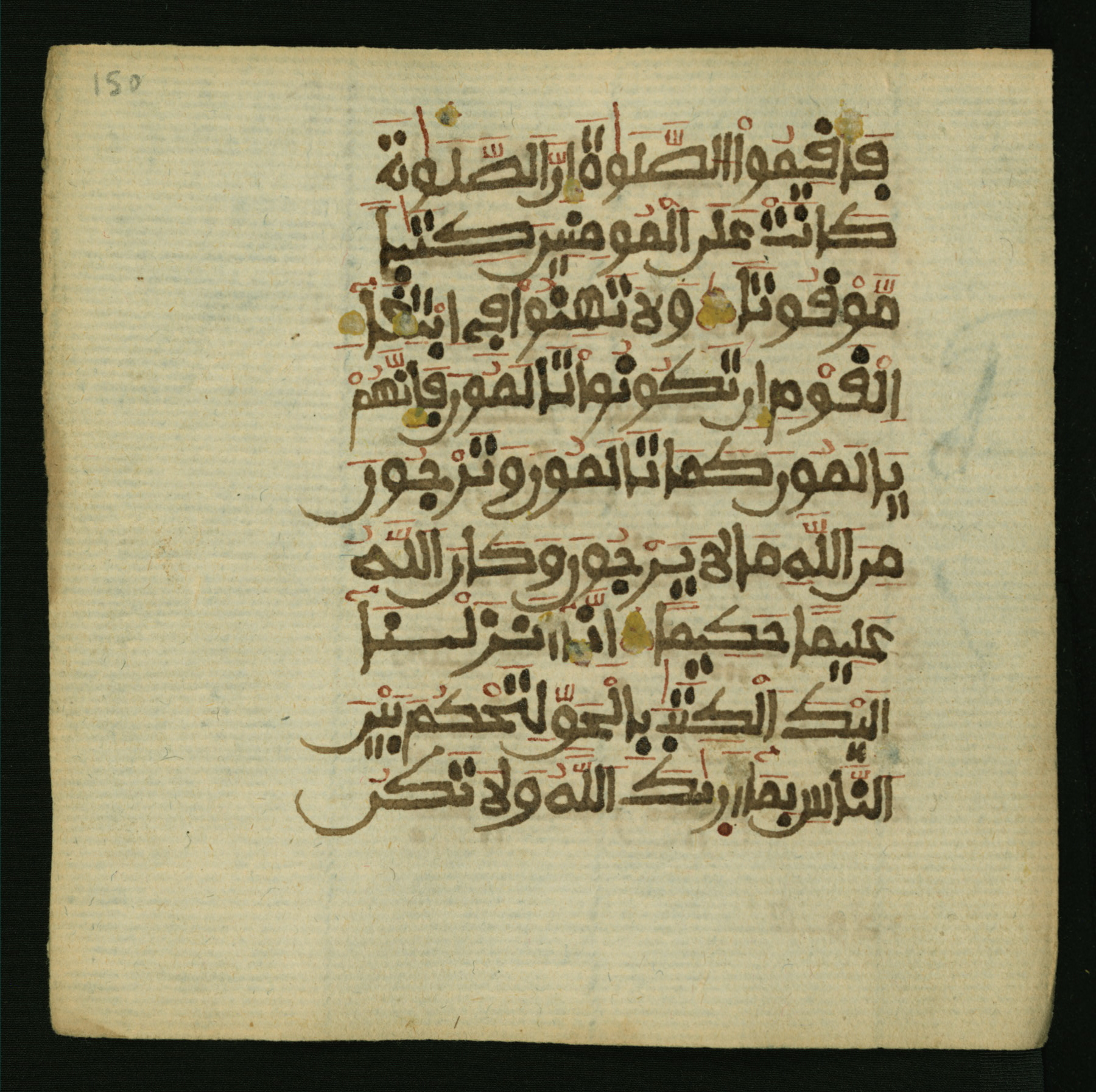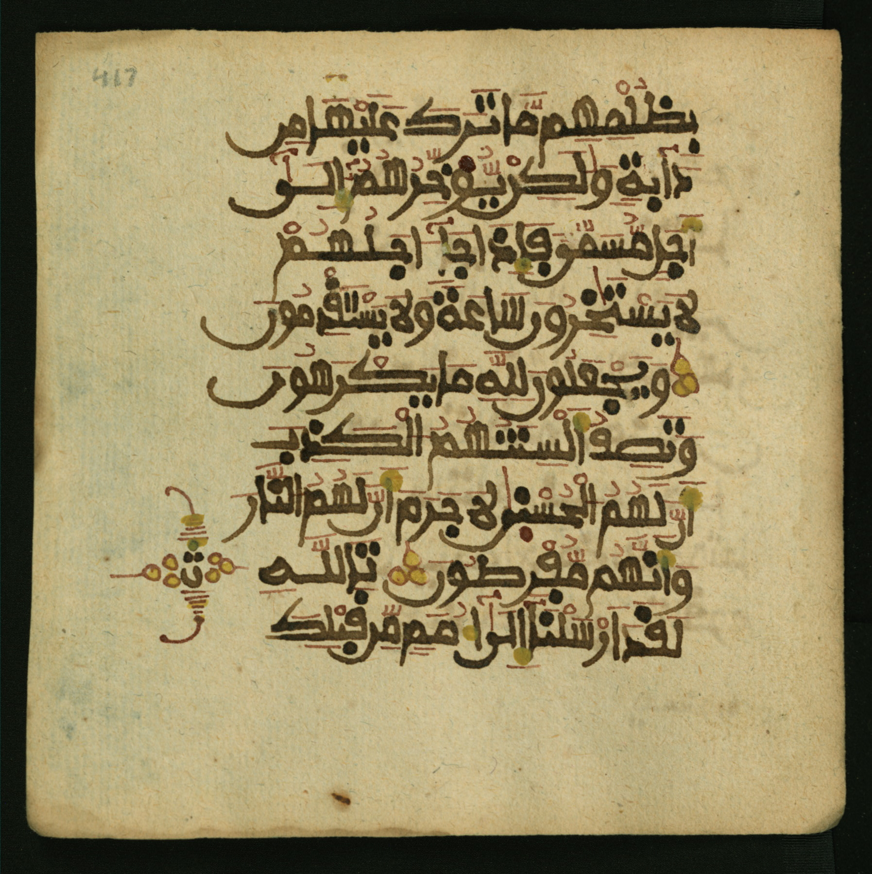 This square-format manuscript is volume 1, containing chapters 1-18 (Sūrat al-fātiḥah through Sūrat al-kahf), of an illuminated two-volume Qur'an produced in Sub-Saharan (West) Africa in the thirteenth century AH / nineteenth CE. The text is written in Sūdānī script in dark brown ink with vocalization in red on loose leaves. Chapter headings are in reddish-brown ink. Three yellow dots outlined in red arranged in a triangular form separate verses. Polychrome circular medallions as well as square and rectangular devices in a variety of patterns and colors mark textual divisions. The leaves of the text are organized between two decorated boards with geometric compositions. The pages and boards are housed in a leather pouch (satchel).