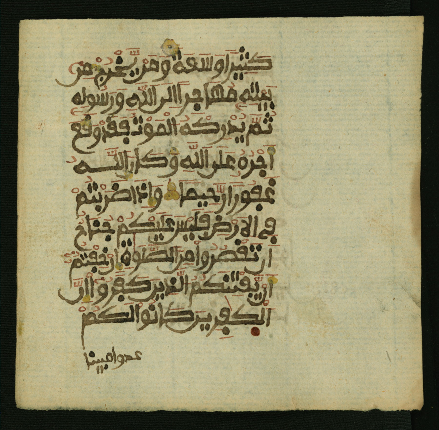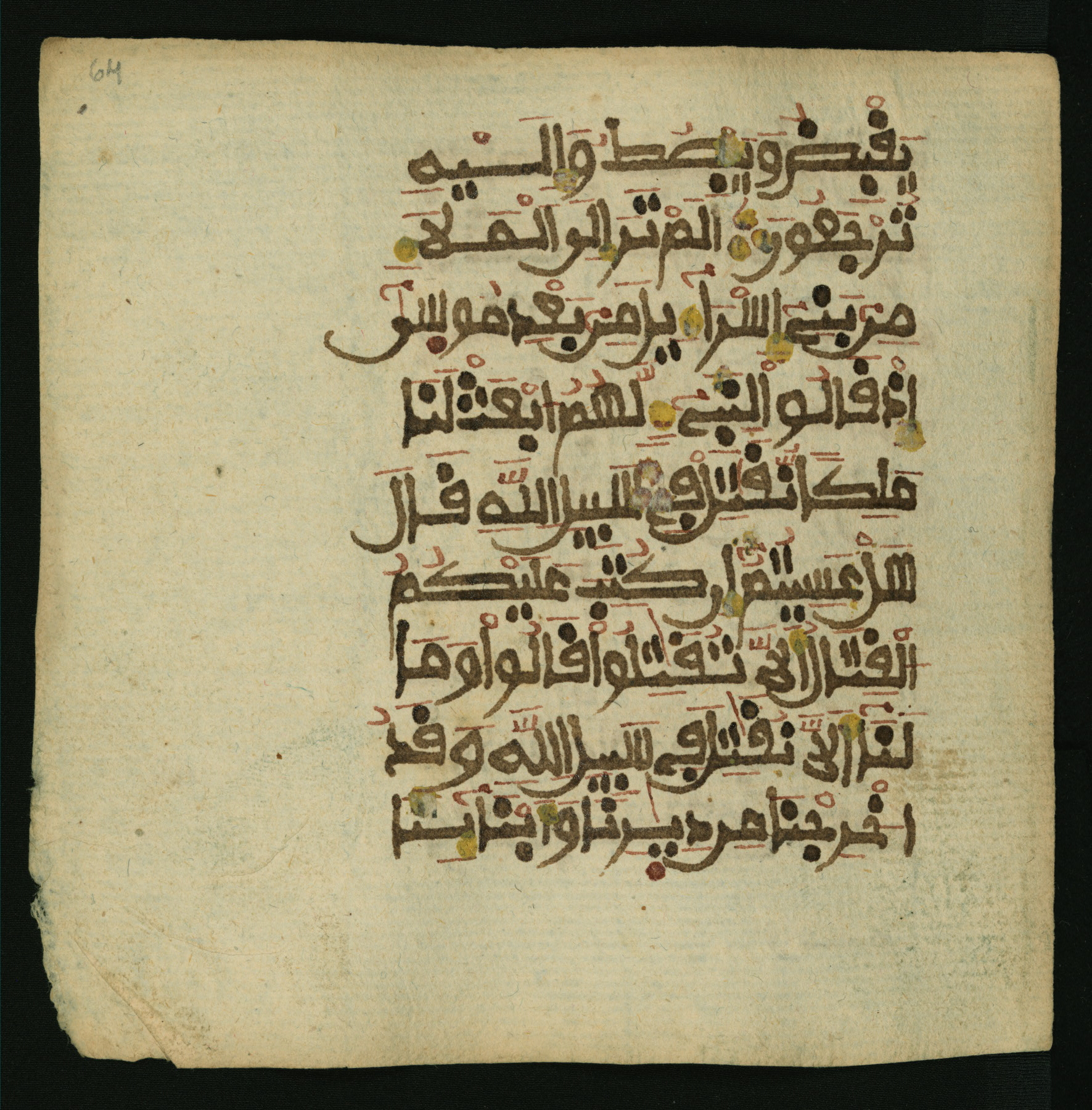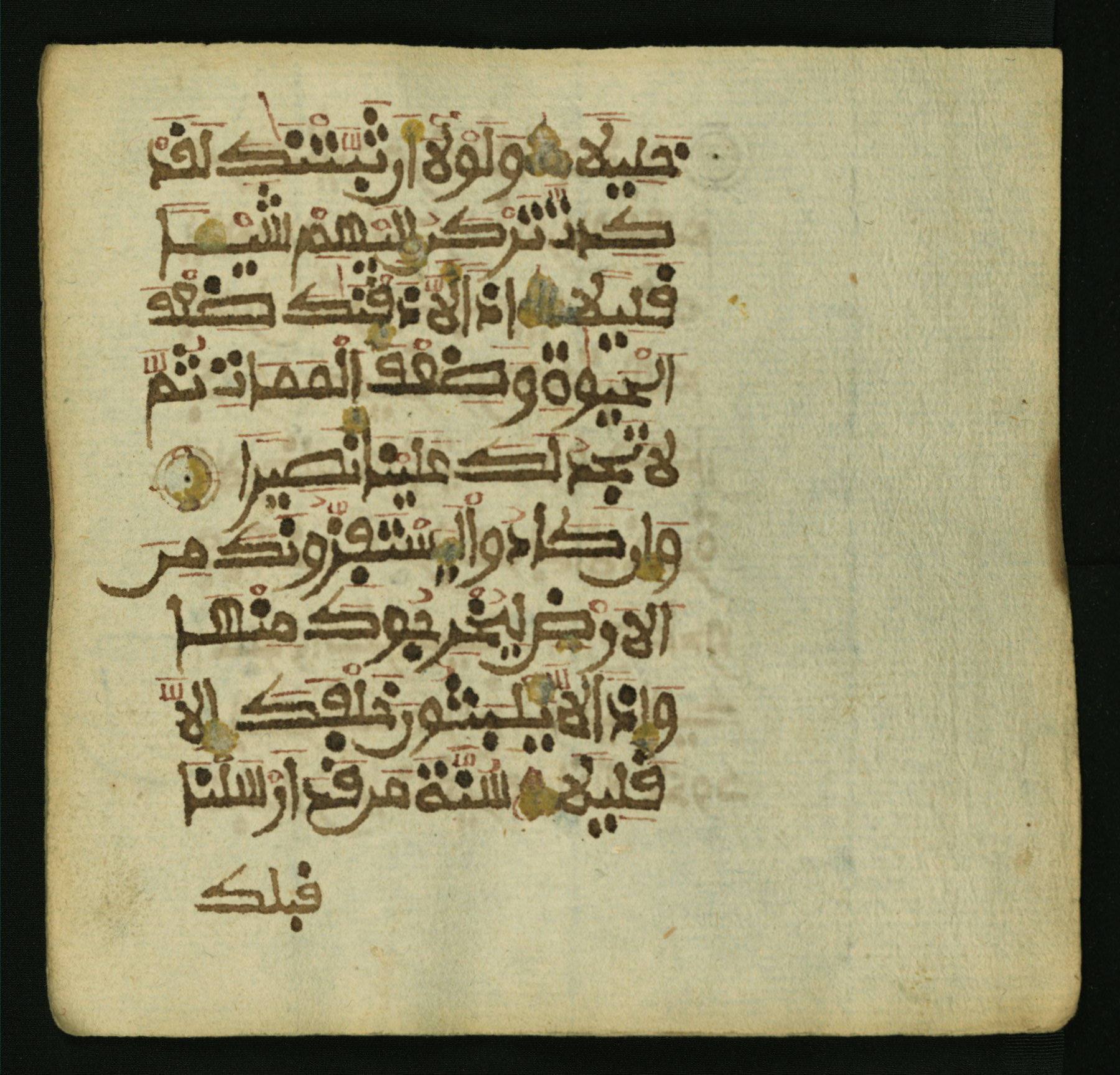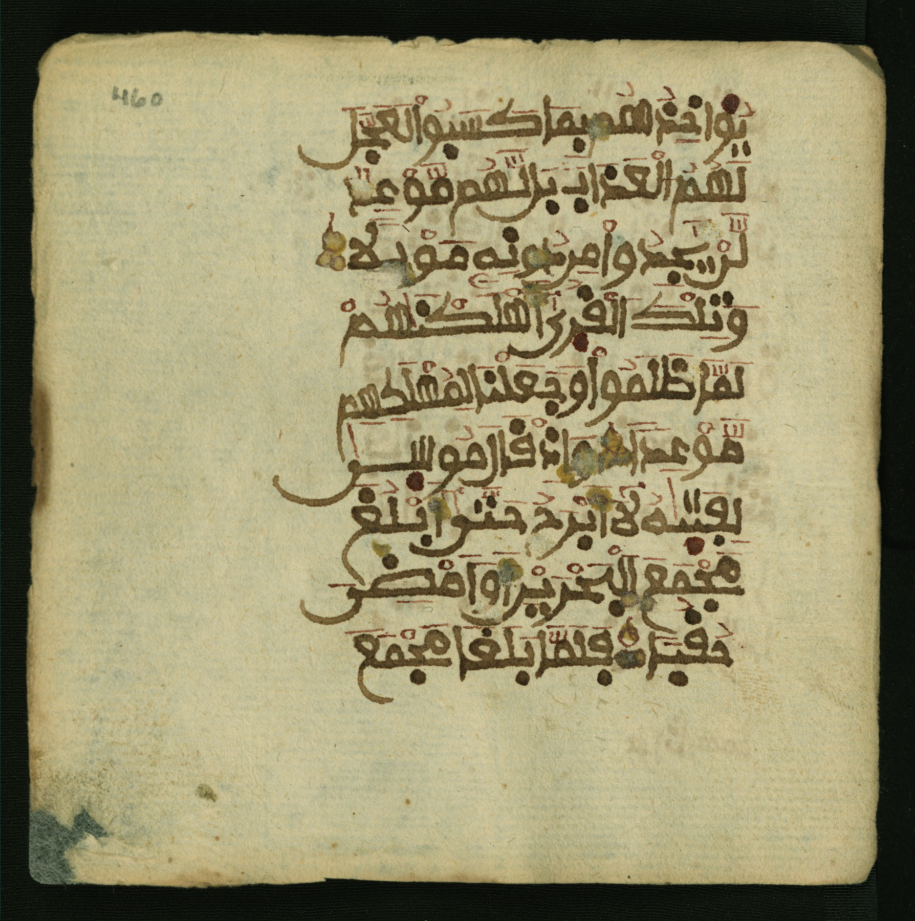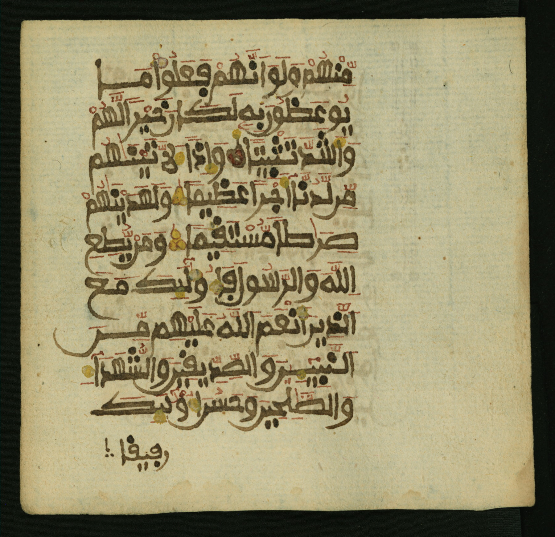 This square-format manuscript is volume 1, containing chapters 1-18 (Sūrat al-fātiḥah through Sūrat al-kahf), of an illuminated two-volume Qur'an produced in Sub-Saharan (West) Africa in the thirteenth century AH / nineteenth CE. The text is written in Sūdānī script in dark brown ink with vocalization in red on loose leaves. Chapter headings are in reddish-brown ink. Three yellow dots outlined in red arranged in a triangular form separate verses. Polychrome circular medallions as well as square and rectangular devices in a variety of patterns and colors mark textual divisions. The leaves of the text are organized between two decorated boards with geometric compositions. The pages and boards are housed in a leather pouch (satchel).