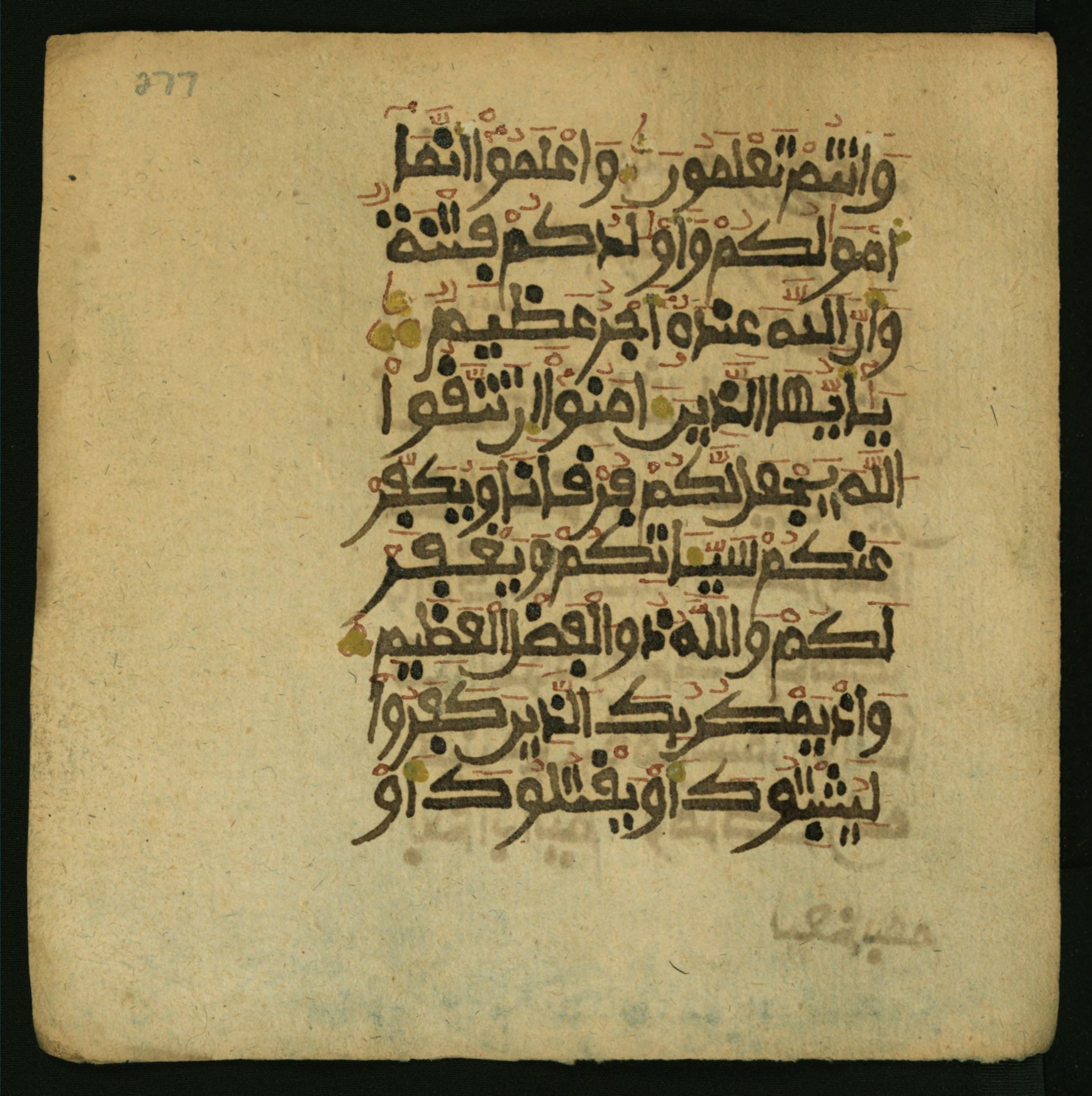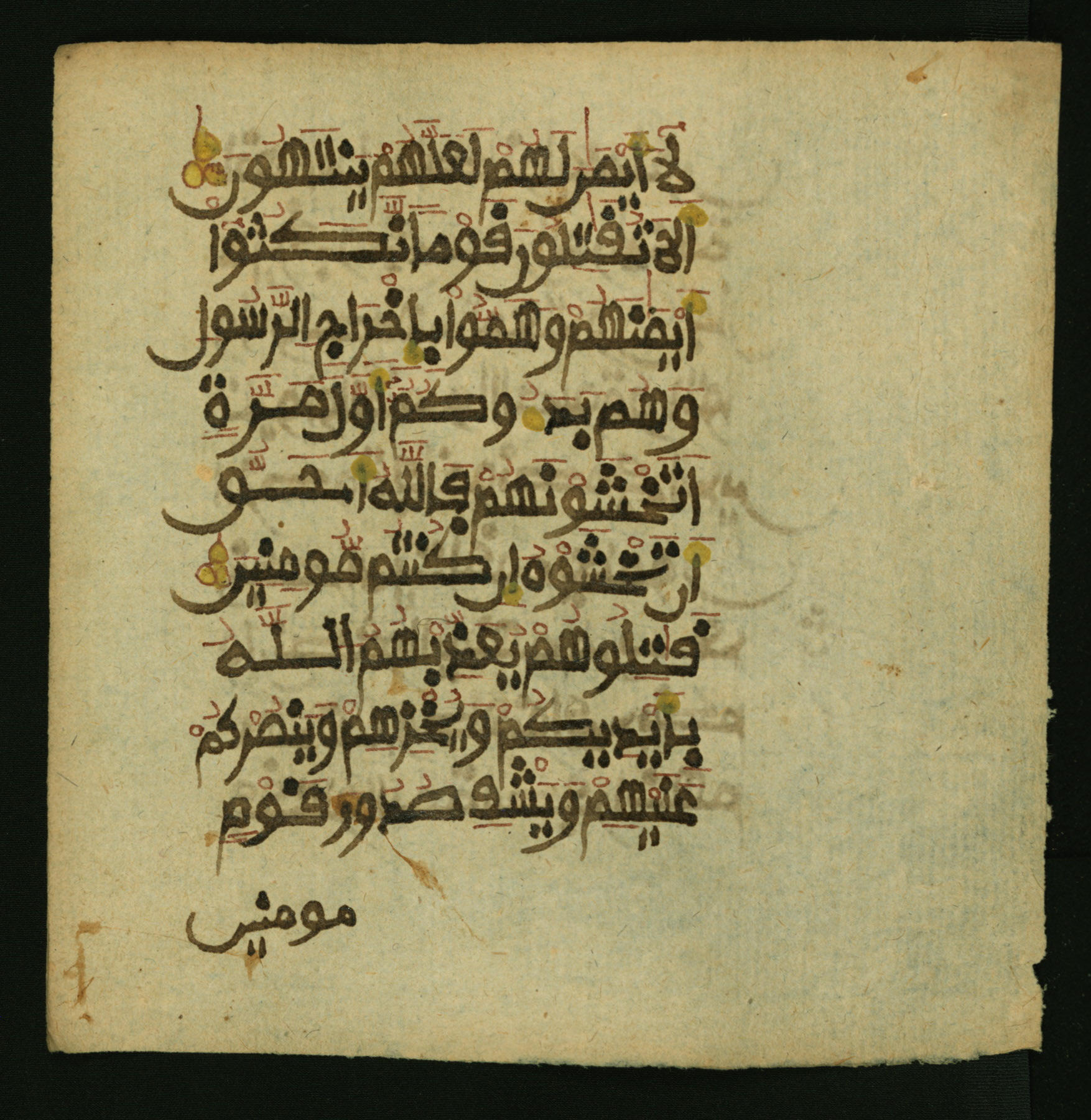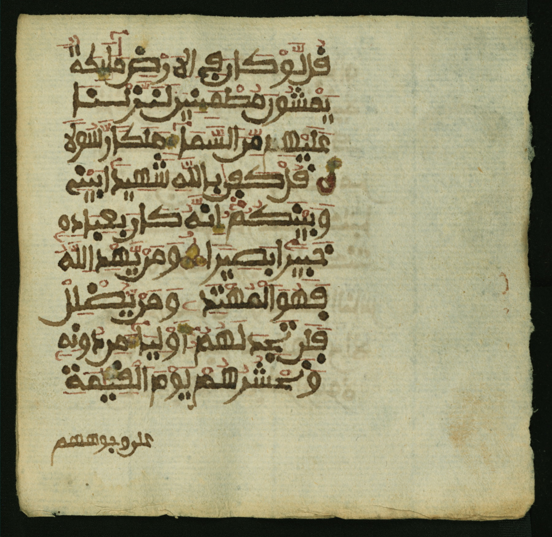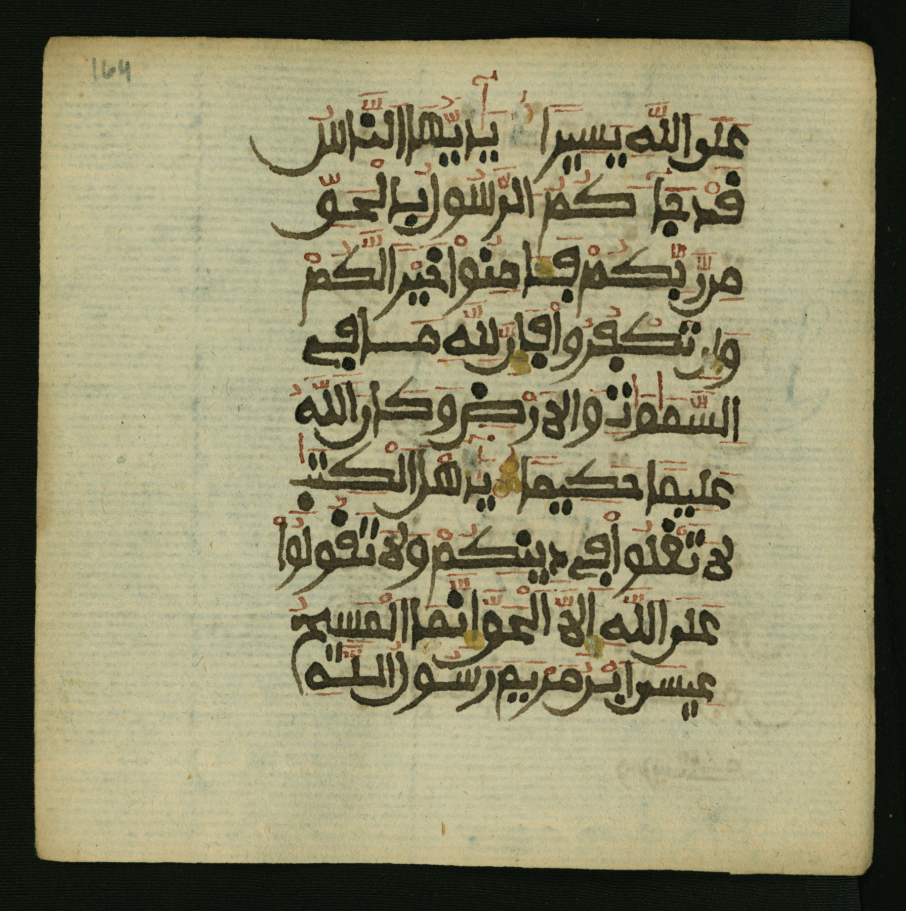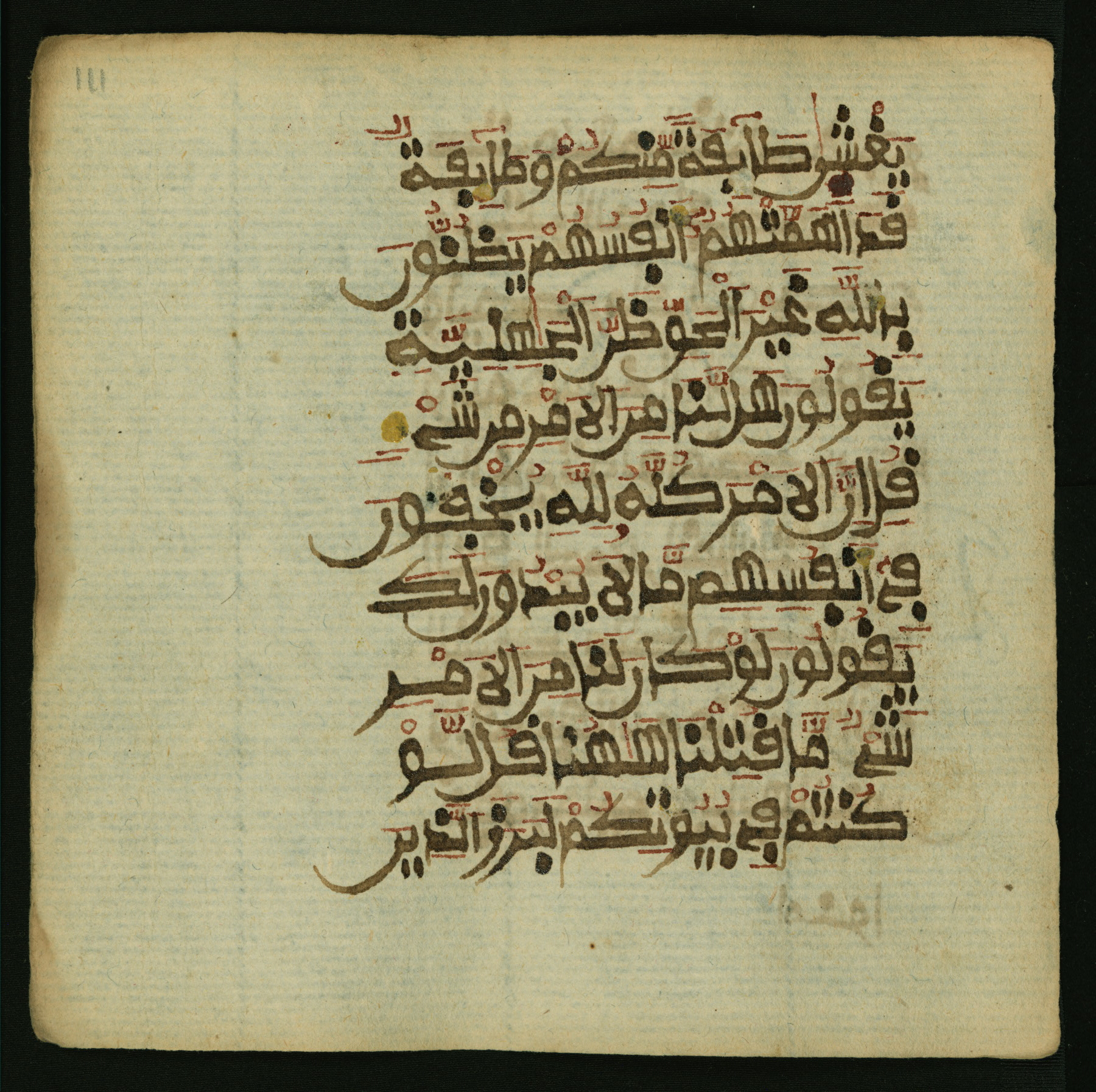 This square-format manuscript is volume 1, containing chapters 1-18 (Sūrat al-fātiḥah through Sūrat al-kahf), of an illuminated two-volume Qur'an produced in Sub-Saharan (West) Africa in the thirteenth century AH / nineteenth CE. The text is written in Sūdānī script in dark brown ink with vocalization in red on loose leaves. Chapter headings are in reddish-brown ink. Three yellow dots outlined in red arranged in a triangular form separate verses. Polychrome circular medallions as well as square and rectangular devices in a variety of patterns and colors mark textual divisions. The leaves of the text are organized between two decorated boards with geometric compositions. The pages and boards are housed in a leather pouch (satchel).