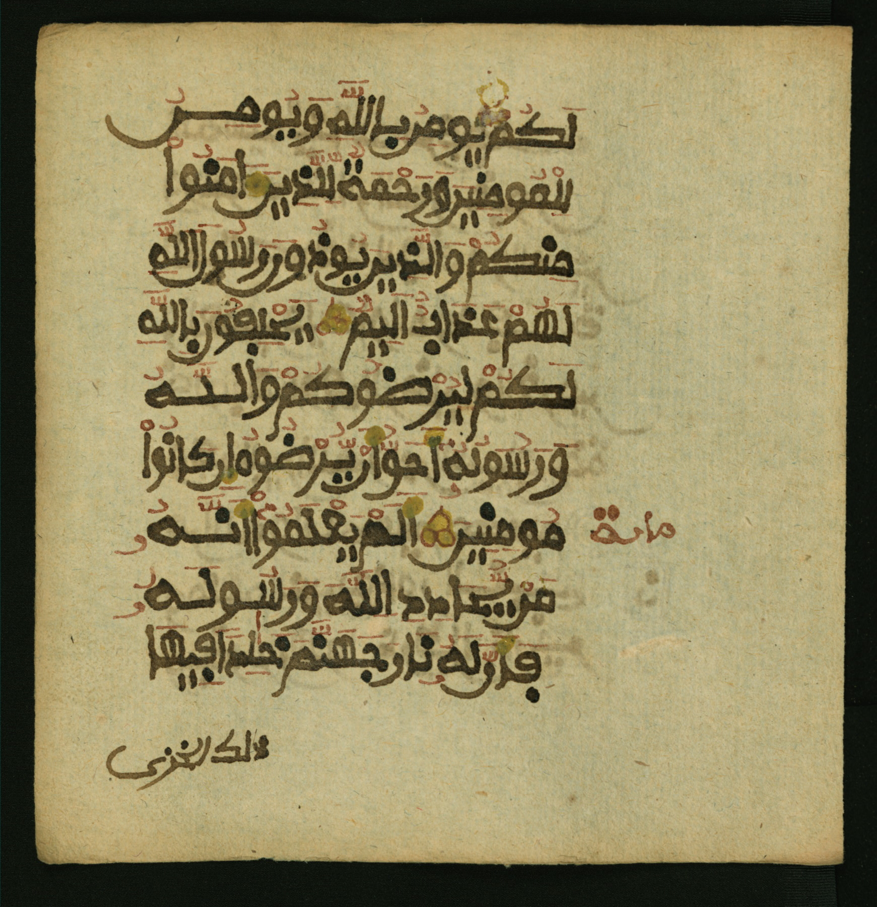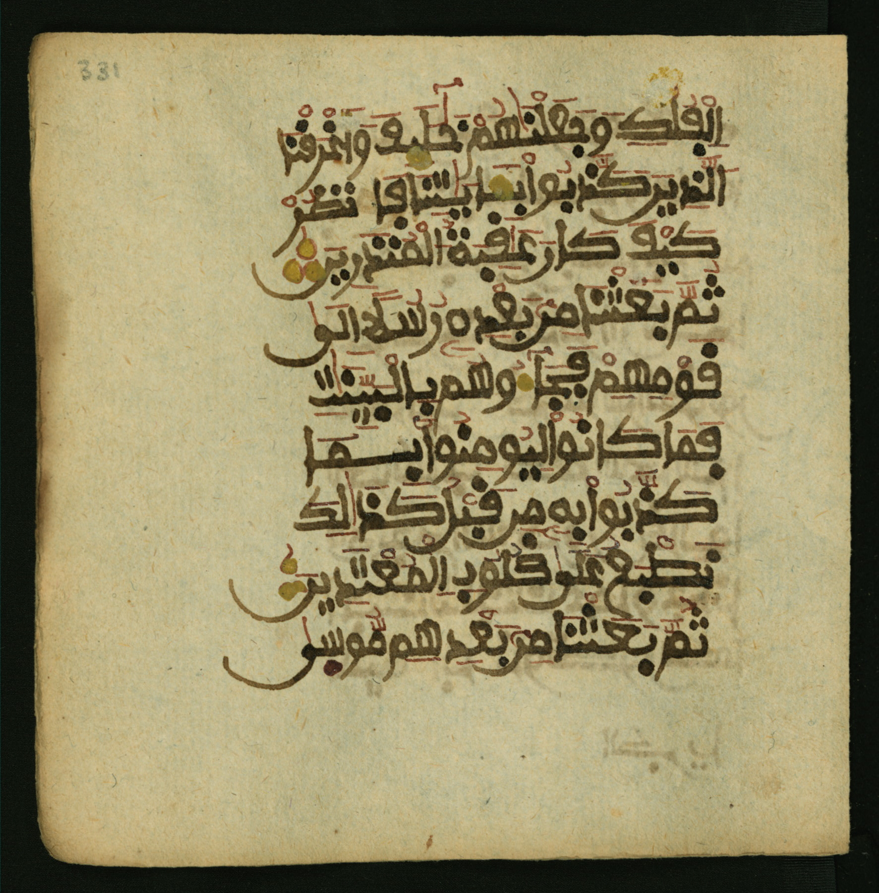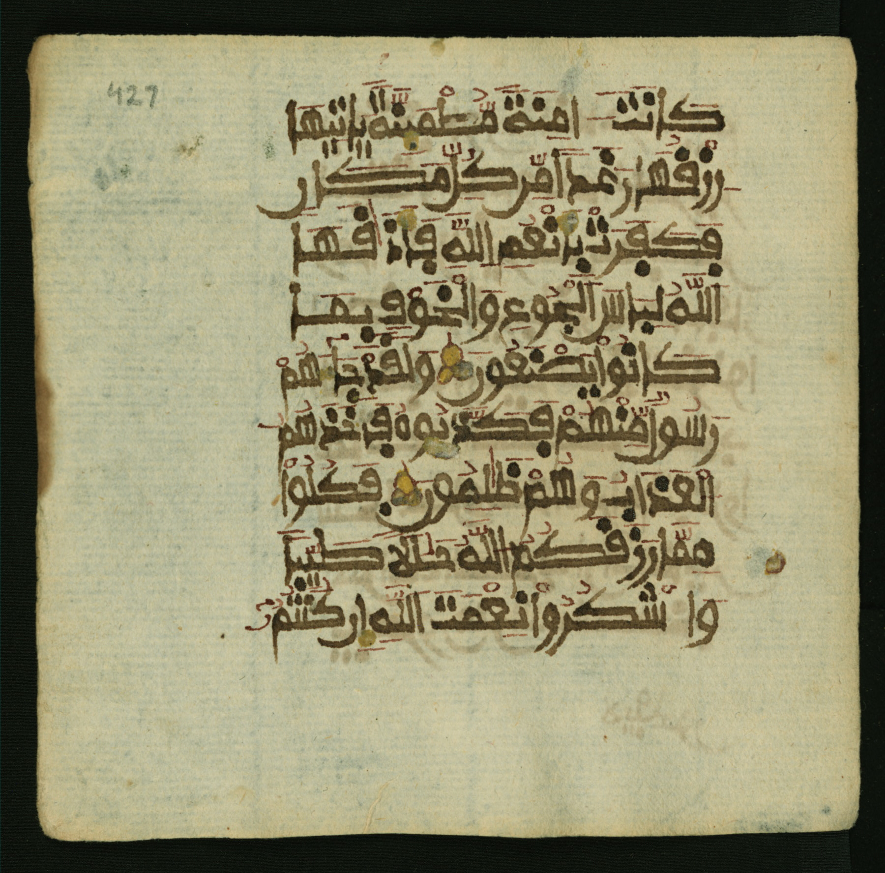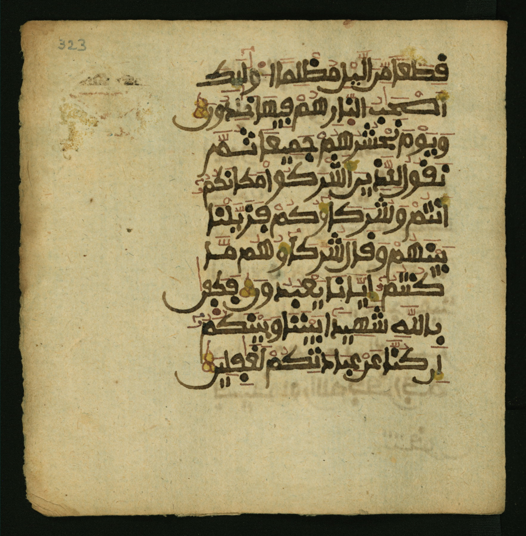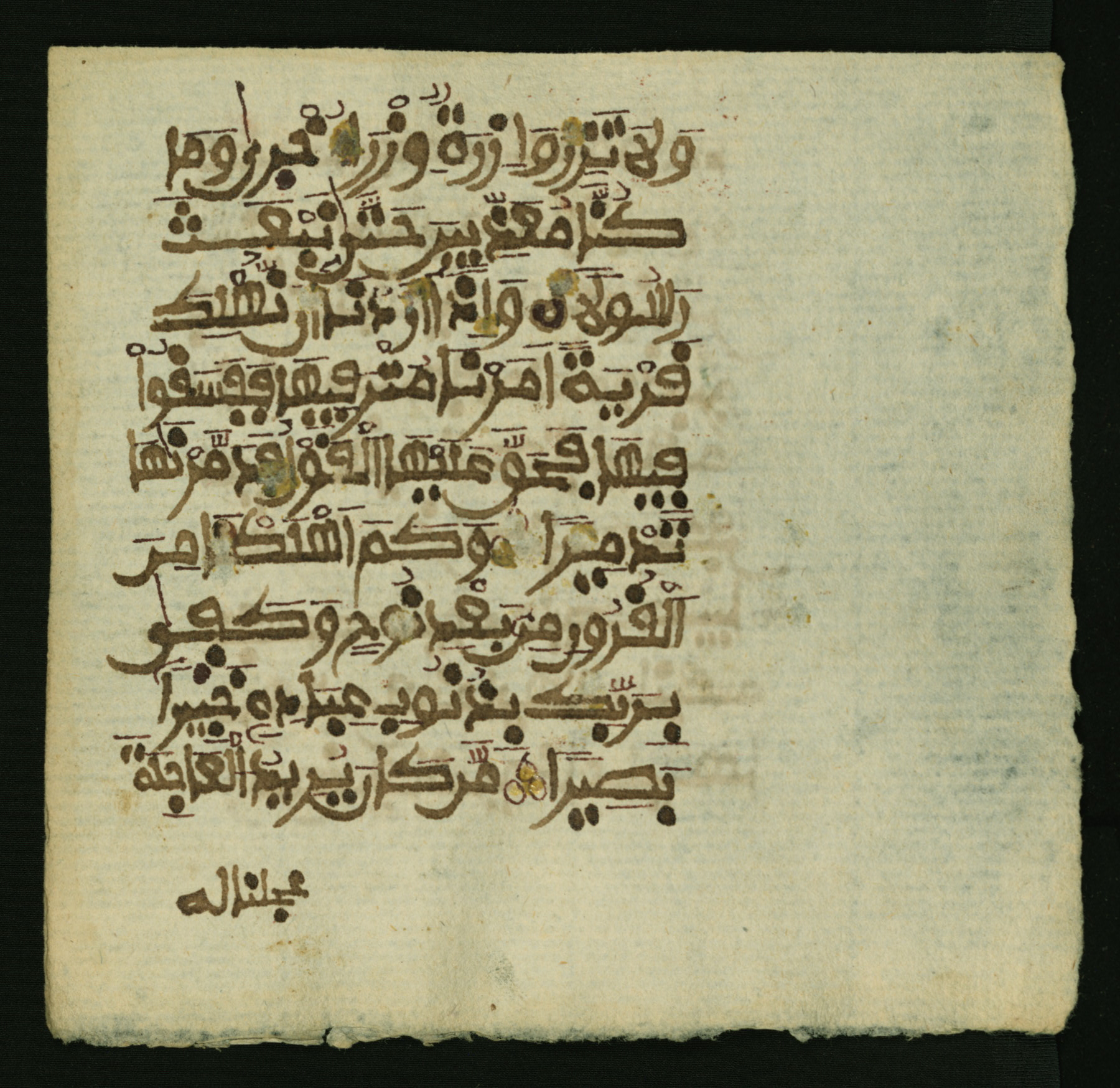 This square-format manuscript is volume 1, containing chapters 1-18 (Sūrat al-fātiḥah through Sūrat al-kahf), of an illuminated two-volume Qur'an produced in Sub-Saharan (West) Africa in the thirteenth century AH / nineteenth CE. The text is written in Sūdānī script in dark brown ink with vocalization in red on loose leaves. Chapter headings are in reddish-brown ink. Three yellow dots outlined in red arranged in a triangular form separate verses. Polychrome circular medallions as well as square and rectangular devices in a variety of patterns and colors mark textual divisions. The leaves of the text are organized between two decorated boards with geometric compositions. The pages and boards are housed in a leather pouch (satchel).