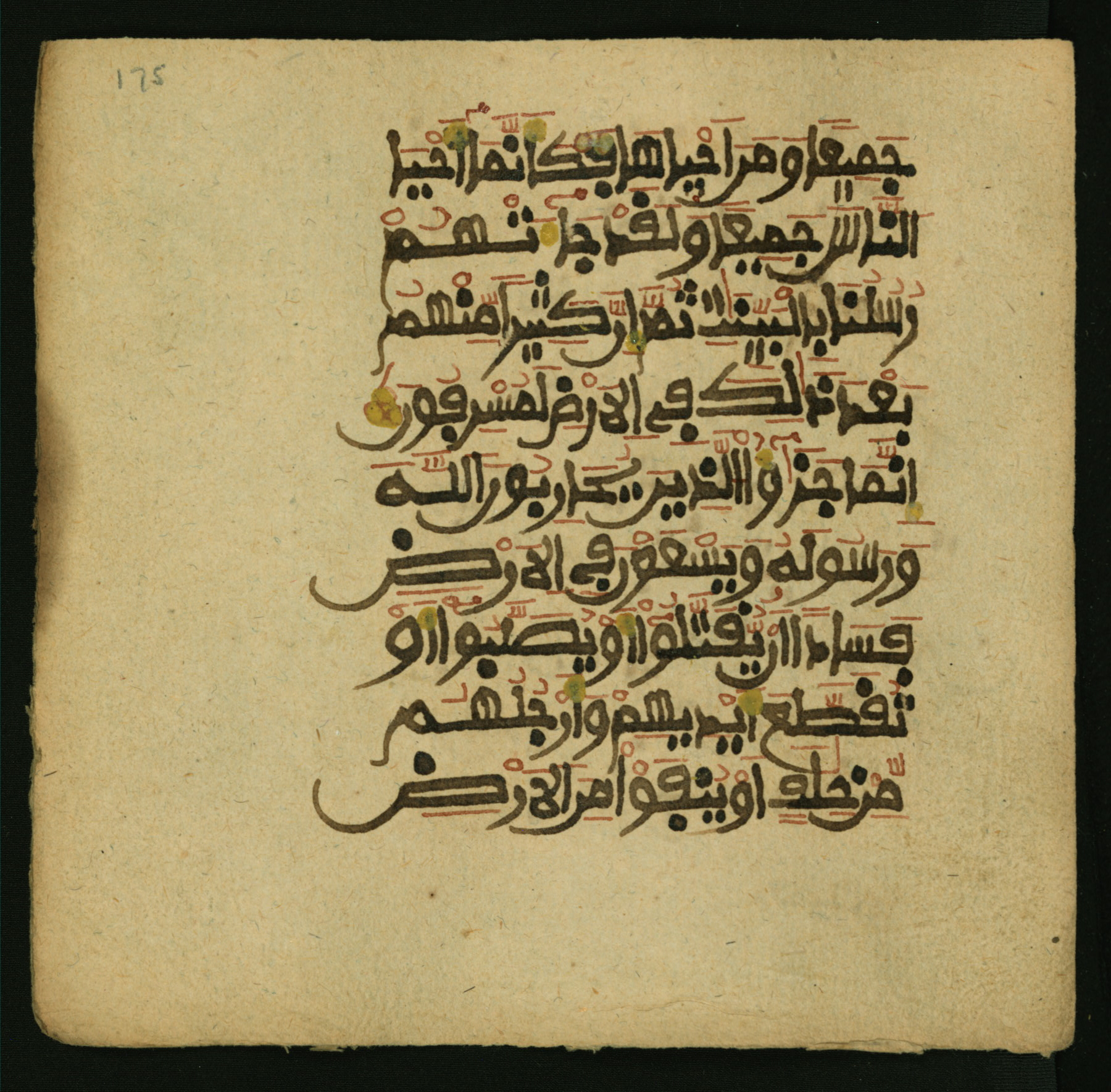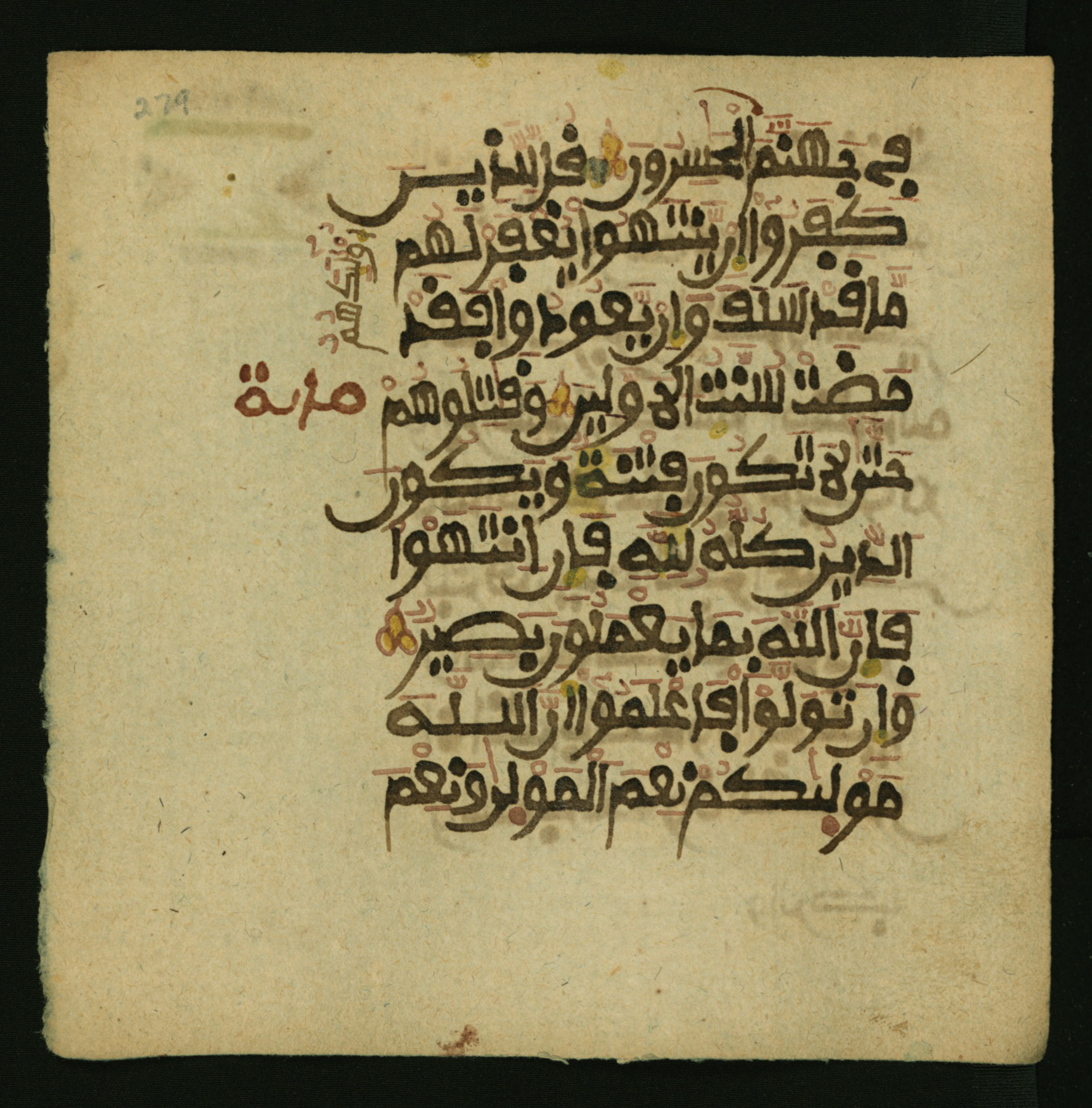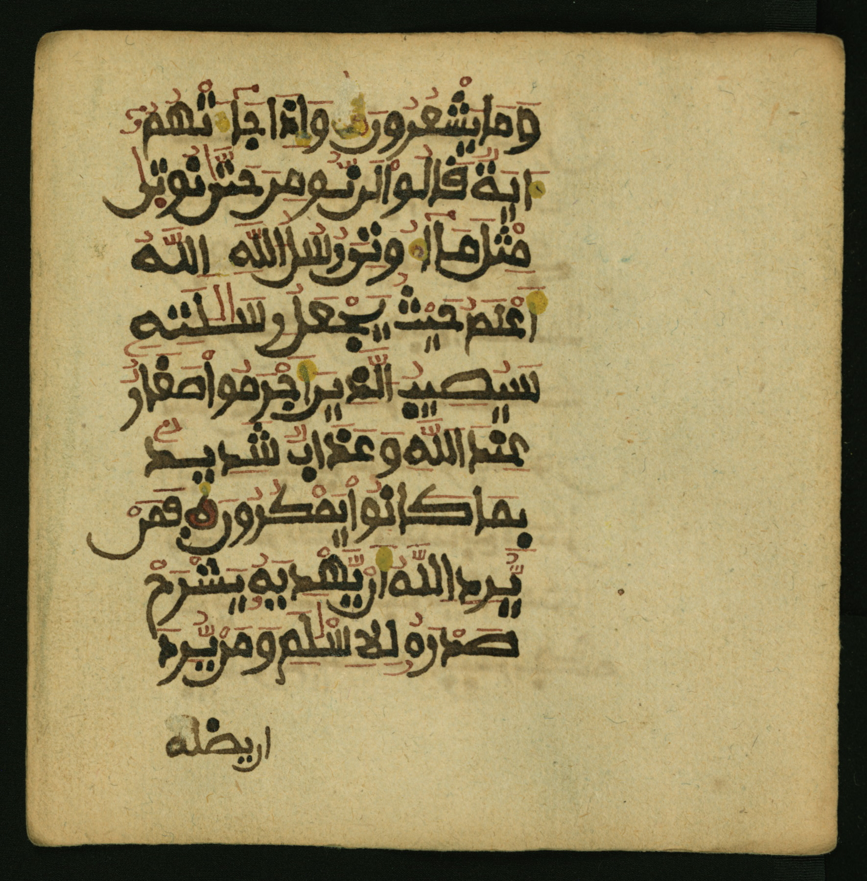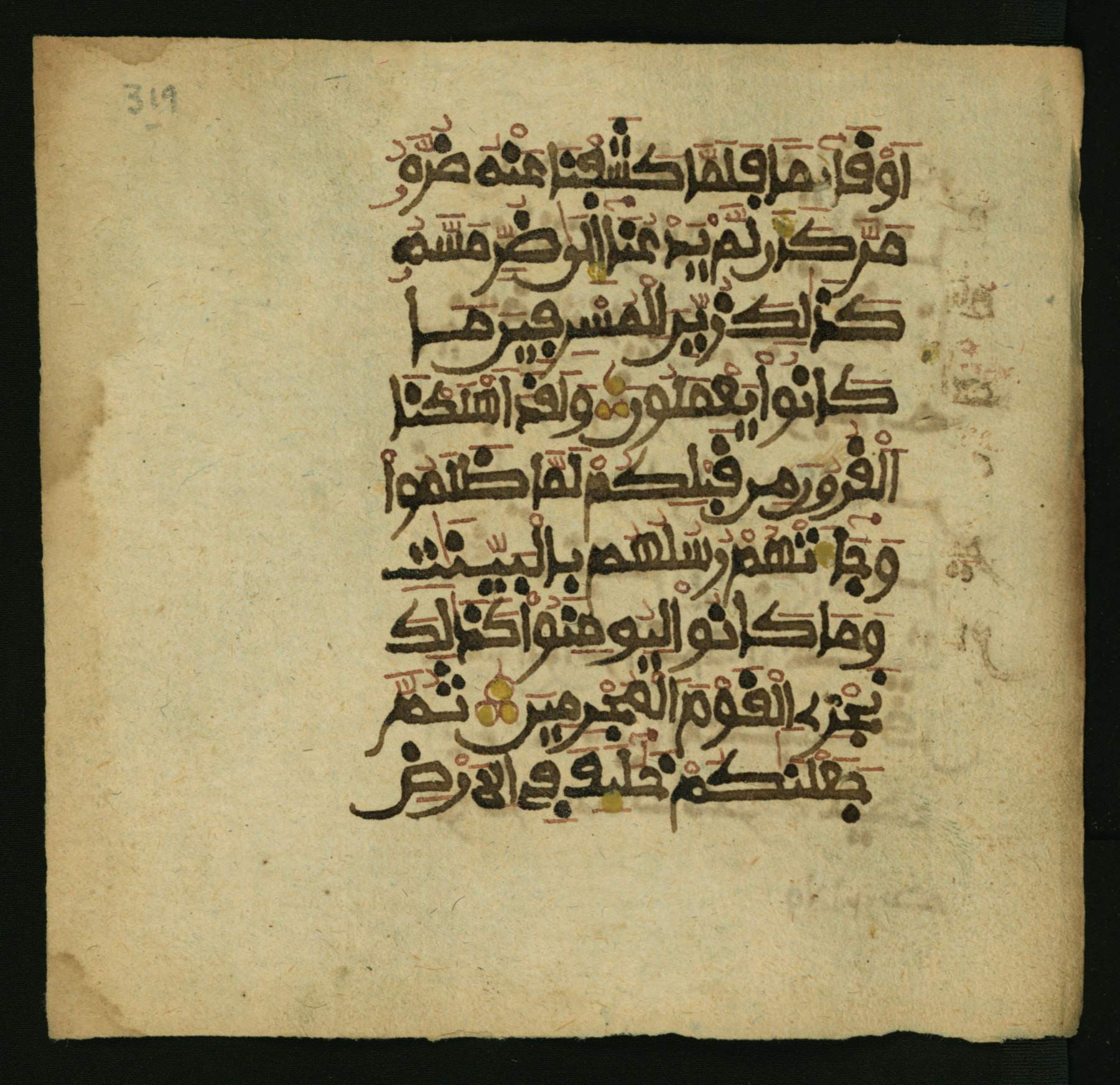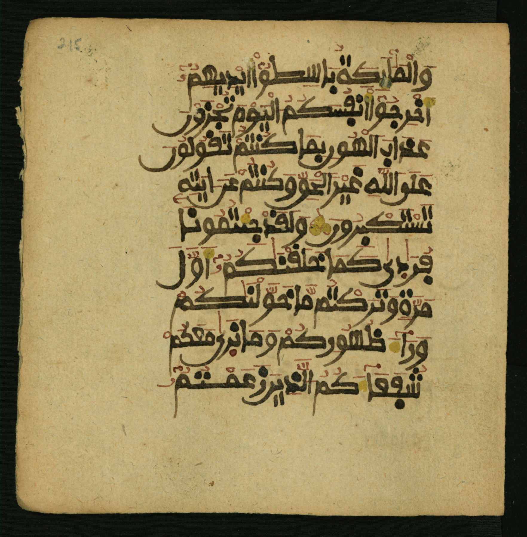 This square-format manuscript is volume 1, containing chapters 1-18 (Sūrat al-fātiḥah through Sūrat al-kahf), of an illuminated two-volume Qur'an produced in Sub-Saharan (West) Africa in the thirteenth century AH / nineteenth CE. The text is written in Sūdānī script in dark brown ink with vocalization in red on loose leaves. Chapter headings are in reddish-brown ink. Three yellow dots outlined in red arranged in a triangular form separate verses. Polychrome circular medallions as well as square and rectangular devices in a variety of patterns and colors mark textual divisions. The leaves of the text are organized between two decorated boards with geometric compositions. The pages and boards are housed in a leather pouch (satchel).
