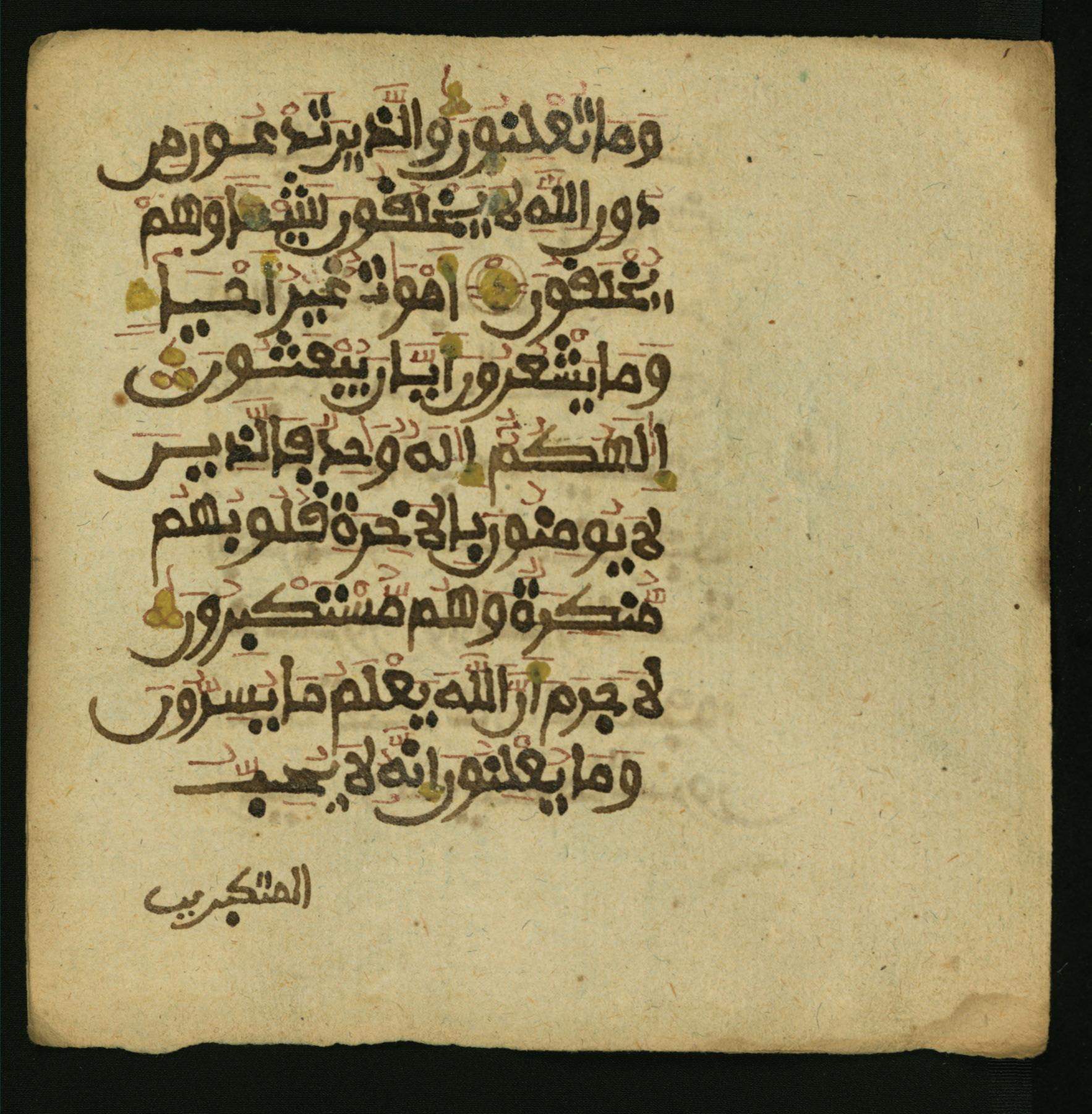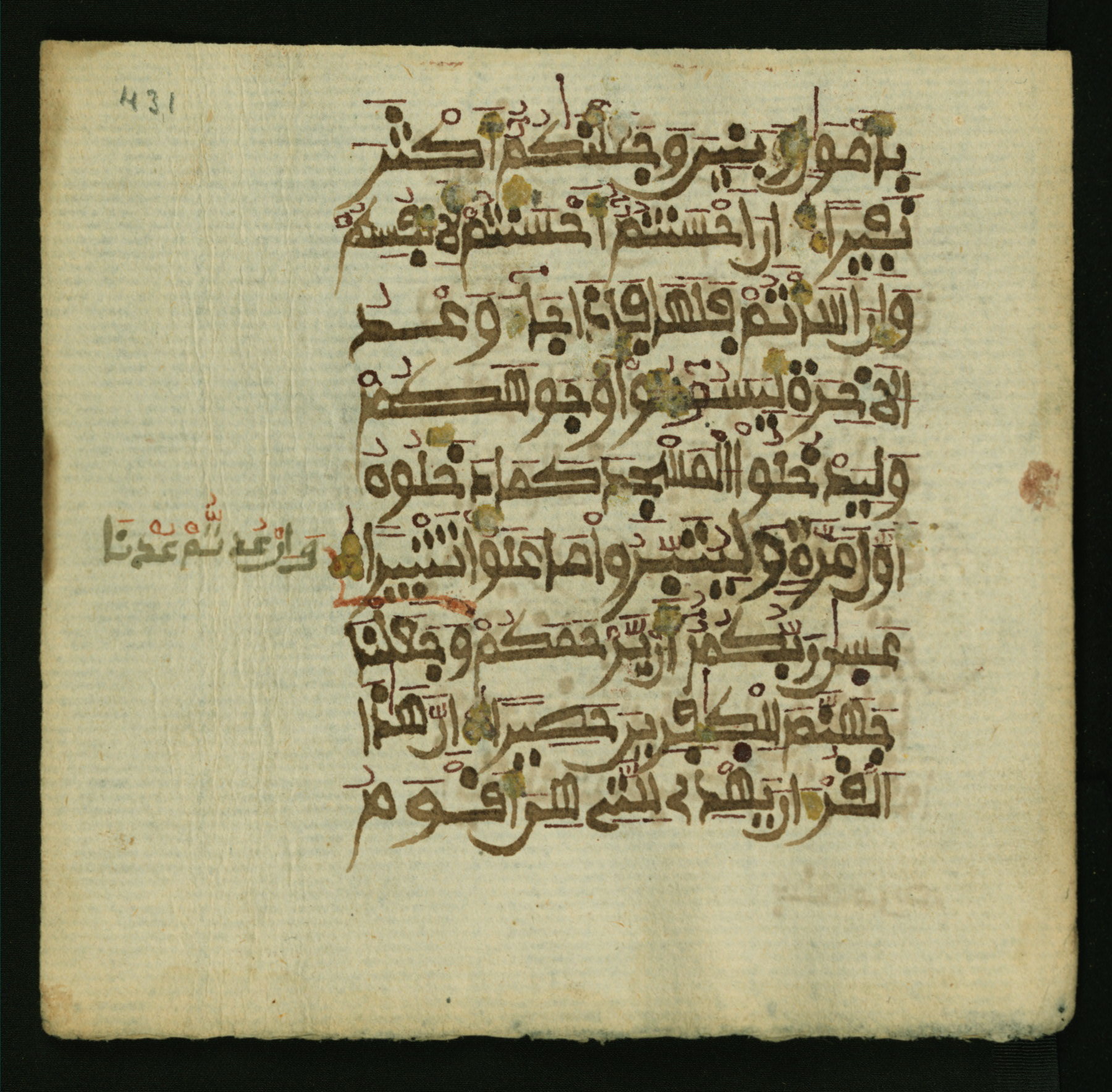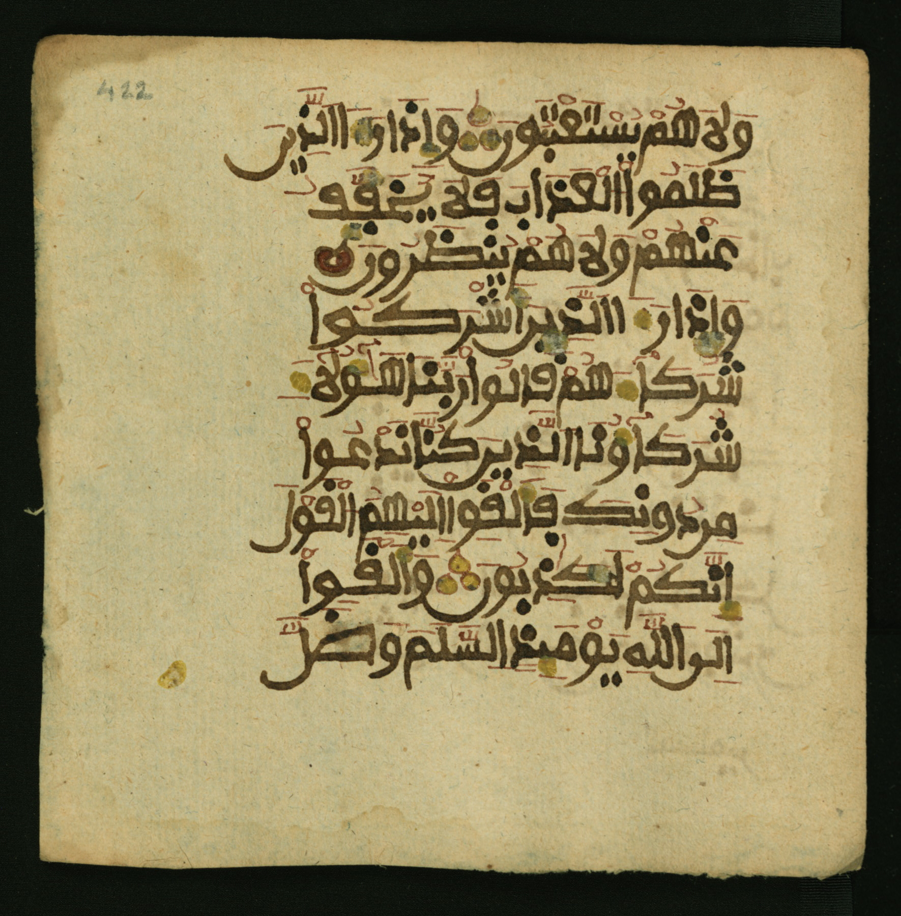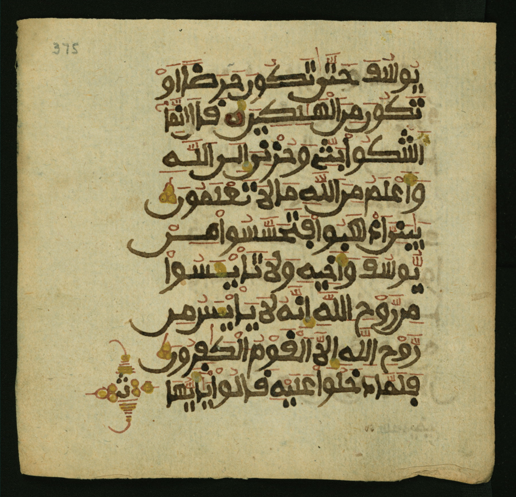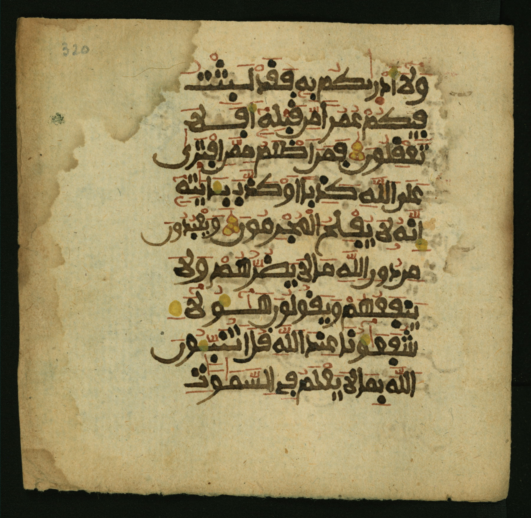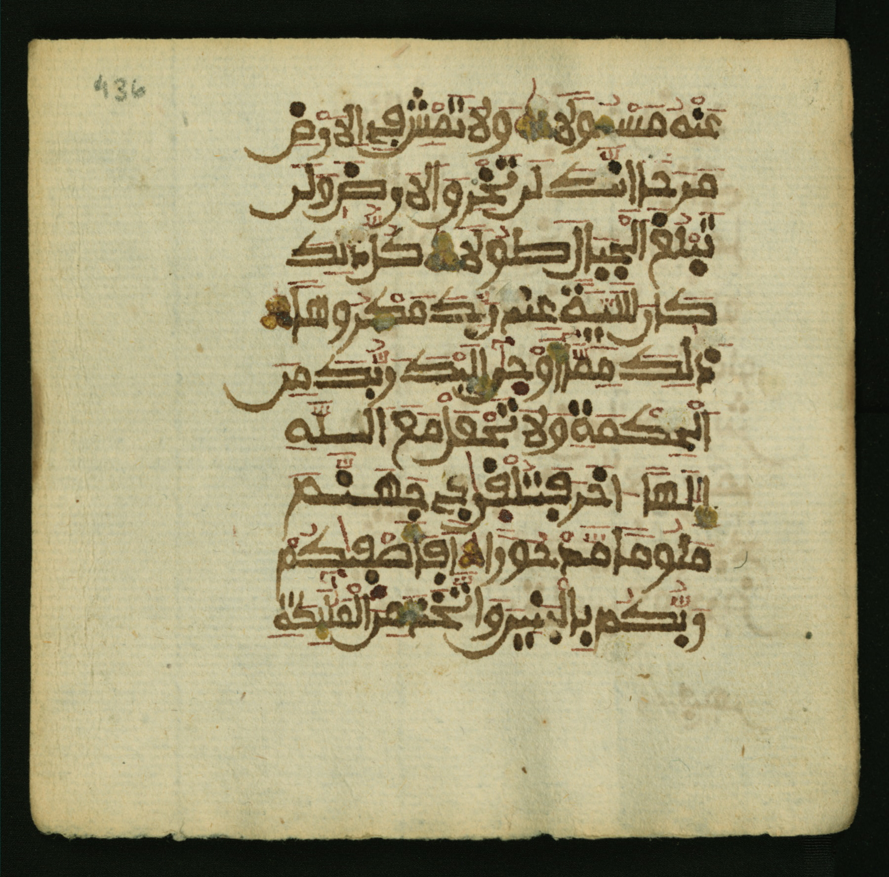 This square-format manuscript is volume 1, containing chapters 1-18 (Sūrat al-fātiḥah through Sūrat al-kahf), of an illuminated two-volume Qur'an produced in Sub-Saharan (West) Africa in the thirteenth century AH / nineteenth CE. The text is written in Sūdānī script in dark brown ink with vocalization in red on loose leaves. Chapter headings are in reddish-brown ink. Three yellow dots outlined in red arranged in a triangular form separate verses. Polychrome circular medallions as well as square and rectangular devices in a variety of patterns and colors mark textual divisions. The leaves of the text are organized between two decorated boards with geometric compositions. The pages and boards are housed in a leather pouch (satchel).