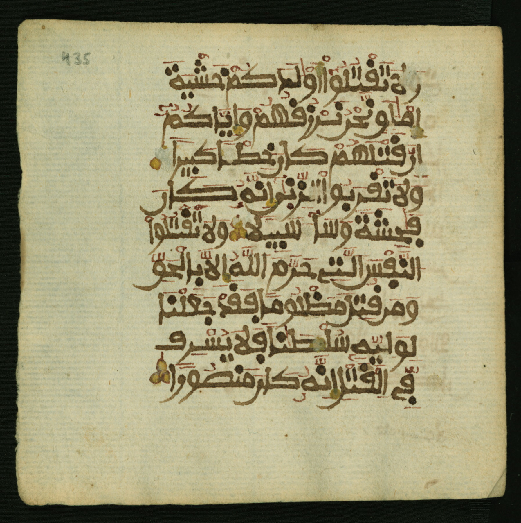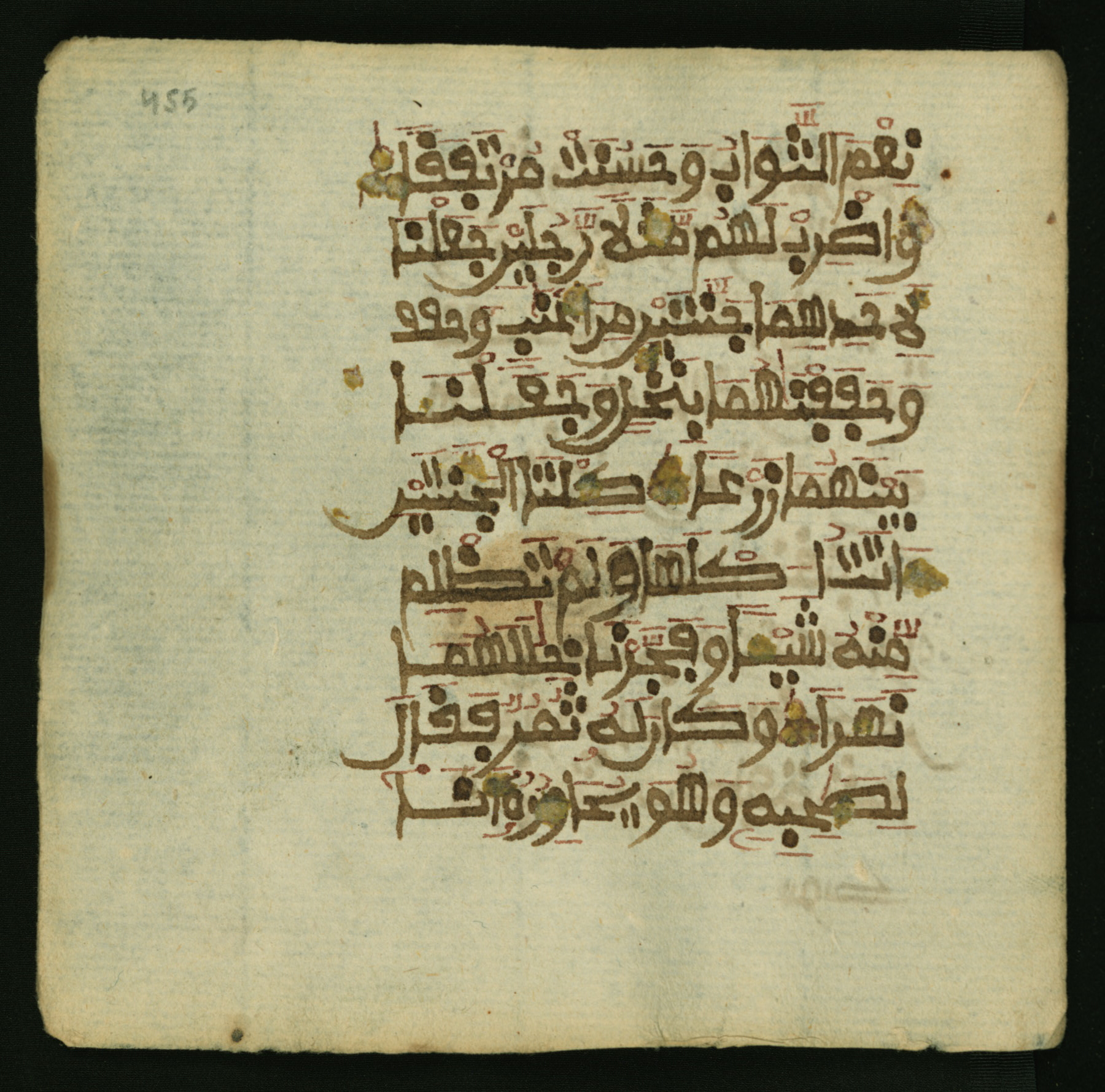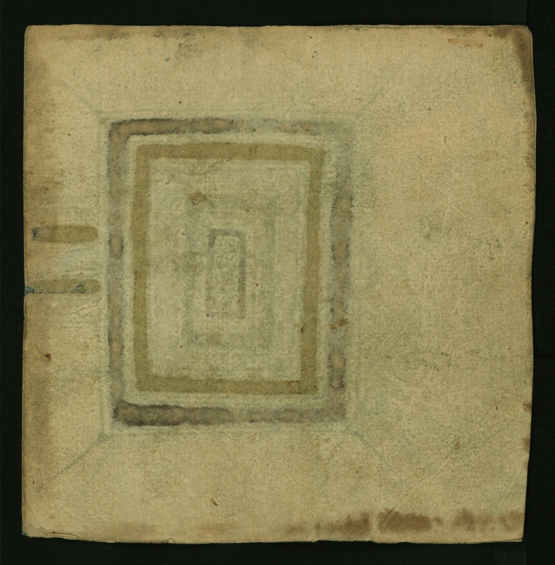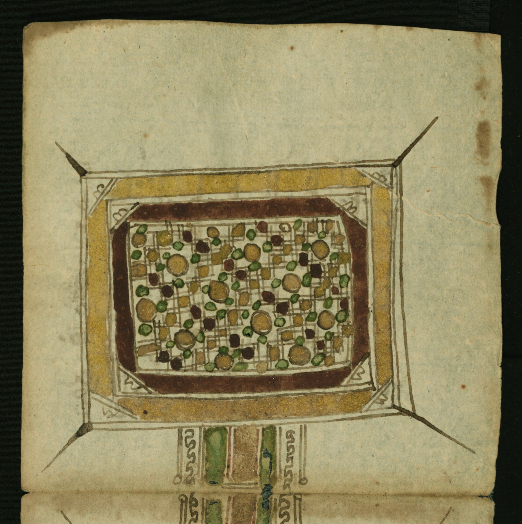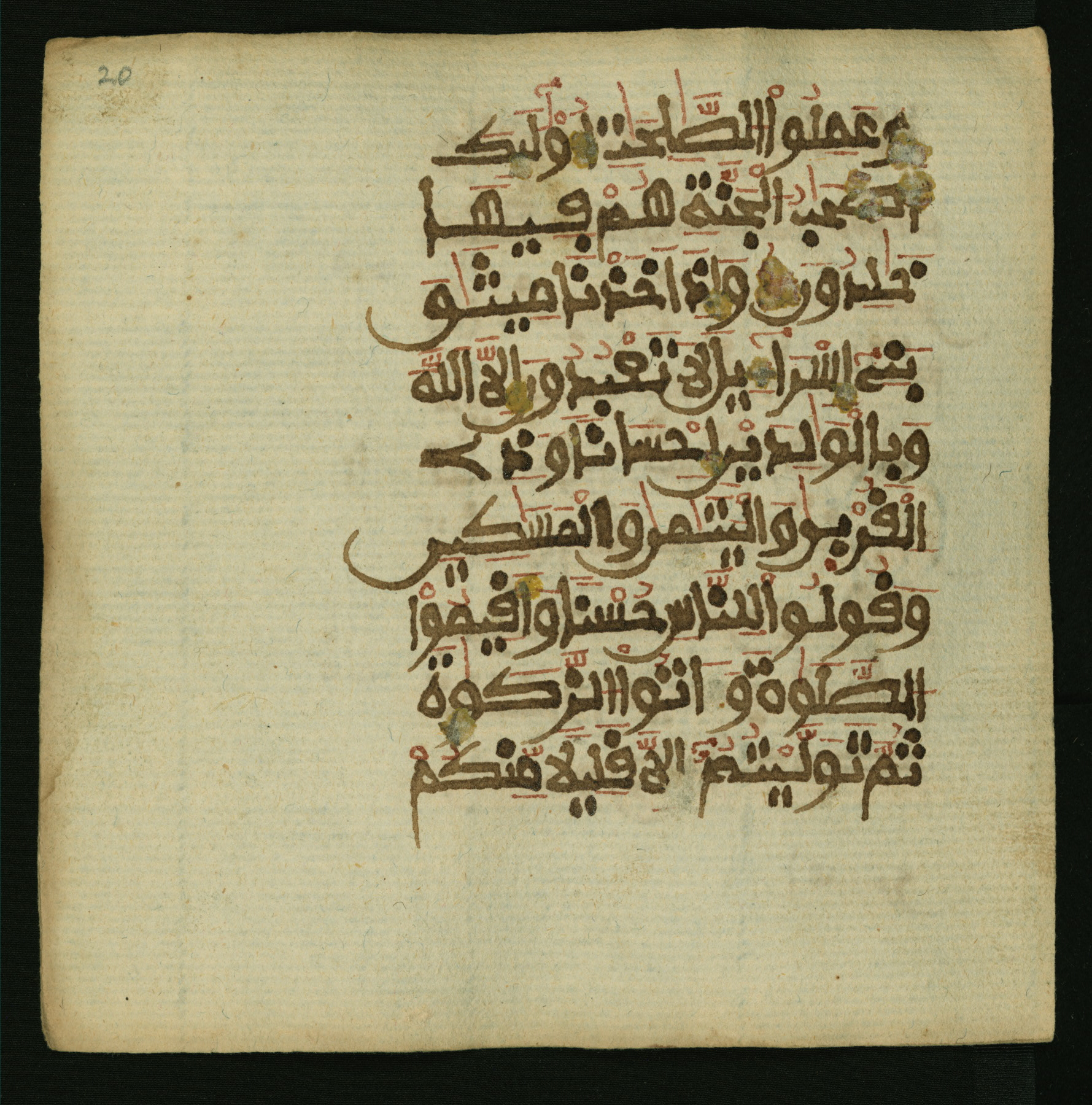 This square-format manuscript is volume 1, containing chapters 1-18 (Sūrat al-fātiḥah through Sūrat al-kahf), of an illuminated two-volume Qur'an produced in Sub-Saharan (West) Africa in the thirteenth century AH / nineteenth CE. The text is written in Sūdānī script in dark brown ink with vocalization in red on loose leaves. Chapter headings are in reddish-brown ink. Three yellow dots outlined in red arranged in a triangular form separate verses. Polychrome circular medallions as well as square and rectangular devices in a variety of patterns and colors mark textual divisions. The leaves of the text are organized between two decorated boards with geometric compositions. The pages and boards are housed in a leather pouch (satchel).