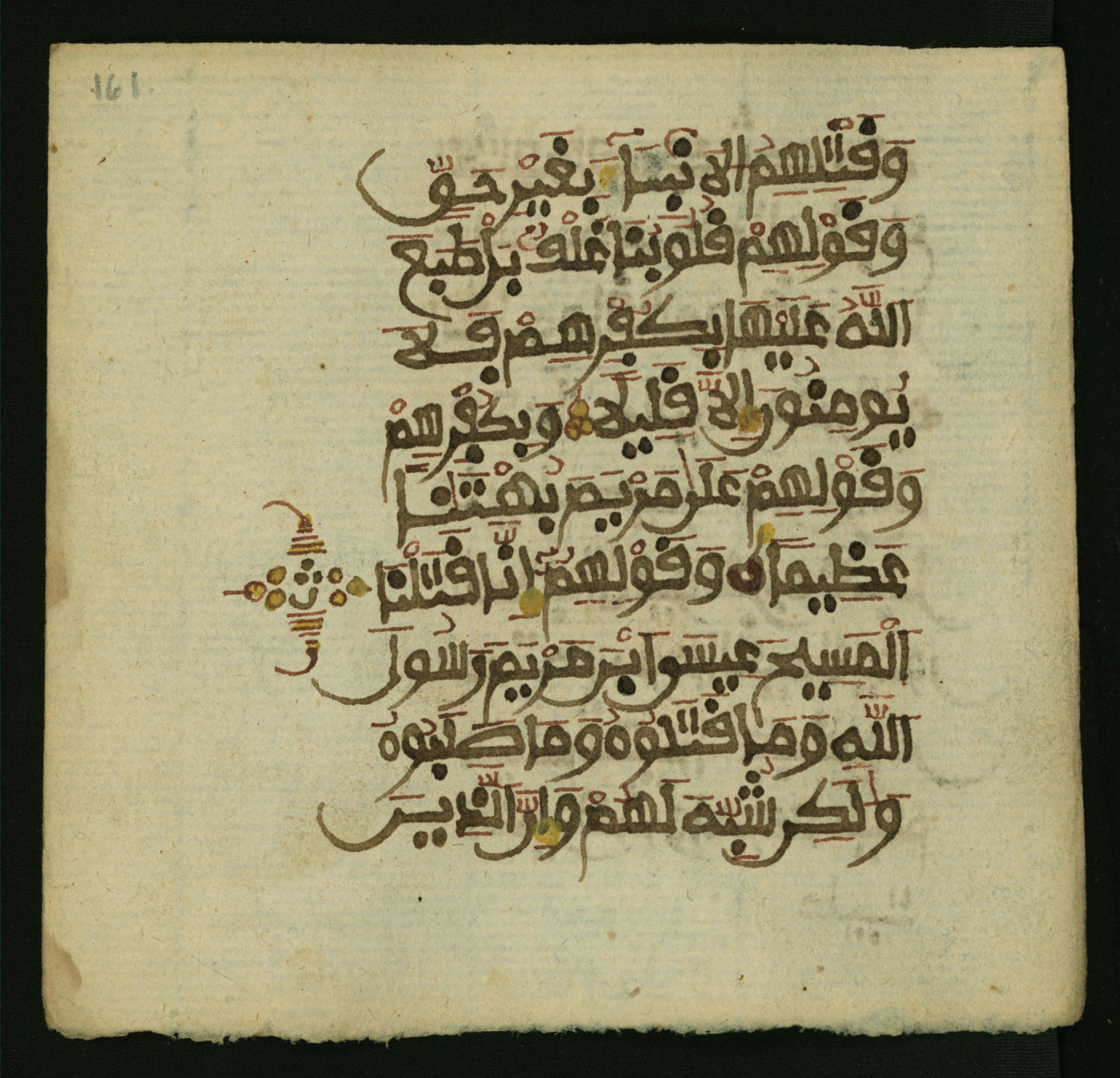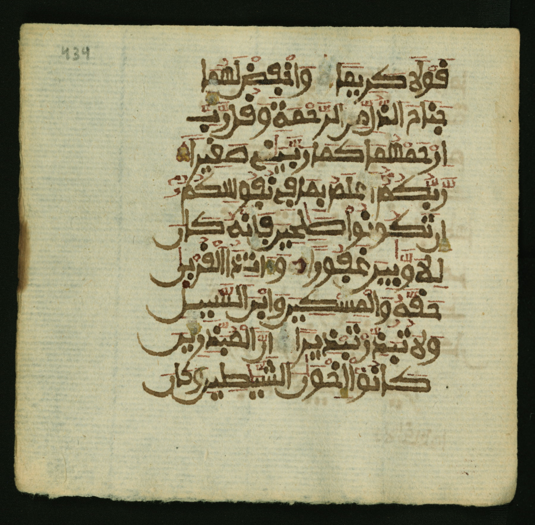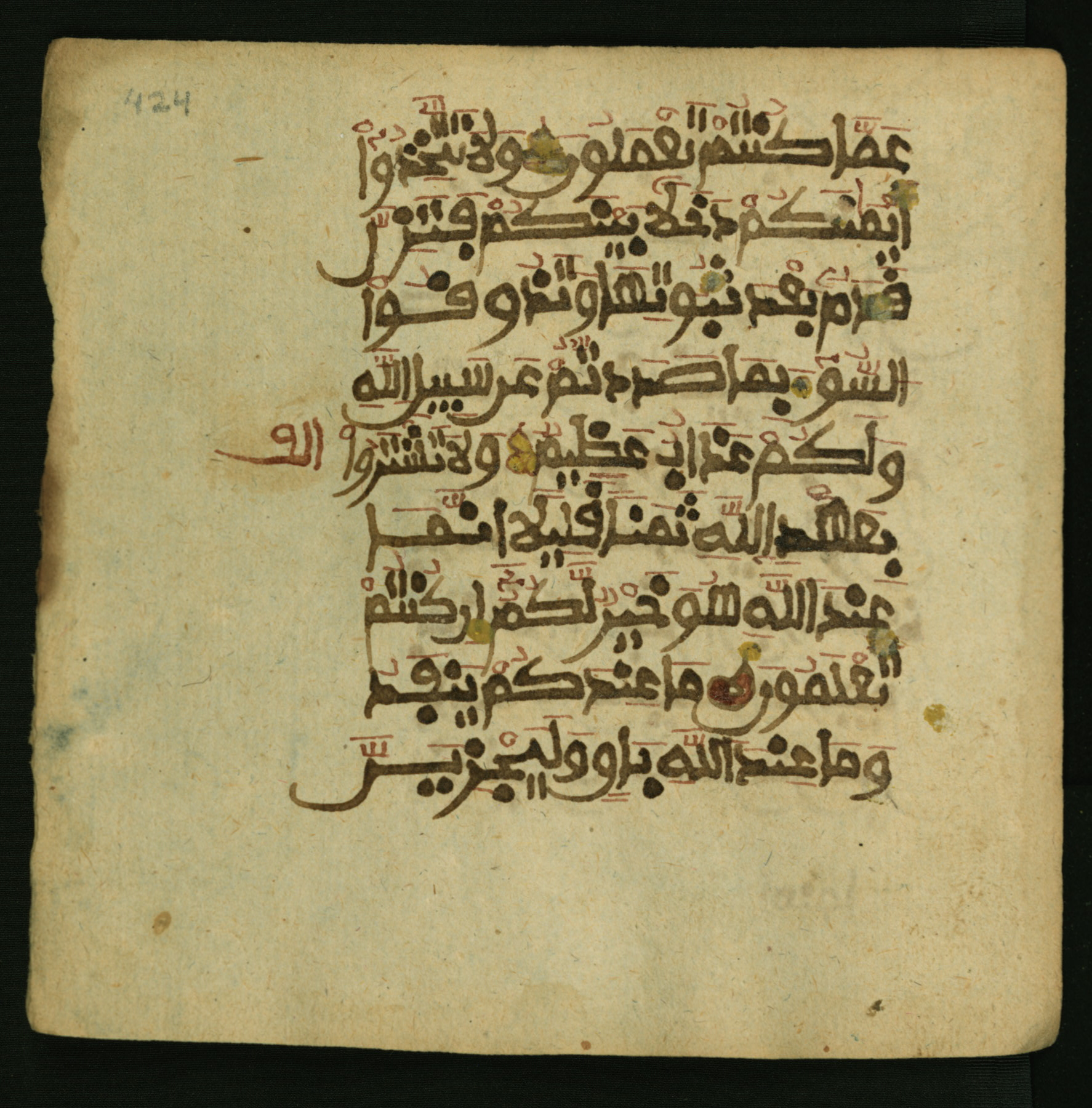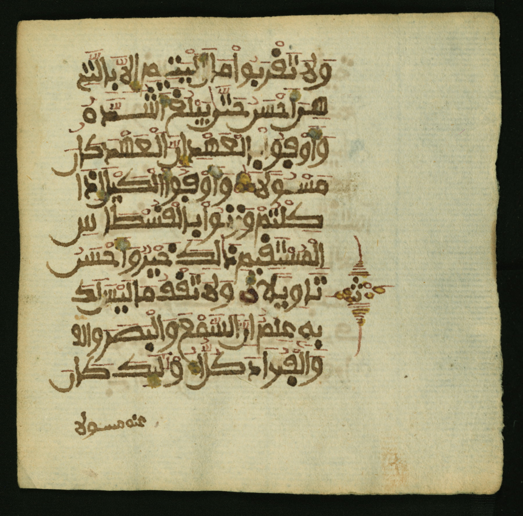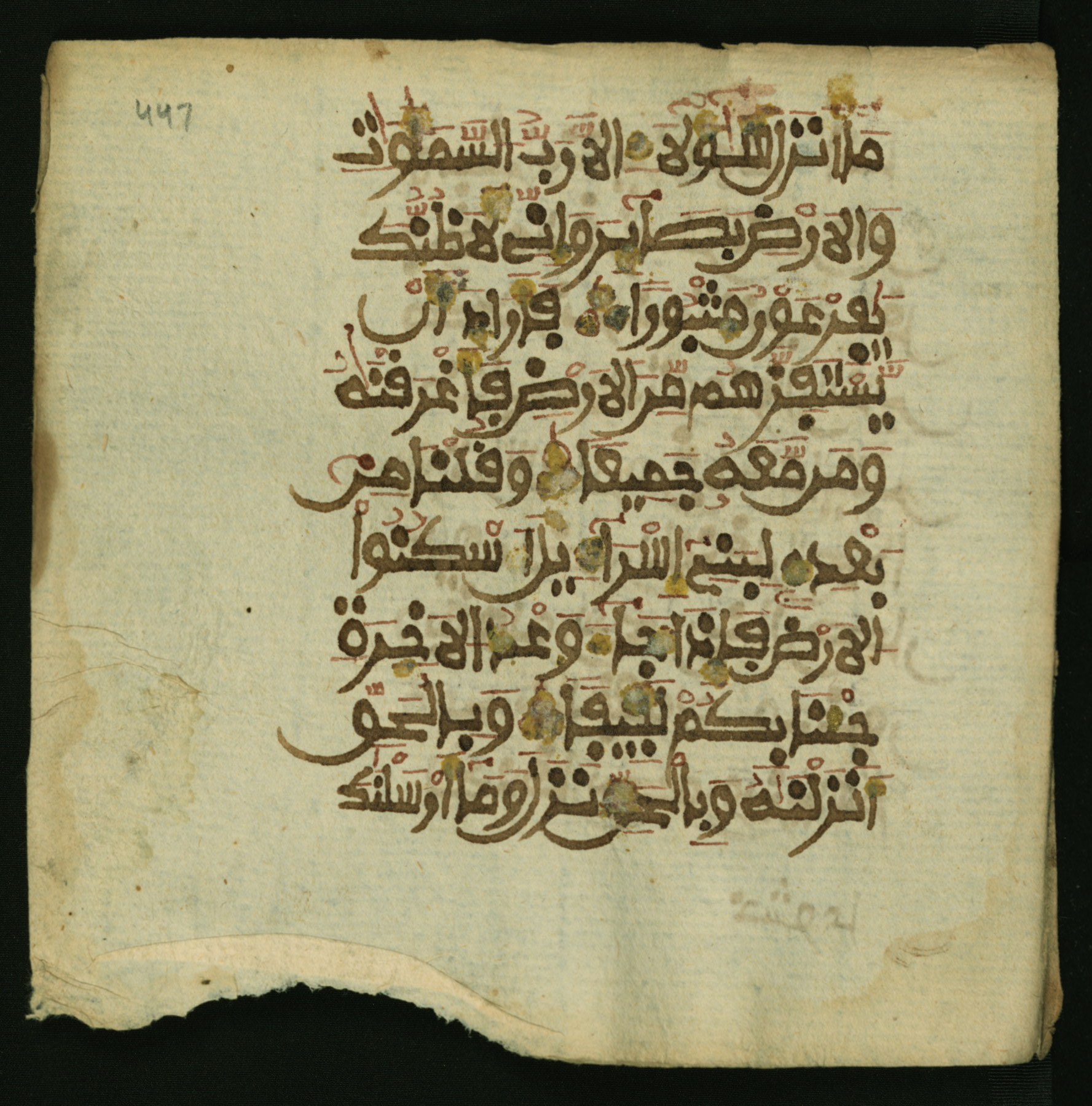 This square-format manuscript is volume 1, containing chapters 1-18 (Sūrat al-fātiḥah through Sūrat al-kahf), of an illuminated two-volume Qur'an produced in Sub-Saharan (West) Africa in the thirteenth century AH / nineteenth CE. The text is written in Sūdānī script in dark brown ink with vocalization in red on loose leaves. Chapter headings are in reddish-brown ink. Three yellow dots outlined in red arranged in a triangular form separate verses. Polychrome circular medallions as well as square and rectangular devices in a variety of patterns and colors mark textual divisions. The leaves of the text are organized between two decorated boards with geometric compositions. The pages and boards are housed in a leather pouch (satchel).