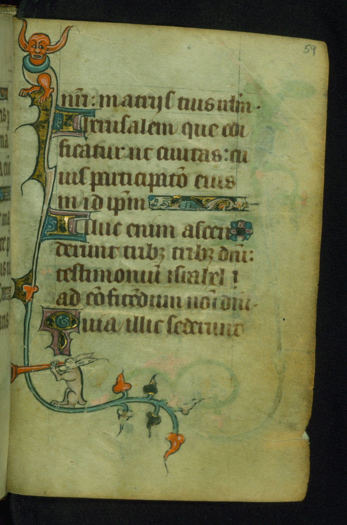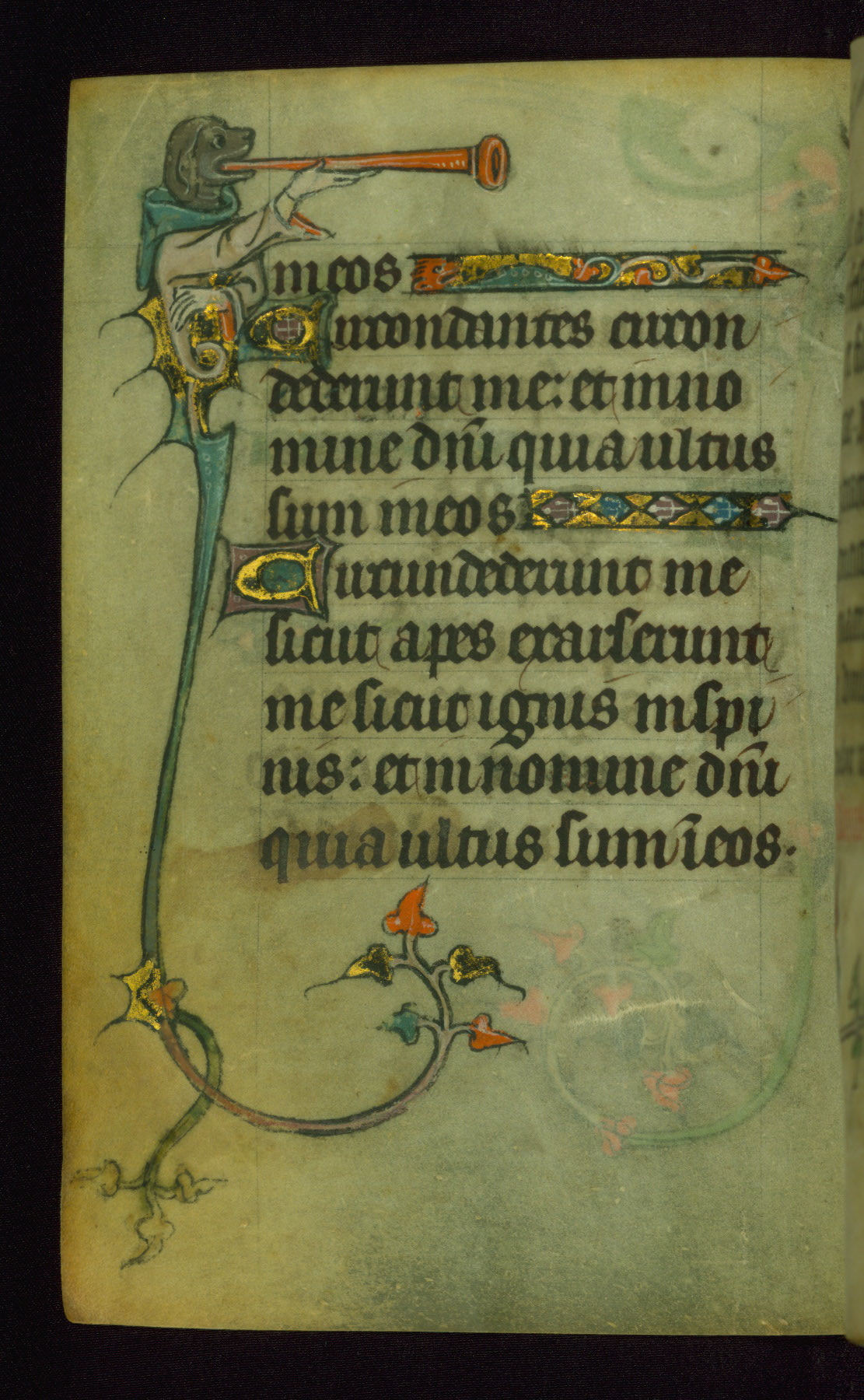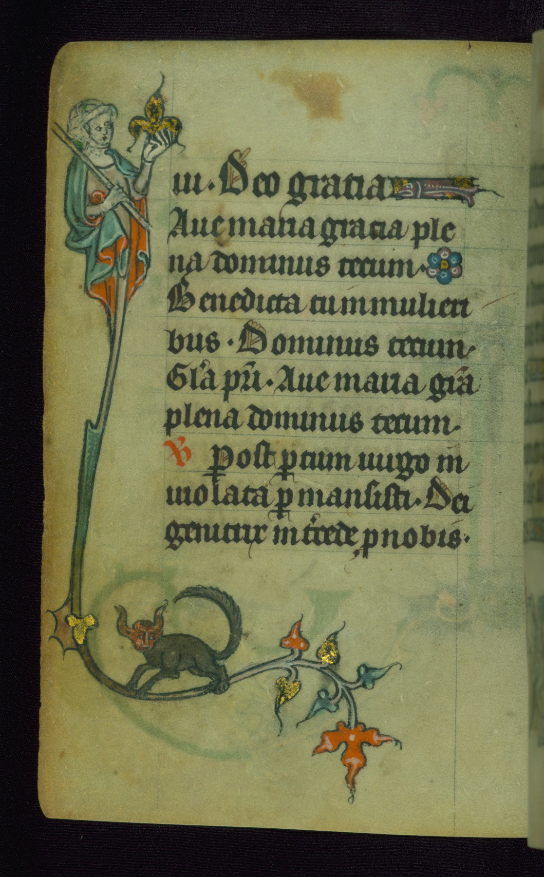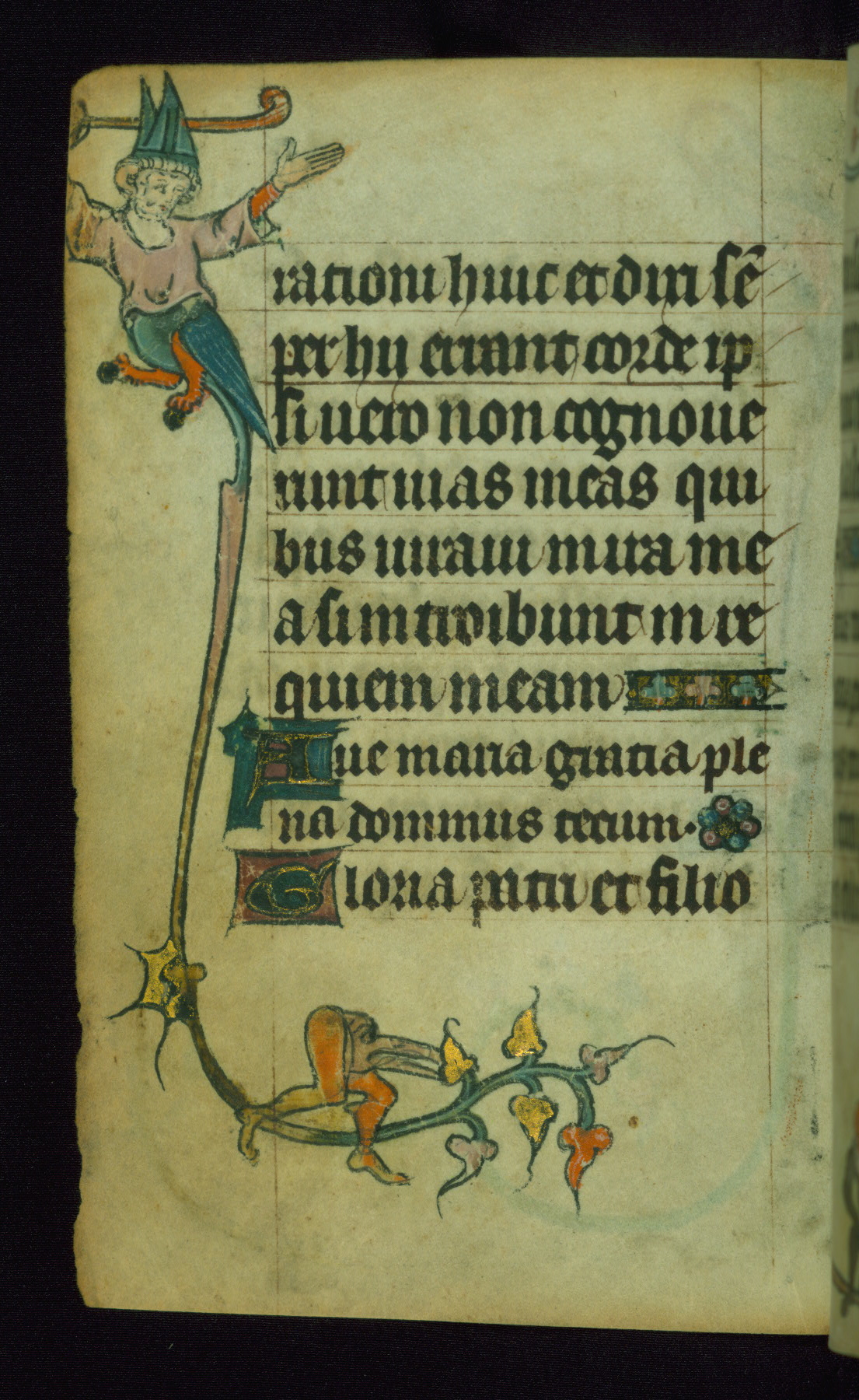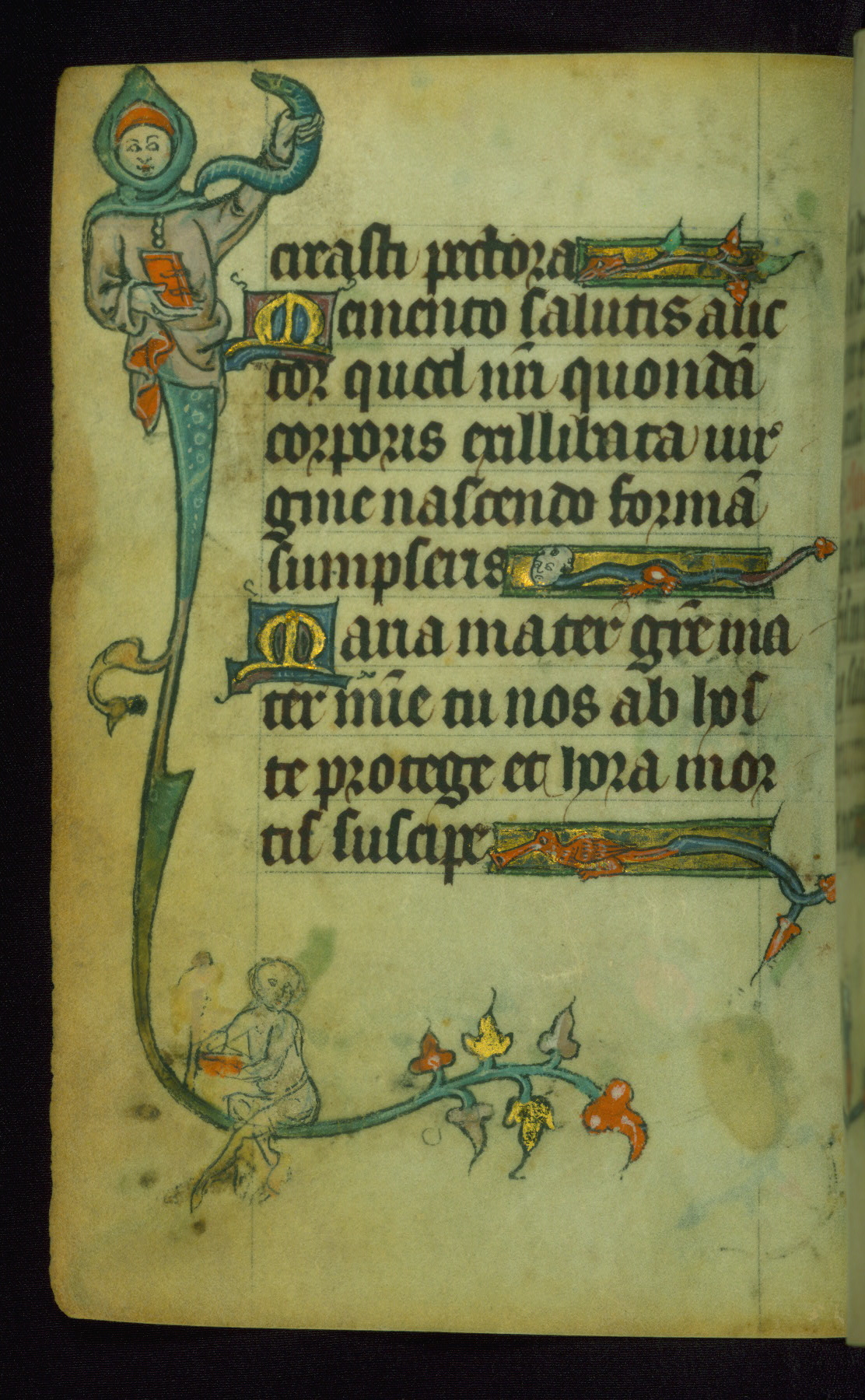 This Book of Hours was made ca. 1310-20, likely in Ghent. It was badly rebound with a sixteenth-century Flemish binding by Léon Gruel in Paris at the end of the nineteenth or early twentieth century, and the initials of Gruel and Engelmann are printed on the bookplate on the front pastedown. The manuscript lacks its calendar, and the text is incomplete and misbound. In the fourteenth century a prayer for Communion, written in French, was added at the end of the book. Initials in gold, blue and pink mark the divisions of the text. The manuscript is richly illuminated with drolleries; painted on the borders of each folio, they would have amused the reader with their playful animals, hybrids, and human figures.