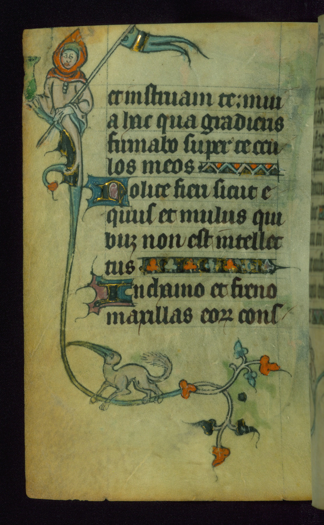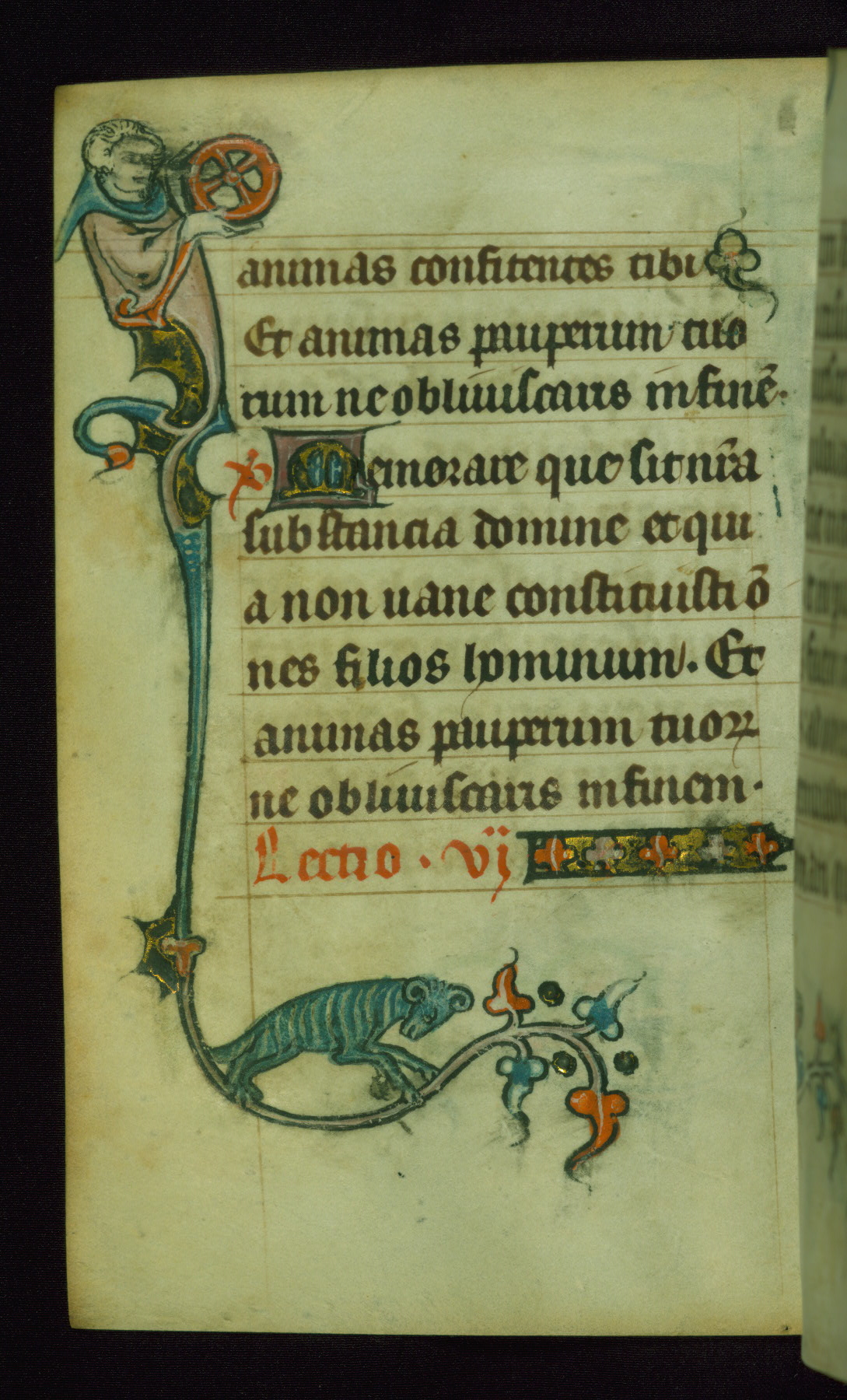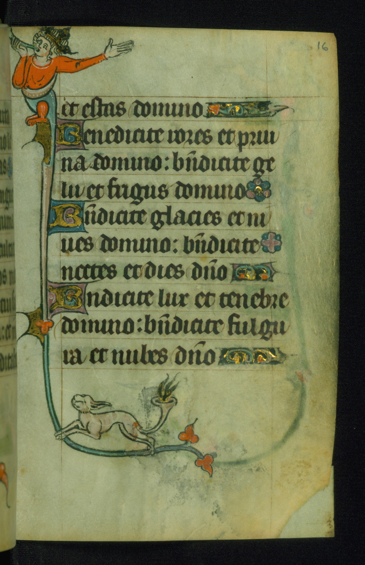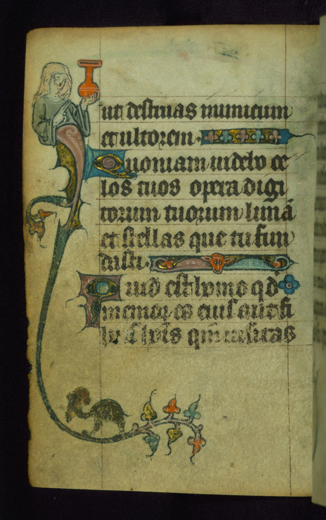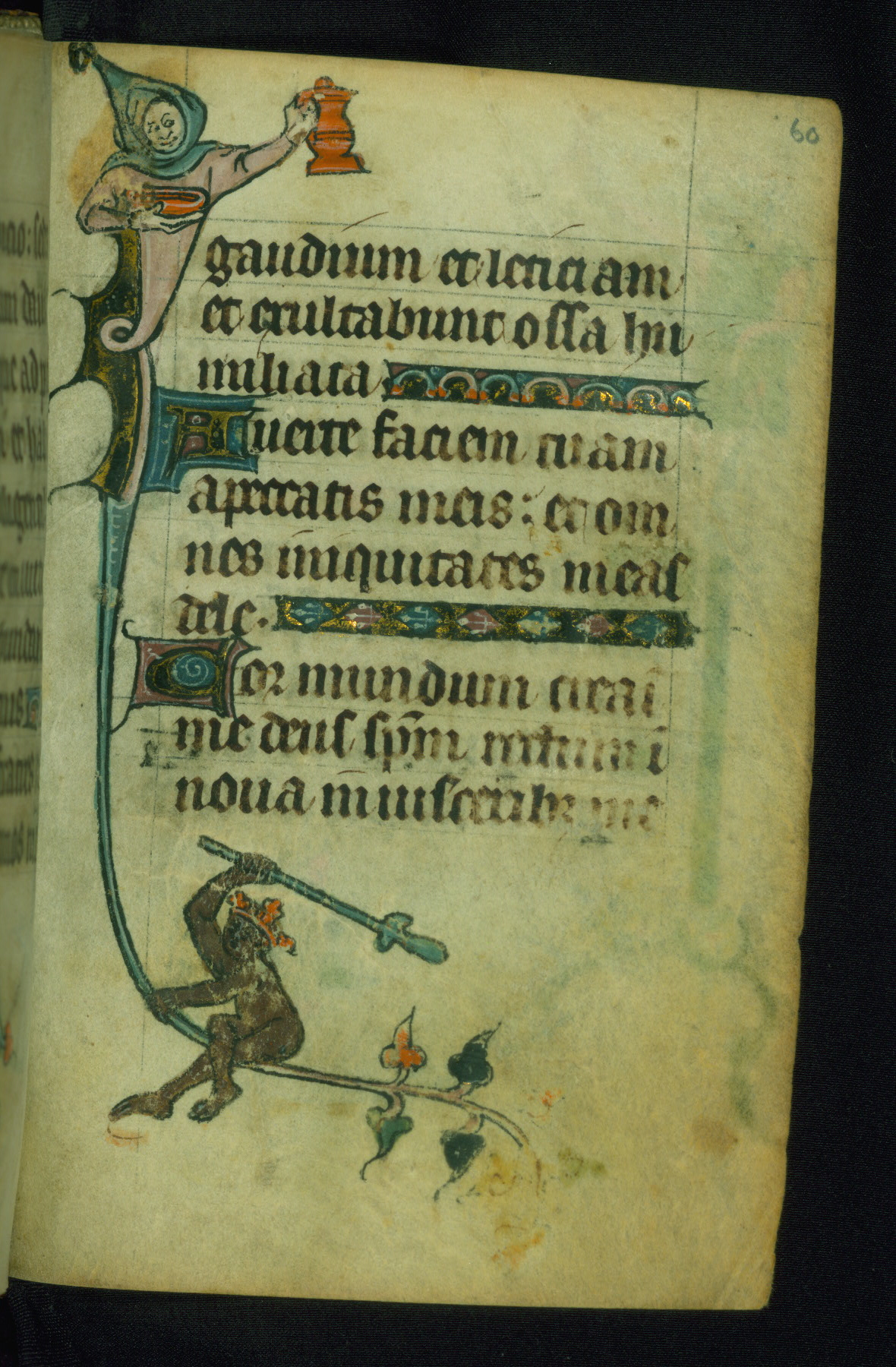 This Book of Hours was made ca. 1310-20, likely in Ghent. It was badly rebound with a sixteenth-century Flemish binding by Léon Gruel in Paris at the end of the nineteenth or early twentieth century, and the initials of Gruel and Engelmann are printed on the bookplate on the front pastedown. The manuscript lacks its calendar, and the text is incomplete and misbound. In the fourteenth century a prayer for Communion, written in French, was added at the end of the book. Initials in gold, blue and pink mark the divisions of the text. The manuscript is richly illuminated with drolleries; painted on the borders of each folio, they would have amused the reader with their playful animals, hybrids, and human figures.