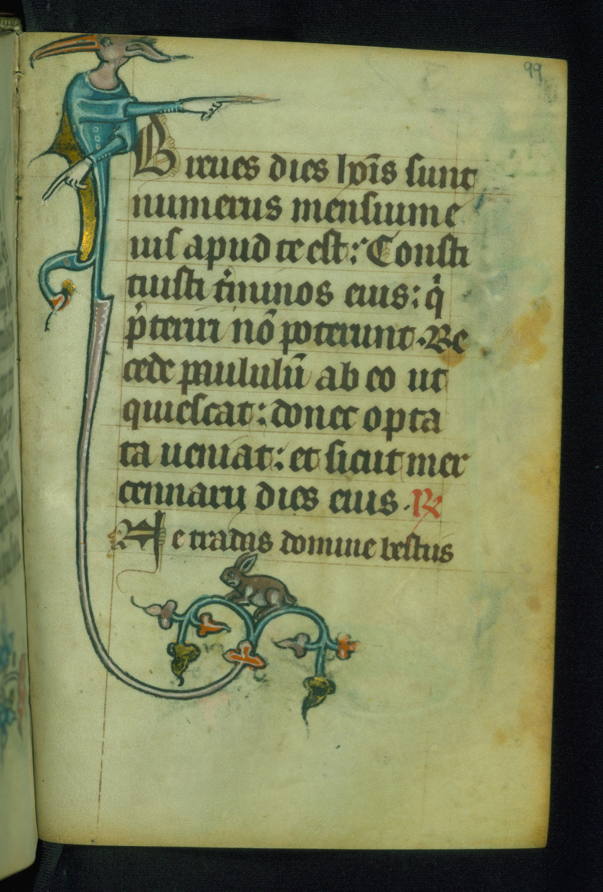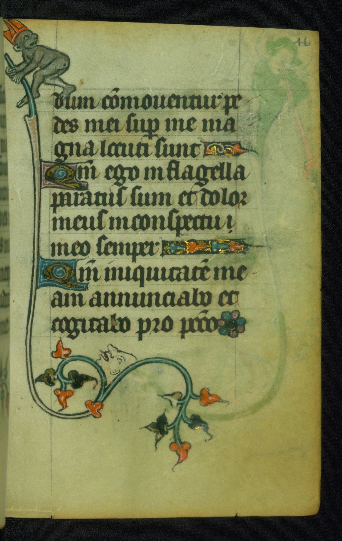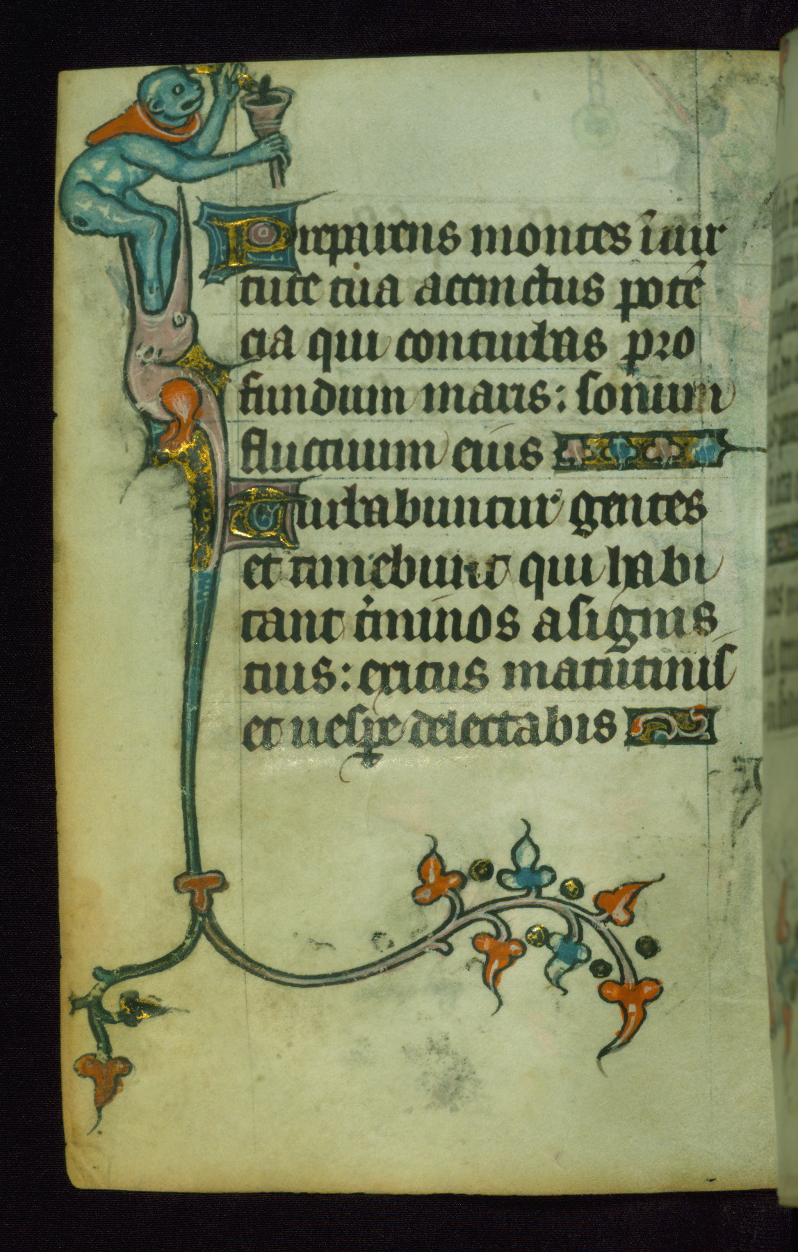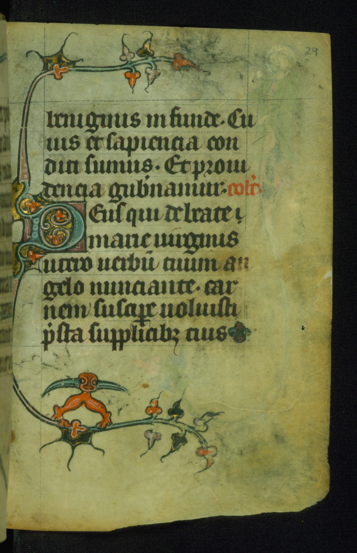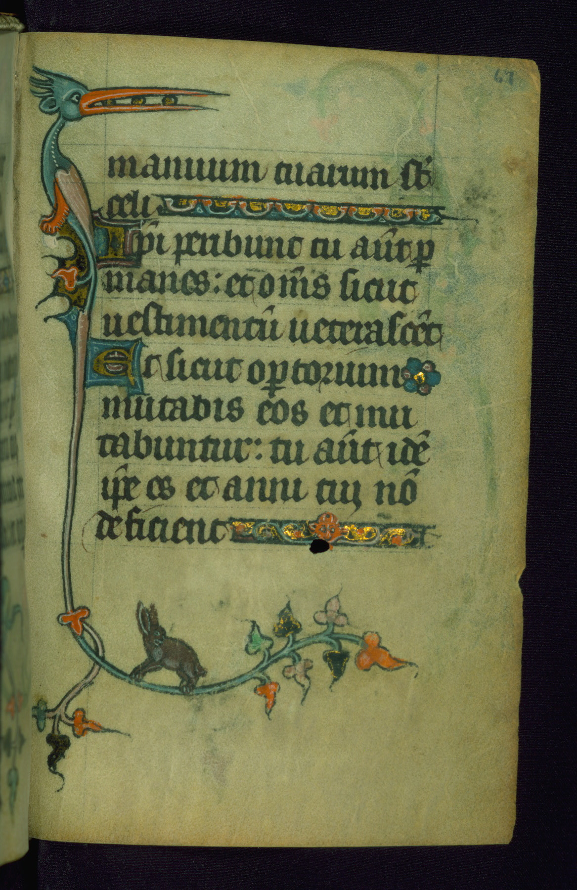 This Book of Hours was made ca. 1310-20, likely in Ghent. It was badly rebound with a sixteenth-century Flemish binding by Léon Gruel in Paris at the end of the nineteenth or early twentieth century, and the initials of Gruel and Engelmann are printed on the bookplate on the front pastedown. The manuscript lacks its calendar, and the text is incomplete and misbound. In the fourteenth century a prayer for Communion, written in French, was added at the end of the book. Initials in gold, blue and pink mark the divisions of the text. The manuscript is richly illuminated with drolleries; painted on the borders of each folio, they would have amused the reader with their playful animals, hybrids, and human figures.