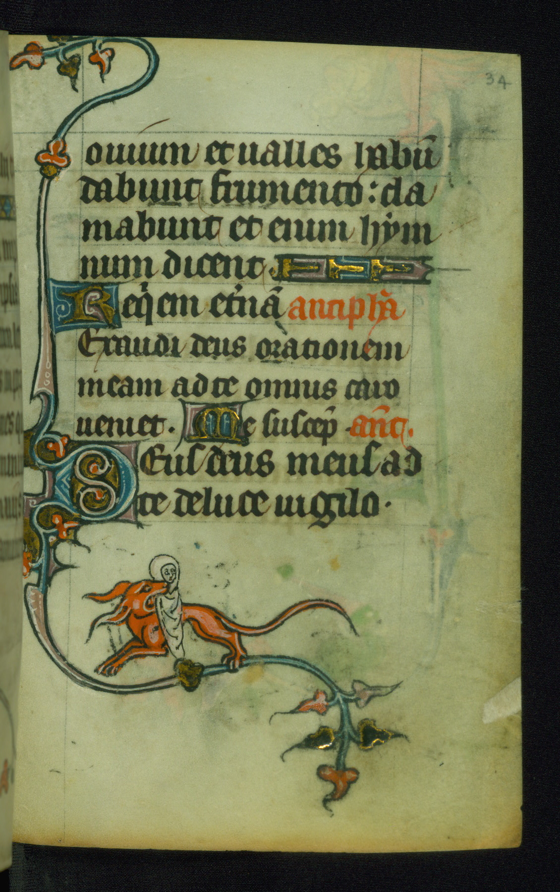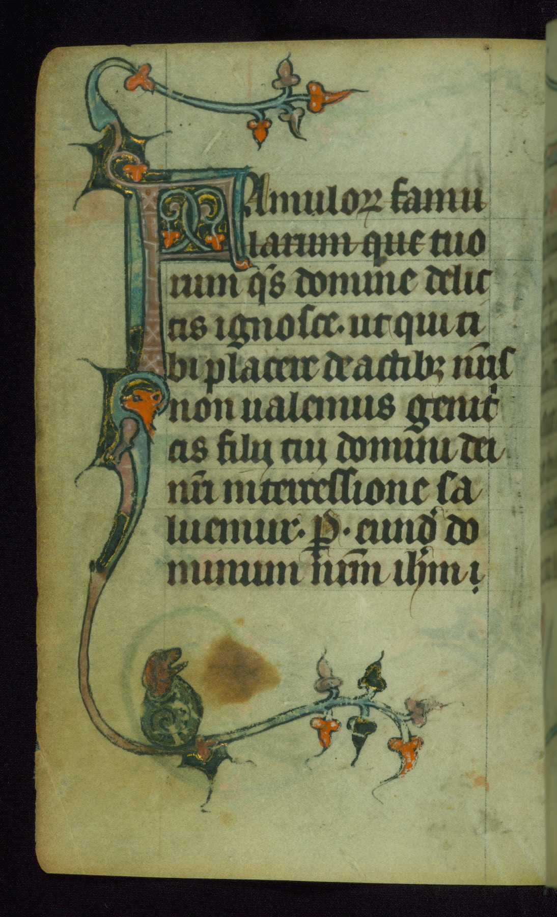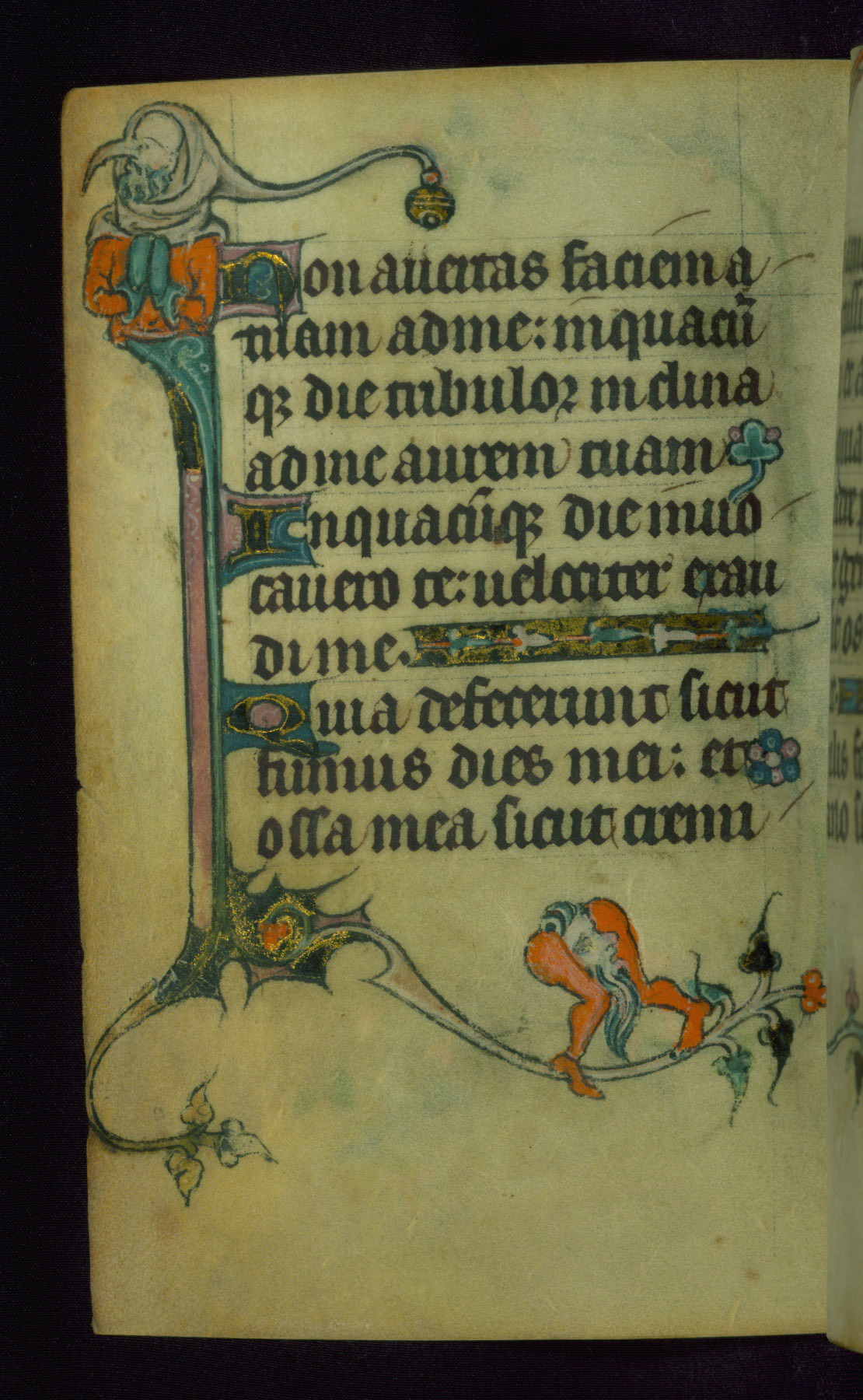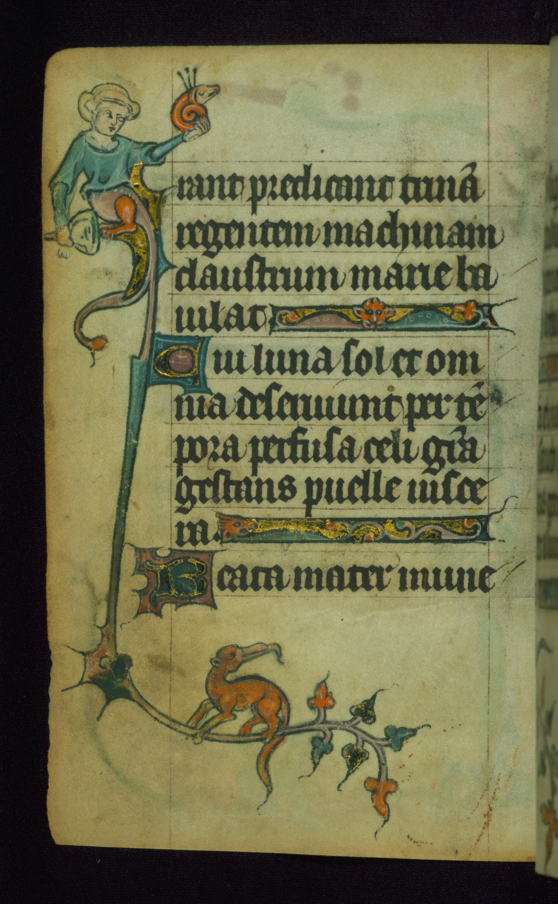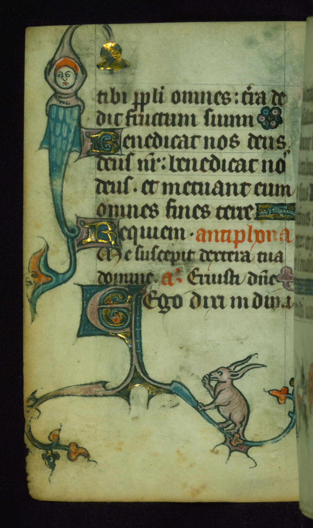 This Book of Hours was made ca. 1310-20, likely in Ghent. It was badly rebound with a sixteenth-century Flemish binding by Léon Gruel in Paris at the end of the nineteenth or early twentieth century, and the initials of Gruel and Engelmann are printed on the bookplate on the front pastedown. The manuscript lacks its calendar, and the text is incomplete and misbound. In the fourteenth century a prayer for Communion, written in French, was added at the end of the book. Initials in gold, blue and pink mark the divisions of the text. The manuscript is richly illuminated with drolleries; painted on the borders of each folio, they would have amused the reader with their playful animals, hybrids, and human figures.