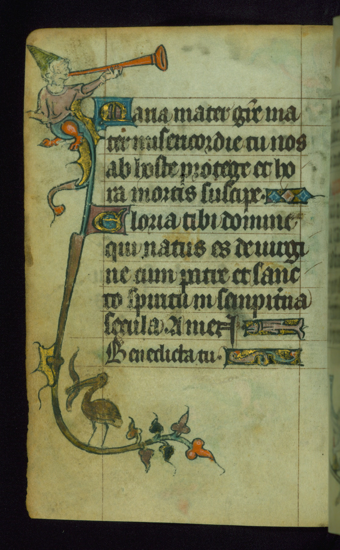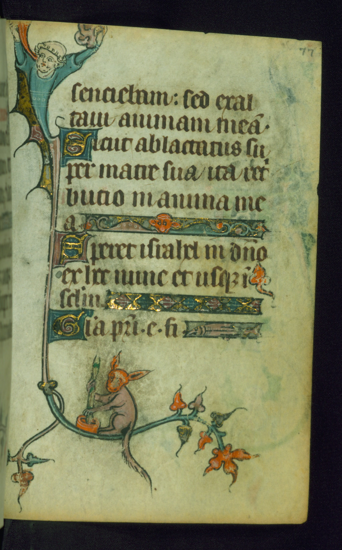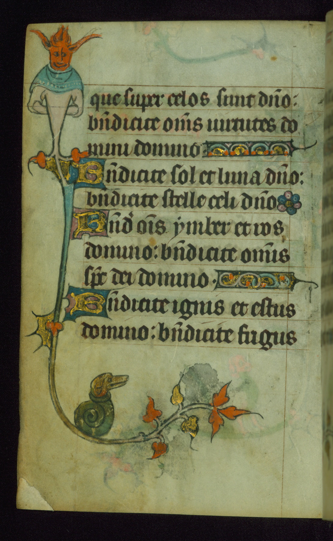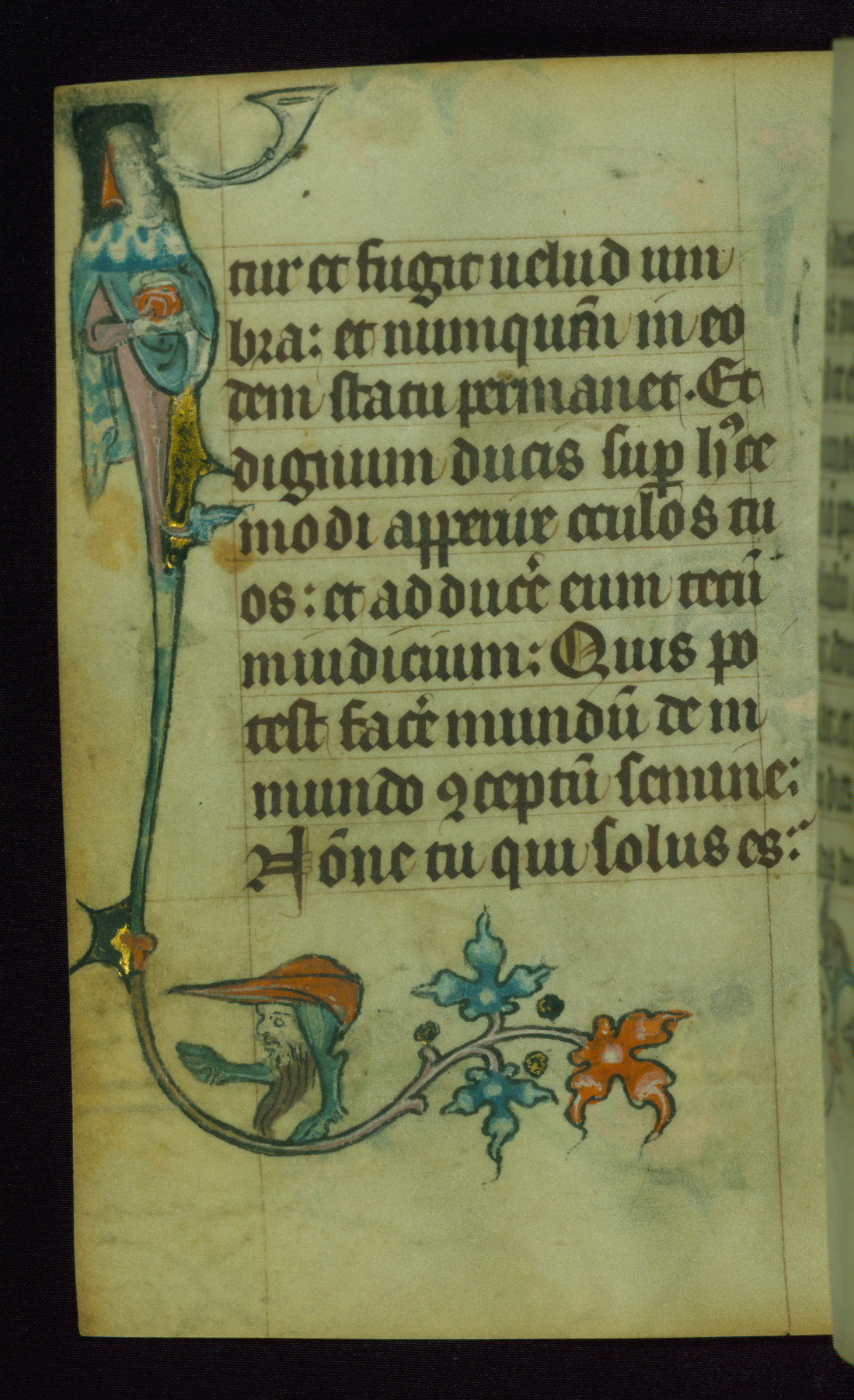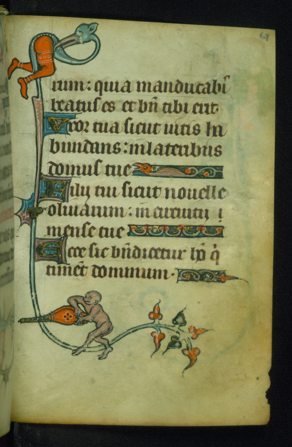 This Book of Hours was made ca. 1310-20, likely in Ghent. It was badly rebound with a sixteenth-century Flemish binding by Léon Gruel in Paris at the end of the nineteenth or early twentieth century, and the initials of Gruel and Engelmann are printed on the bookplate on the front pastedown. The manuscript lacks its calendar, and the text is incomplete and misbound. In the fourteenth century a prayer for Communion, written in French, was added at the end of the book. Initials in gold, blue and pink mark the divisions of the text. The manuscript is richly illuminated with drolleries; painted on the borders of each folio, they would have amused the reader with their playful animals, hybrids, and human figures.