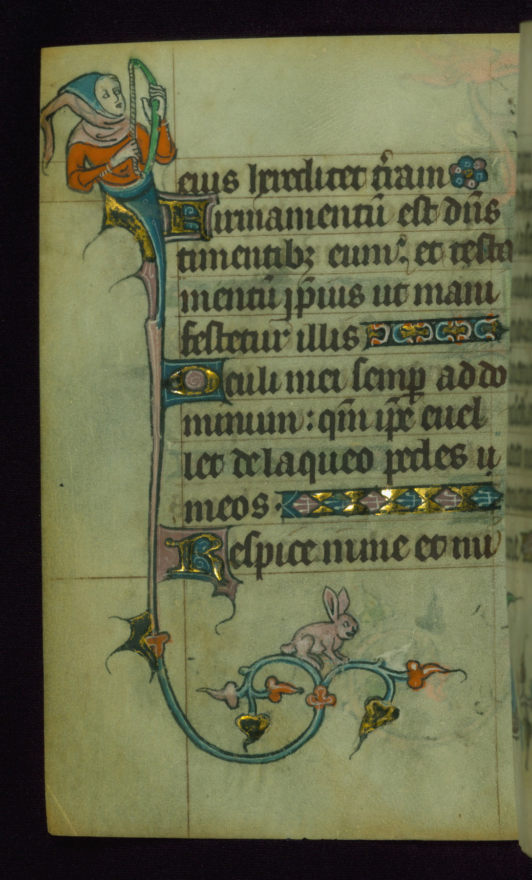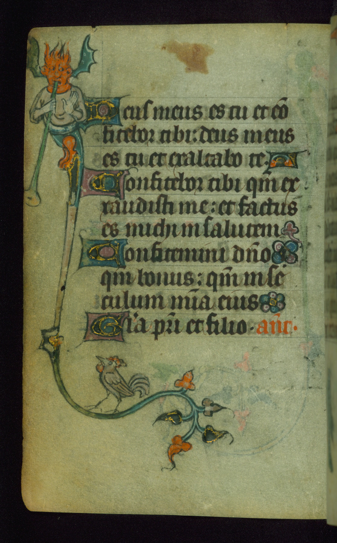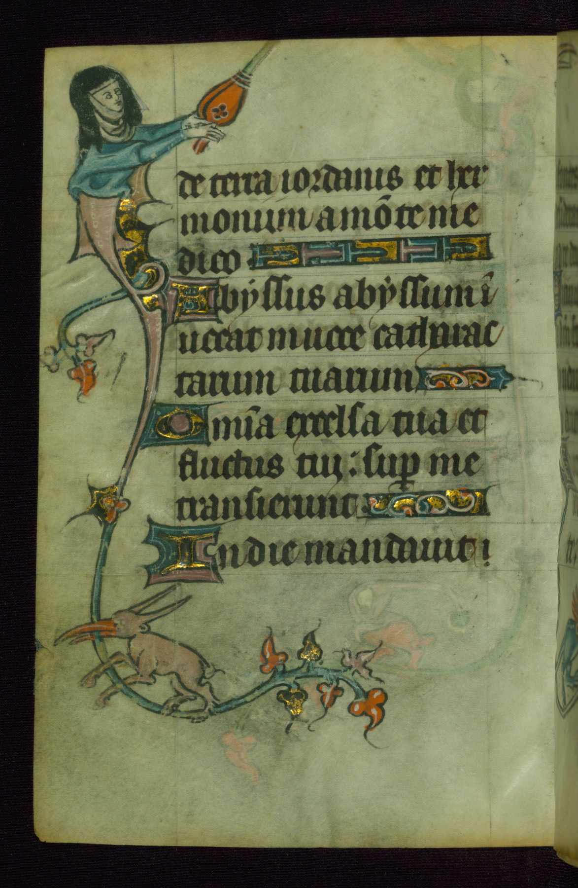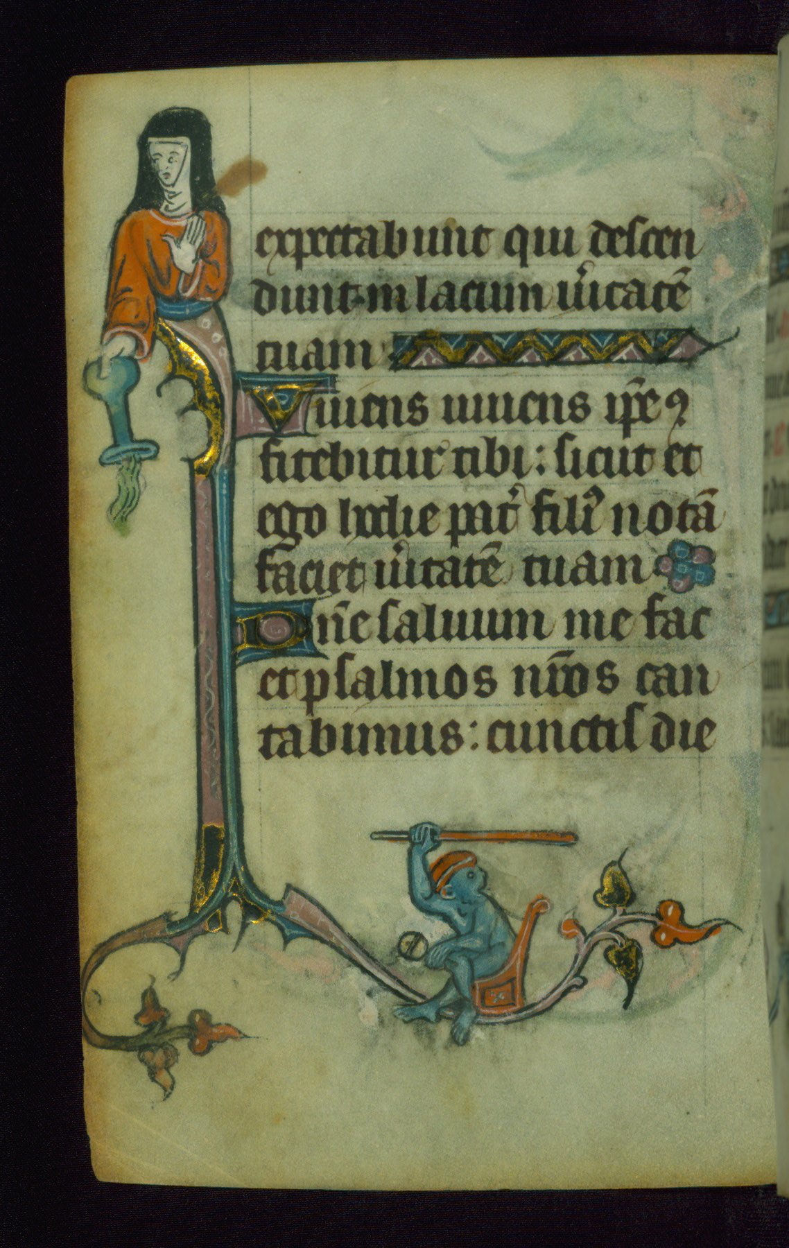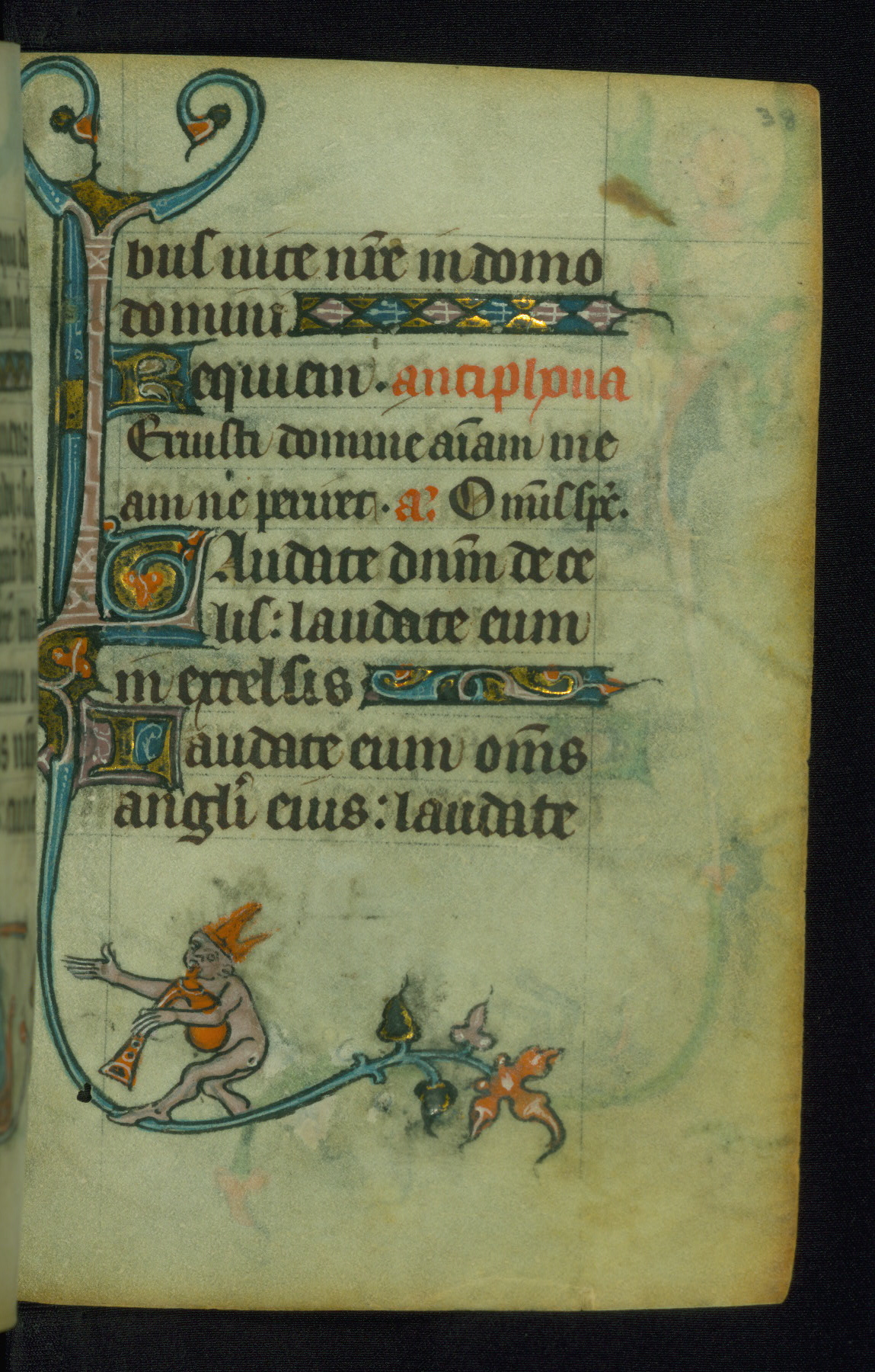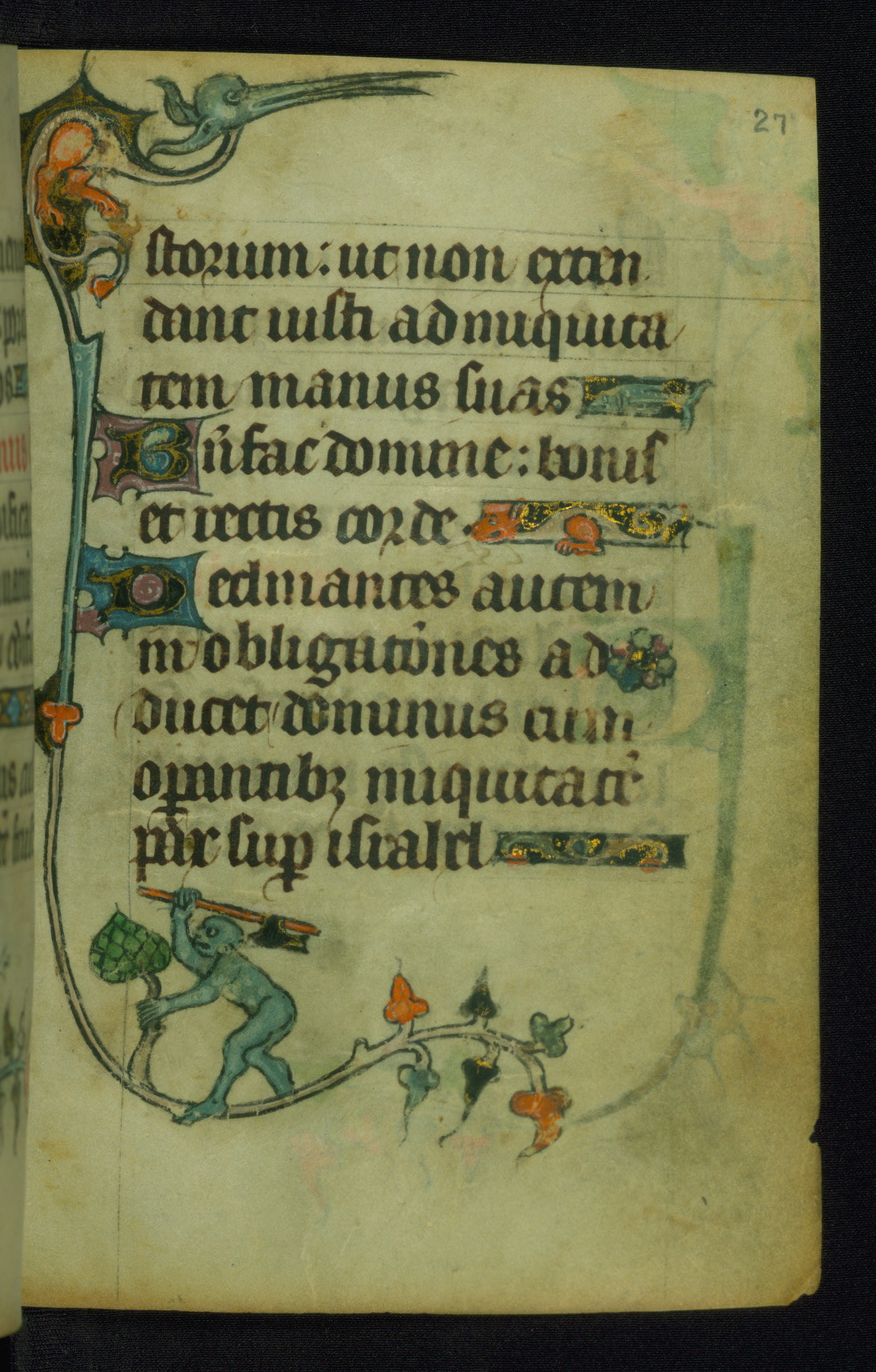 This Book of Hours was made ca. 1310-20, likely in Ghent. It was badly rebound with a sixteenth-century Flemish binding by Léon Gruel in Paris at the end of the nineteenth or early twentieth century, and the initials of Gruel and Engelmann are printed on the bookplate on the front pastedown. The manuscript lacks its calendar, and the text is incomplete and misbound. In the fourteenth century a prayer for Communion, written in French, was added at the end of the book. Initials in gold, blue and pink mark the divisions of the text. The manuscript is richly illuminated with drolleries; painted on the borders of each folio, they would have amused the reader with their playful animals, hybrids, and human figures.