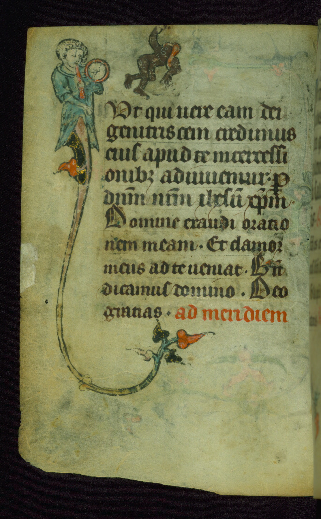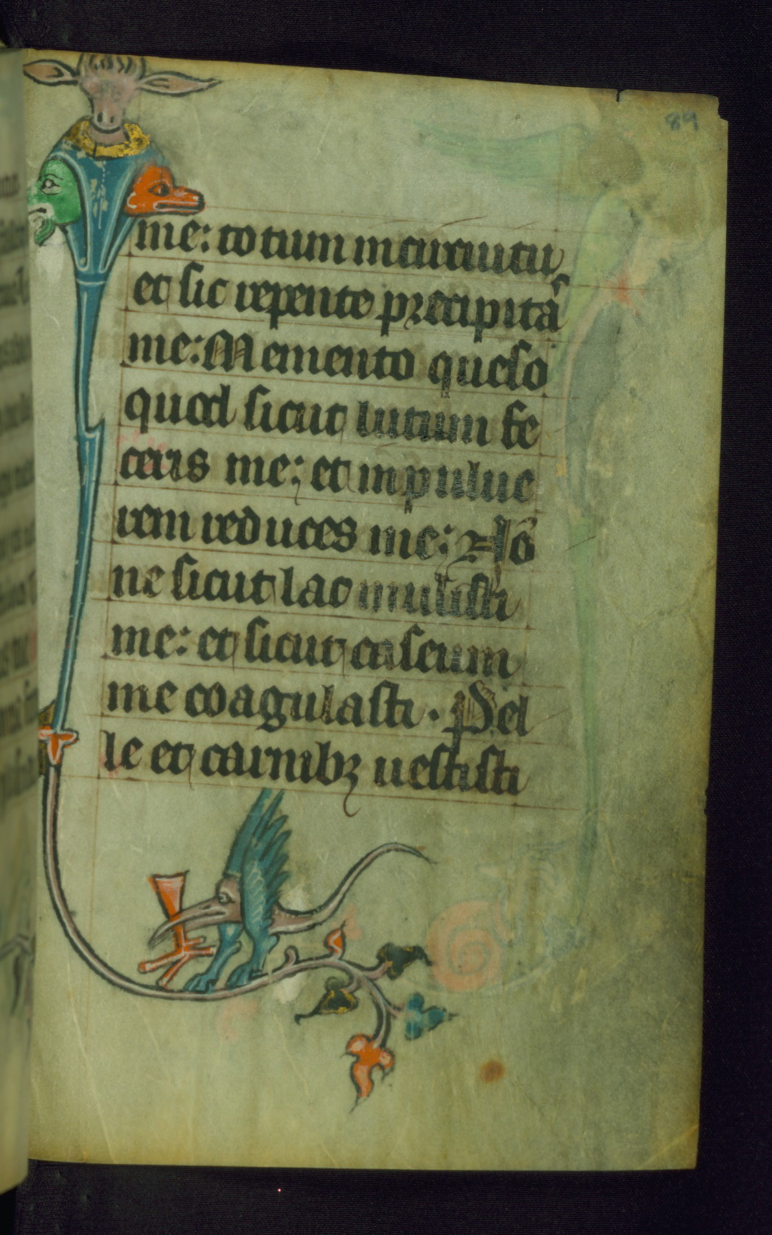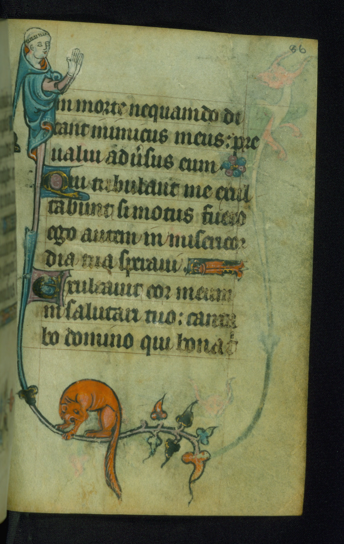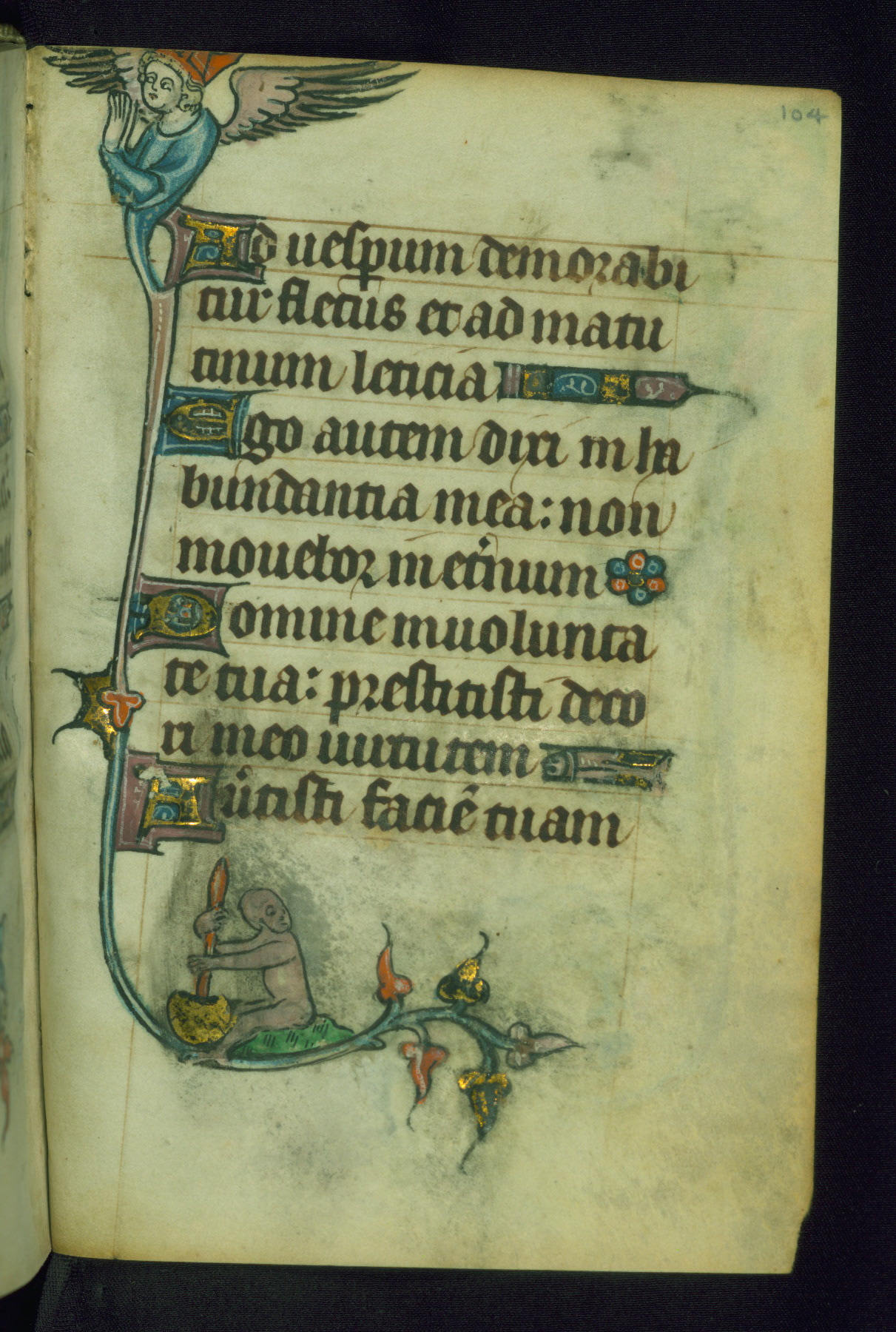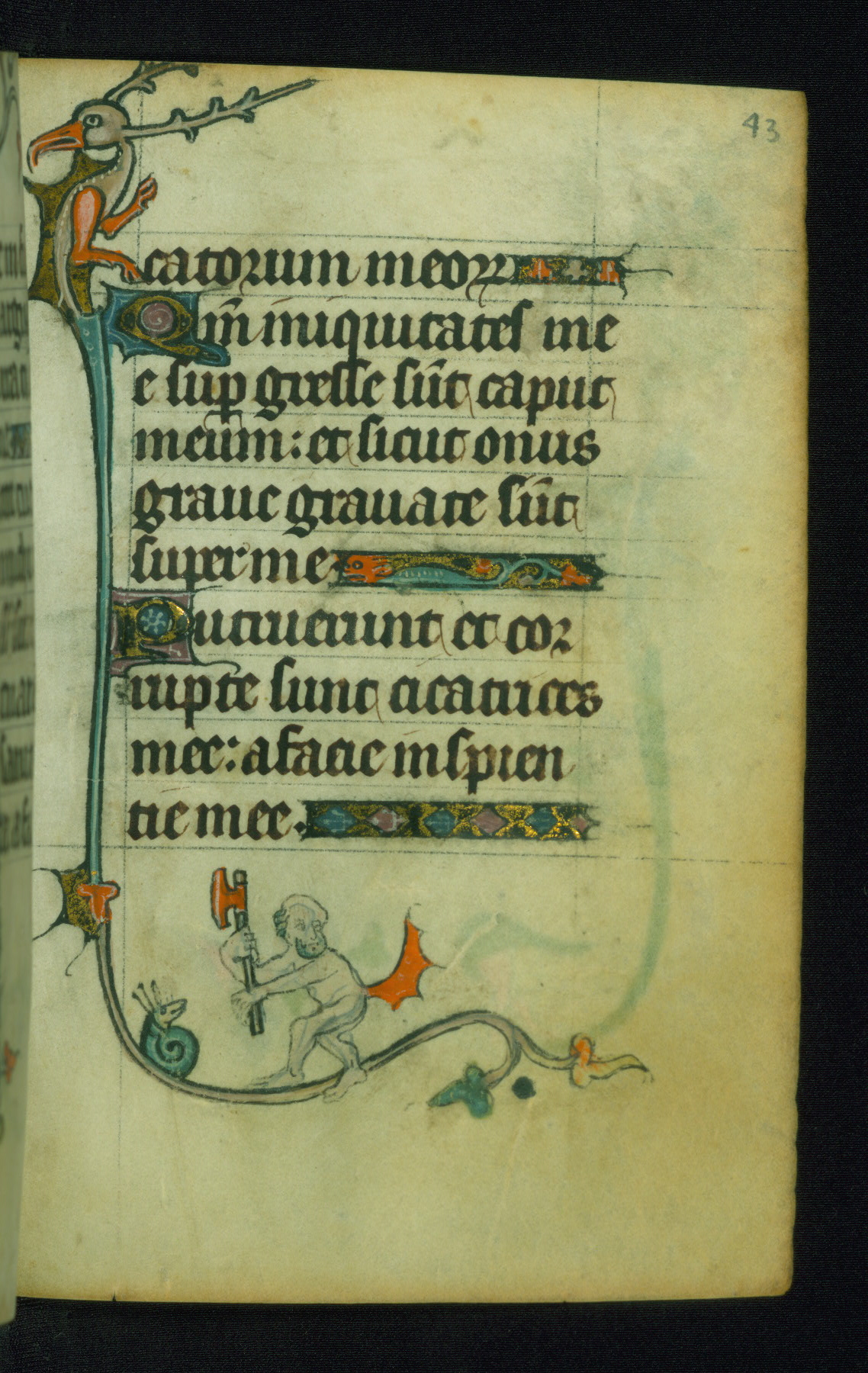 This Book of Hours was made ca. 1310-20, likely in Ghent. It was badly rebound with a sixteenth-century Flemish binding by Léon Gruel in Paris at the end of the nineteenth or early twentieth century, and the initials of Gruel and Engelmann are printed on the bookplate on the front pastedown. The manuscript lacks its calendar, and the text is incomplete and misbound. In the fourteenth century a prayer for Communion, written in French, was added at the end of the book. Initials in gold, blue and pink mark the divisions of the text. The manuscript is richly illuminated with drolleries; painted on the borders of each folio, they would have amused the reader with their playful animals, hybrids, and human figures.