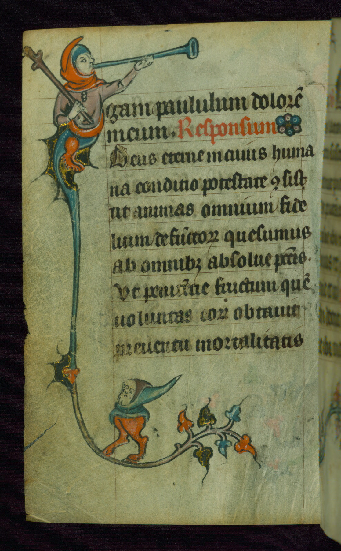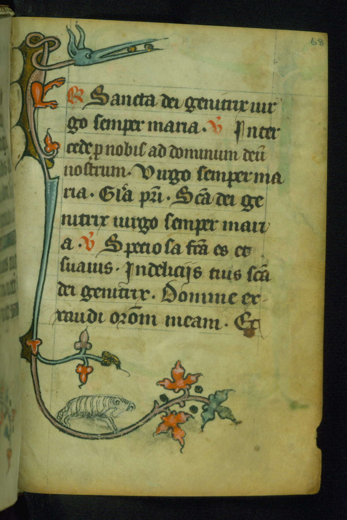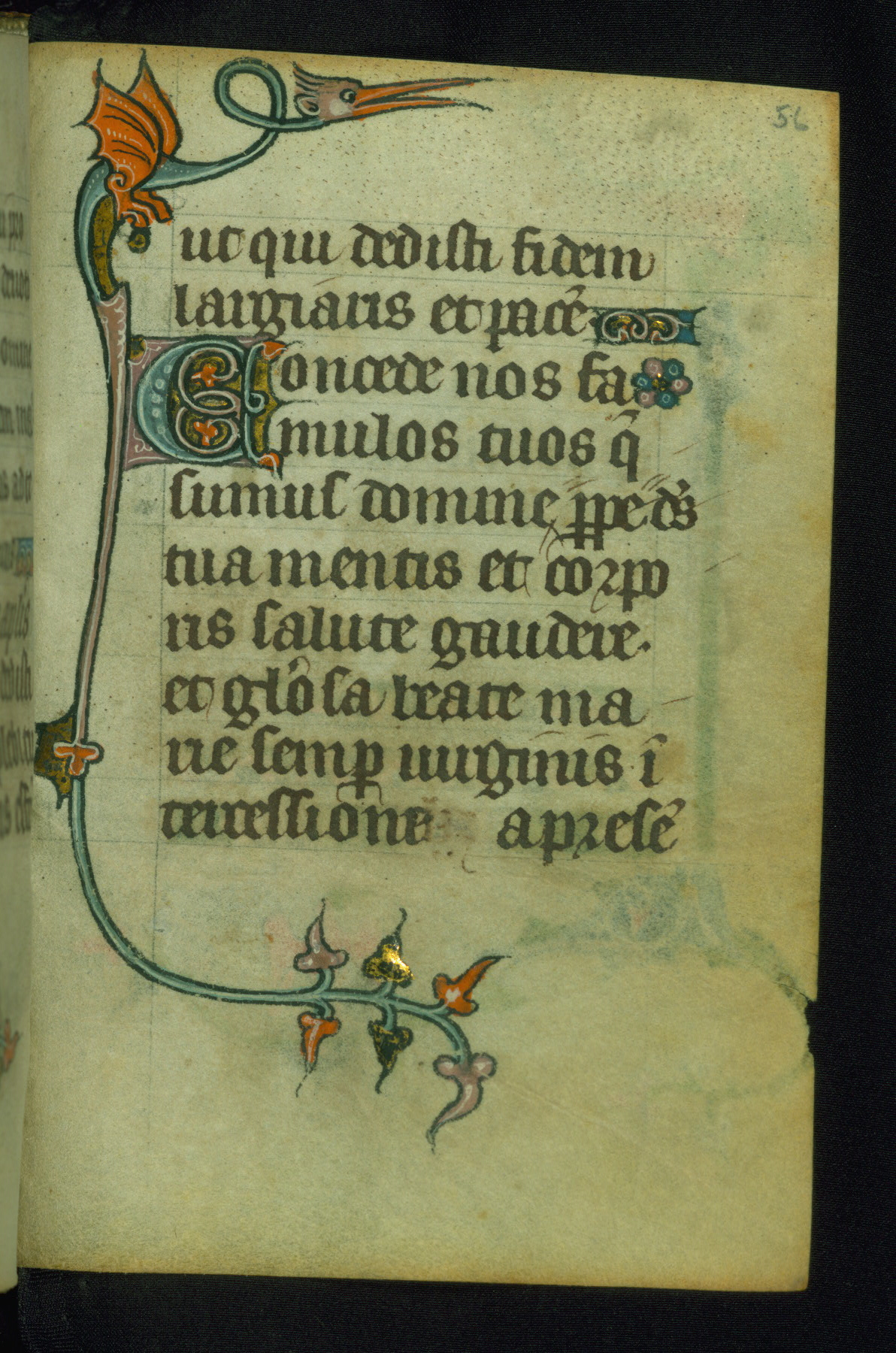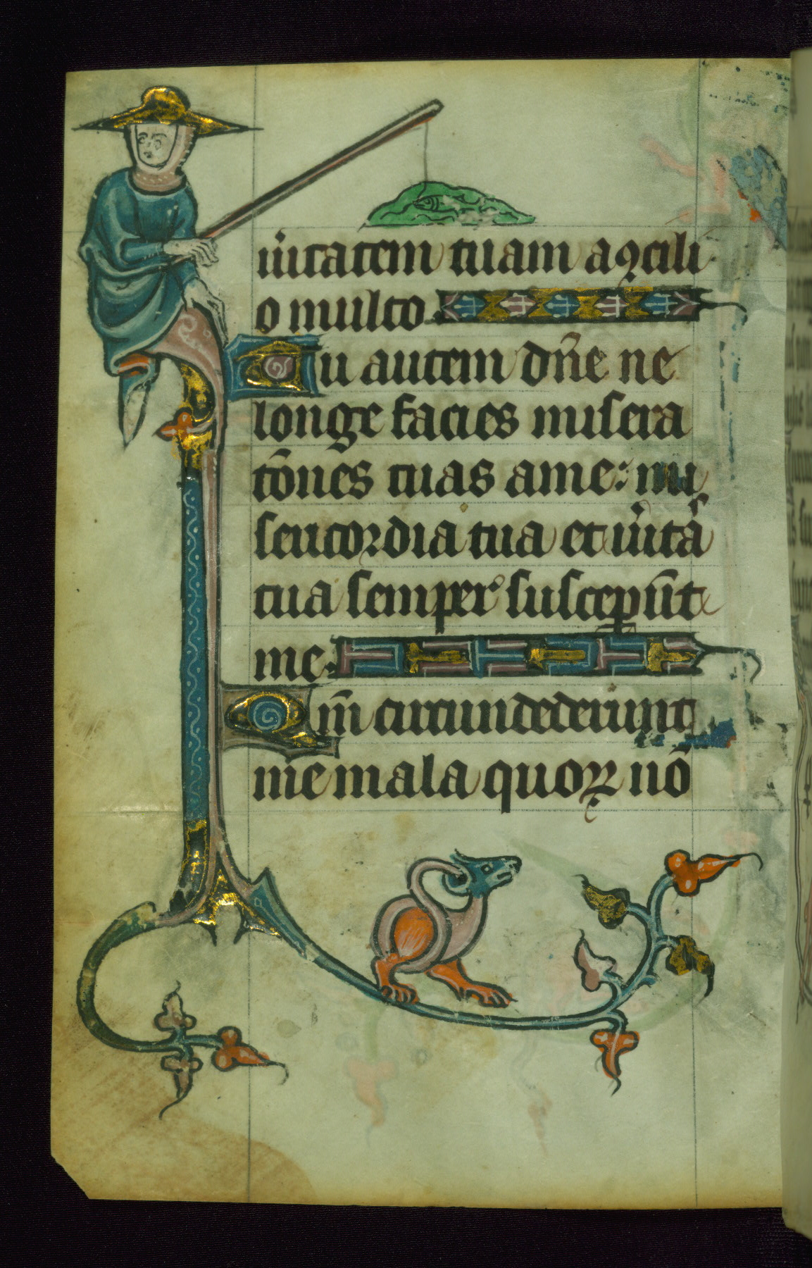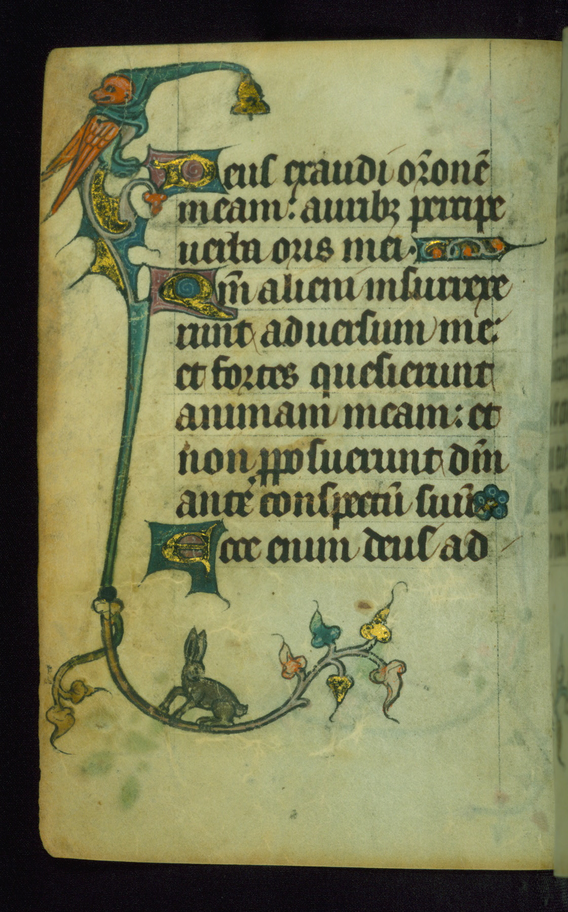 This Book of Hours was made ca. 1310-20, likely in Ghent. It was badly rebound with a sixteenth-century Flemish binding by Léon Gruel in Paris at the end of the nineteenth or early twentieth century, and the initials of Gruel and Engelmann are printed on the bookplate on the front pastedown. The manuscript lacks its calendar, and the text is incomplete and misbound. In the fourteenth century a prayer for Communion, written in French, was added at the end of the book. Initials in gold, blue and pink mark the divisions of the text. The manuscript is richly illuminated with drolleries; painted on the borders of each folio, they would have amused the reader with their playful animals, hybrids, and human figures.