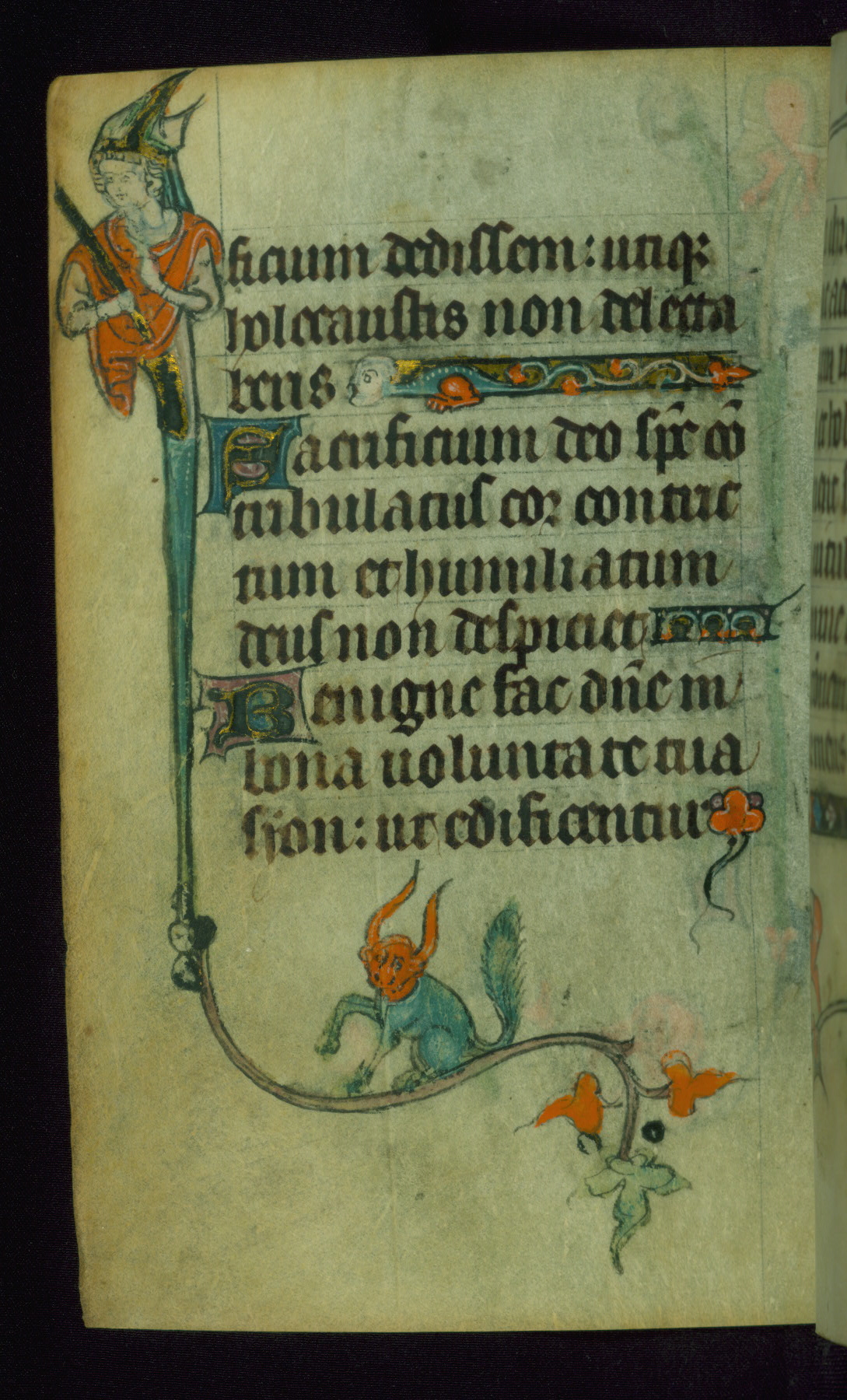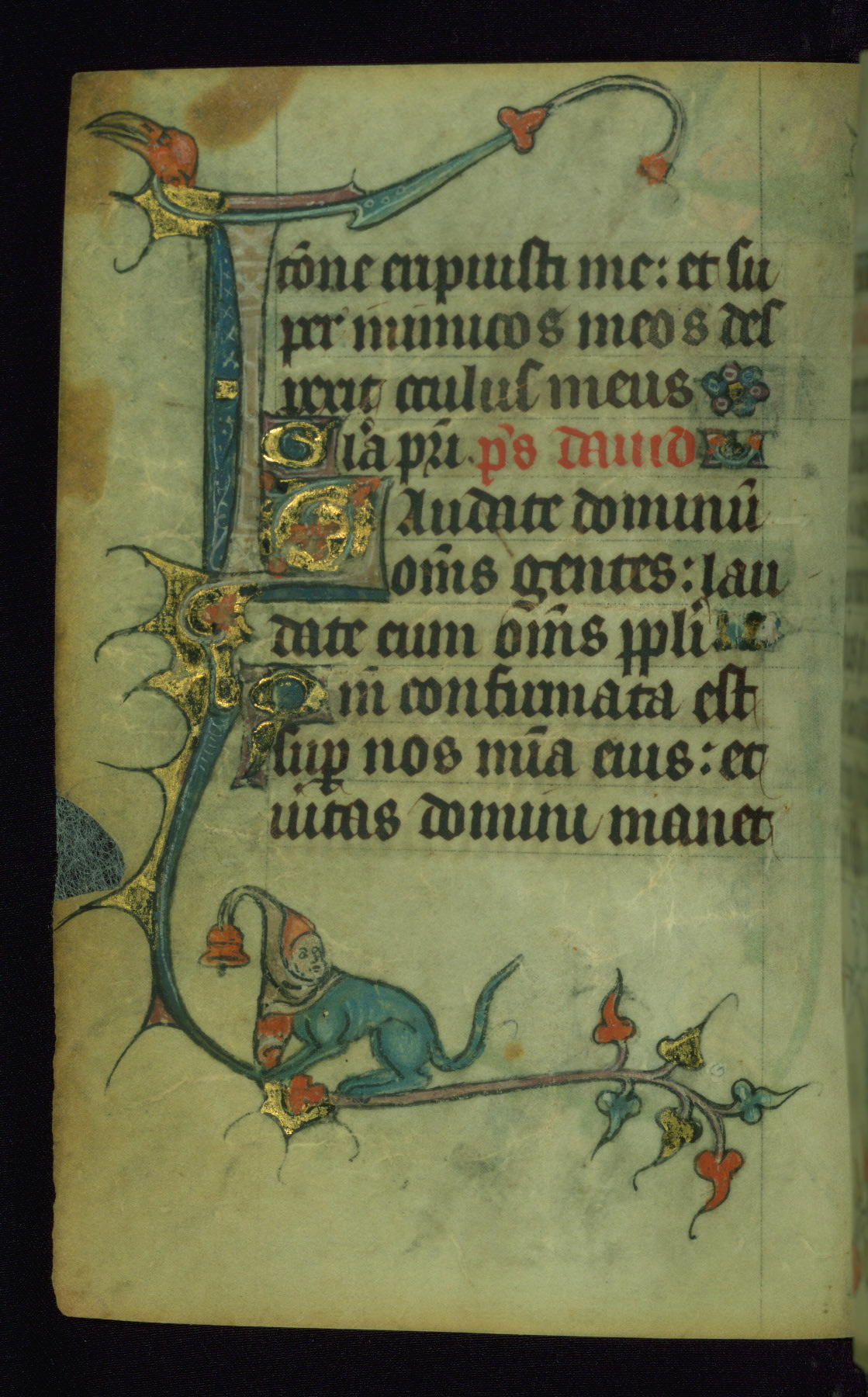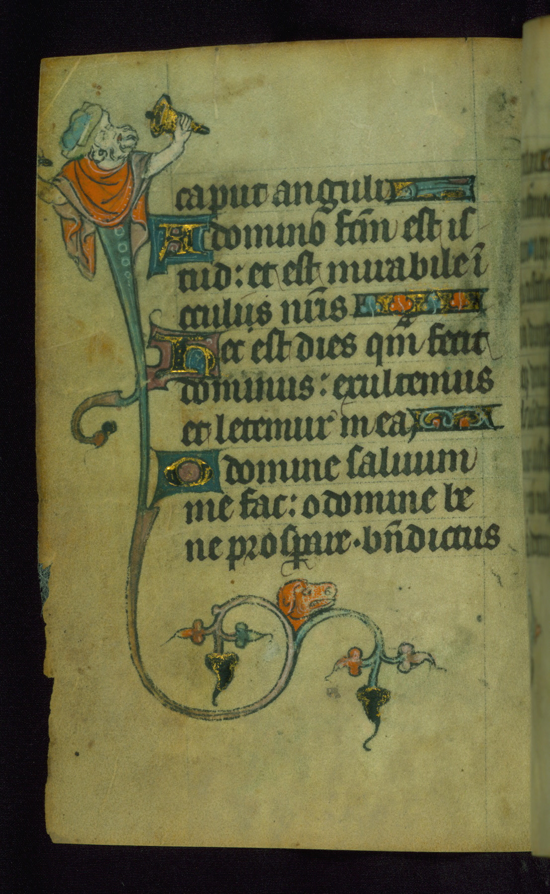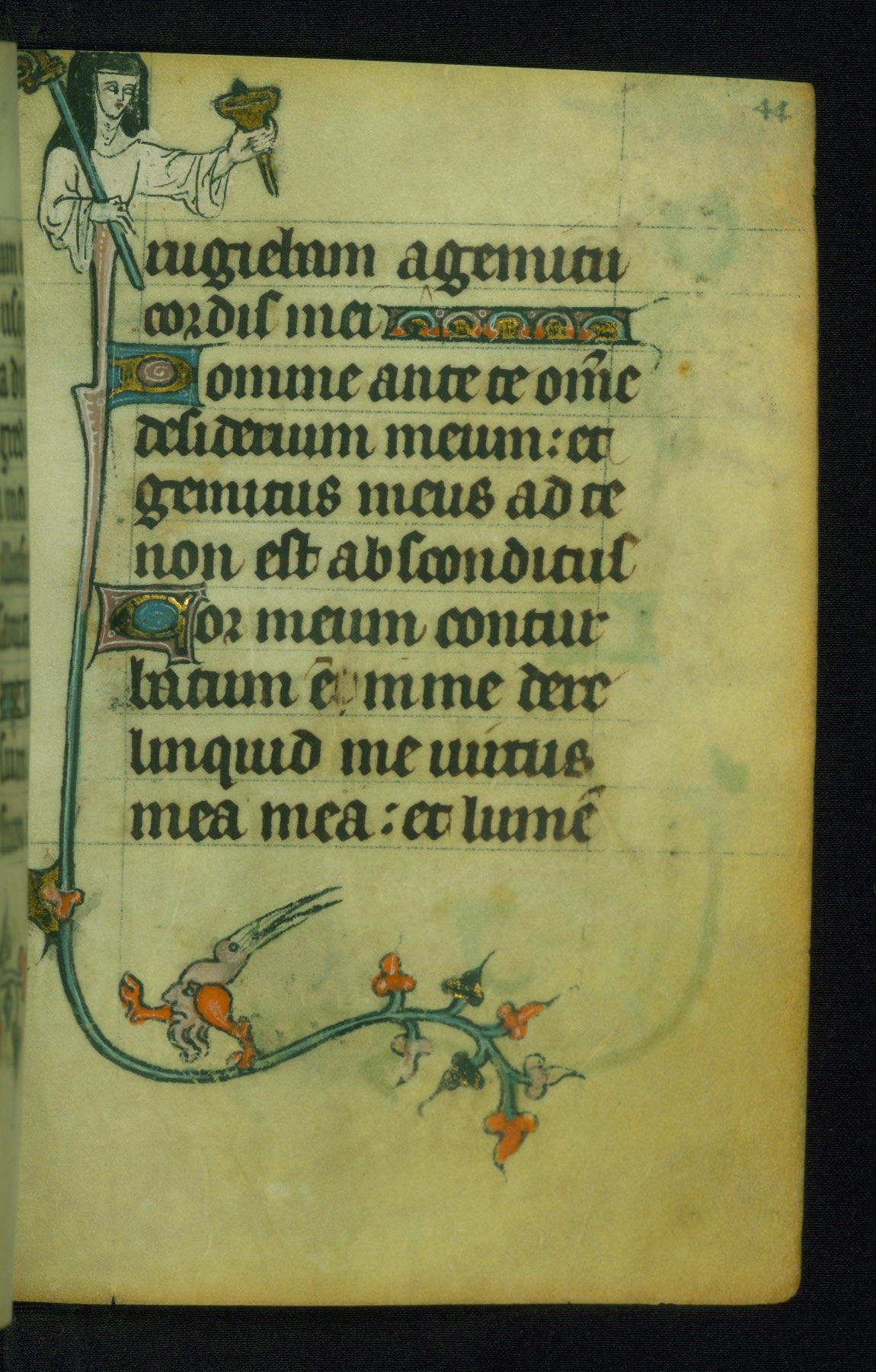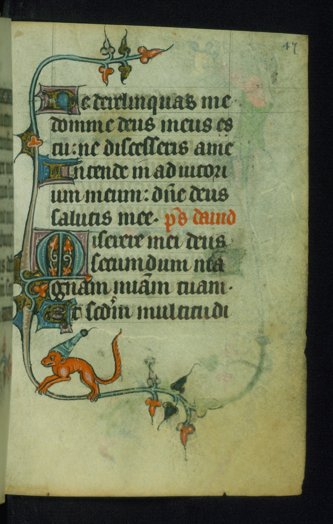 This Book of Hours was made ca. 1310-20, likely in Ghent. It was badly rebound with a sixteenth-century Flemish binding by Léon Gruel in Paris at the end of the nineteenth or early twentieth century, and the initials of Gruel and Engelmann are printed on the bookplate on the front pastedown. The manuscript lacks its calendar, and the text is incomplete and misbound. In the fourteenth century a prayer for Communion, written in French, was added at the end of the book. Initials in gold, blue and pink mark the divisions of the text. The manuscript is richly illuminated with drolleries; painted on the borders of each folio, they would have amused the reader with their playful animals, hybrids, and human figures.