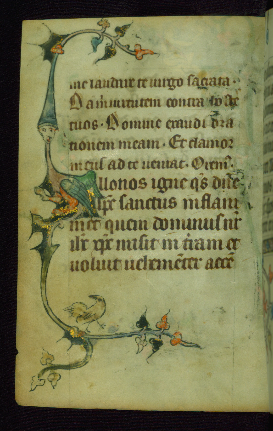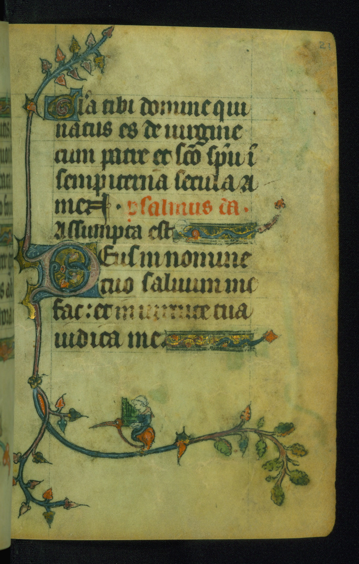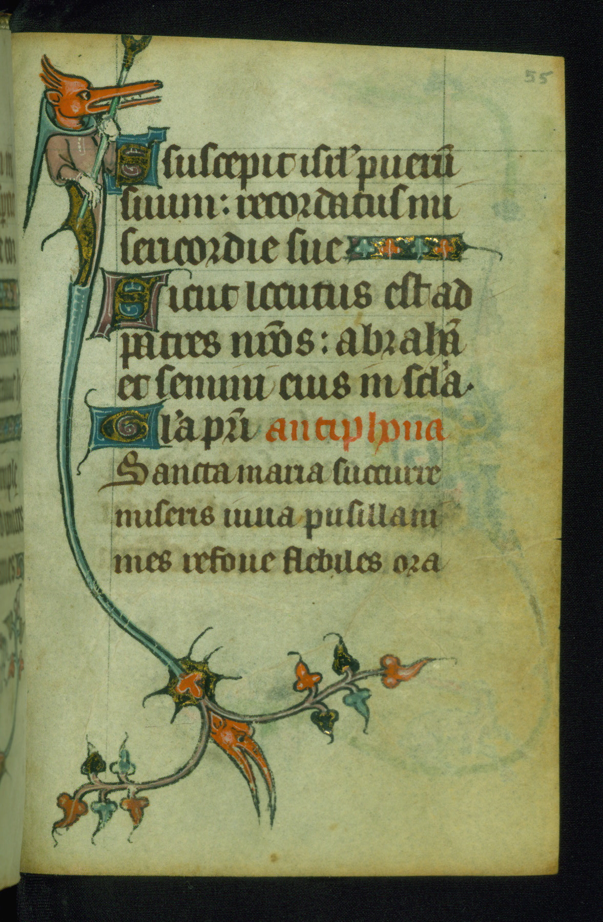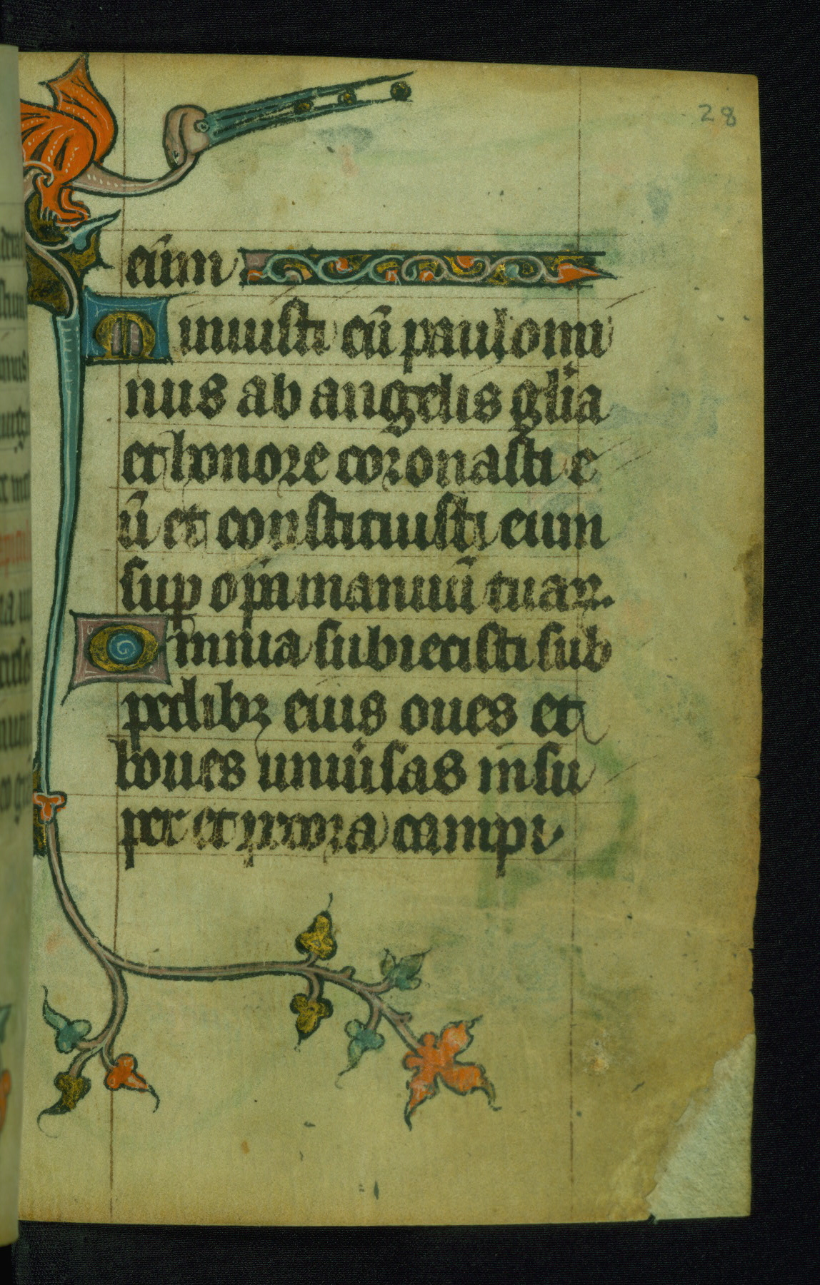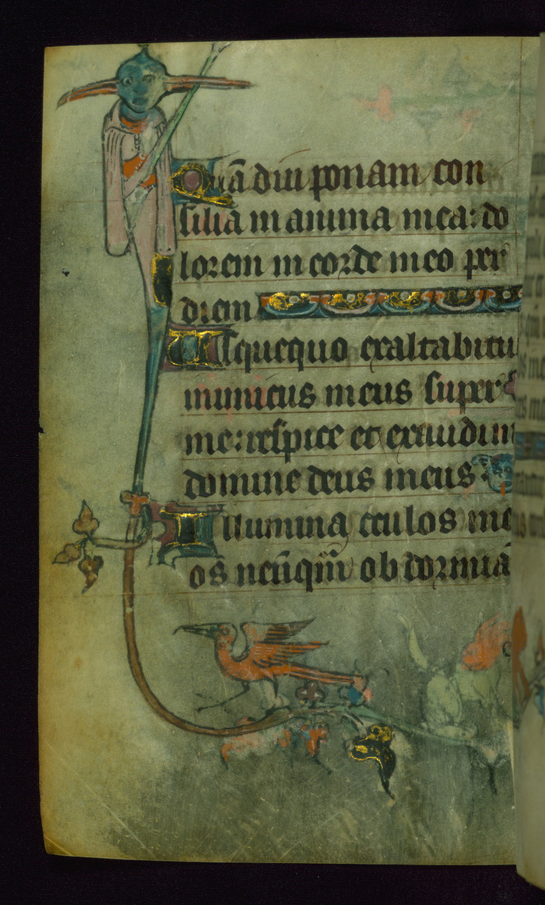 This Book of Hours was made ca. 1310-20, likely in Ghent. It was badly rebound with a sixteenth-century Flemish binding by Léon Gruel in Paris at the end of the nineteenth or early twentieth century, and the initials of Gruel and Engelmann are printed on the bookplate on the front pastedown. The manuscript lacks its calendar, and the text is incomplete and misbound. In the fourteenth century a prayer for Communion, written in French, was added at the end of the book. Initials in gold, blue and pink mark the divisions of the text. The manuscript is richly illuminated with drolleries; painted on the borders of each folio, they would have amused the reader with their playful animals, hybrids, and human figures.