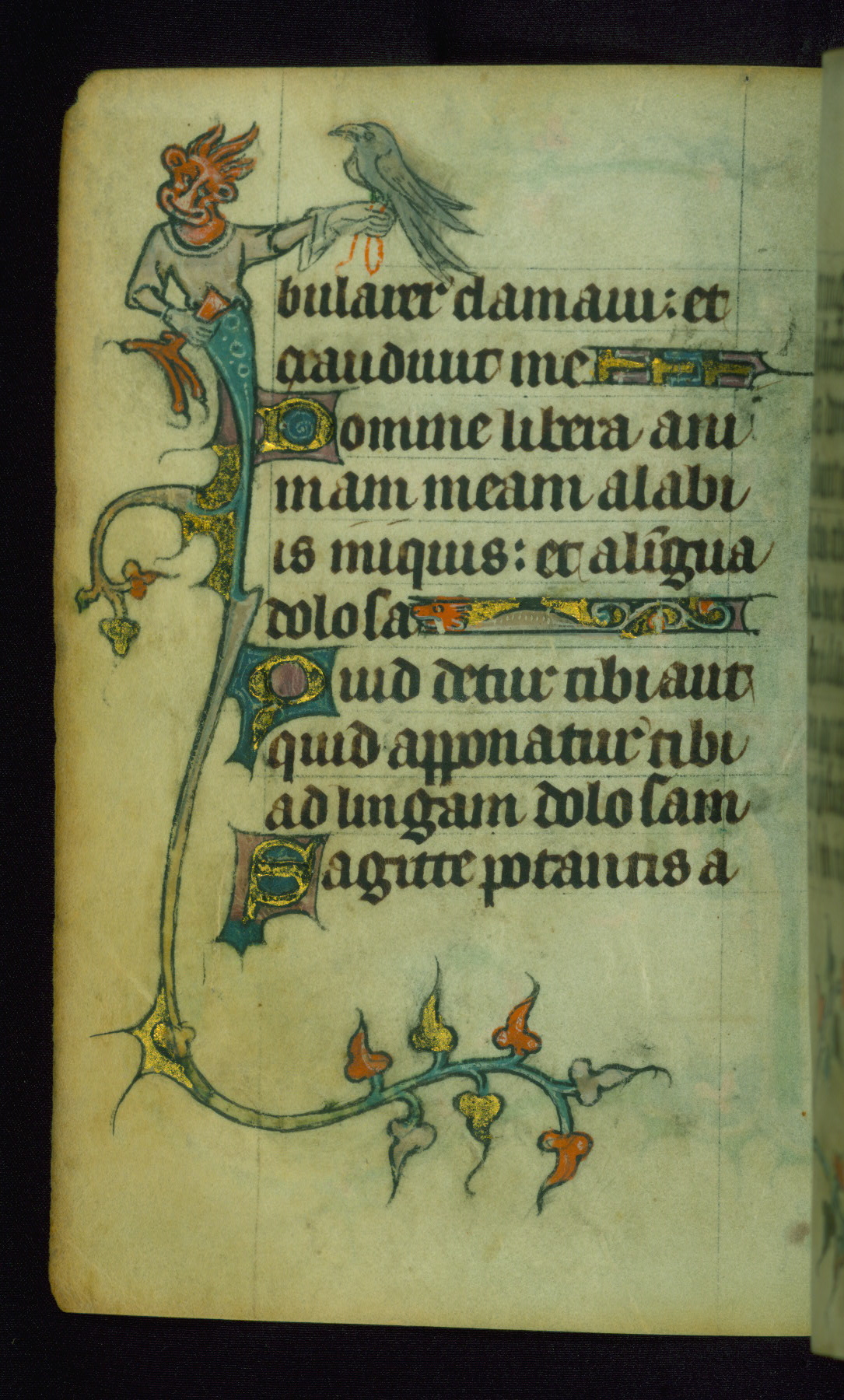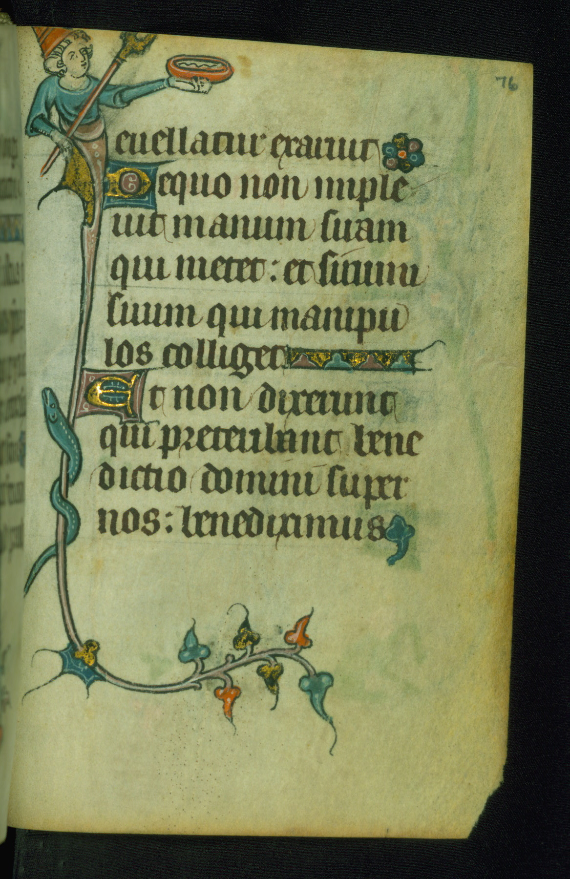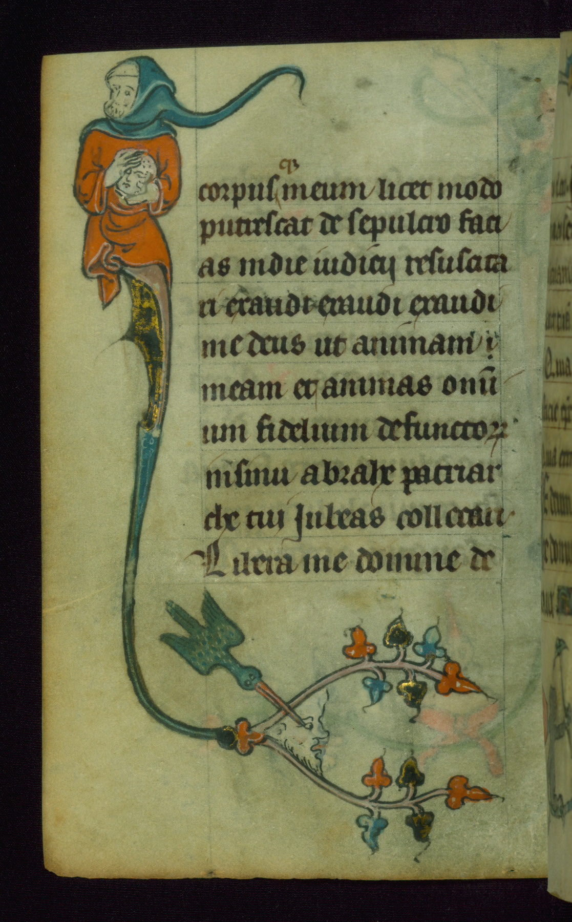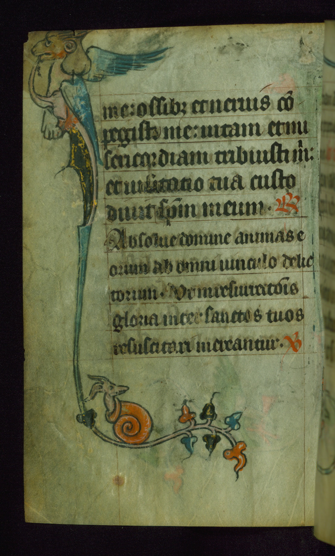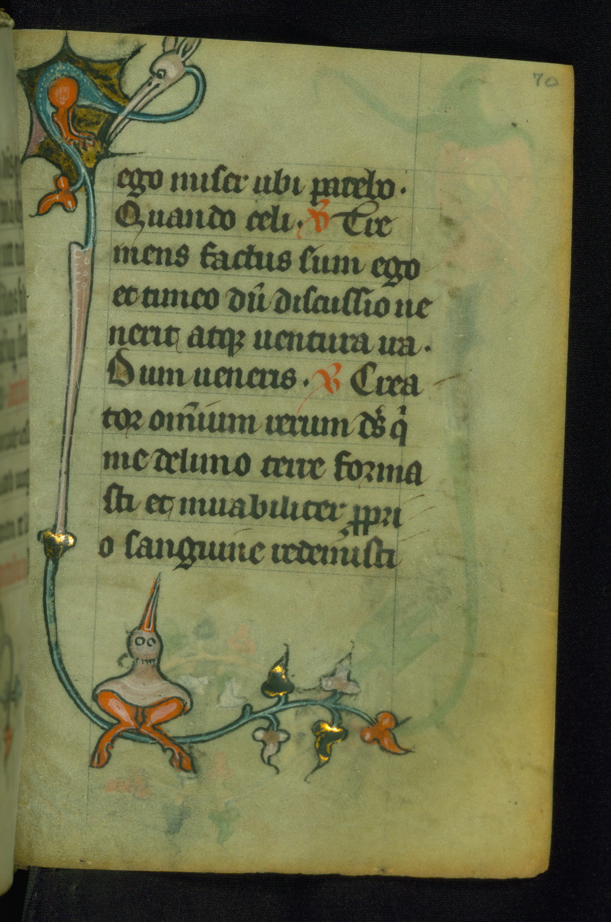 This Book of Hours was made ca. 1310-20, likely in Ghent. It was badly rebound with a sixteenth-century Flemish binding by Léon Gruel in Paris at the end of the nineteenth or early twentieth century, and the initials of Gruel and Engelmann are printed on the bookplate on the front pastedown. The manuscript lacks its calendar, and the text is incomplete and misbound. In the fourteenth century a prayer for Communion, written in French, was added at the end of the book. Initials in gold, blue and pink mark the divisions of the text. The manuscript is richly illuminated with drolleries; painted on the borders of each folio, they would have amused the reader with their playful animals, hybrids, and human figures.