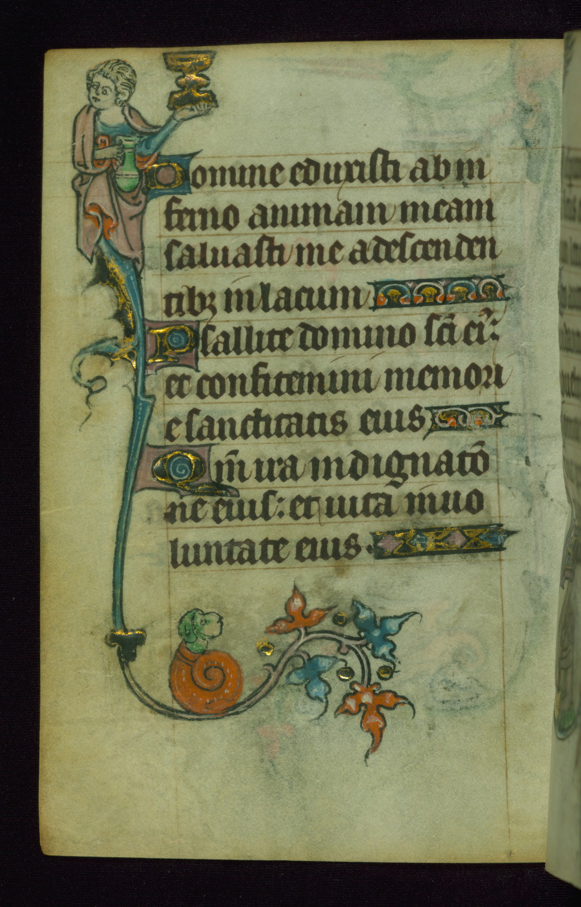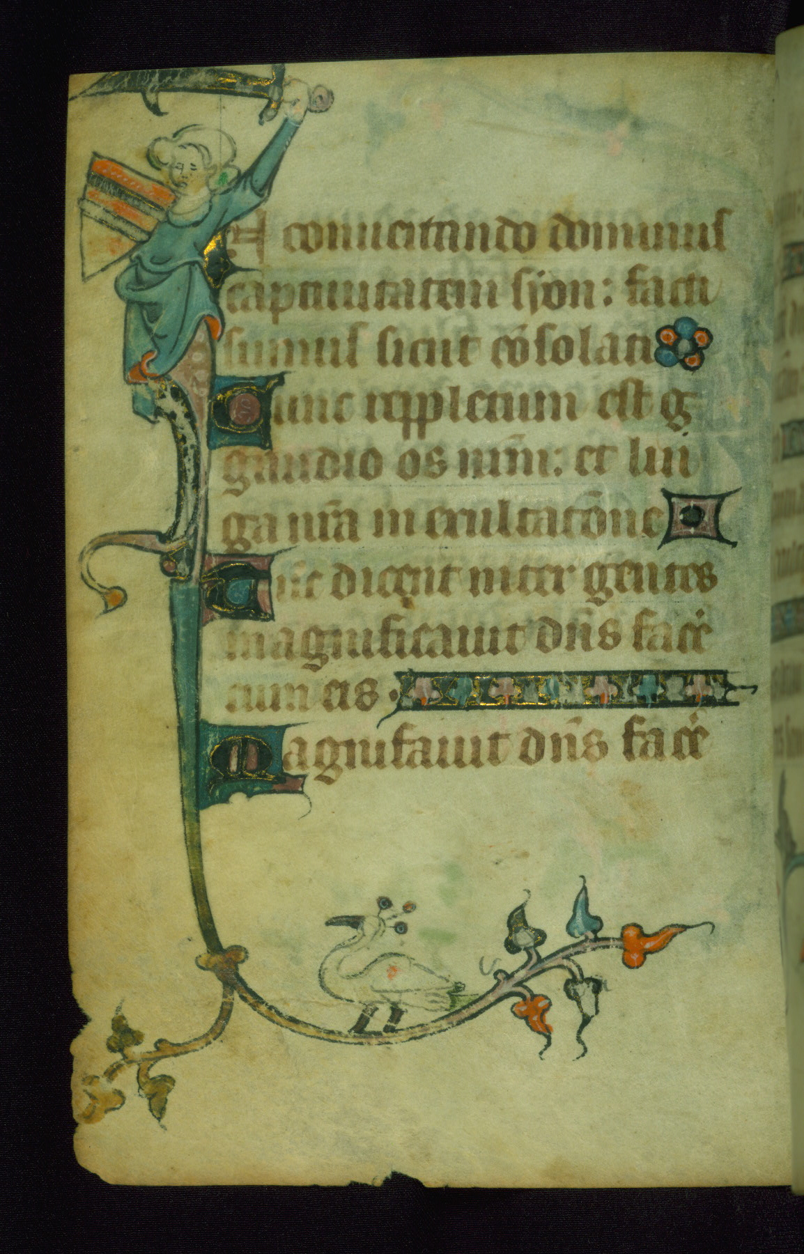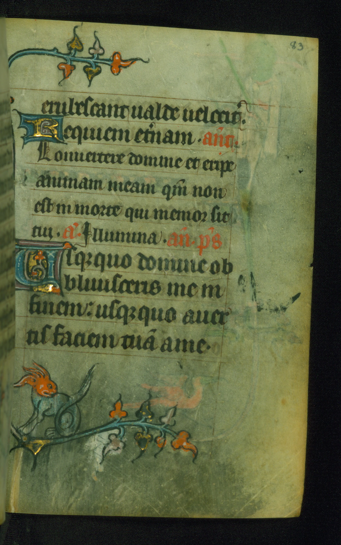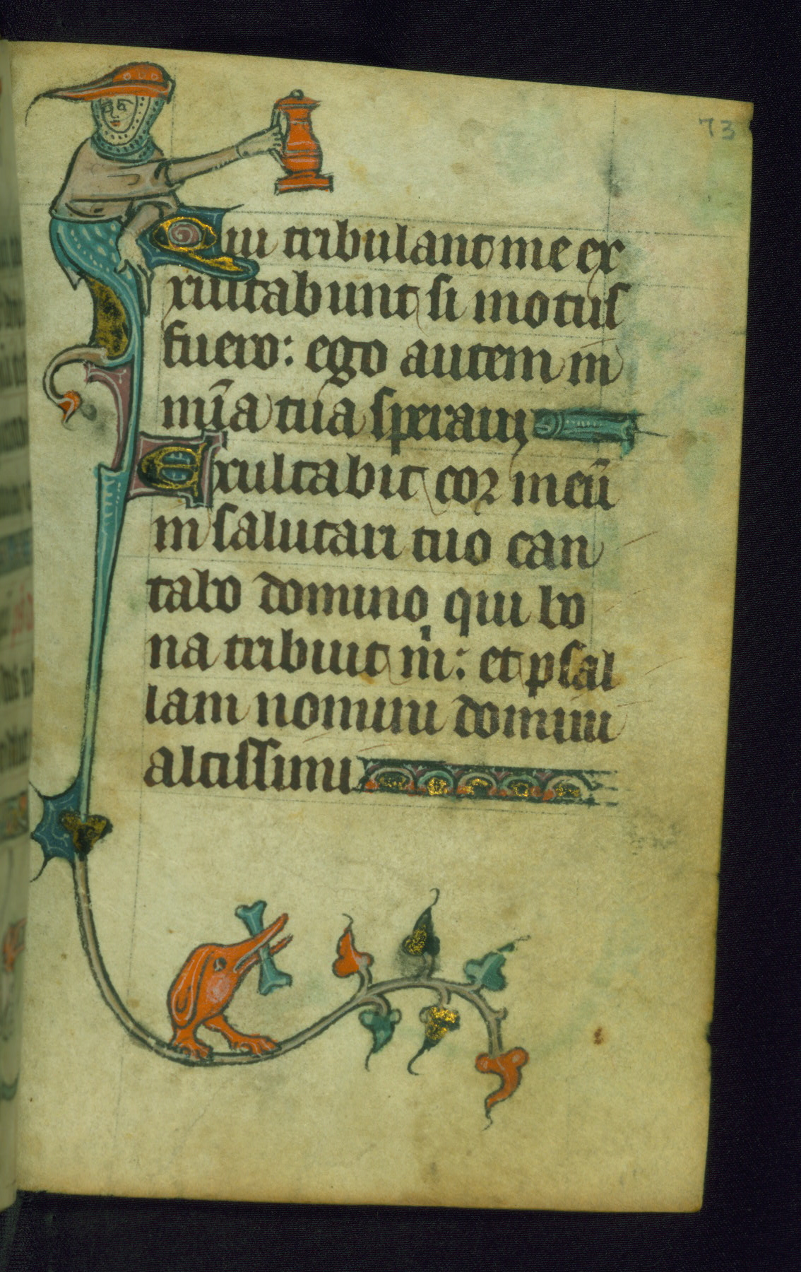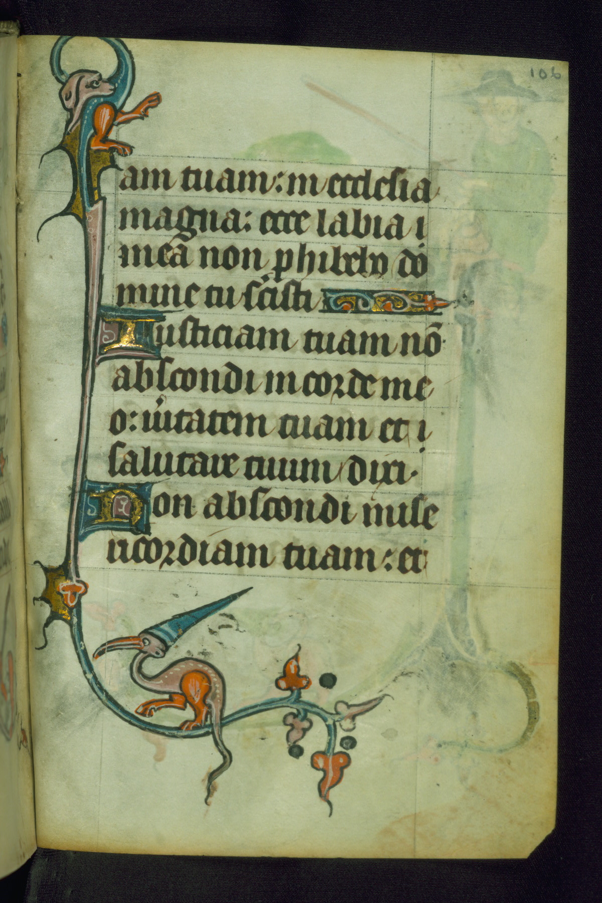 This Book of Hours was made ca. 1310-20, likely in Ghent. It was badly rebound with a sixteenth-century Flemish binding by Léon Gruel in Paris at the end of the nineteenth or early twentieth century, and the initials of Gruel and Engelmann are printed on the bookplate on the front pastedown. The manuscript lacks its calendar, and the text is incomplete and misbound. In the fourteenth century a prayer for Communion, written in French, was added at the end of the book. Initials in gold, blue and pink mark the divisions of the text. The manuscript is richly illuminated with drolleries; painted on the borders of each folio, they would have amused the reader with their playful animals, hybrids, and human figures.