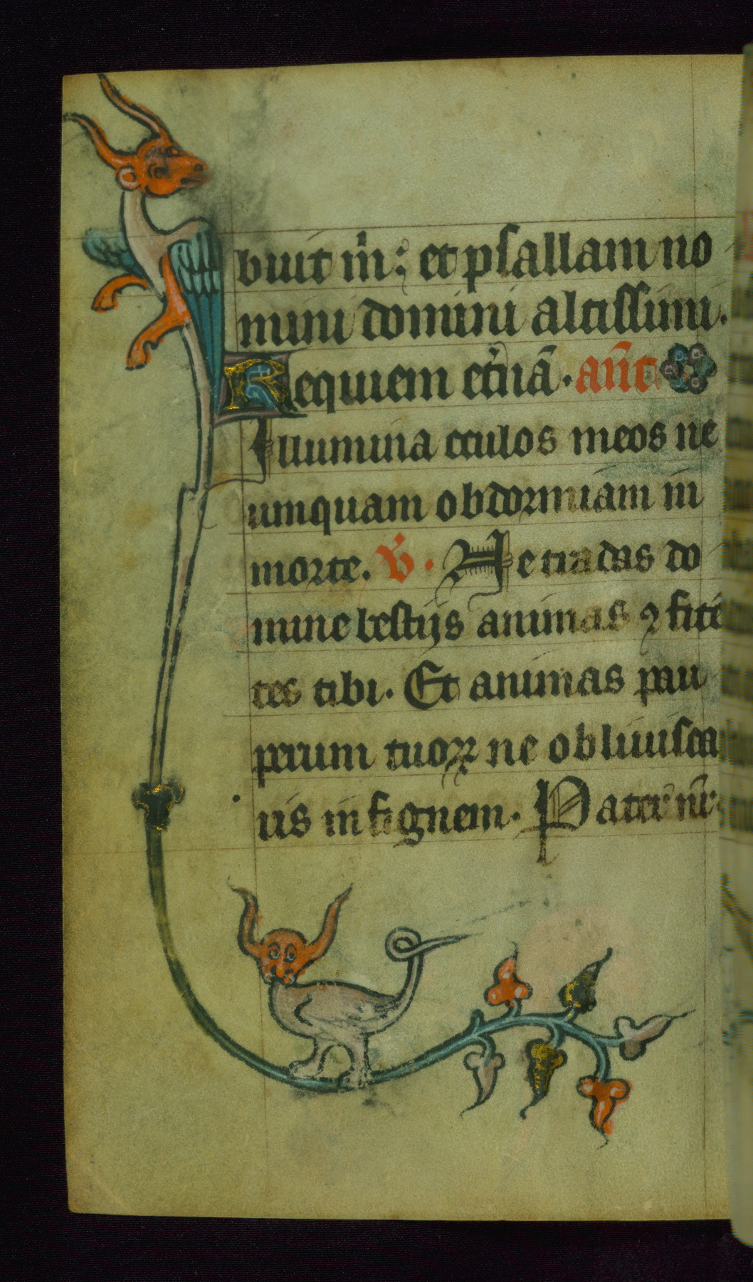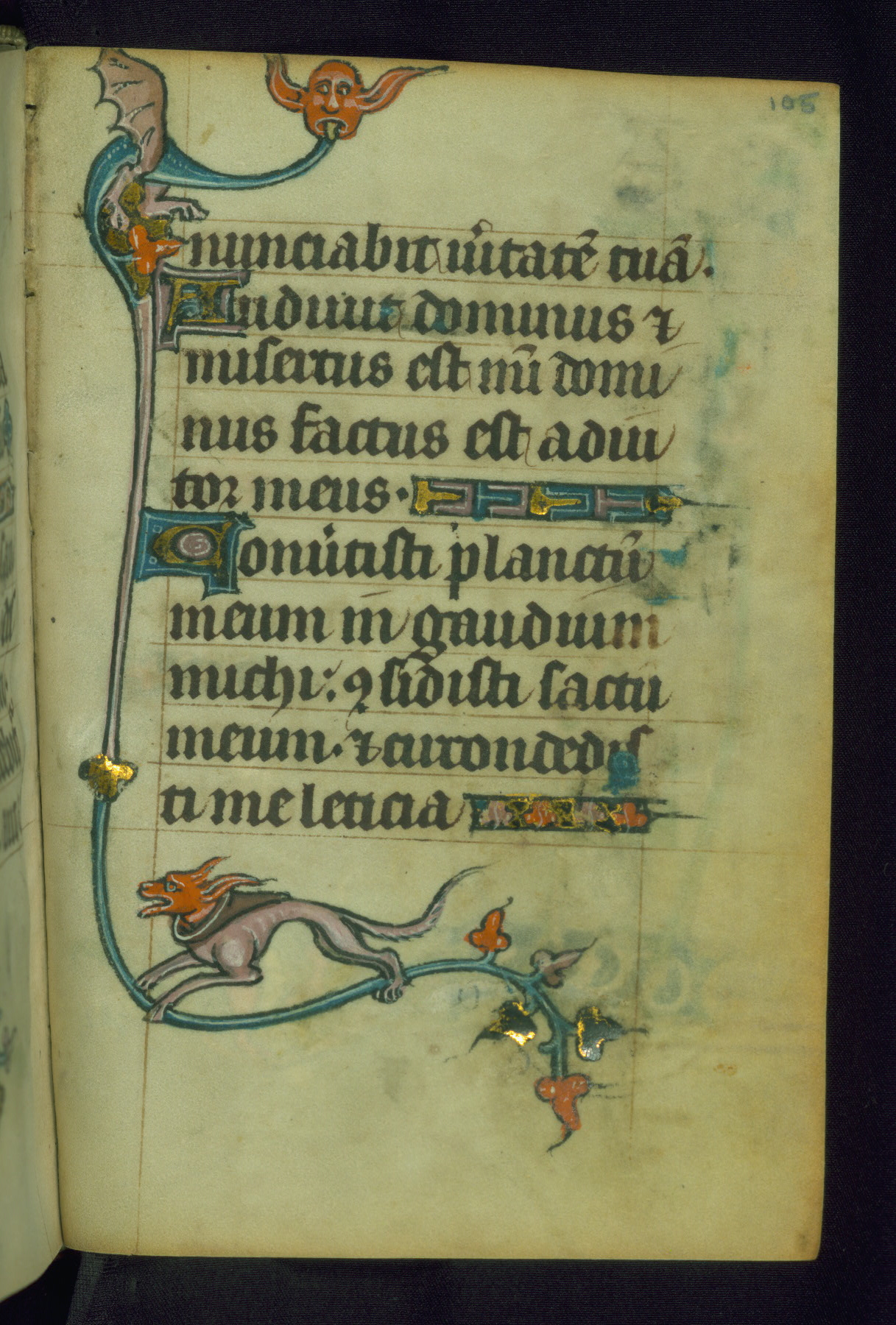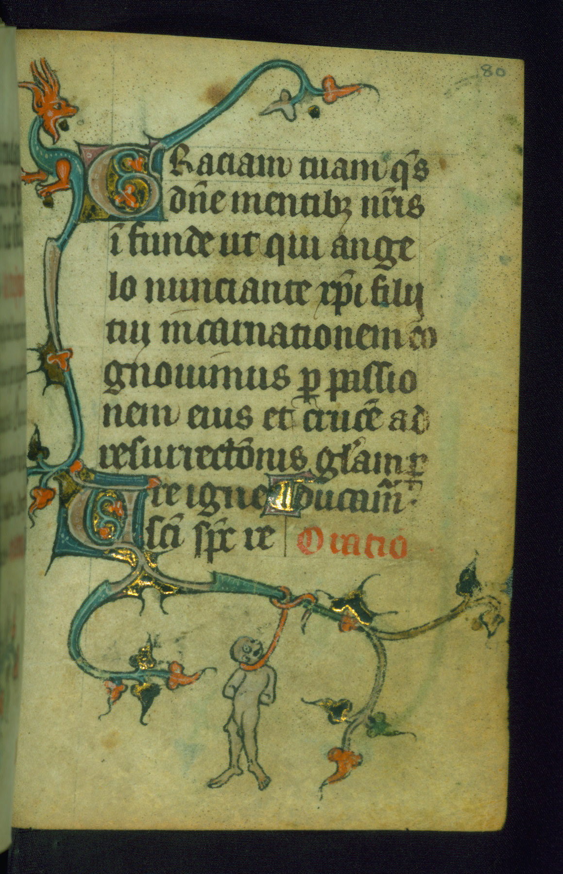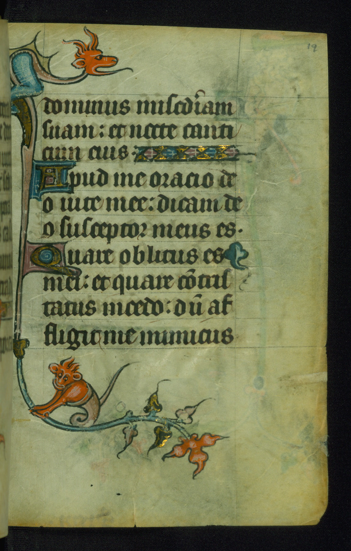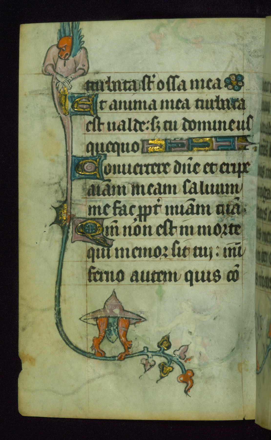 This Book of Hours was made ca. 1310-20, likely in Ghent. It was badly rebound with a sixteenth-century Flemish binding by Léon Gruel in Paris at the end of the nineteenth or early twentieth century, and the initials of Gruel and Engelmann are printed on the bookplate on the front pastedown. The manuscript lacks its calendar, and the text is incomplete and misbound. In the fourteenth century a prayer for Communion, written in French, was added at the end of the book. Initials in gold, blue and pink mark the divisions of the text. The manuscript is richly illuminated with drolleries; painted on the borders of each folio, they would have amused the reader with their playful animals, hybrids, and human figures.