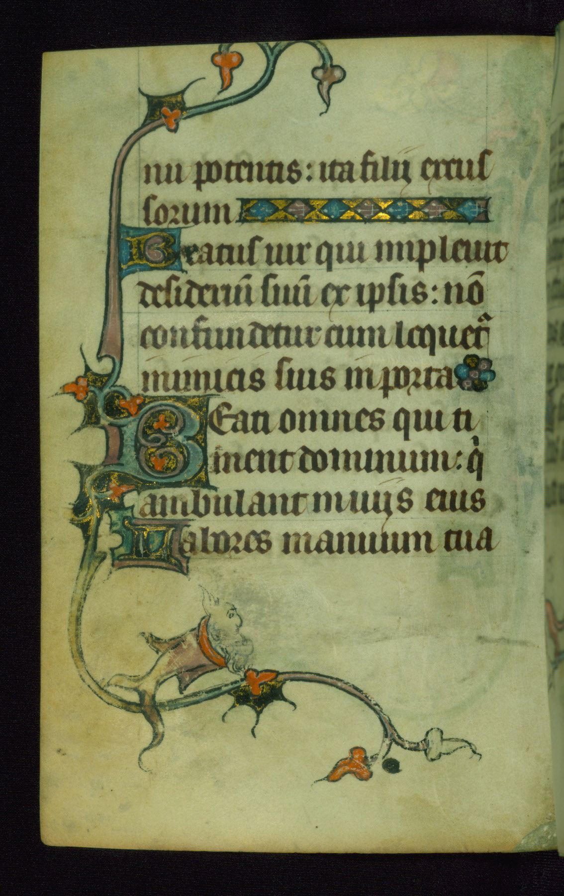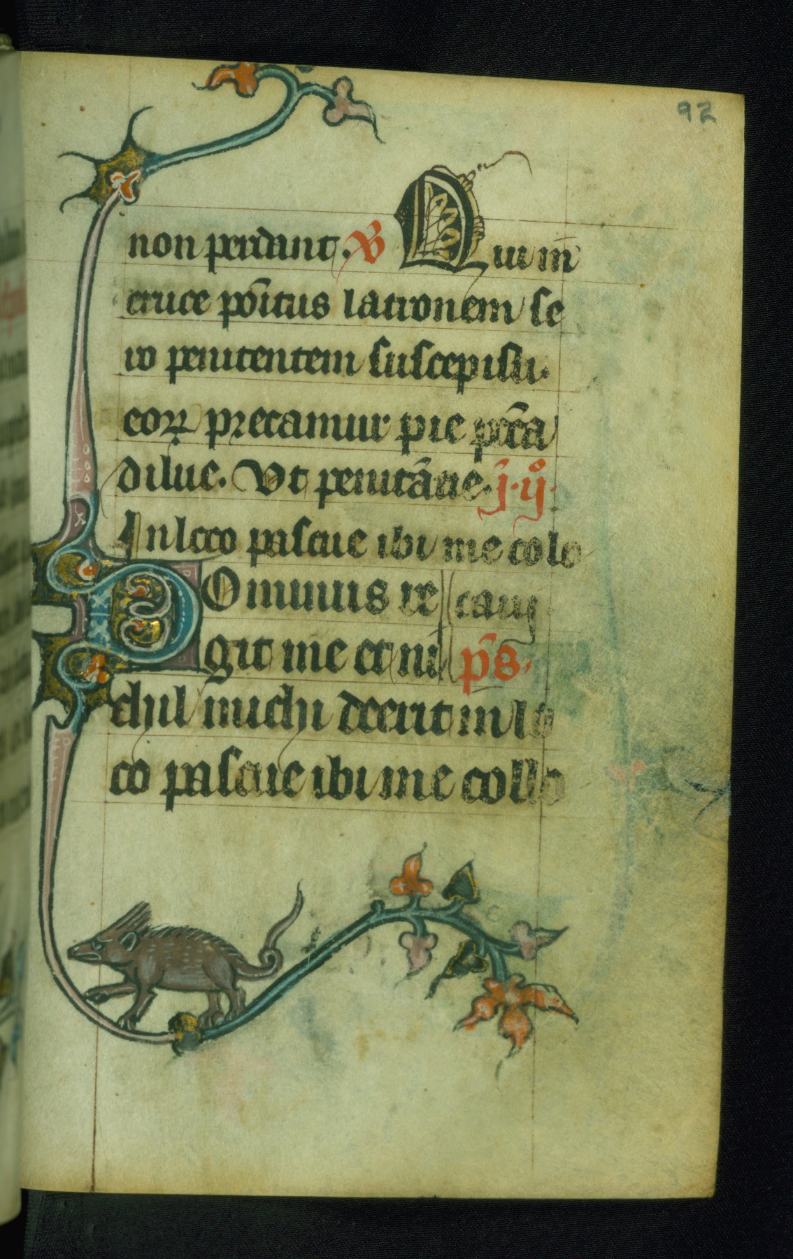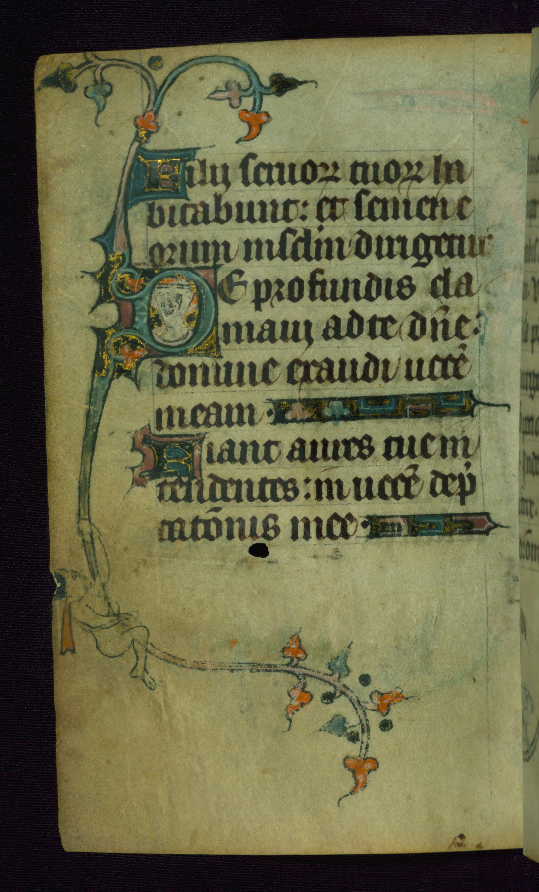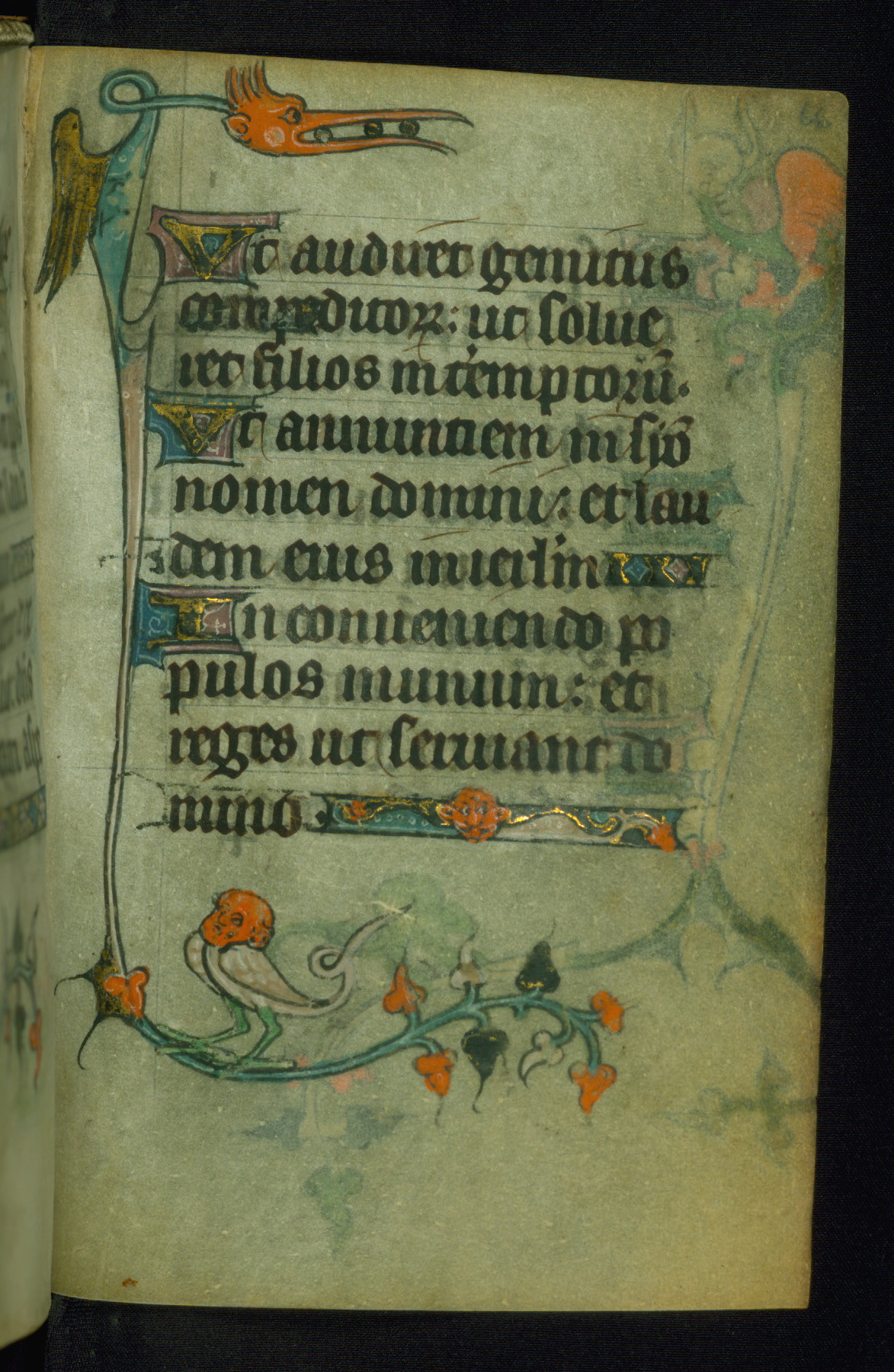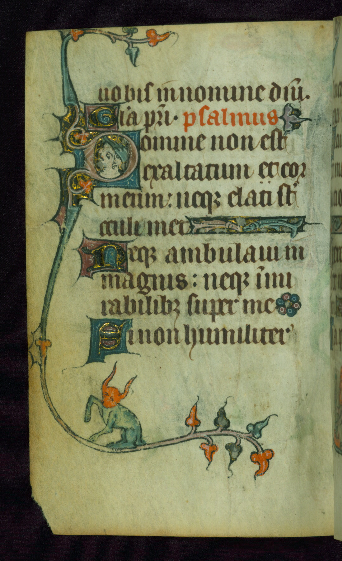 This Book of Hours was made ca. 1310-20, likely in Ghent. It was badly rebound with a sixteenth-century Flemish binding by Léon Gruel in Paris at the end of the nineteenth or early twentieth century, and the initials of Gruel and Engelmann are printed on the bookplate on the front pastedown. The manuscript lacks its calendar, and the text is incomplete and misbound. In the fourteenth century a prayer for Communion, written in French, was added at the end of the book. Initials in gold, blue and pink mark the divisions of the text. The manuscript is richly illuminated with drolleries; painted on the borders of each folio, they would have amused the reader with their playful animals, hybrids, and human figures.