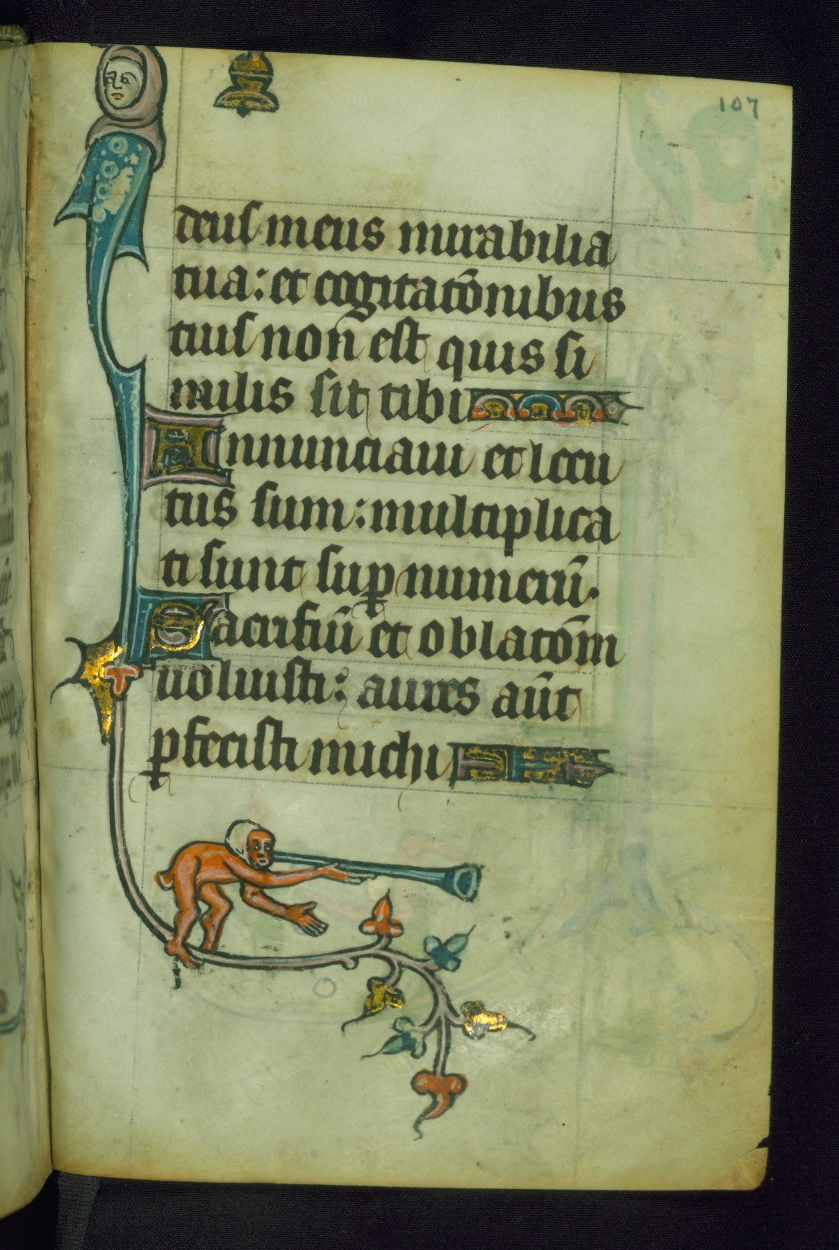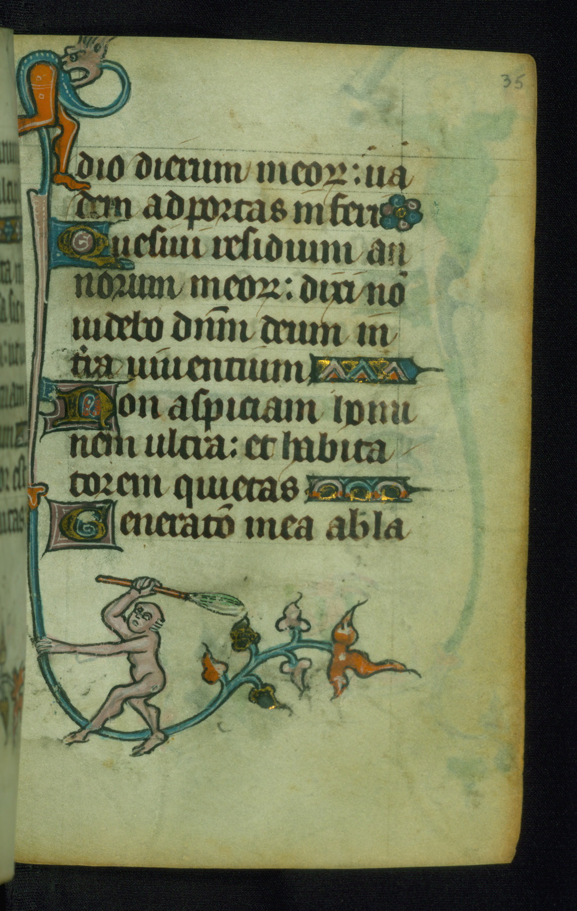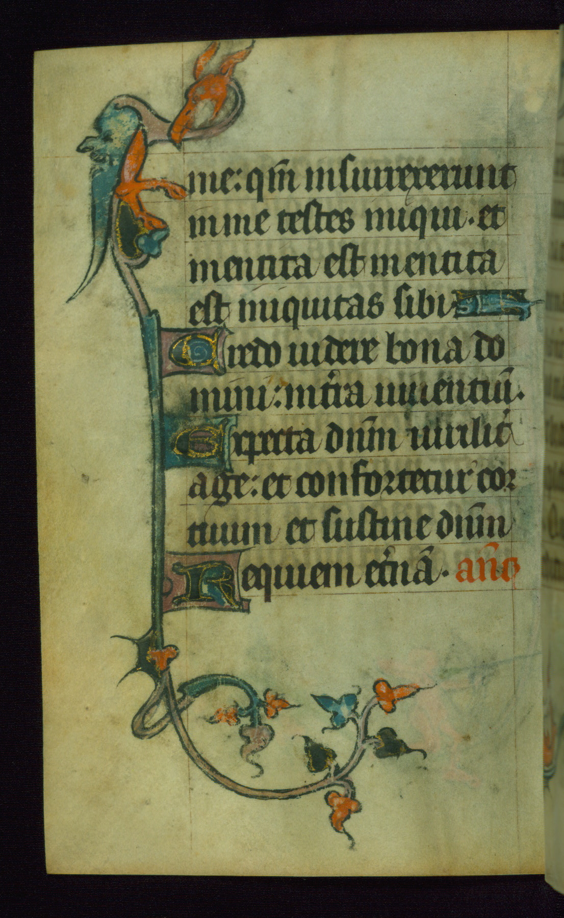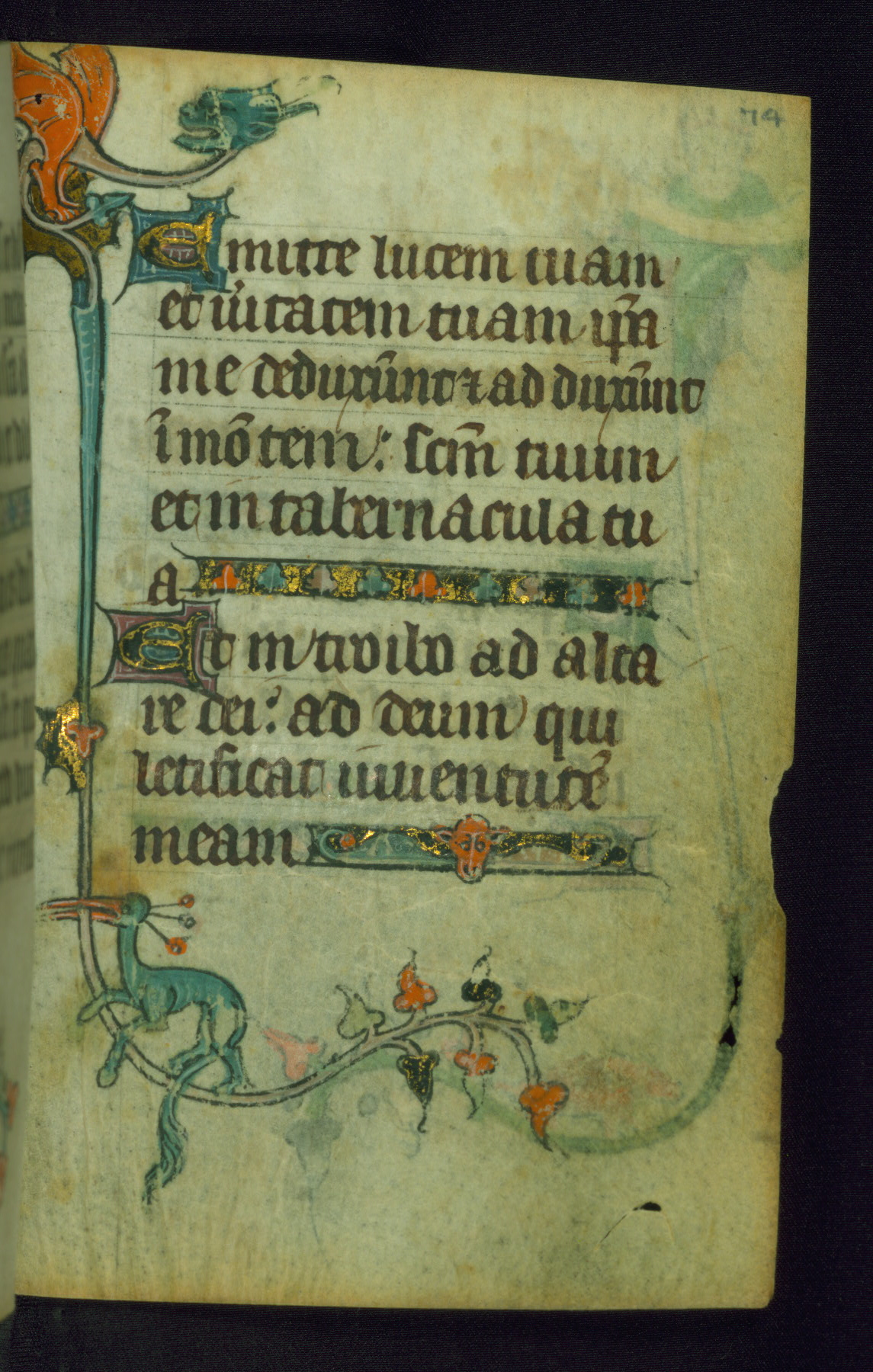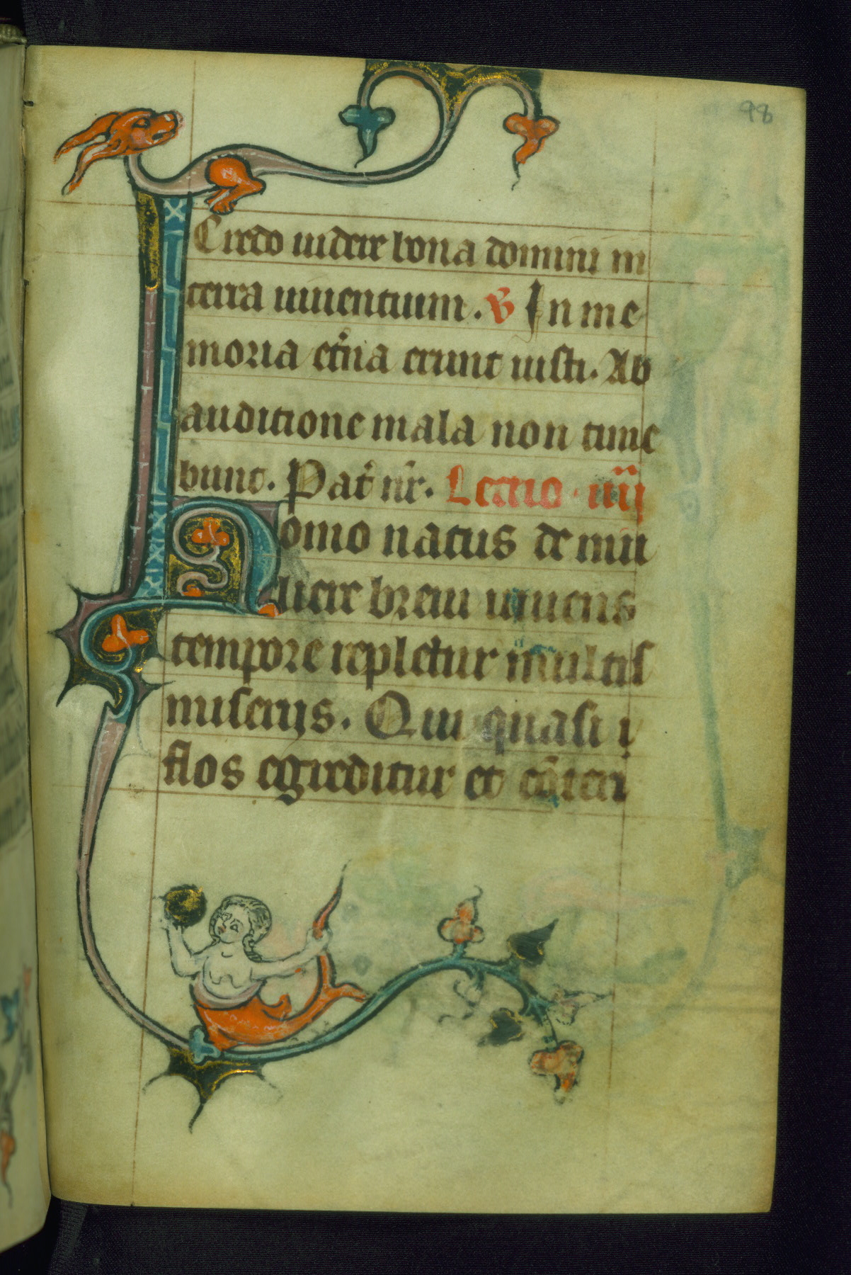 This Book of Hours was made ca. 1310-20, likely in Ghent. It was badly rebound with a sixteenth-century Flemish binding by Léon Gruel in Paris at the end of the nineteenth or early twentieth century, and the initials of Gruel and Engelmann are printed on the bookplate on the front pastedown. The manuscript lacks its calendar, and the text is incomplete and misbound. In the fourteenth century a prayer for Communion, written in French, was added at the end of the book. Initials in gold, blue and pink mark the divisions of the text. The manuscript is richly illuminated with drolleries; painted on the borders of each folio, they would have amused the reader with their playful animals, hybrids, and human figures.