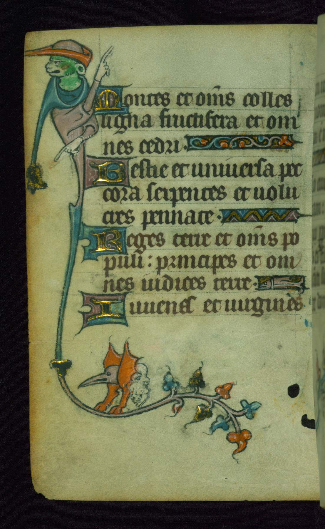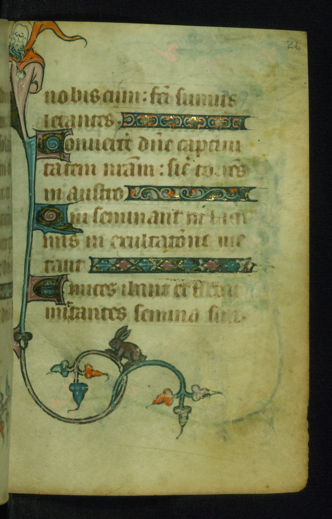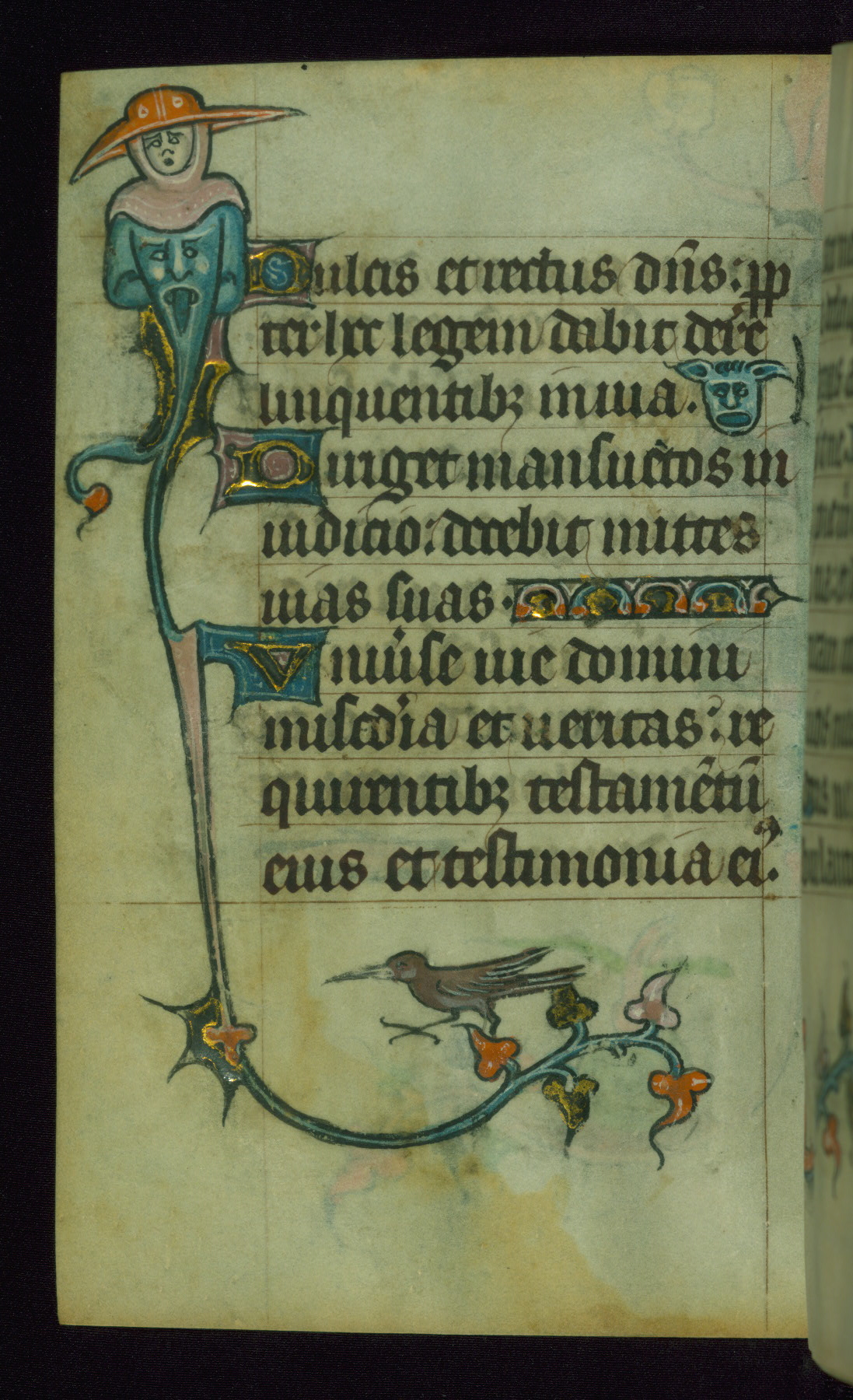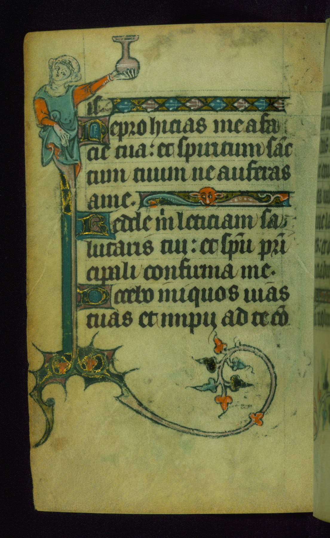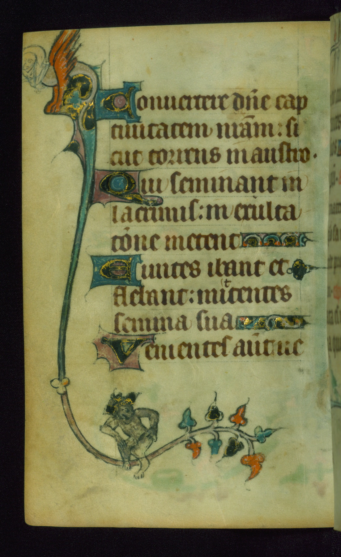 This Book of Hours was made ca. 1310-20, likely in Ghent. It was badly rebound with a sixteenth-century Flemish binding by Léon Gruel in Paris at the end of the nineteenth or early twentieth century, and the initials of Gruel and Engelmann are printed on the bookplate on the front pastedown. The manuscript lacks its calendar, and the text is incomplete and misbound. In the fourteenth century a prayer for Communion, written in French, was added at the end of the book. Initials in gold, blue and pink mark the divisions of the text. The manuscript is richly illuminated with drolleries; painted on the borders of each folio, they would have amused the reader with their playful animals, hybrids, and human figures.
