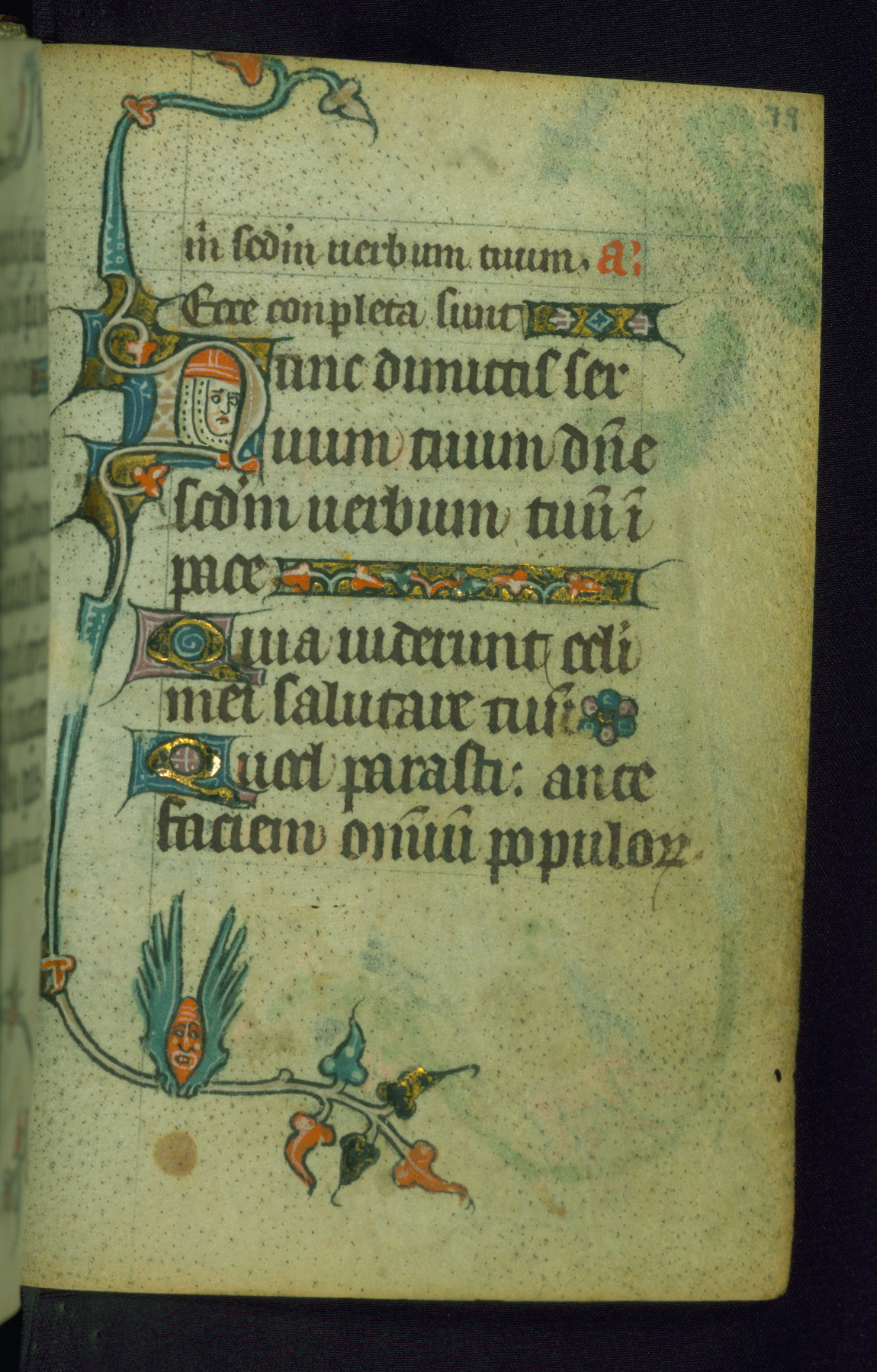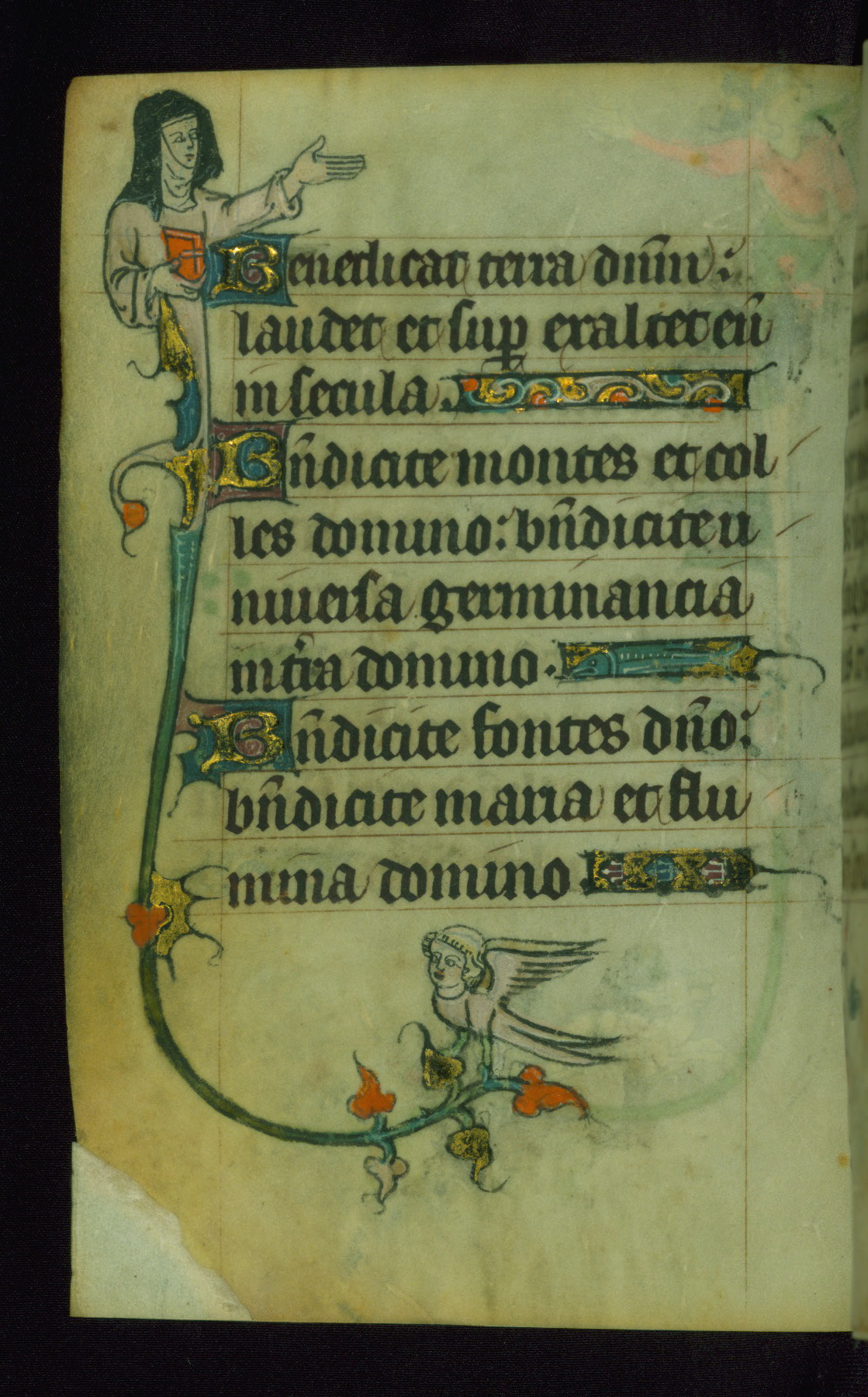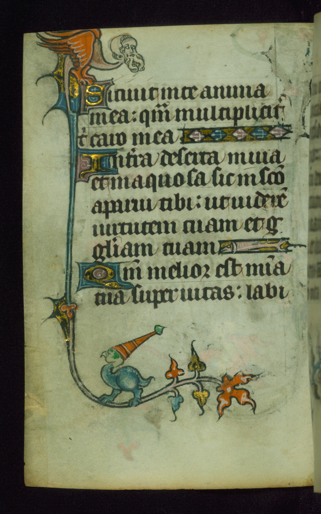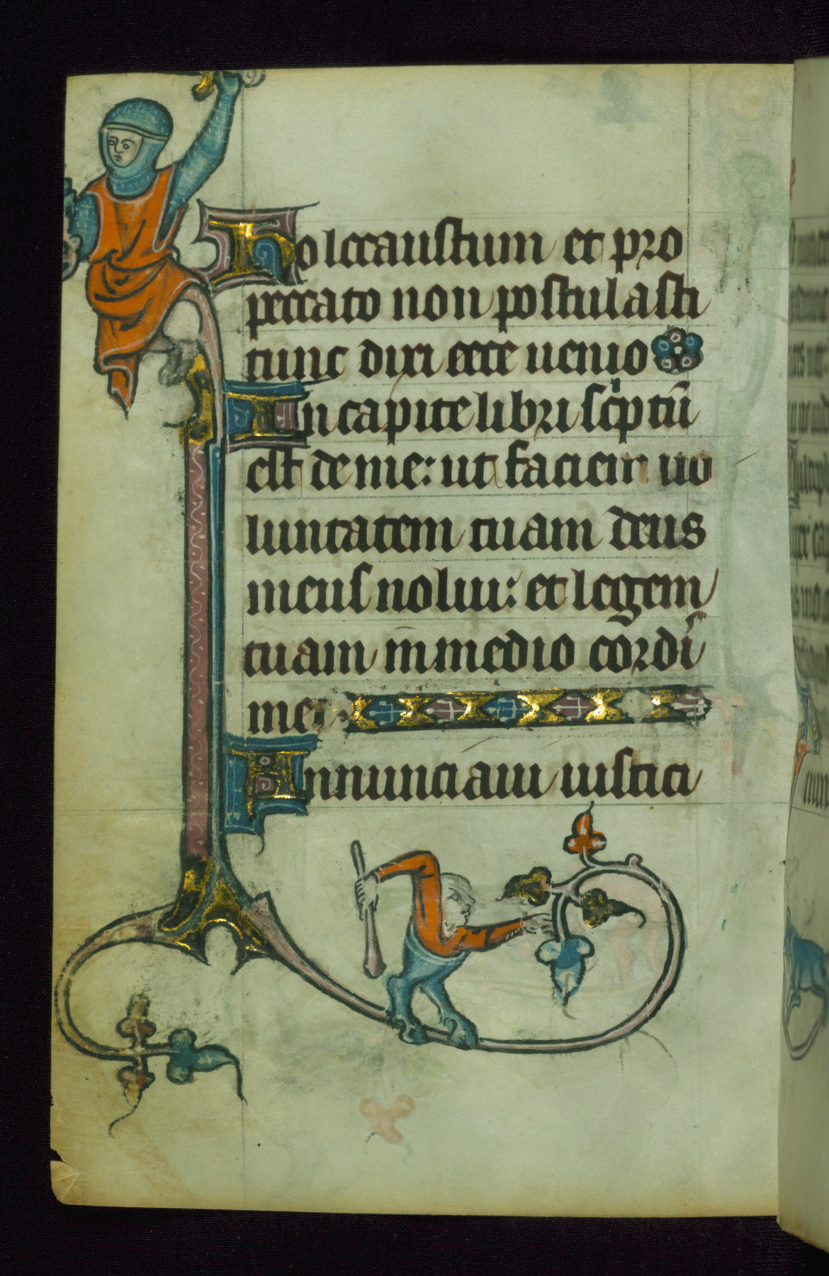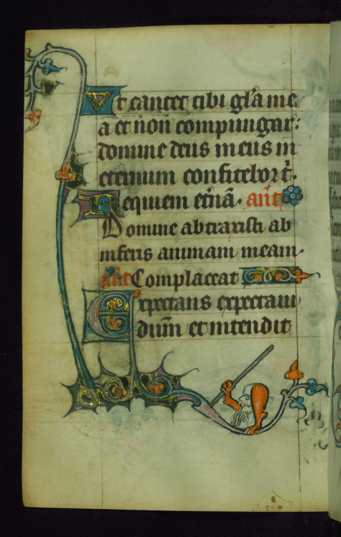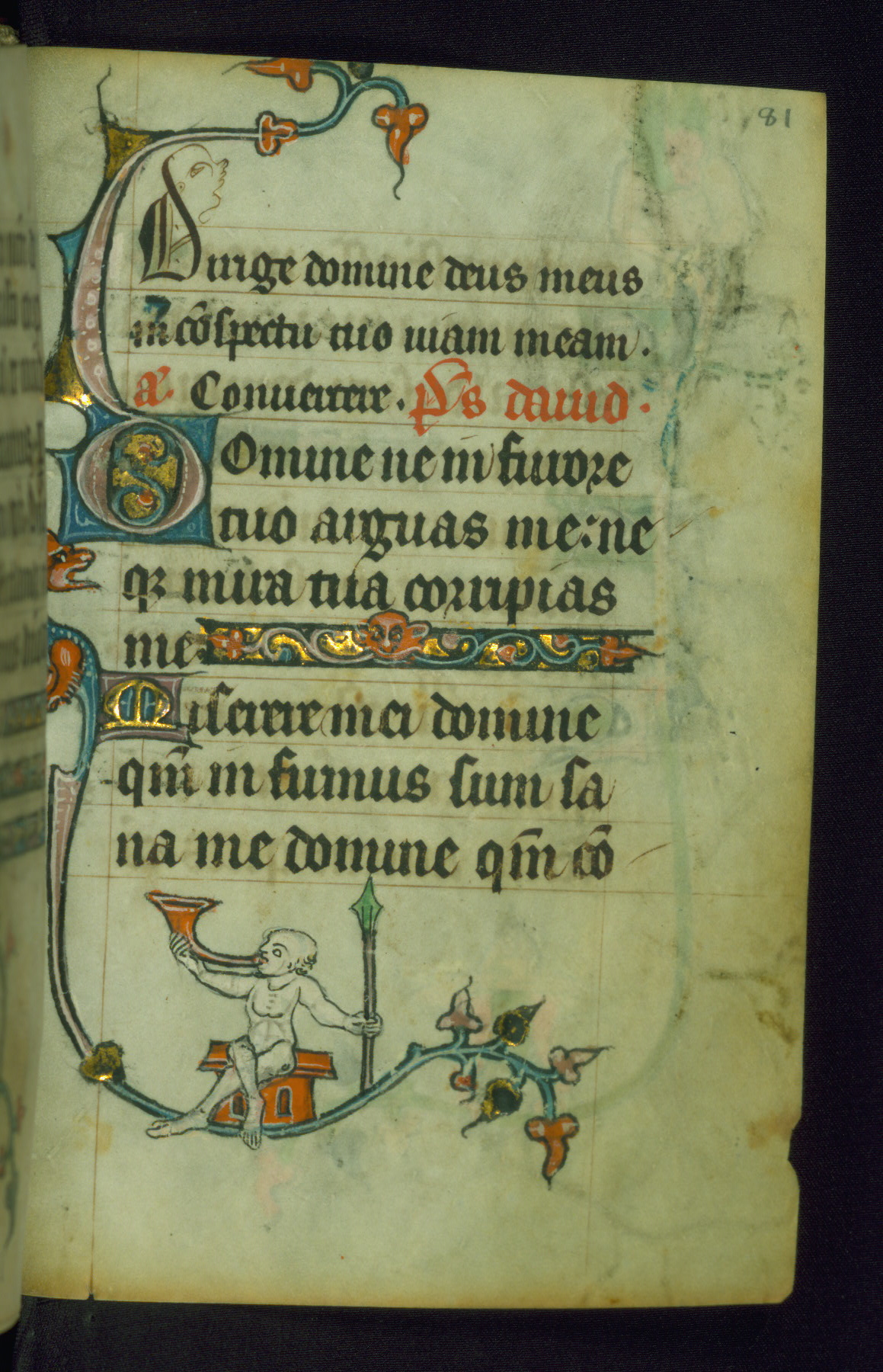 This Book of Hours was made ca. 1310-20, likely in Ghent. It was badly rebound with a sixteenth-century Flemish binding by Léon Gruel in Paris at the end of the nineteenth or early twentieth century, and the initials of Gruel and Engelmann are printed on the bookplate on the front pastedown. The manuscript lacks its calendar, and the text is incomplete and misbound. In the fourteenth century a prayer for Communion, written in French, was added at the end of the book. Initials in gold, blue and pink mark the divisions of the text. The manuscript is richly illuminated with drolleries; painted on the borders of each folio, they would have amused the reader with their playful animals, hybrids, and human figures.
