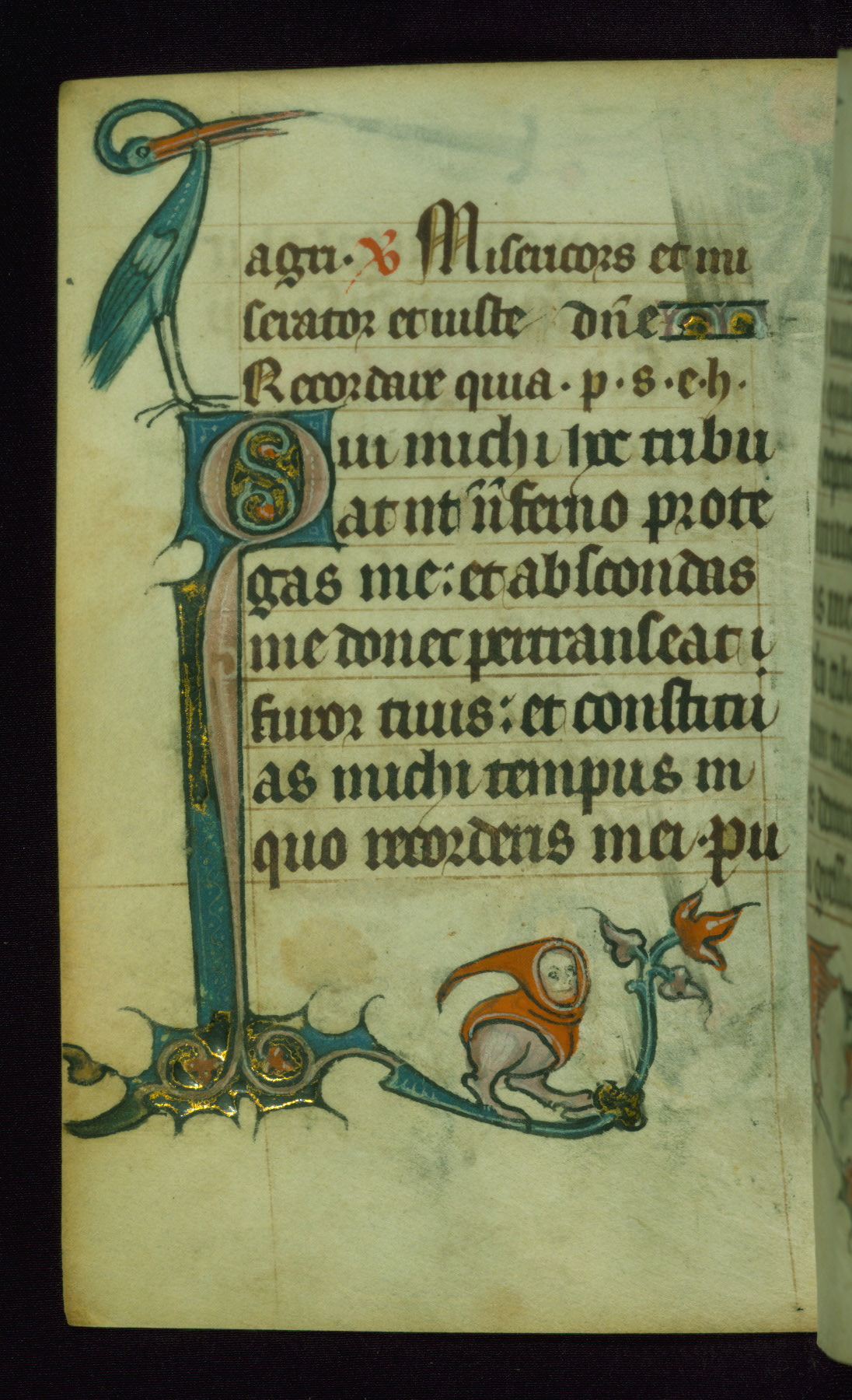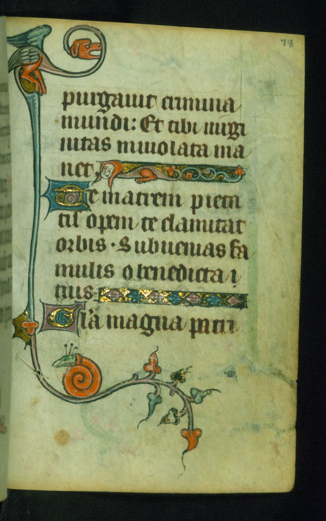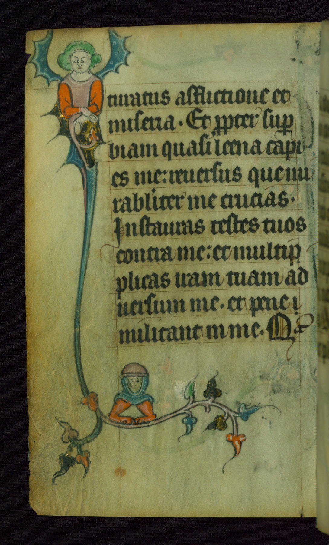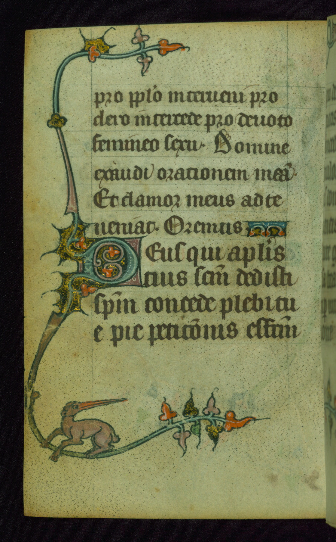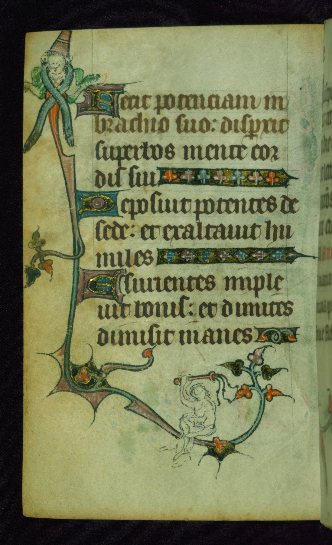 This Book of Hours was made ca. 1310-20, likely in Ghent. It was badly rebound with a sixteenth-century Flemish binding by Léon Gruel in Paris at the end of the nineteenth or early twentieth century, and the initials of Gruel and Engelmann are printed on the bookplate on the front pastedown. The manuscript lacks its calendar, and the text is incomplete and misbound. In the fourteenth century a prayer for Communion, written in French, was added at the end of the book. Initials in gold, blue and pink mark the divisions of the text. The manuscript is richly illuminated with drolleries; painted on the borders of each folio, they would have amused the reader with their playful animals, hybrids, and human figures.