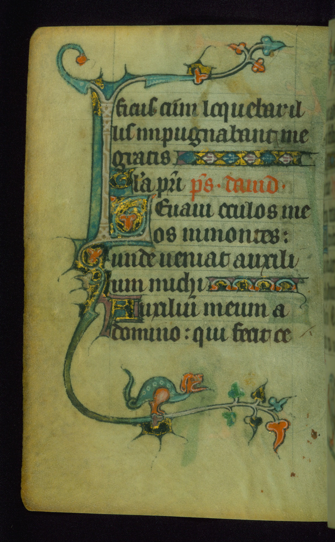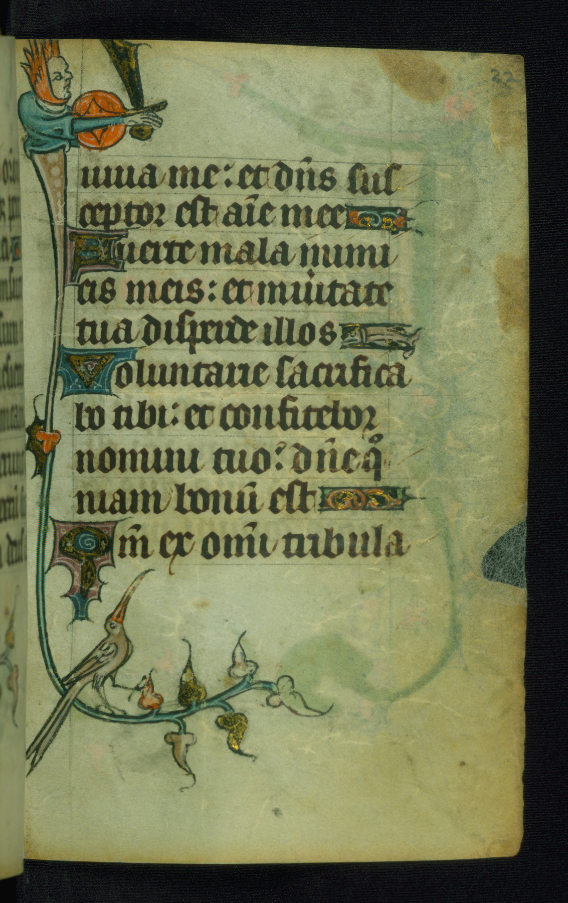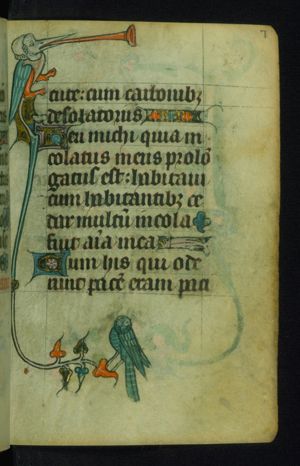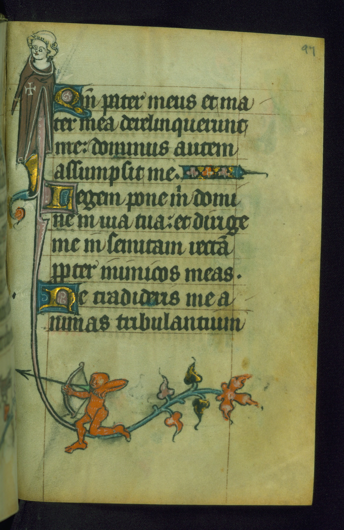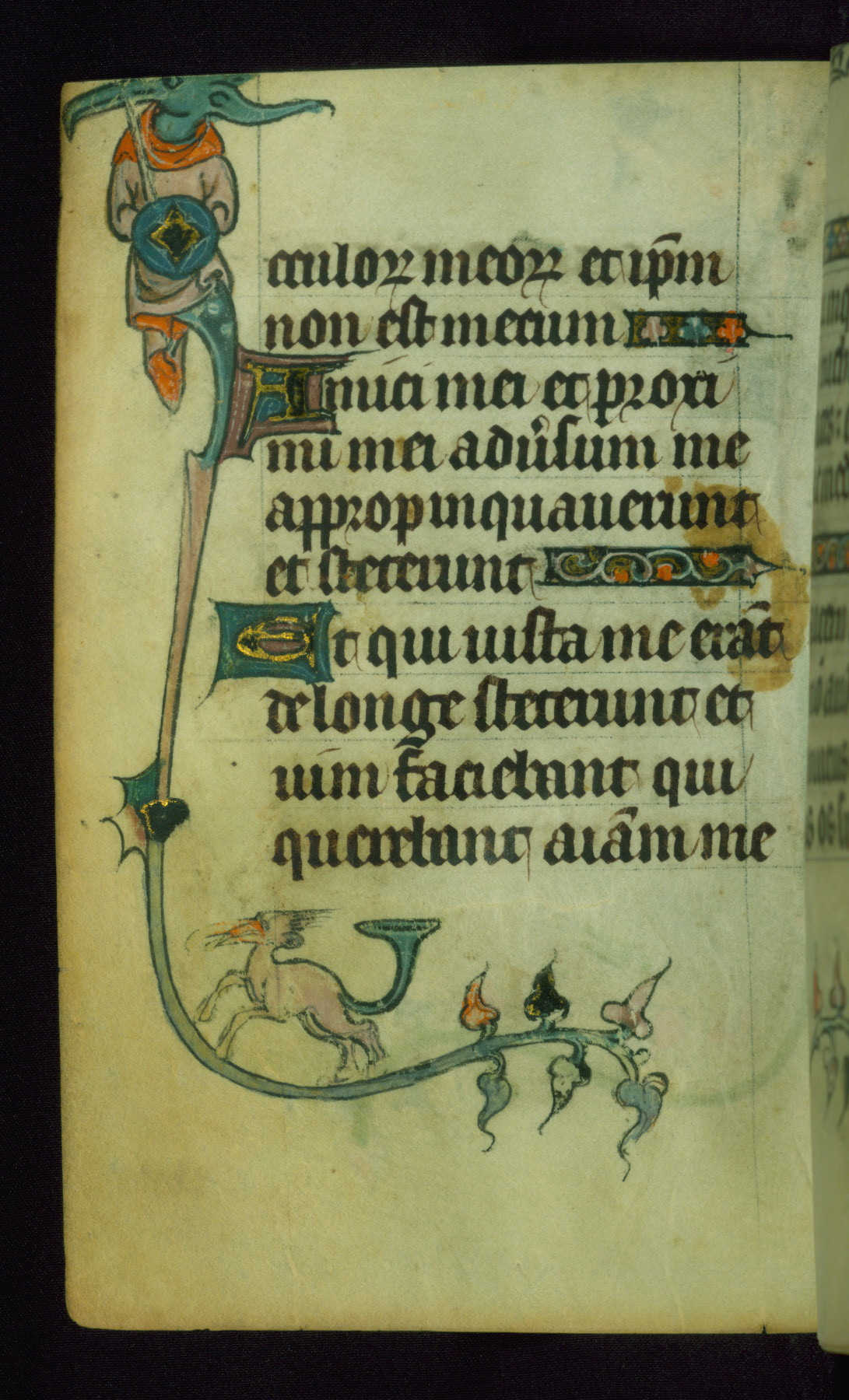 This Book of Hours was made ca. 1310-20, likely in Ghent. It was badly rebound with a sixteenth-century Flemish binding by Léon Gruel in Paris at the end of the nineteenth or early twentieth century, and the initials of Gruel and Engelmann are printed on the bookplate on the front pastedown. The manuscript lacks its calendar, and the text is incomplete and misbound. In the fourteenth century a prayer for Communion, written in French, was added at the end of the book. Initials in gold, blue and pink mark the divisions of the text. The manuscript is richly illuminated with drolleries; painted on the borders of each folio, they would have amused the reader with their playful animals, hybrids, and human figures.