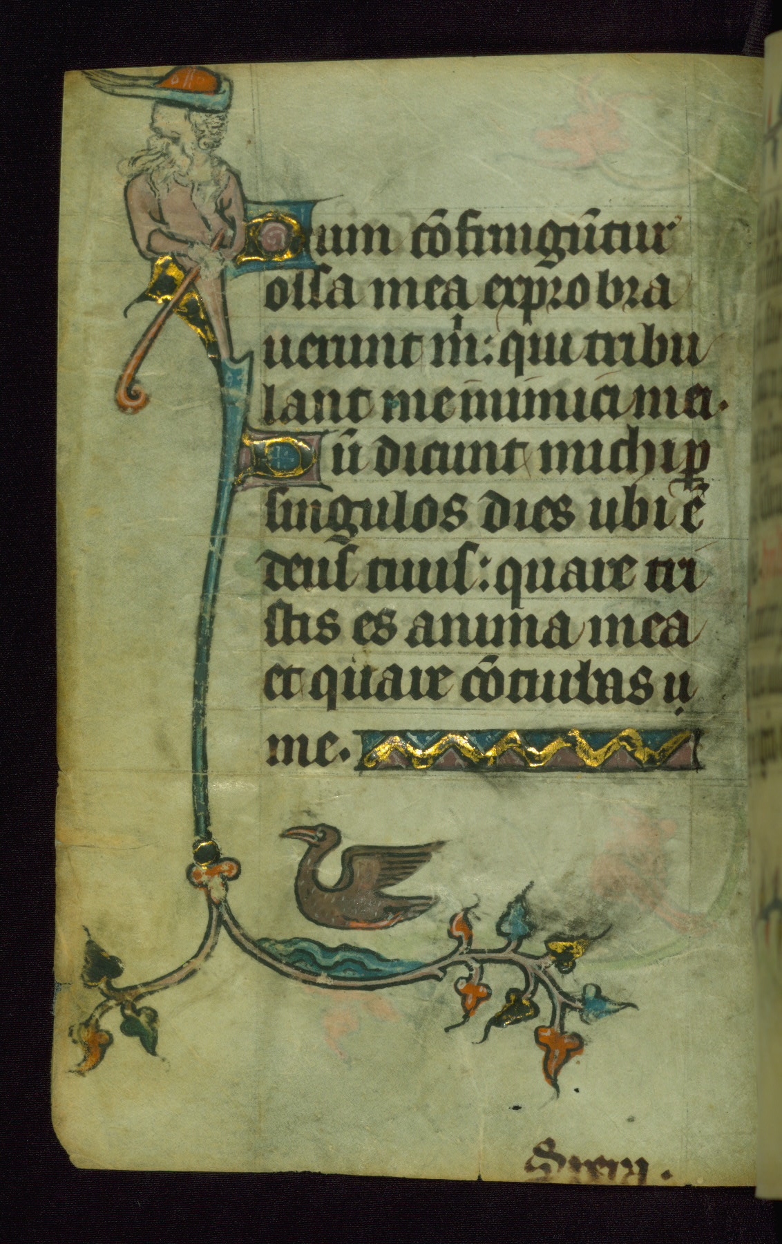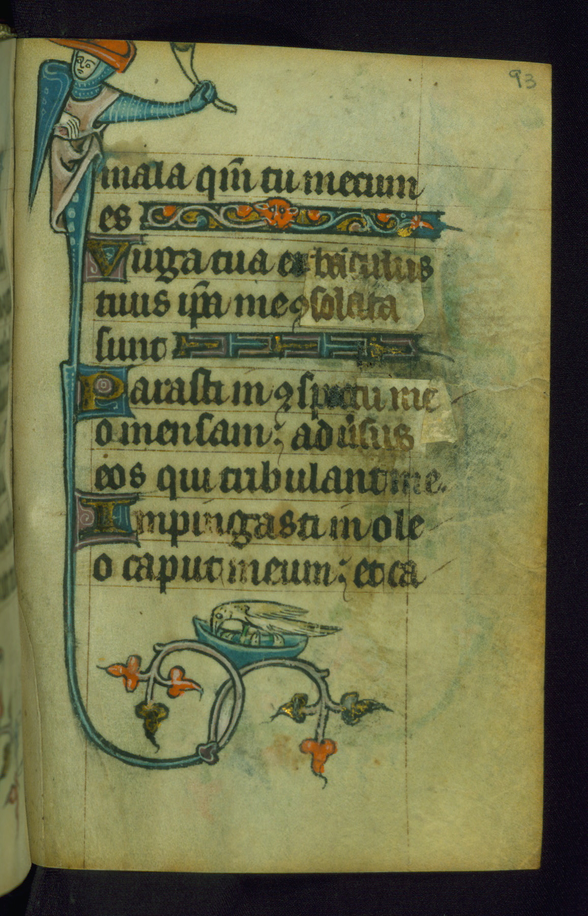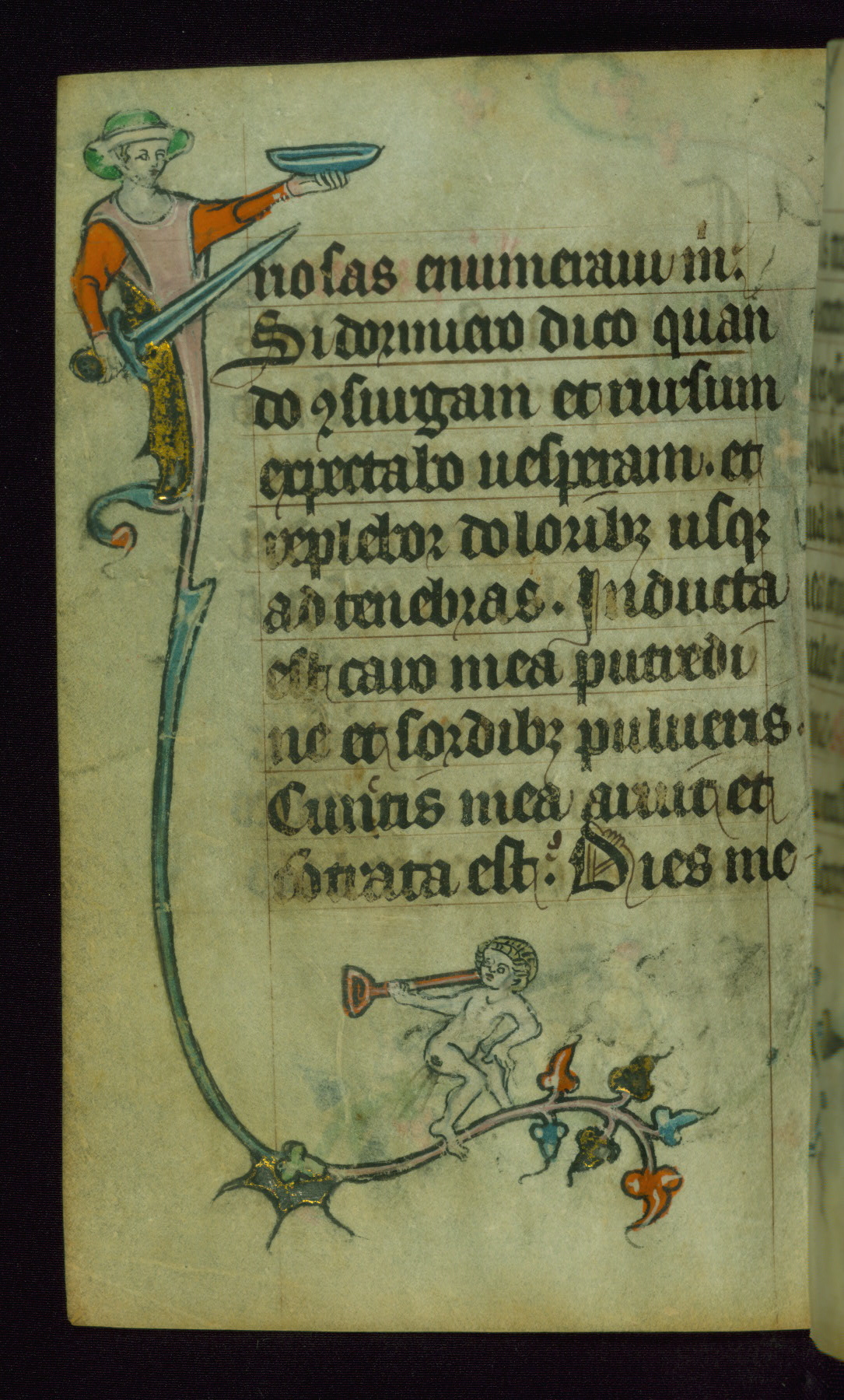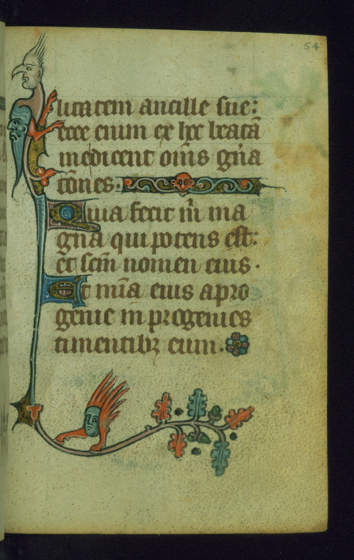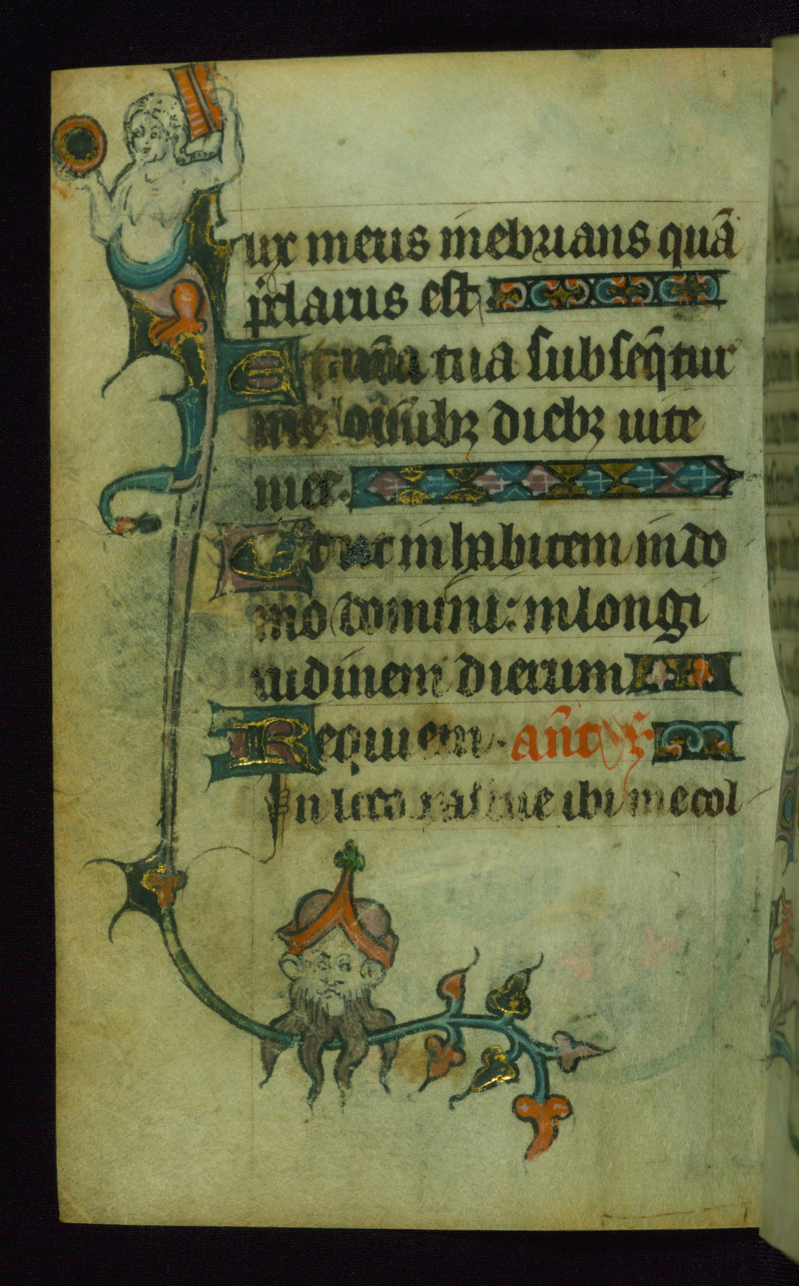 This Book of Hours was made ca. 1310-20, likely in Ghent. It was badly rebound with a sixteenth-century Flemish binding by Léon Gruel in Paris at the end of the nineteenth or early twentieth century, and the initials of Gruel and Engelmann are printed on the bookplate on the front pastedown. The manuscript lacks its calendar, and the text is incomplete and misbound. In the fourteenth century a prayer for Communion, written in French, was added at the end of the book. Initials in gold, blue and pink mark the divisions of the text. The manuscript is richly illuminated with drolleries; painted on the borders of each folio, they would have amused the reader with their playful animals, hybrids, and human figures.