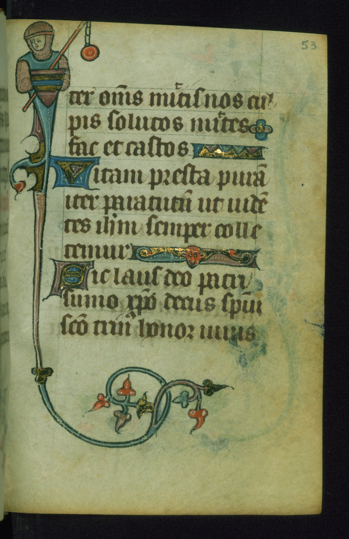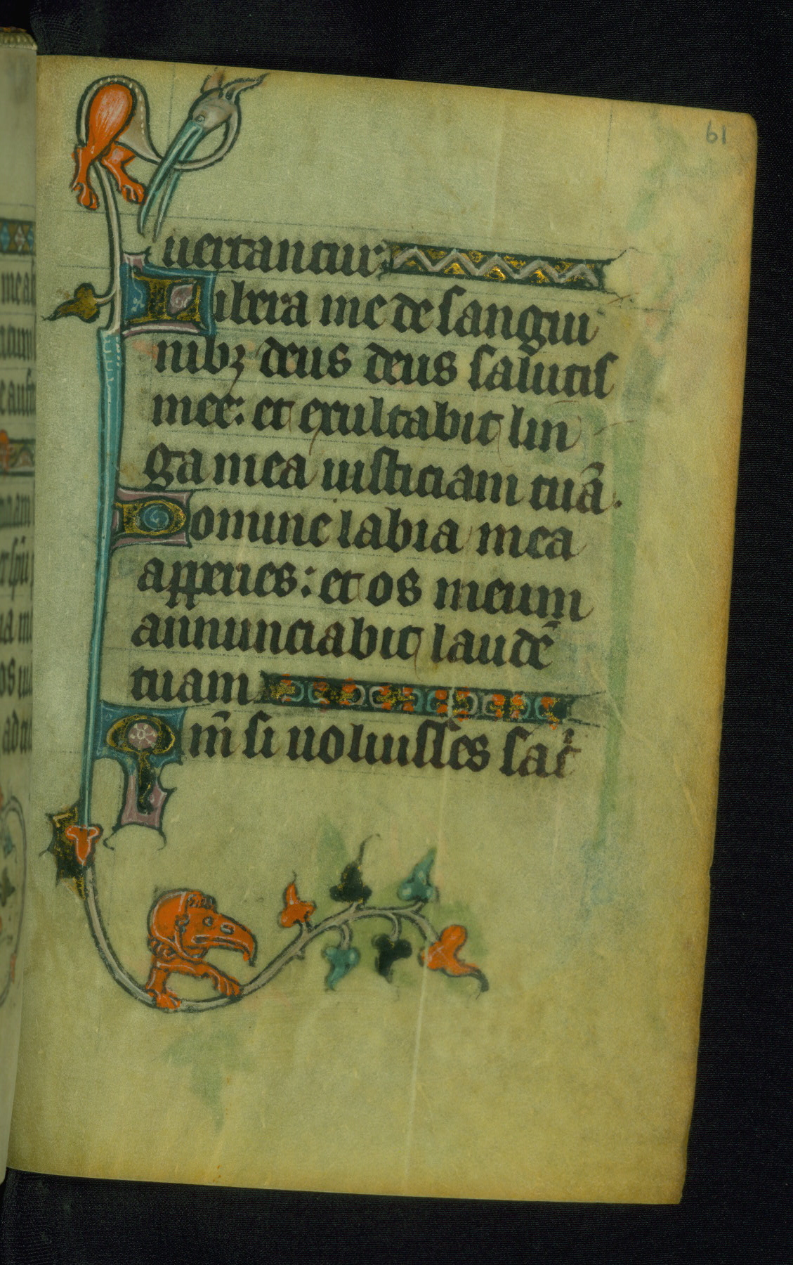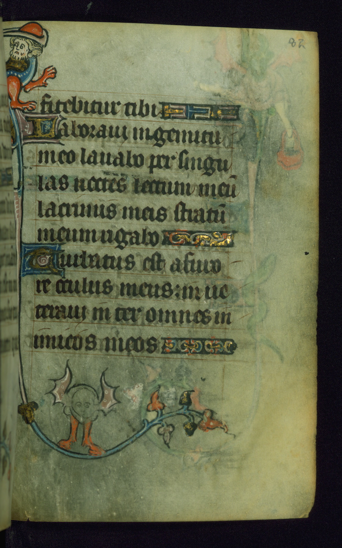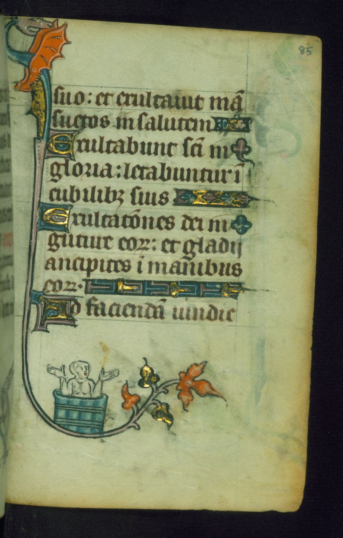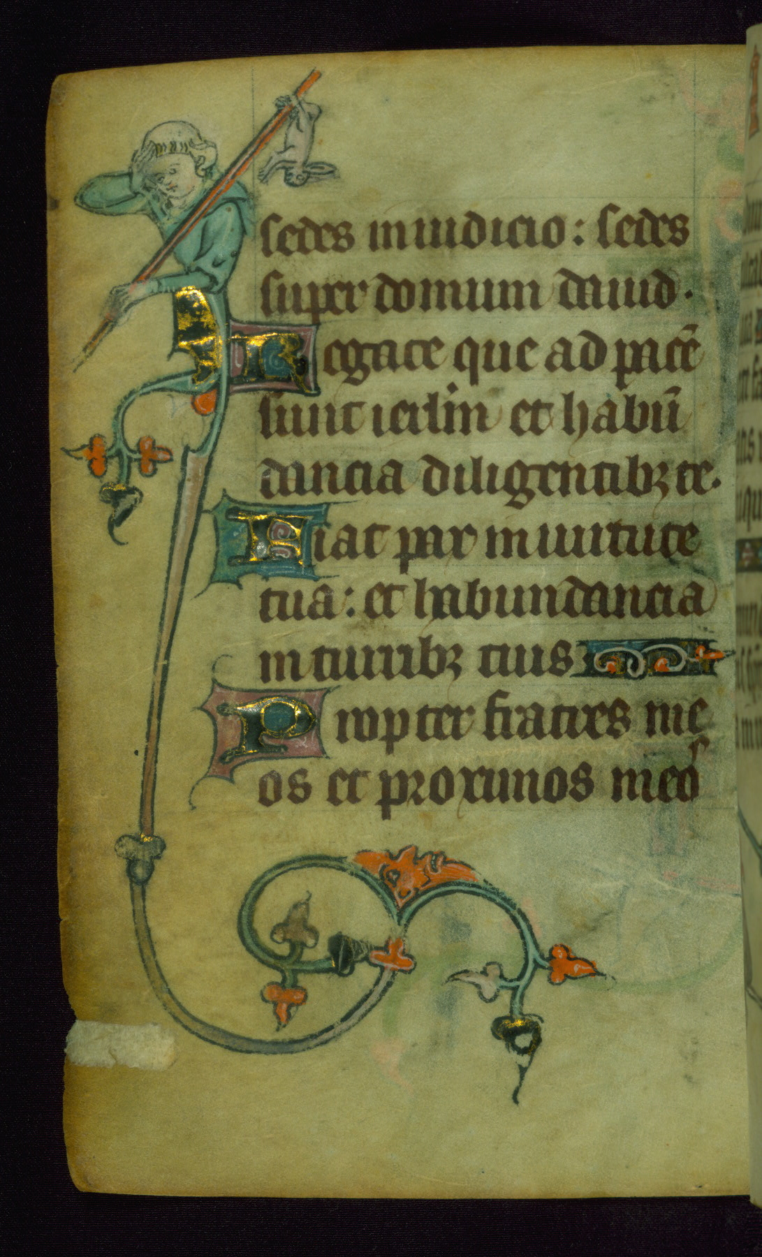 This Book of Hours was made ca. 1310-20, likely in Ghent. It was badly rebound with a sixteenth-century Flemish binding by Léon Gruel in Paris at the end of the nineteenth or early twentieth century, and the initials of Gruel and Engelmann are printed on the bookplate on the front pastedown. The manuscript lacks its calendar, and the text is incomplete and misbound. In the fourteenth century a prayer for Communion, written in French, was added at the end of the book. Initials in gold, blue and pink mark the divisions of the text. The manuscript is richly illuminated with drolleries; painted on the borders of each folio, they would have amused the reader with their playful animals, hybrids, and human figures.