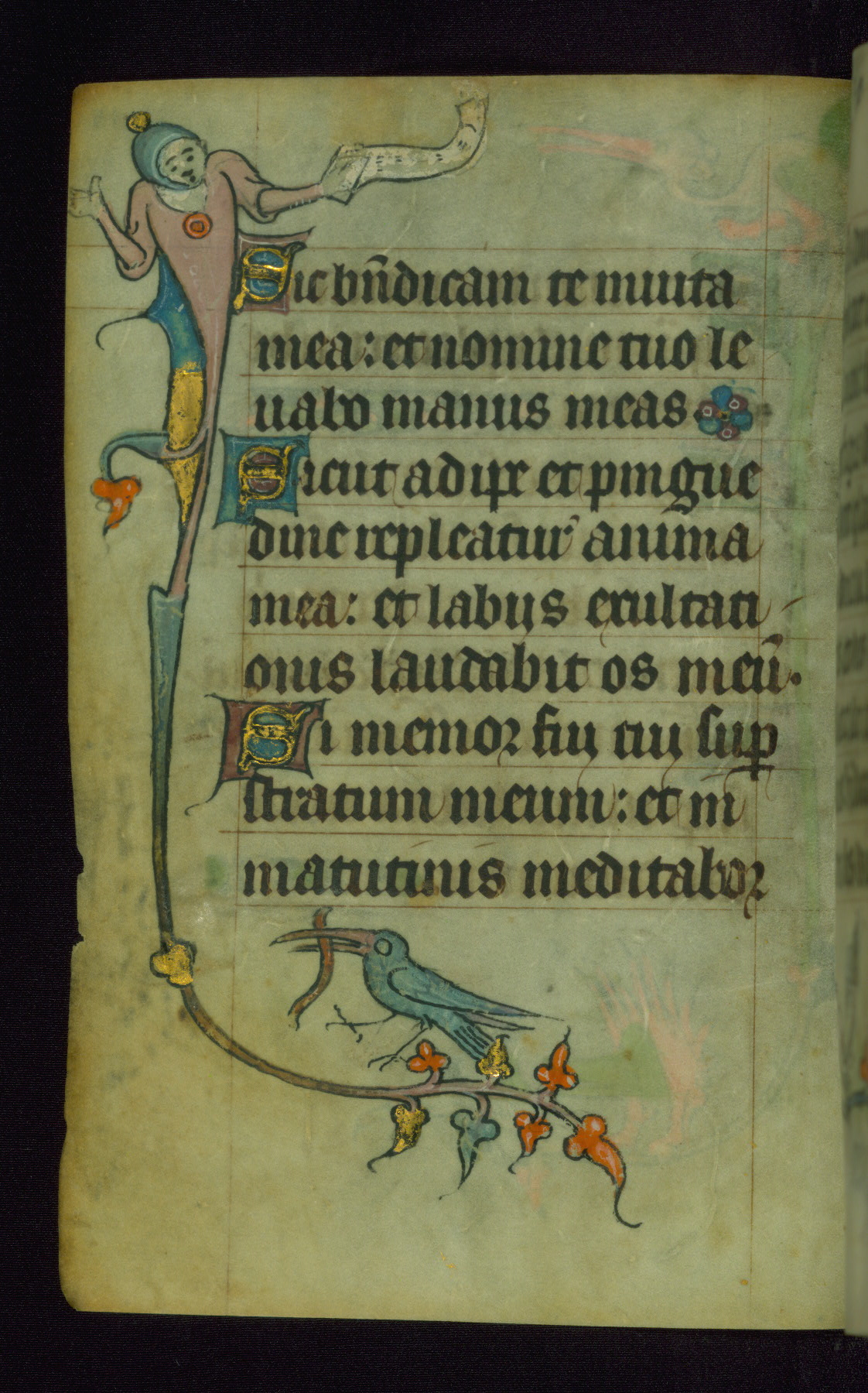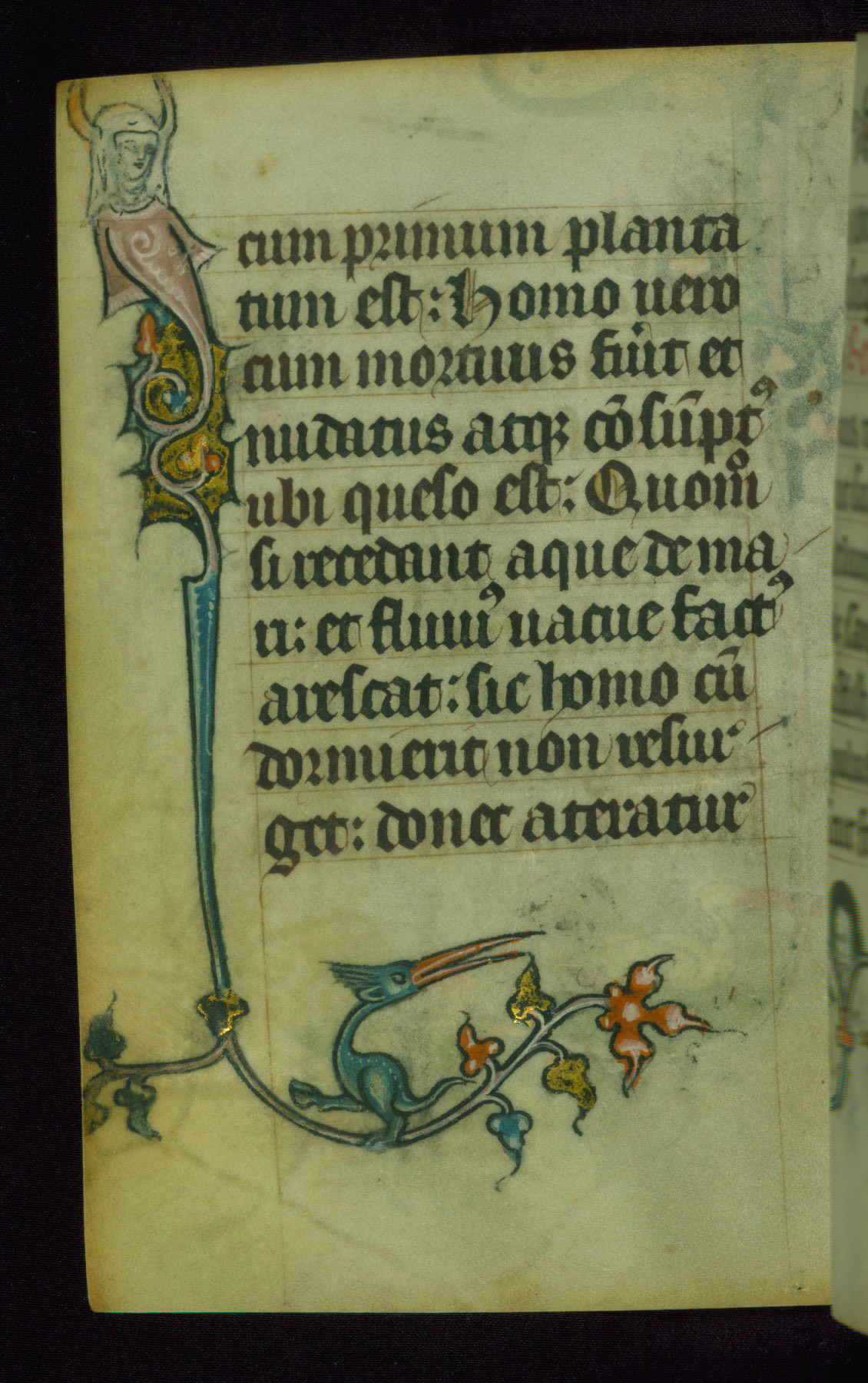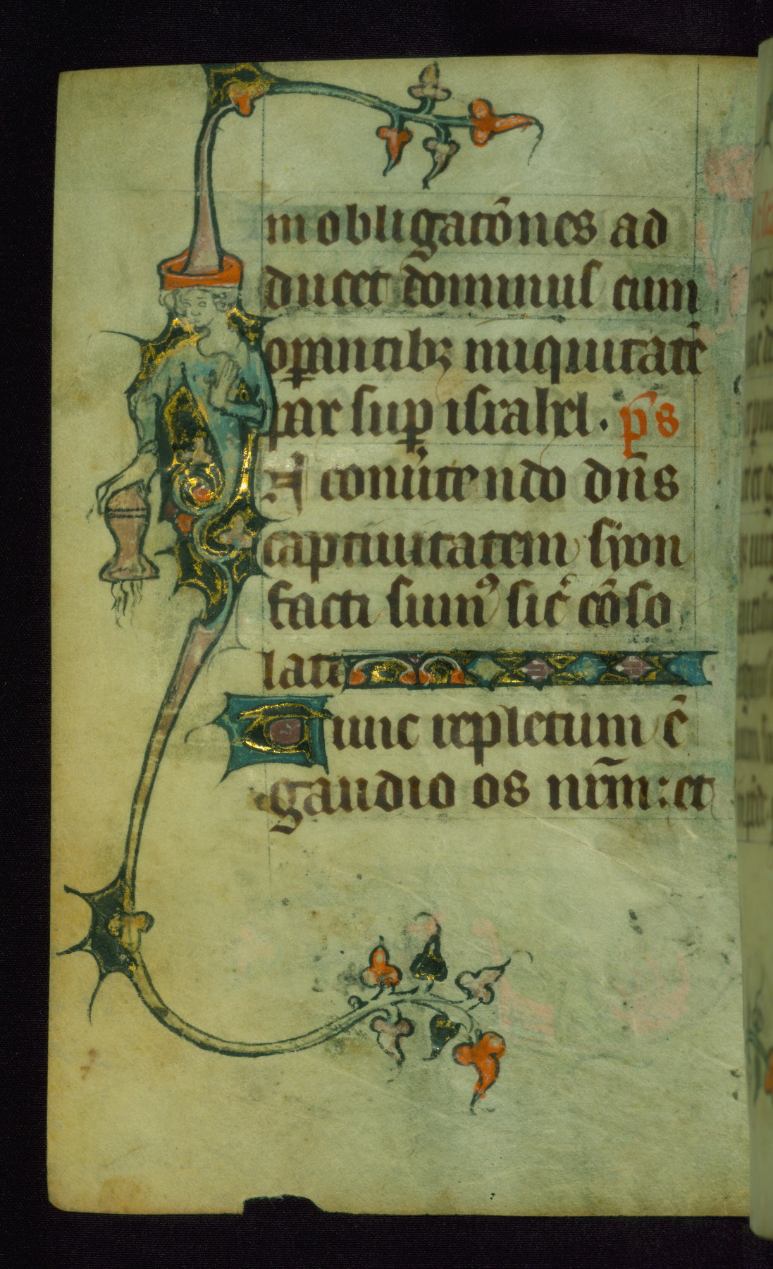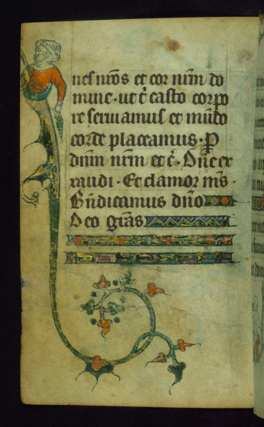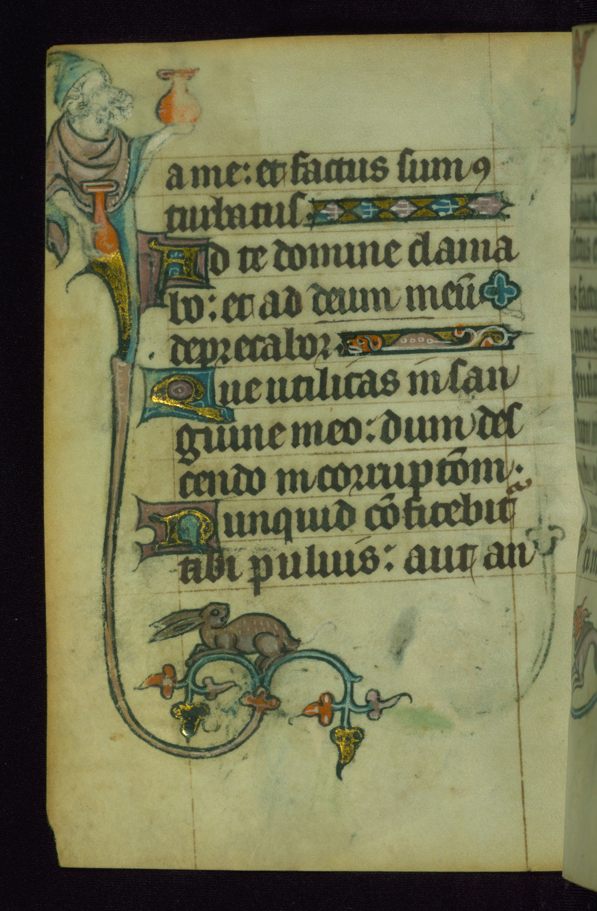 This Book of Hours was made ca. 1310-20, likely in Ghent. It was badly rebound with a sixteenth-century Flemish binding by Léon Gruel in Paris at the end of the nineteenth or early twentieth century, and the initials of Gruel and Engelmann are printed on the bookplate on the front pastedown. The manuscript lacks its calendar, and the text is incomplete and misbound. In the fourteenth century a prayer for Communion, written in French, was added at the end of the book. Initials in gold, blue and pink mark the divisions of the text. The manuscript is richly illuminated with drolleries; painted on the borders of each folio, they would have amused the reader with their playful animals, hybrids, and human figures.