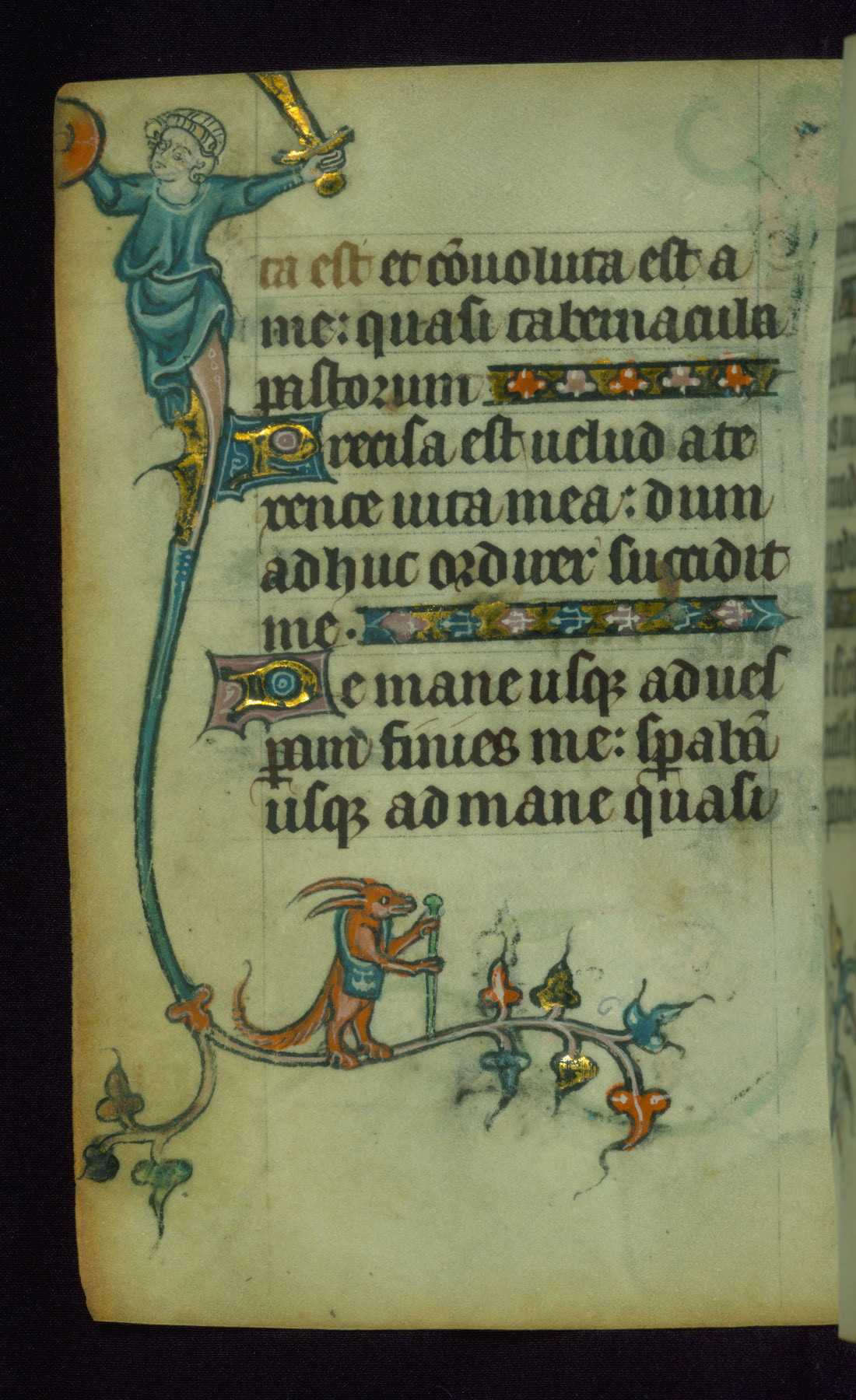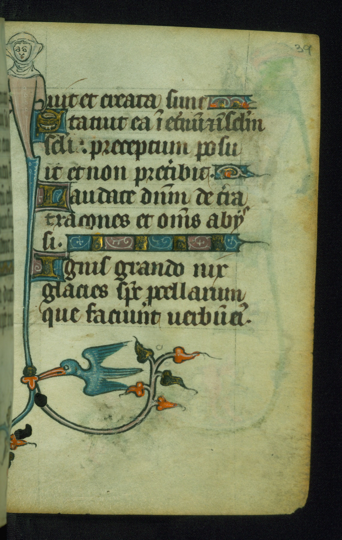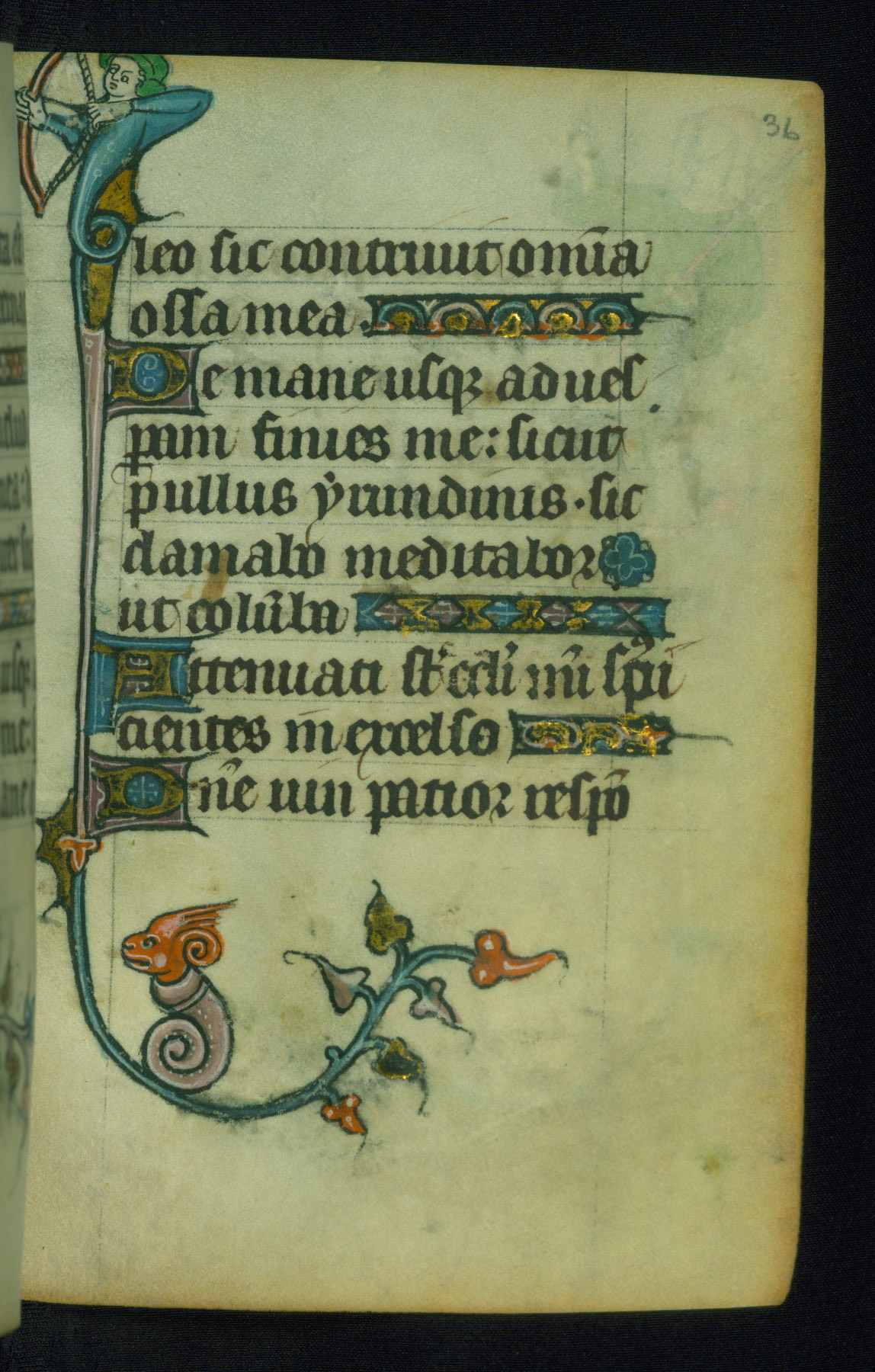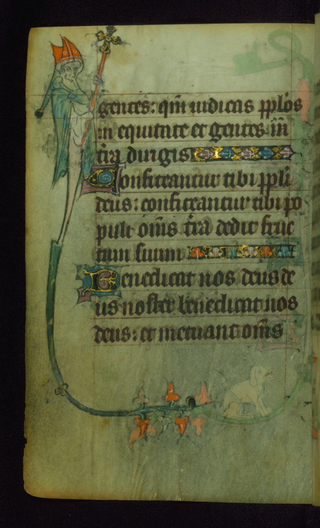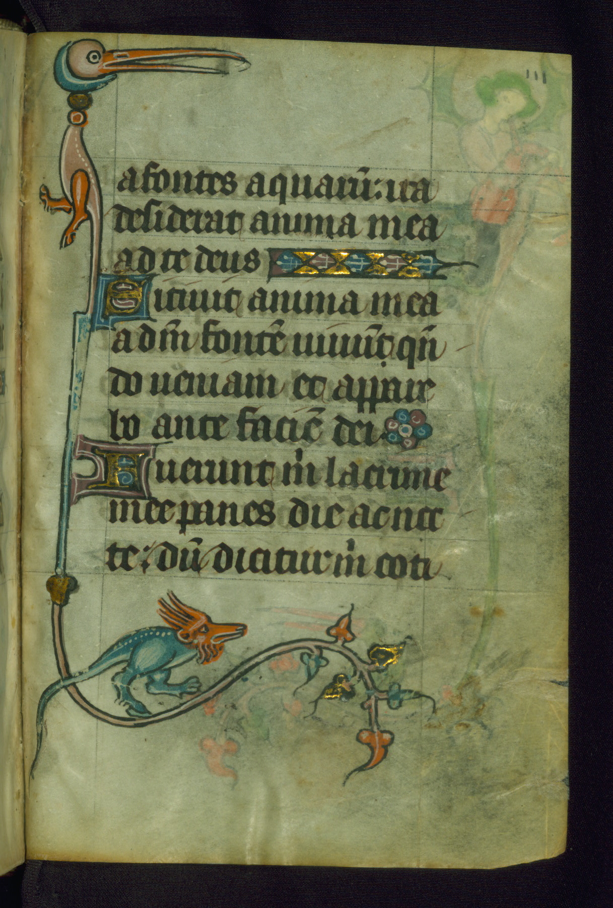 This Book of Hours was made ca. 1310-20, likely in Ghent. It was badly rebound with a sixteenth-century Flemish binding by Léon Gruel in Paris at the end of the nineteenth or early twentieth century, and the initials of Gruel and Engelmann are printed on the bookplate on the front pastedown. The manuscript lacks its calendar, and the text is incomplete and misbound. In the fourteenth century a prayer for Communion, written in French, was added at the end of the book. Initials in gold, blue and pink mark the divisions of the text. The manuscript is richly illuminated with drolleries; painted on the borders of each folio, they would have amused the reader with their playful animals, hybrids, and human figures.