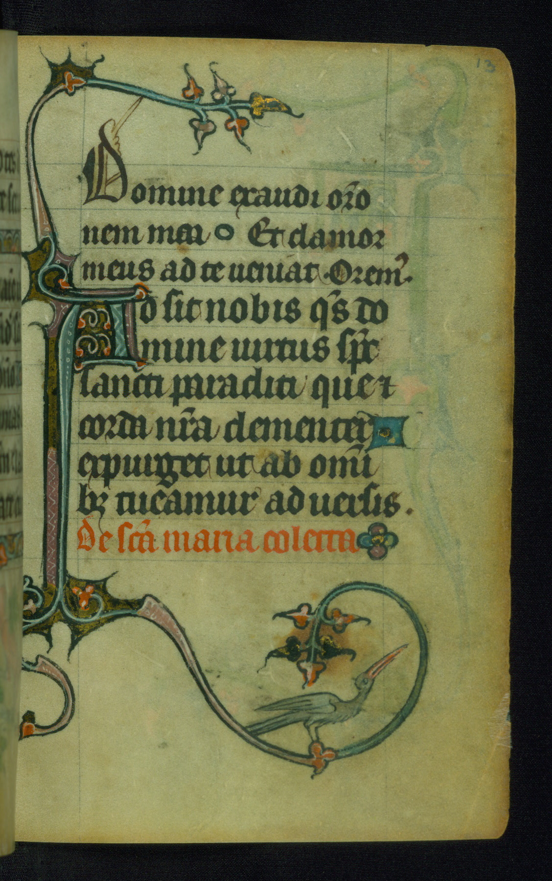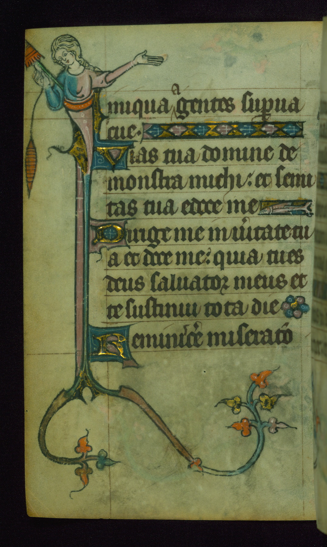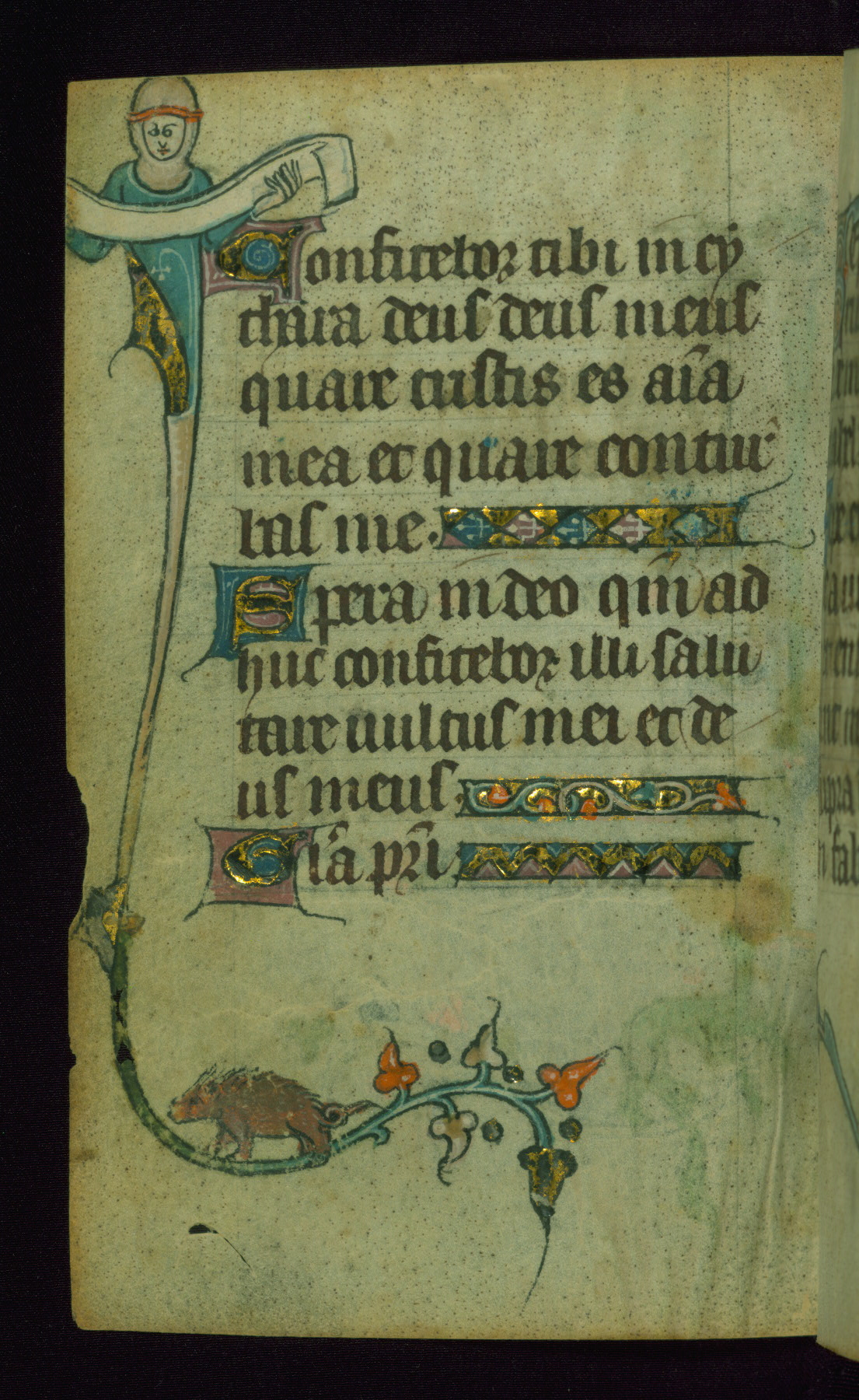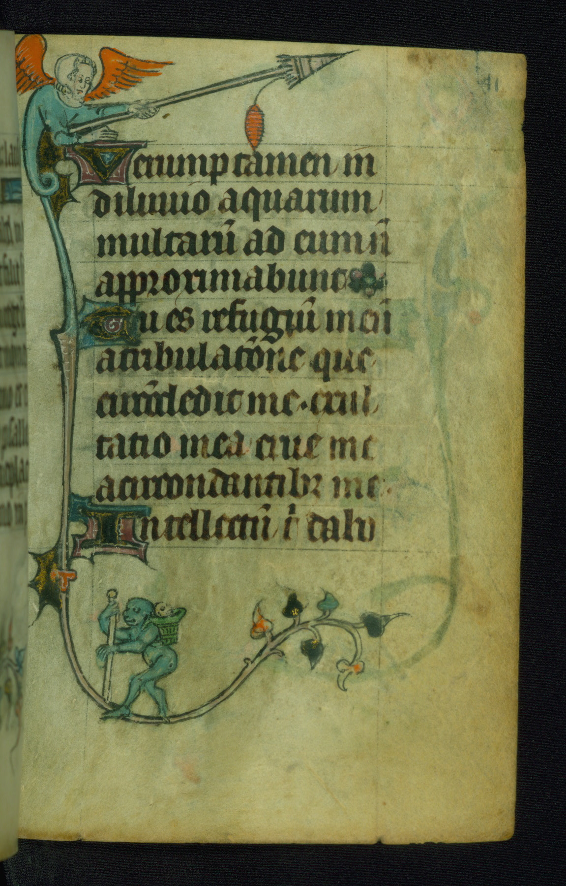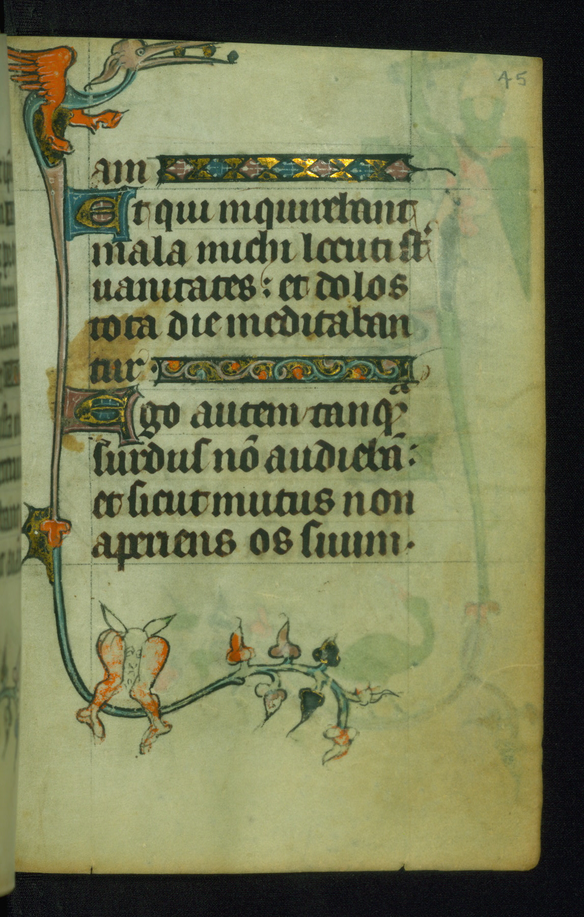 This Book of Hours was made ca. 1310-20, likely in Ghent. It was badly rebound with a sixteenth-century Flemish binding by Léon Gruel in Paris at the end of the nineteenth or early twentieth century, and the initials of Gruel and Engelmann are printed on the bookplate on the front pastedown. The manuscript lacks its calendar, and the text is incomplete and misbound. In the fourteenth century a prayer for Communion, written in French, was added at the end of the book. Initials in gold, blue and pink mark the divisions of the text. The manuscript is richly illuminated with drolleries; painted on the borders of each folio, they would have amused the reader with their playful animals, hybrids, and human figures.