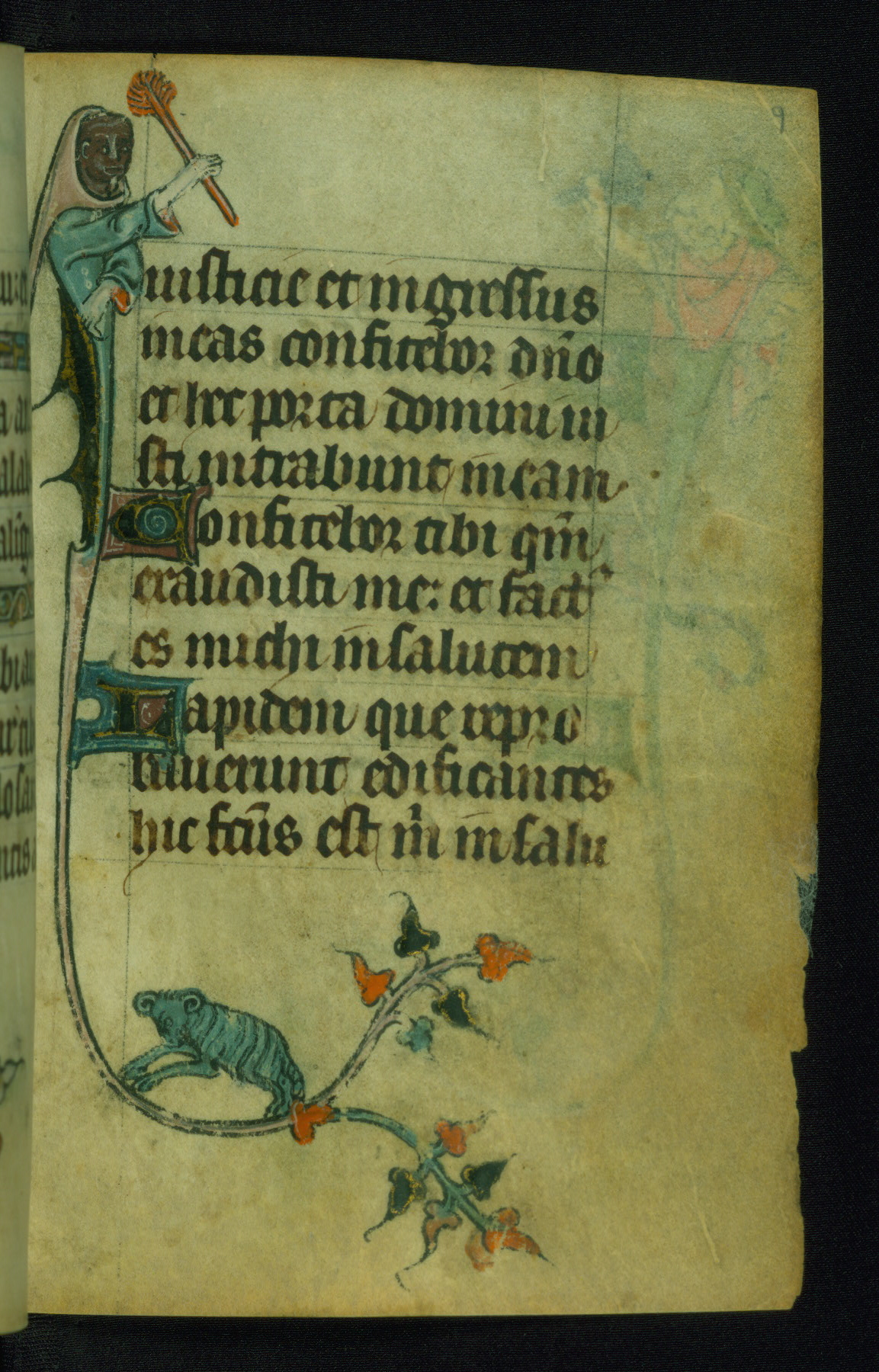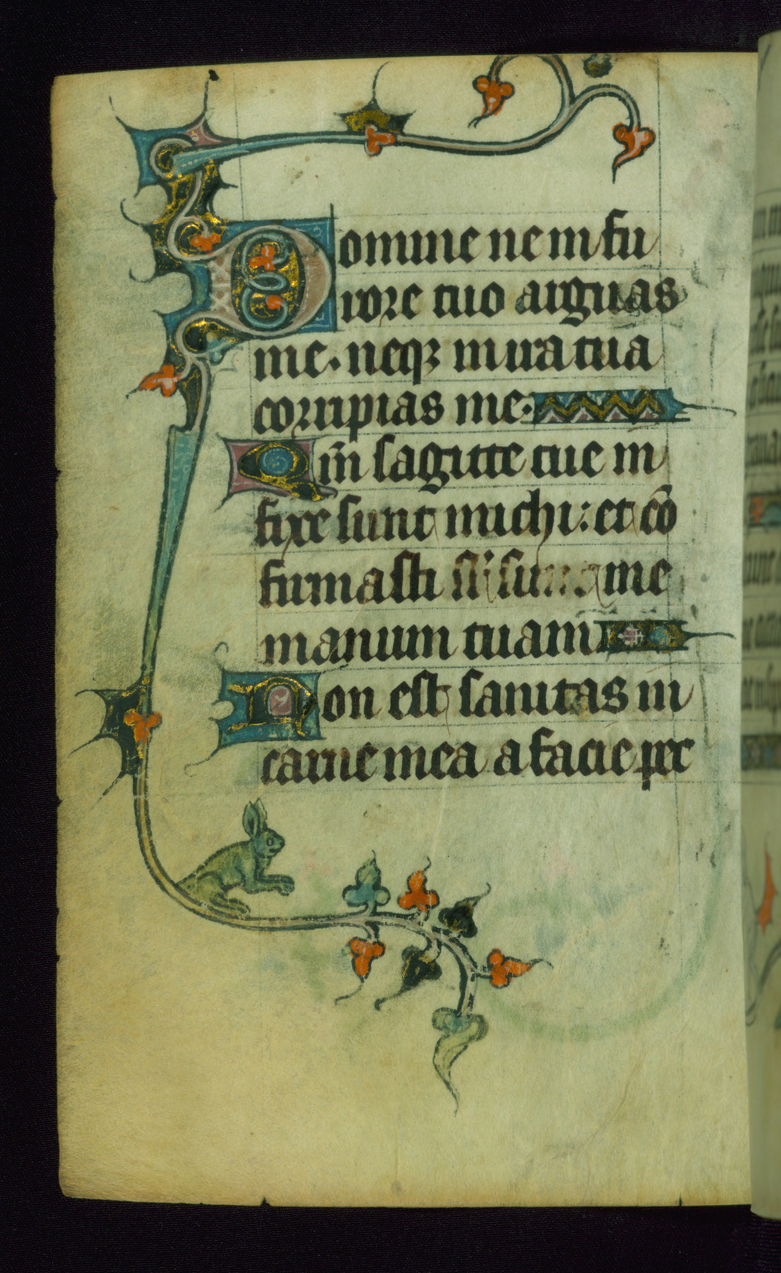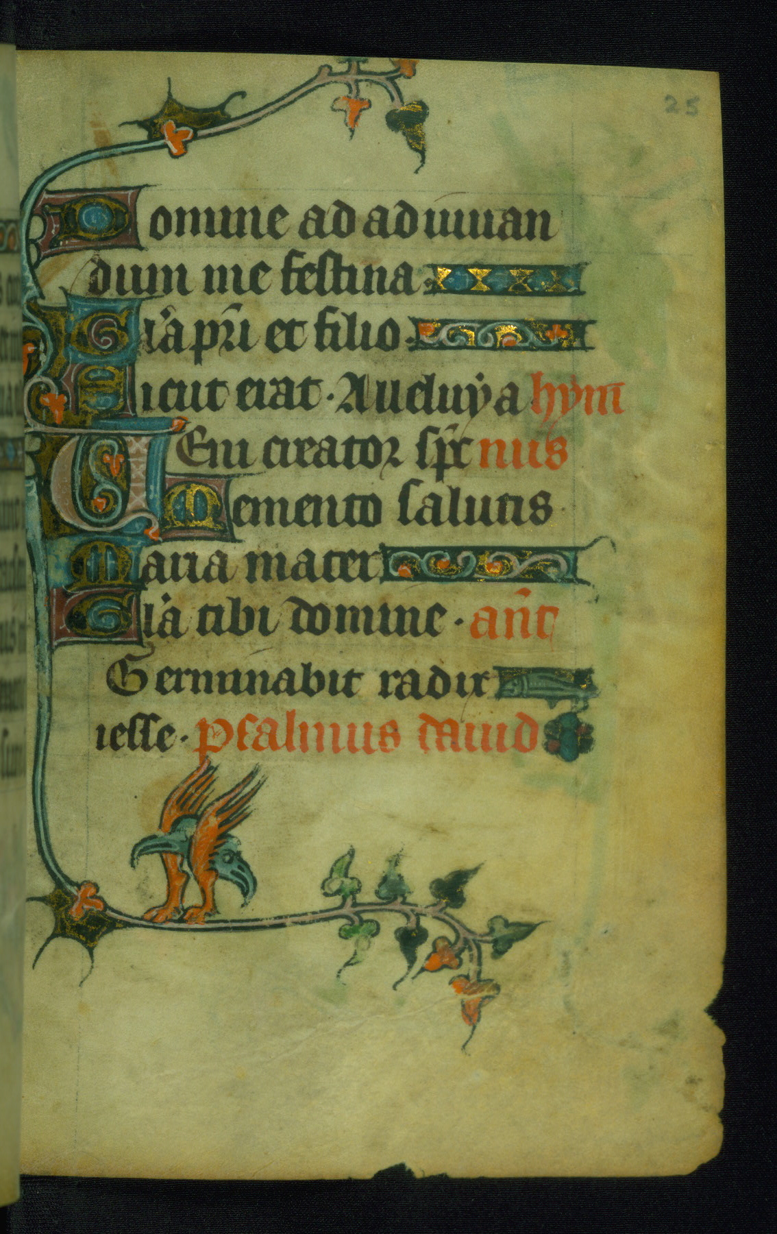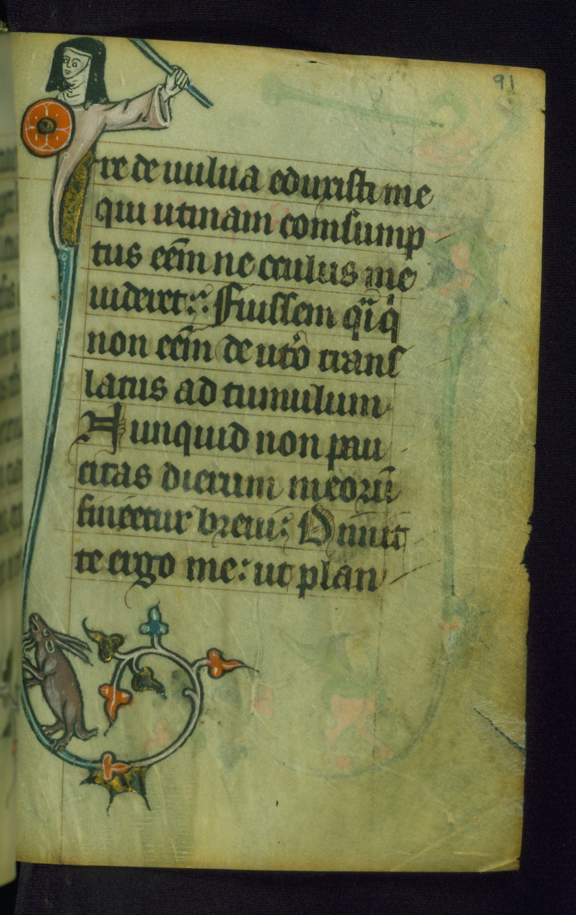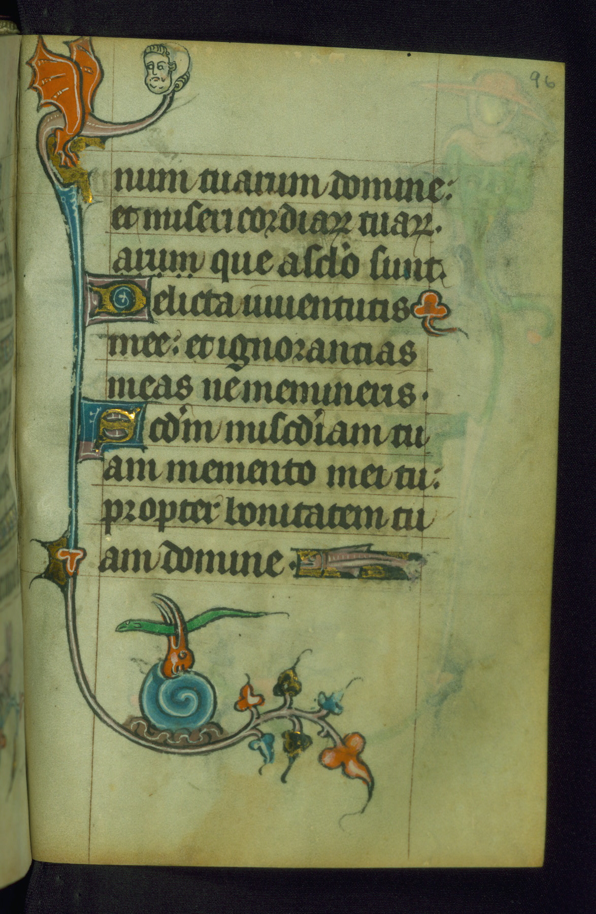 This Book of Hours was made ca. 1310-20, likely in Ghent. It was badly rebound with a sixteenth-century Flemish binding by Léon Gruel in Paris at the end of the nineteenth or early twentieth century, and the initials of Gruel and Engelmann are printed on the bookplate on the front pastedown. The manuscript lacks its calendar, and the text is incomplete and misbound. In the fourteenth century a prayer for Communion, written in French, was added at the end of the book. Initials in gold, blue and pink mark the divisions of the text. The manuscript is richly illuminated with drolleries; painted on the borders of each folio, they would have amused the reader with their playful animals, hybrids, and human figures.