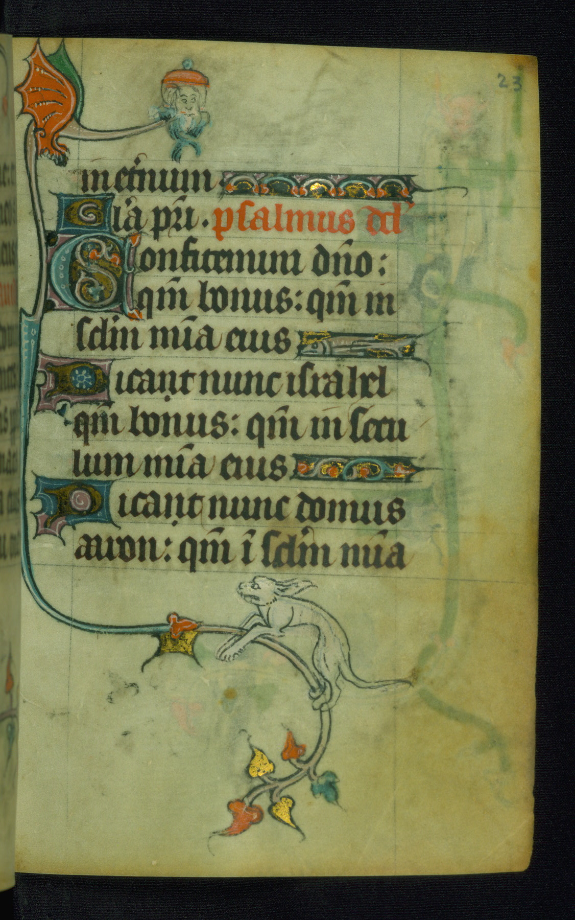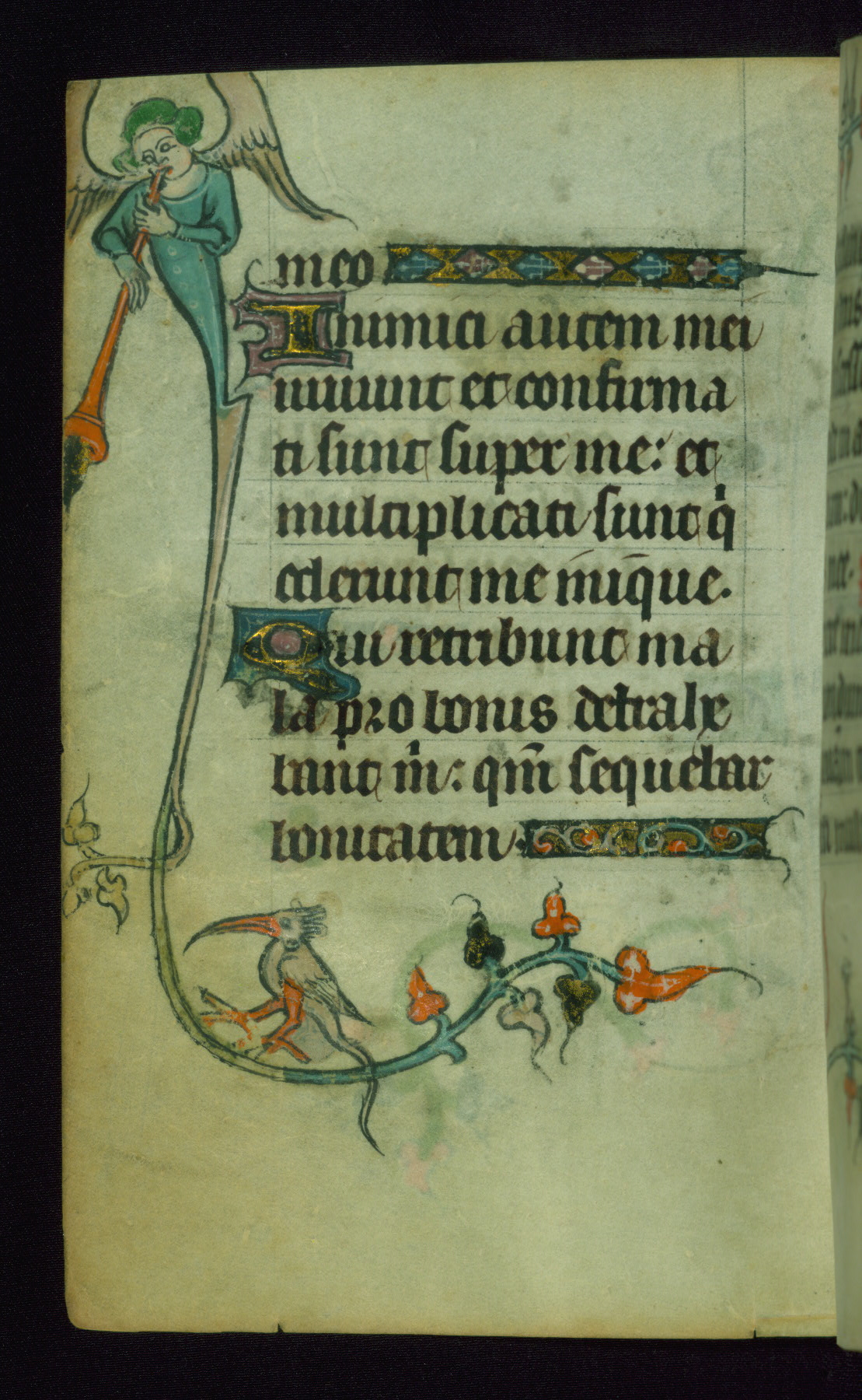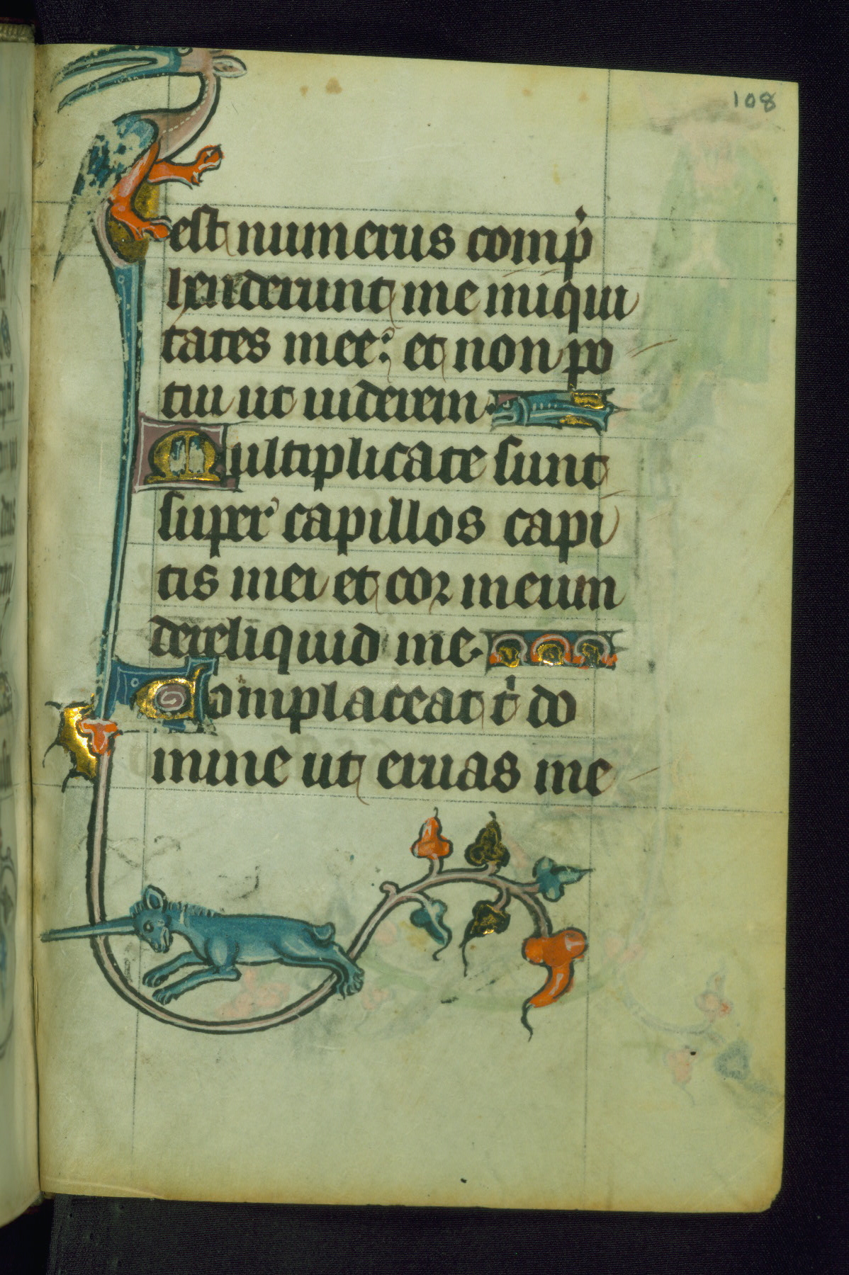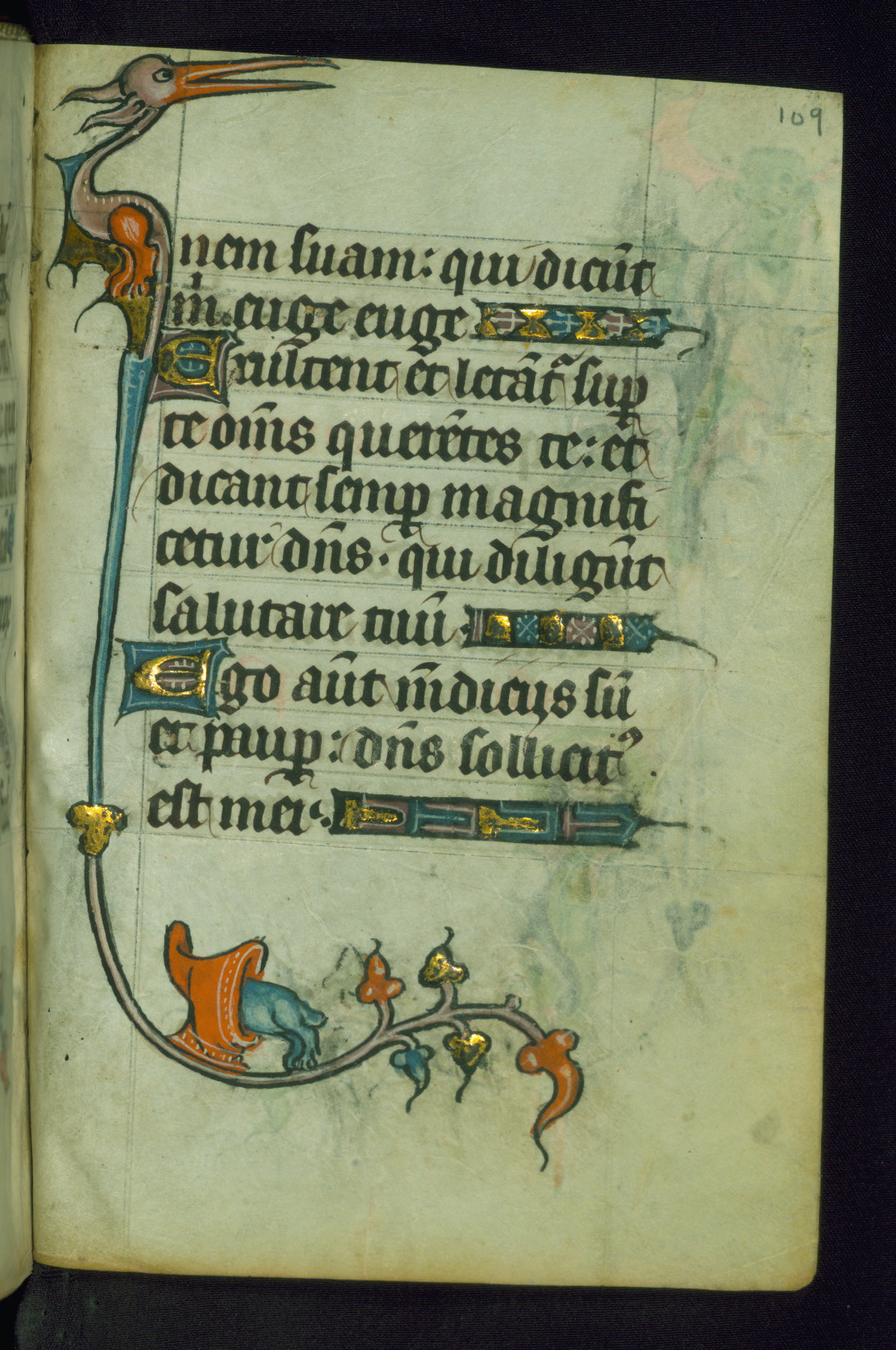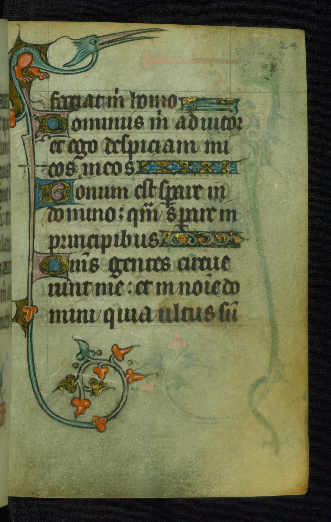 This Book of Hours was made ca. 1310-20, likely in Ghent. It was badly rebound with a sixteenth-century Flemish binding by Léon Gruel in Paris at the end of the nineteenth or early twentieth century, and the initials of Gruel and Engelmann are printed on the bookplate on the front pastedown. The manuscript lacks its calendar, and the text is incomplete and misbound. In the fourteenth century a prayer for Communion, written in French, was added at the end of the book. Initials in gold, blue and pink mark the divisions of the text. The manuscript is richly illuminated with drolleries; painted on the borders of each folio, they would have amused the reader with their playful animals, hybrids, and human figures.