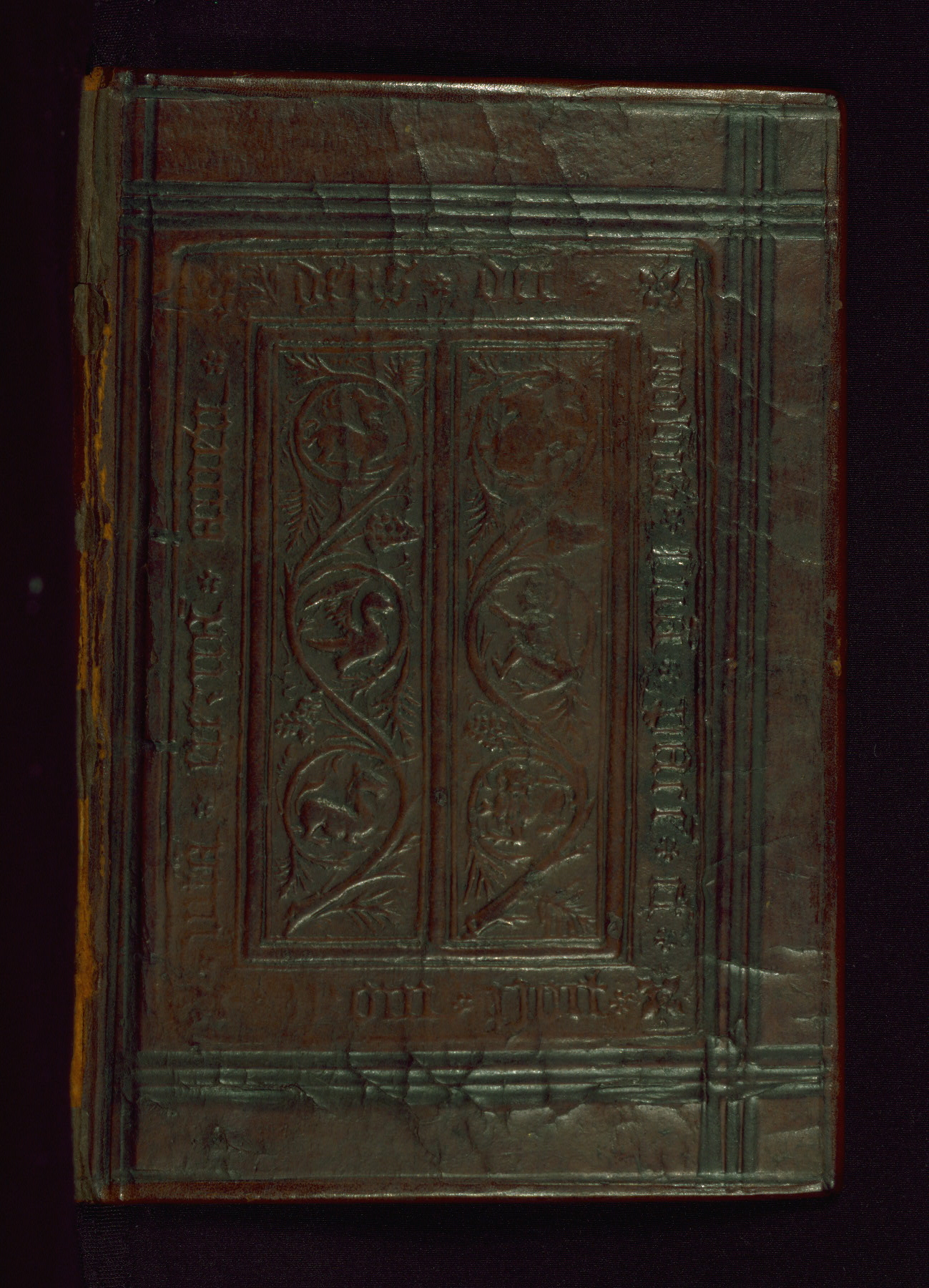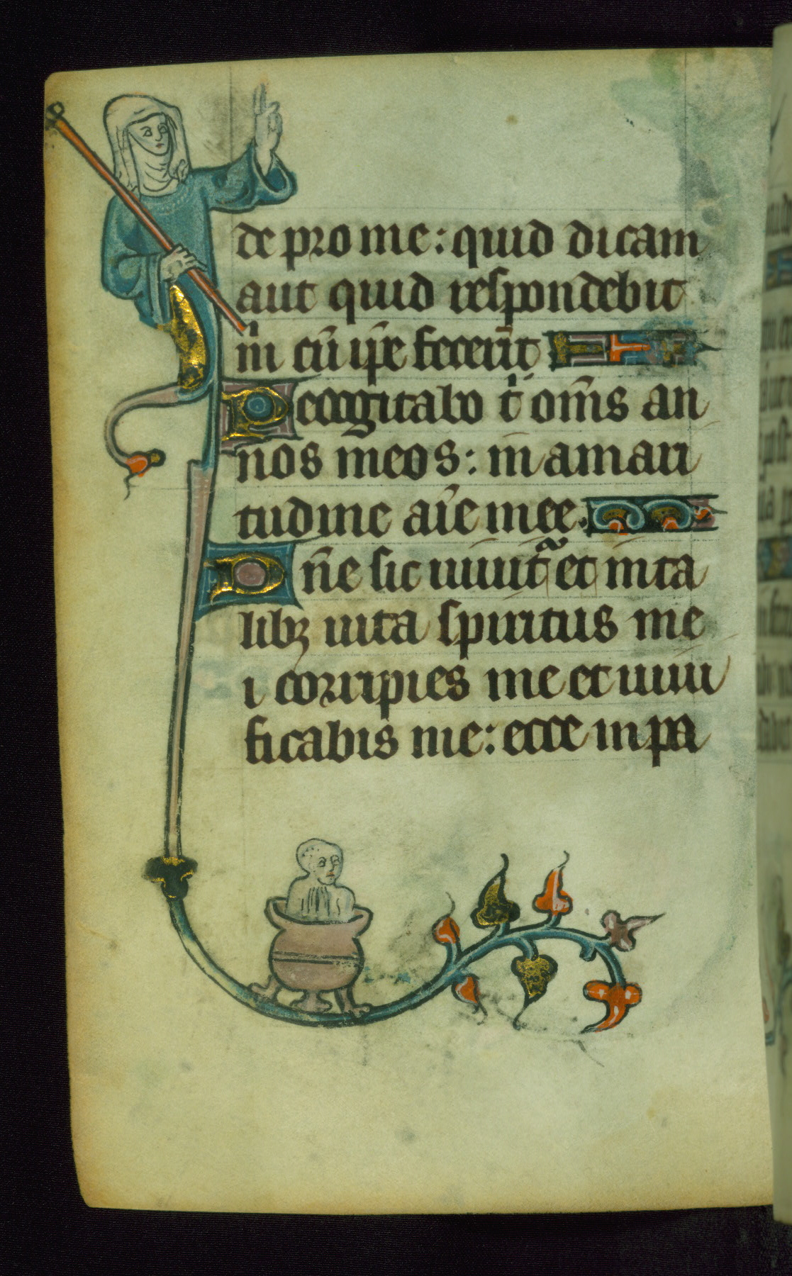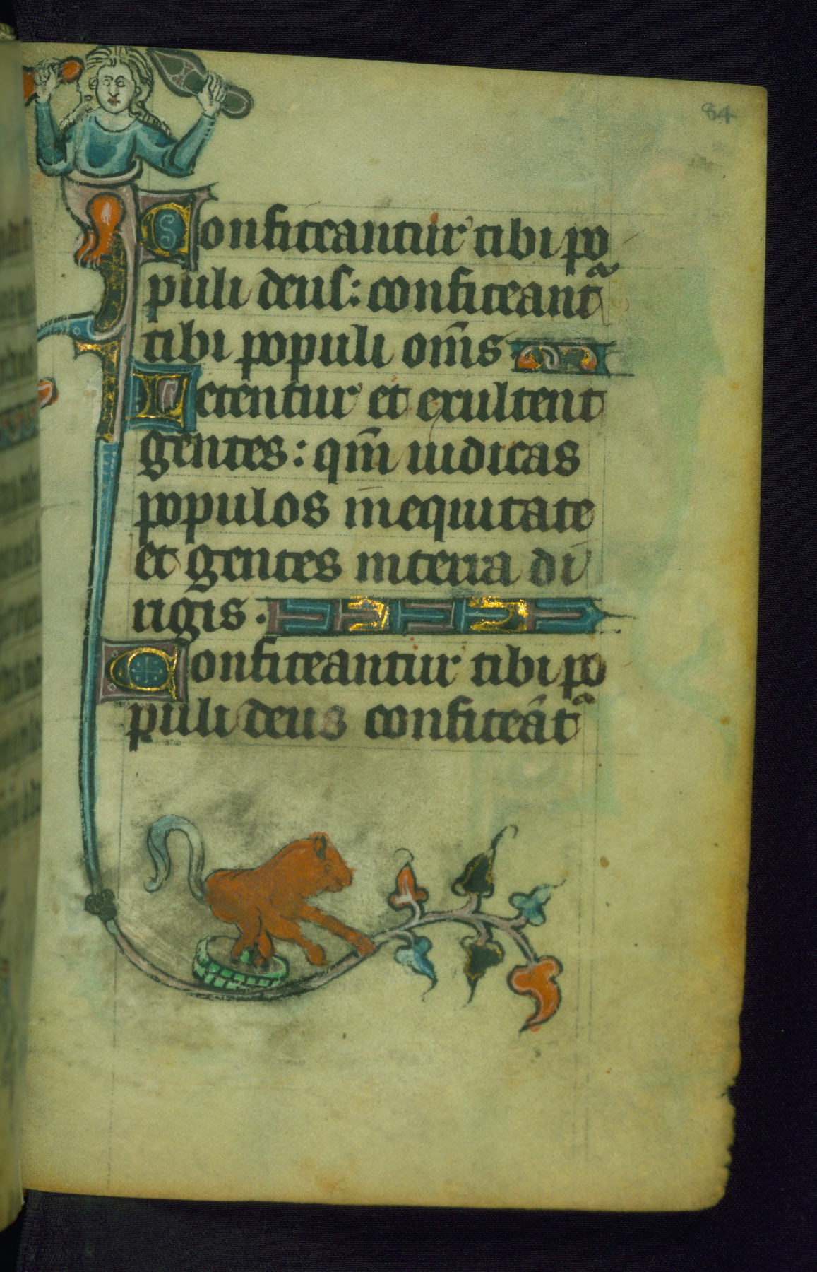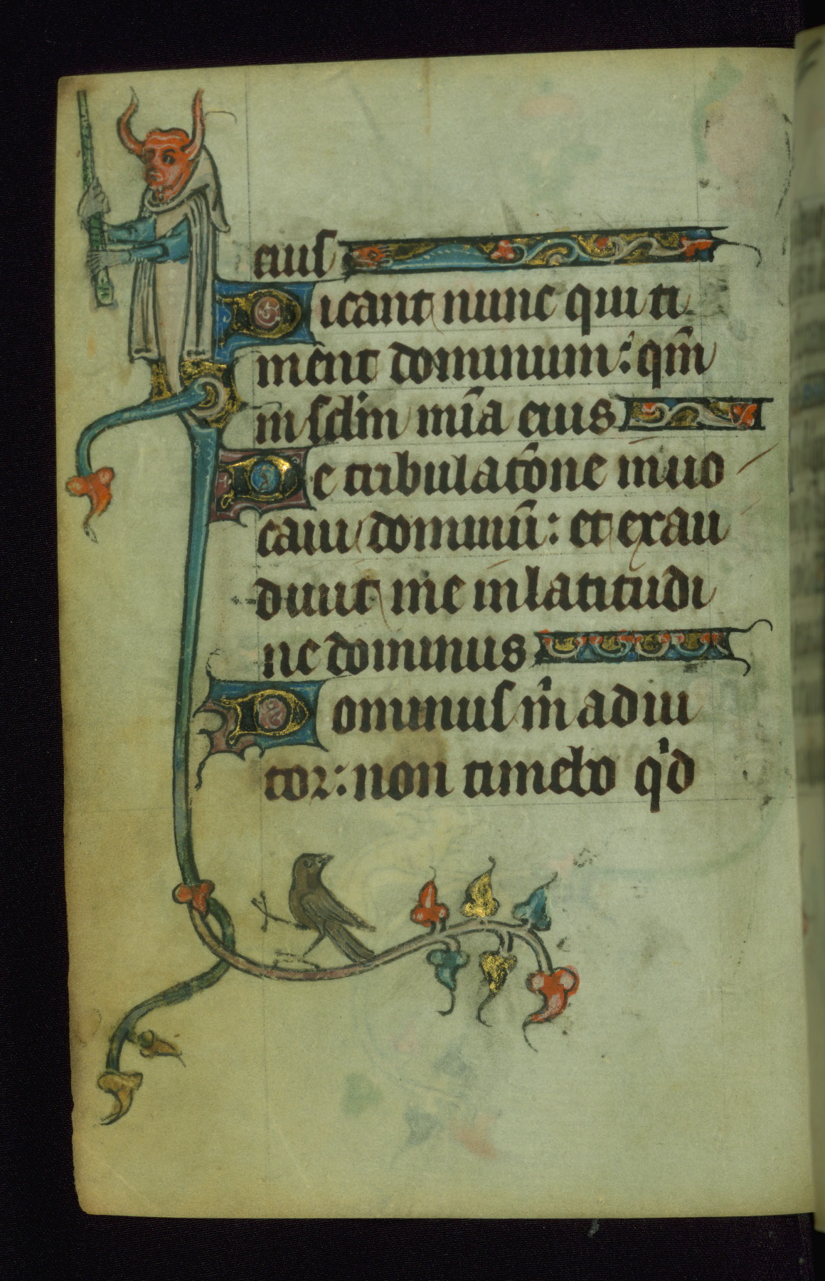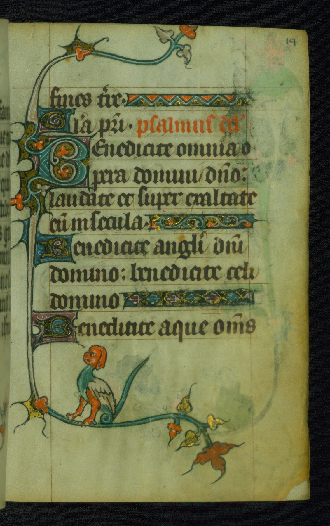 This Book of Hours was made ca. 1310-20, likely in Ghent. It was badly rebound with a sixteenth-century Flemish binding by Léon Gruel in Paris at the end of the nineteenth or early twentieth century, and the initials of Gruel and Engelmann are printed on the bookplate on the front pastedown. The manuscript lacks its calendar, and the text is incomplete and misbound. In the fourteenth century a prayer for Communion, written in French, was added at the end of the book. Initials in gold, blue and pink mark the divisions of the text. The manuscript is richly illuminated with drolleries; painted on the borders of each folio, they would have amused the reader with their playful animals, hybrids, and human figures.