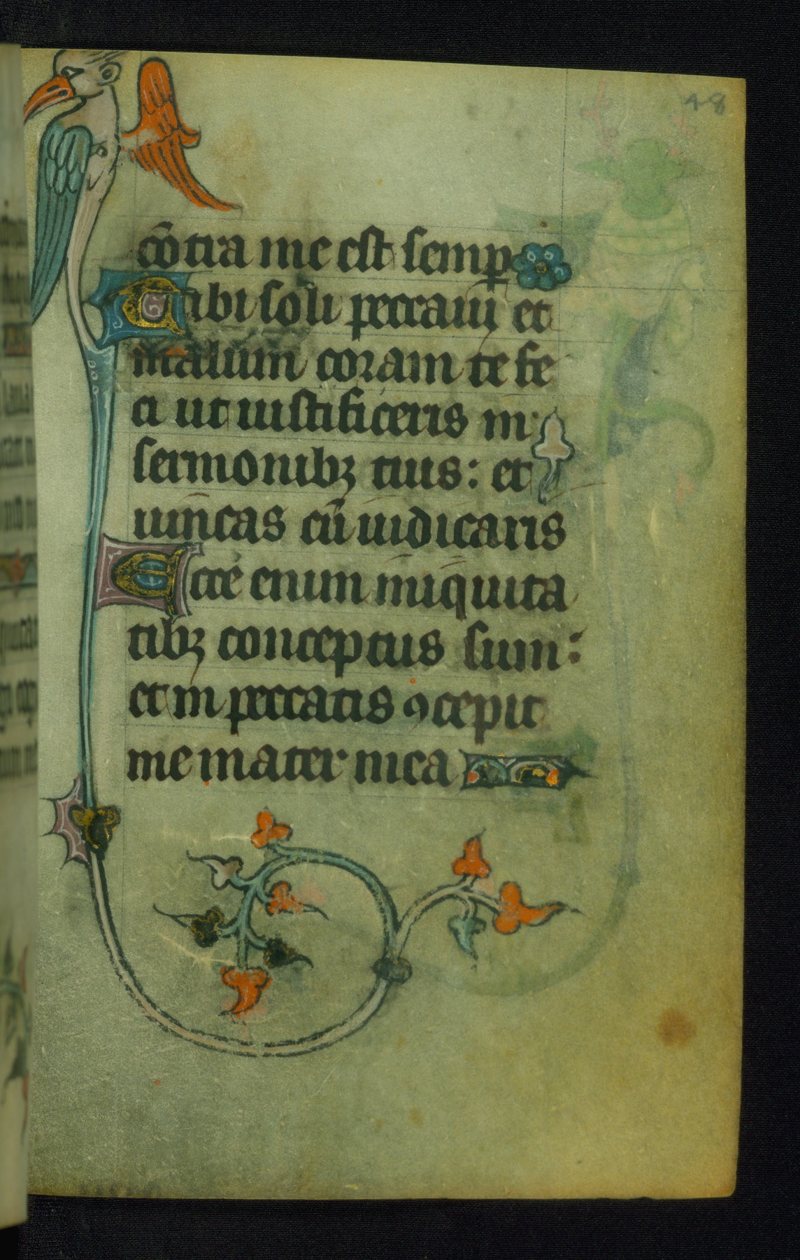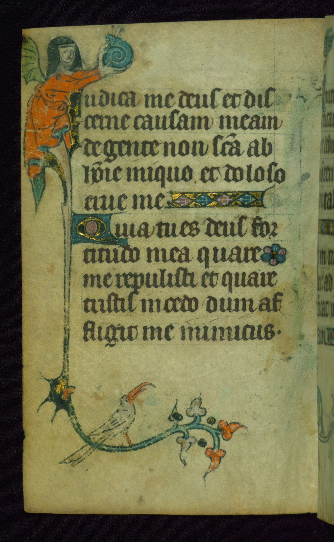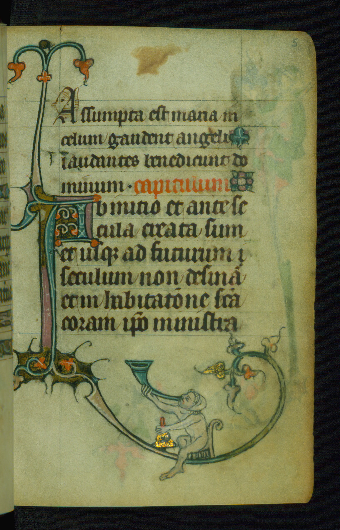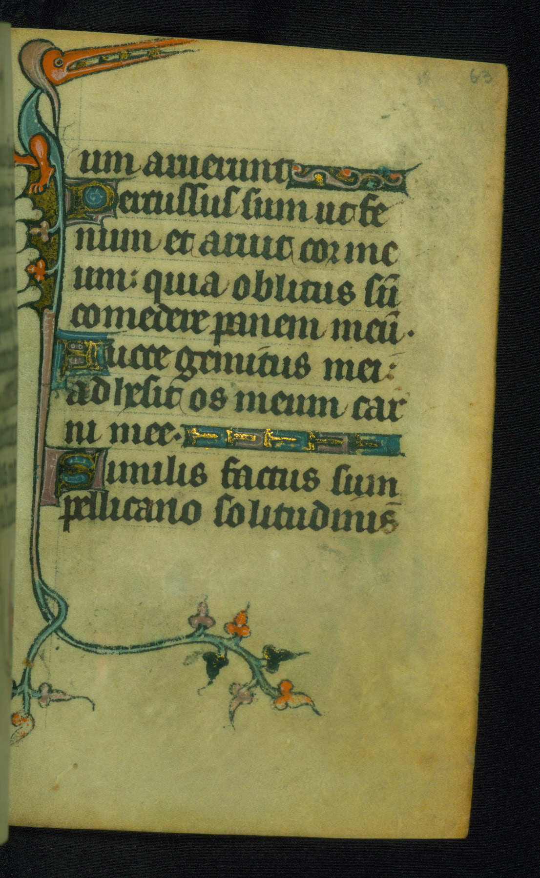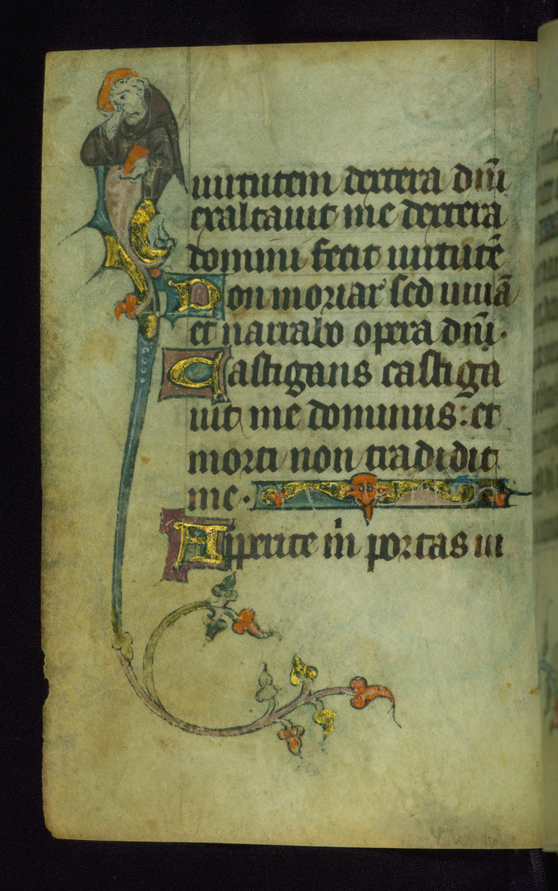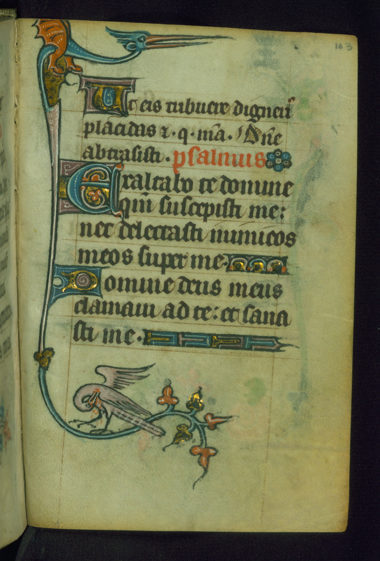 This Book of Hours was made ca. 1310-20, likely in Ghent. It was badly rebound with a sixteenth-century Flemish binding by Léon Gruel in Paris at the end of the nineteenth or early twentieth century, and the initials of Gruel and Engelmann are printed on the bookplate on the front pastedown. The manuscript lacks its calendar, and the text is incomplete and misbound. In the fourteenth century a prayer for Communion, written in French, was added at the end of the book. Initials in gold, blue and pink mark the divisions of the text. The manuscript is richly illuminated with drolleries; painted on the borders of each folio, they would have amused the reader with their playful animals, hybrids, and human figures.