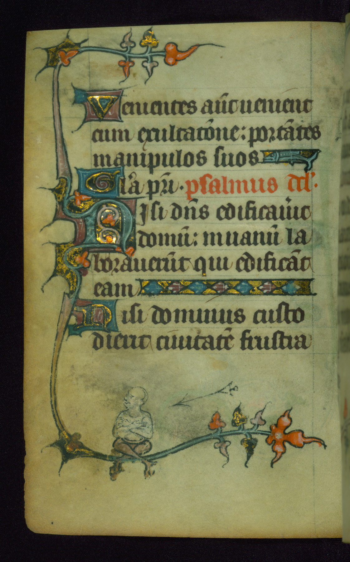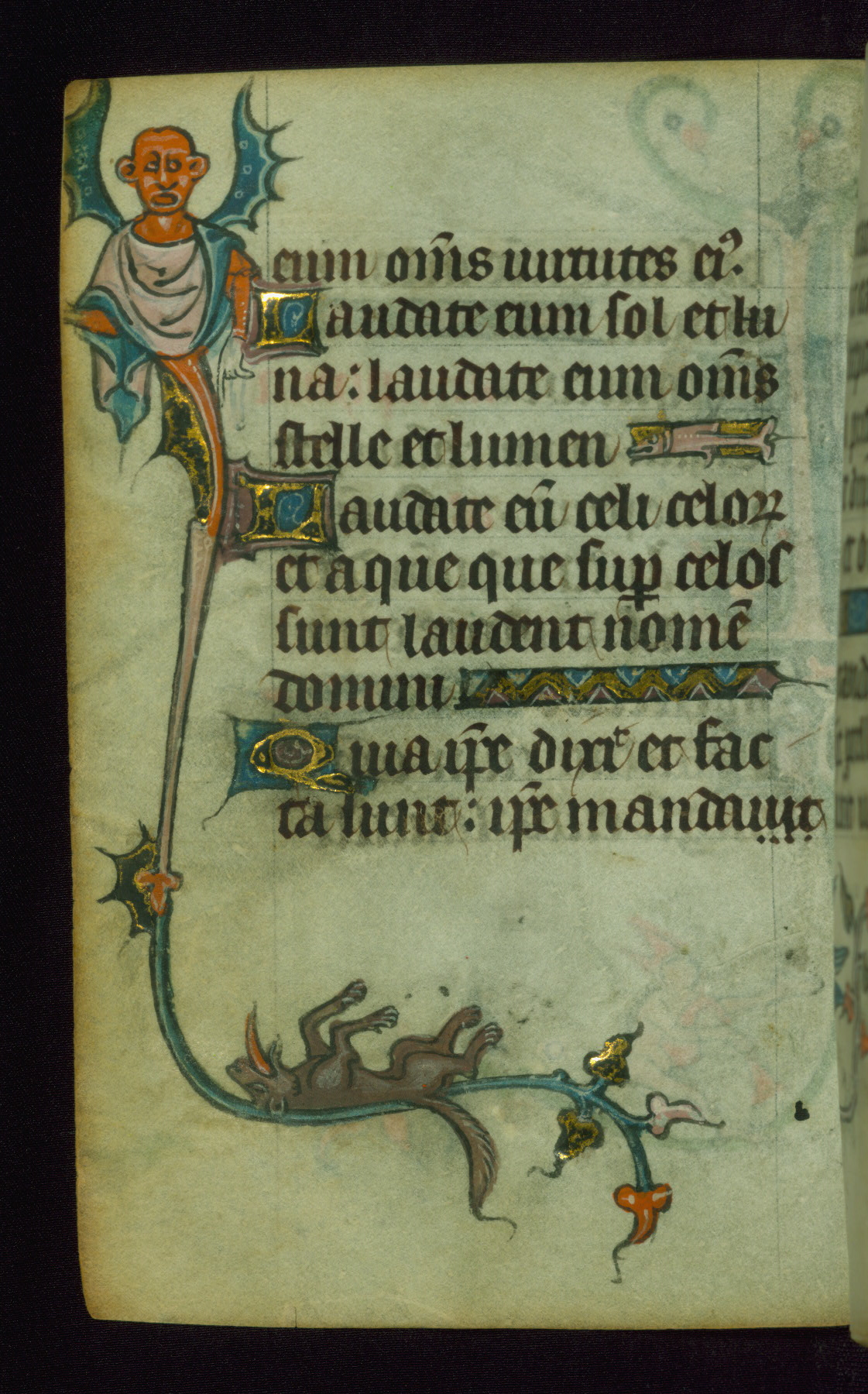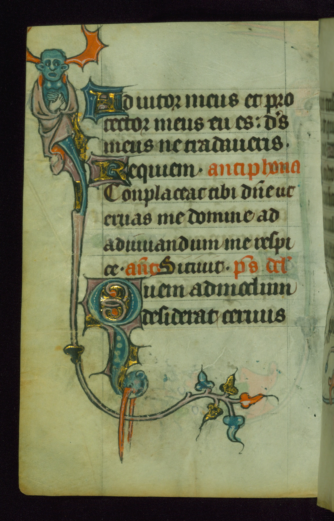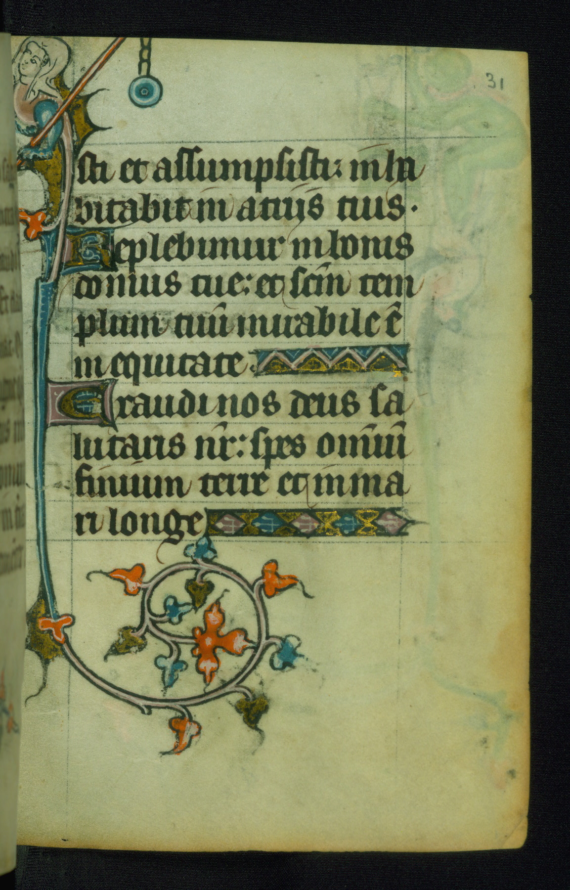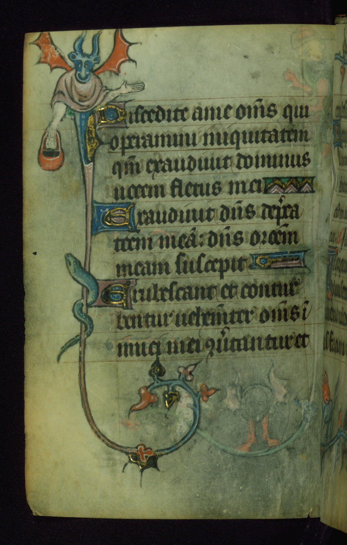 This Book of Hours was made ca. 1310-20, likely in Ghent. It was badly rebound with a sixteenth-century Flemish binding by Léon Gruel in Paris at the end of the nineteenth or early twentieth century, and the initials of Gruel and Engelmann are printed on the bookplate on the front pastedown. The manuscript lacks its calendar, and the text is incomplete and misbound. In the fourteenth century a prayer for Communion, written in French, was added at the end of the book. Initials in gold, blue and pink mark the divisions of the text. The manuscript is richly illuminated with drolleries; painted on the borders of each folio, they would have amused the reader with their playful animals, hybrids, and human figures.