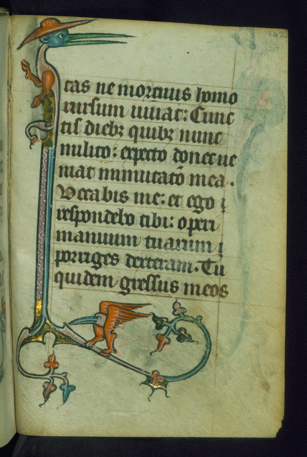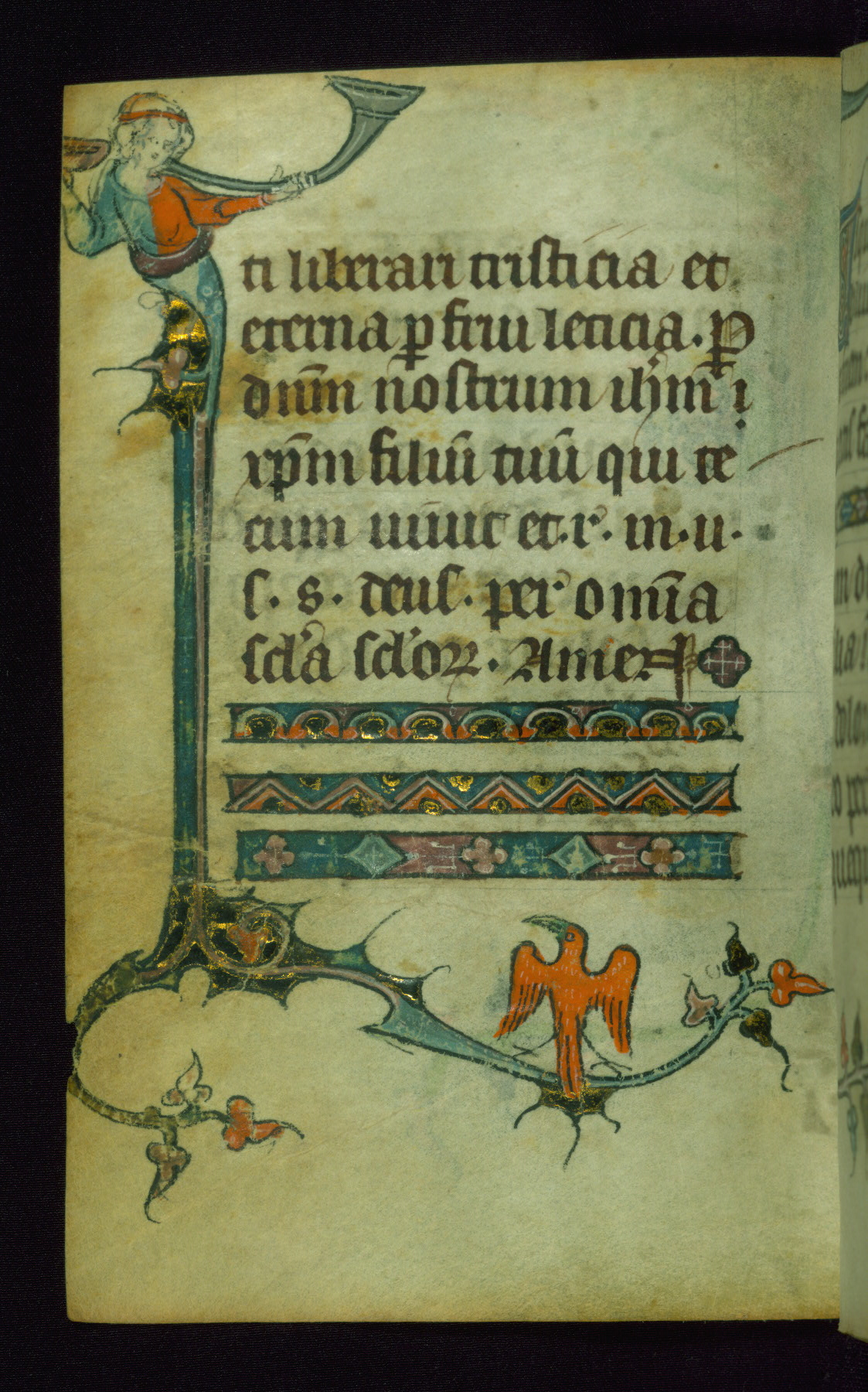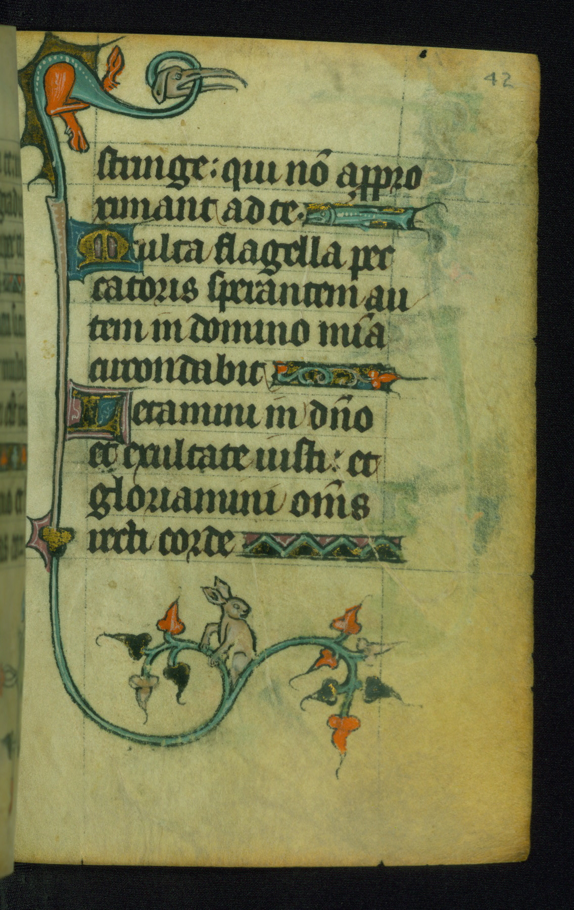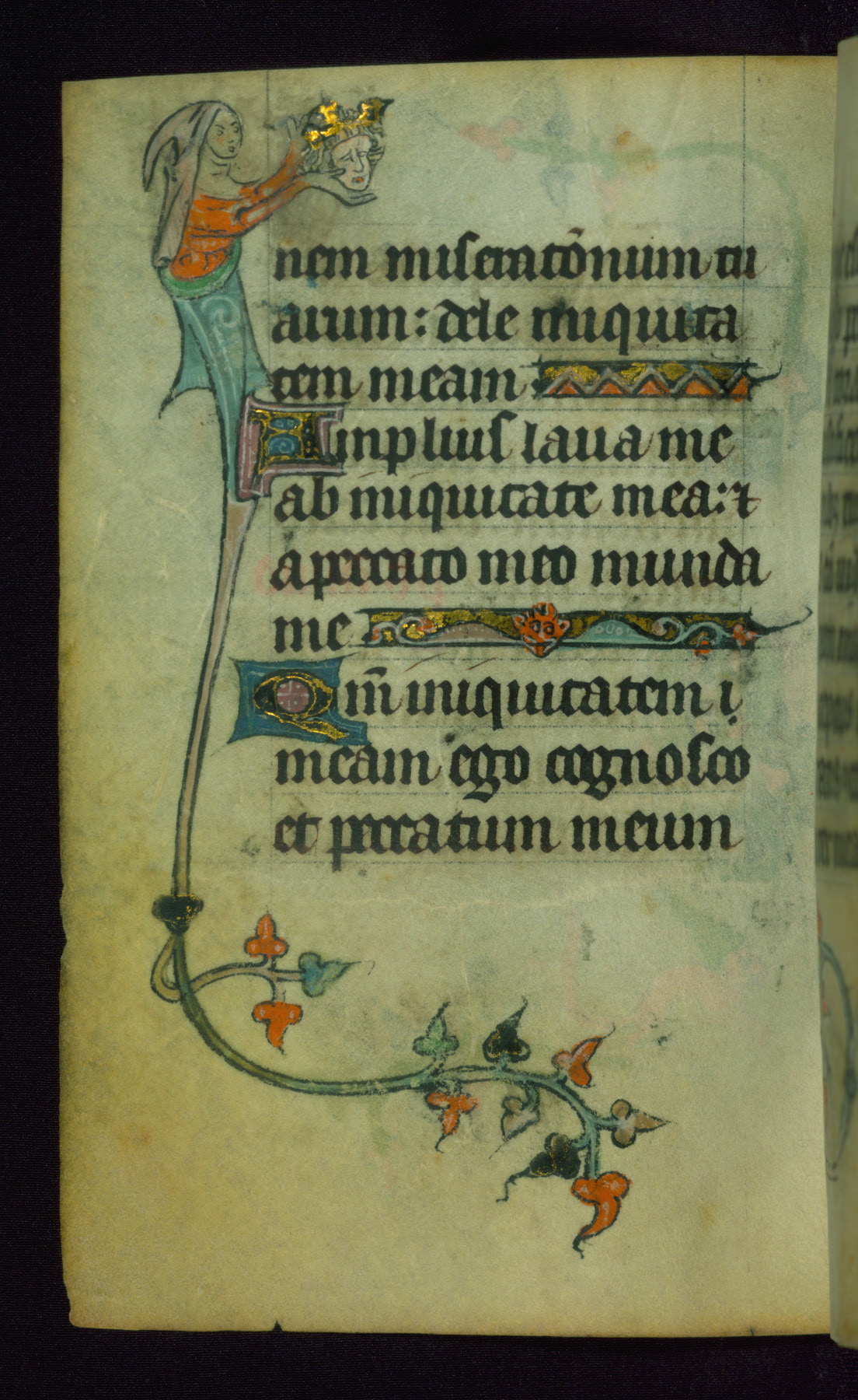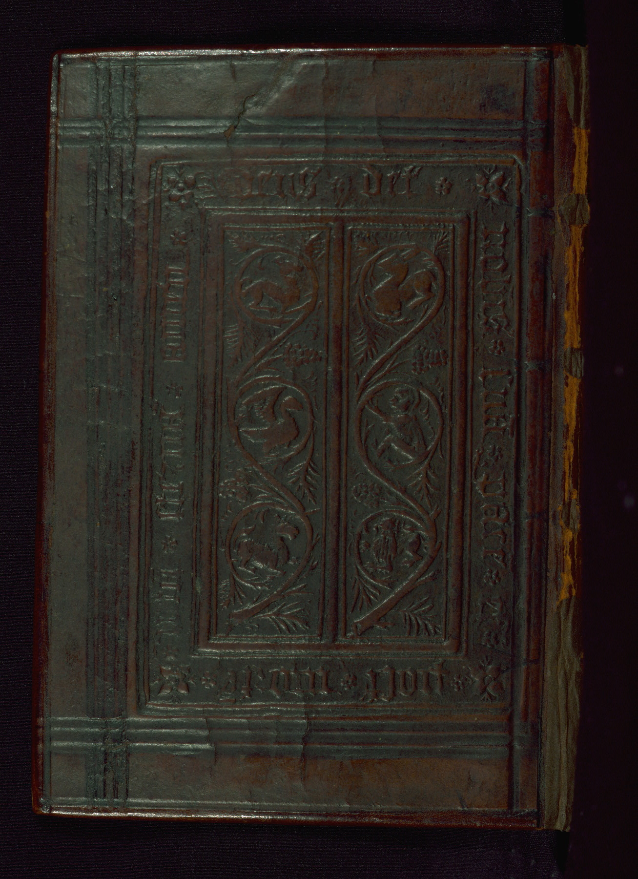 This Book of Hours was made ca. 1310-20, likely in Ghent. It was badly rebound with a sixteenth-century Flemish binding by Léon Gruel in Paris at the end of the nineteenth or early twentieth century, and the initials of Gruel and Engelmann are printed on the bookplate on the front pastedown. The manuscript lacks its calendar, and the text is incomplete and misbound. In the fourteenth century a prayer for Communion, written in French, was added at the end of the book. Initials in gold, blue and pink mark the divisions of the text. The manuscript is richly illuminated with drolleries; painted on the borders of each folio, they would have amused the reader with their playful animals, hybrids, and human figures.