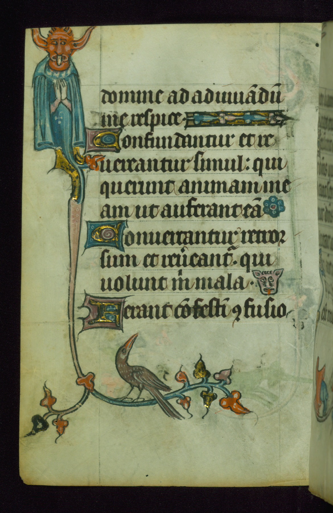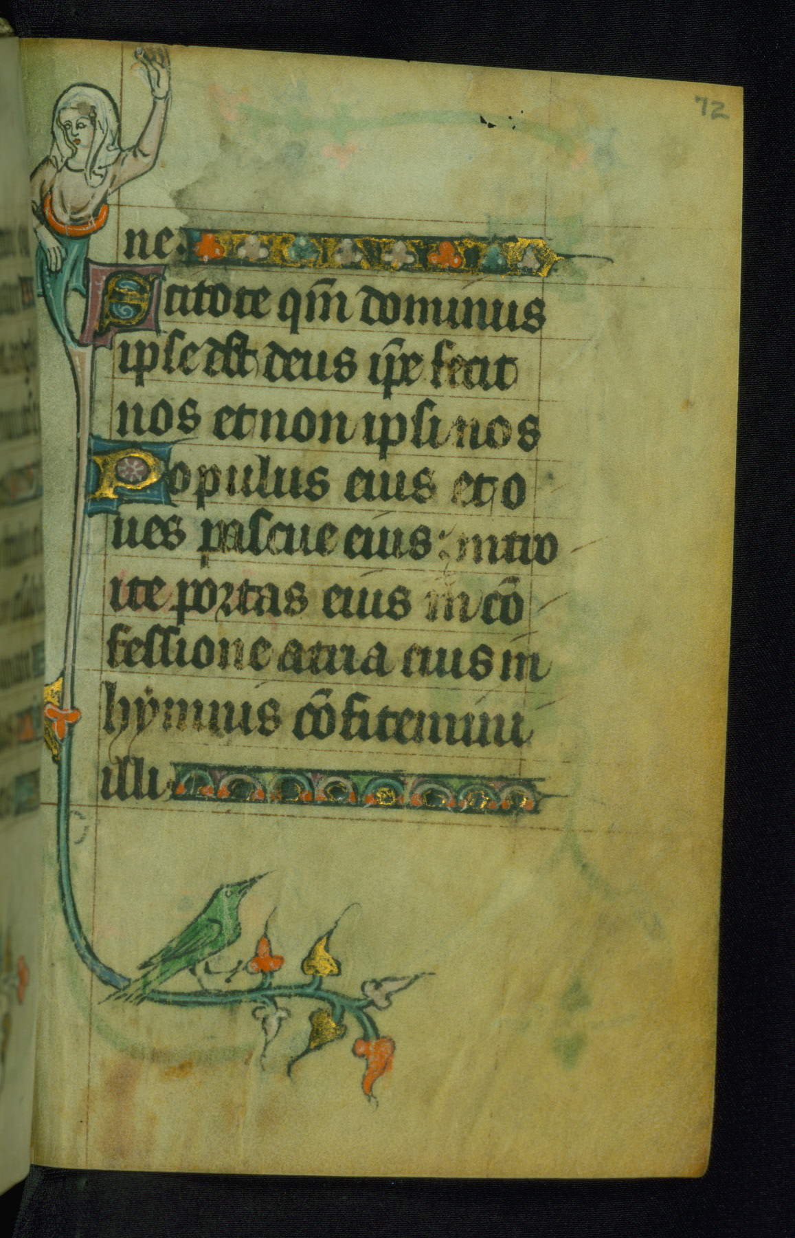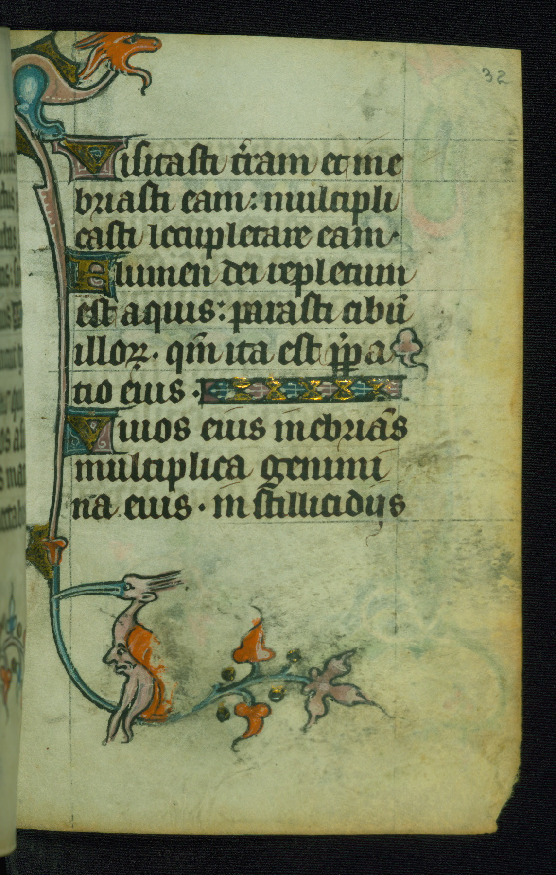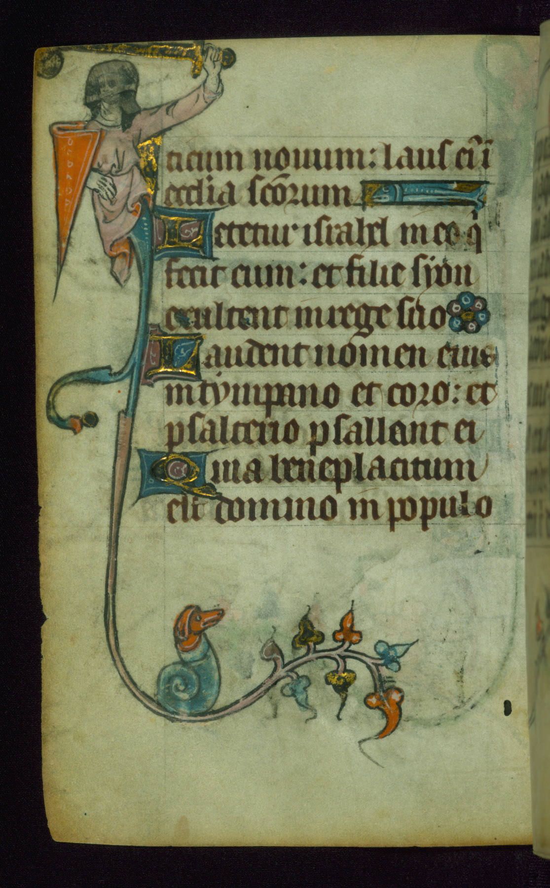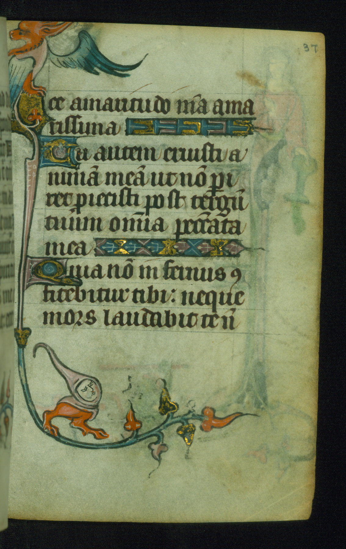 This Book of Hours was made ca. 1310-20, likely in Ghent. It was badly rebound with a sixteenth-century Flemish binding by Léon Gruel in Paris at the end of the nineteenth or early twentieth century, and the initials of Gruel and Engelmann are printed on the bookplate on the front pastedown. The manuscript lacks its calendar, and the text is incomplete and misbound. In the fourteenth century a prayer for Communion, written in French, was added at the end of the book. Initials in gold, blue and pink mark the divisions of the text. The manuscript is richly illuminated with drolleries; painted on the borders of each folio, they would have amused the reader with their playful animals, hybrids, and human figures.