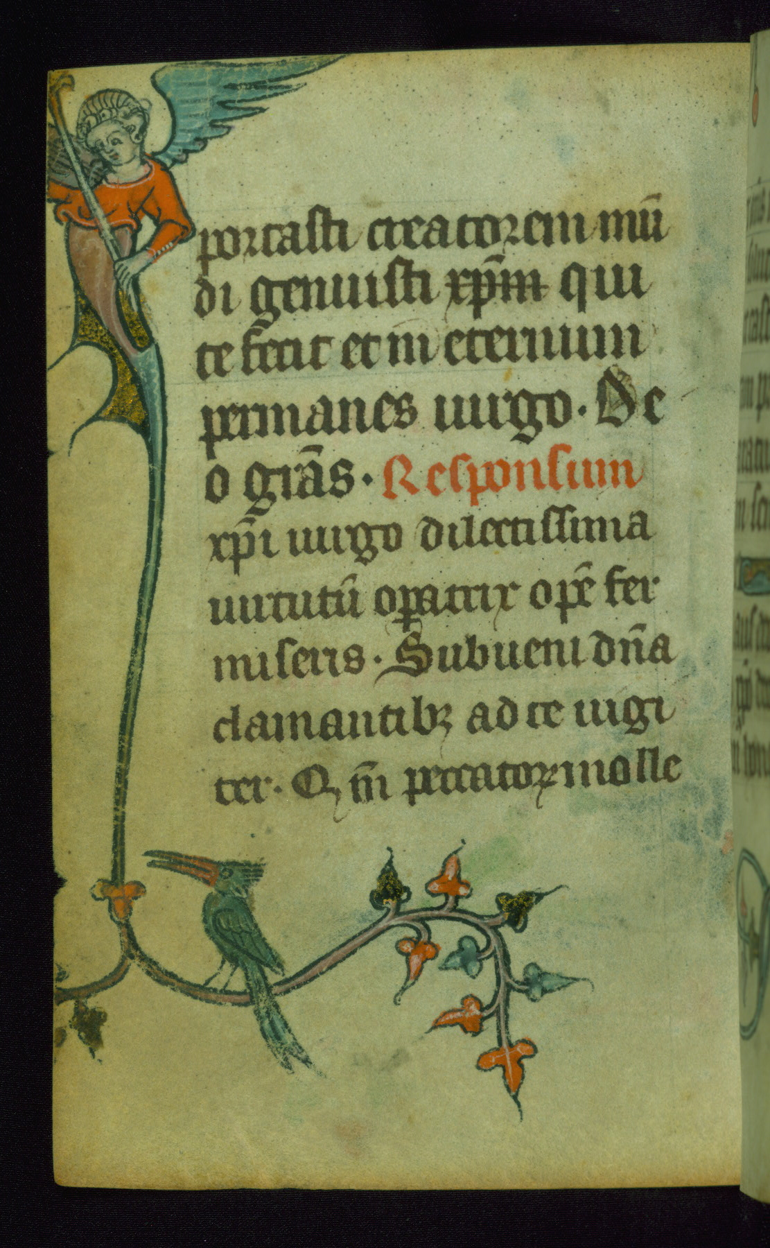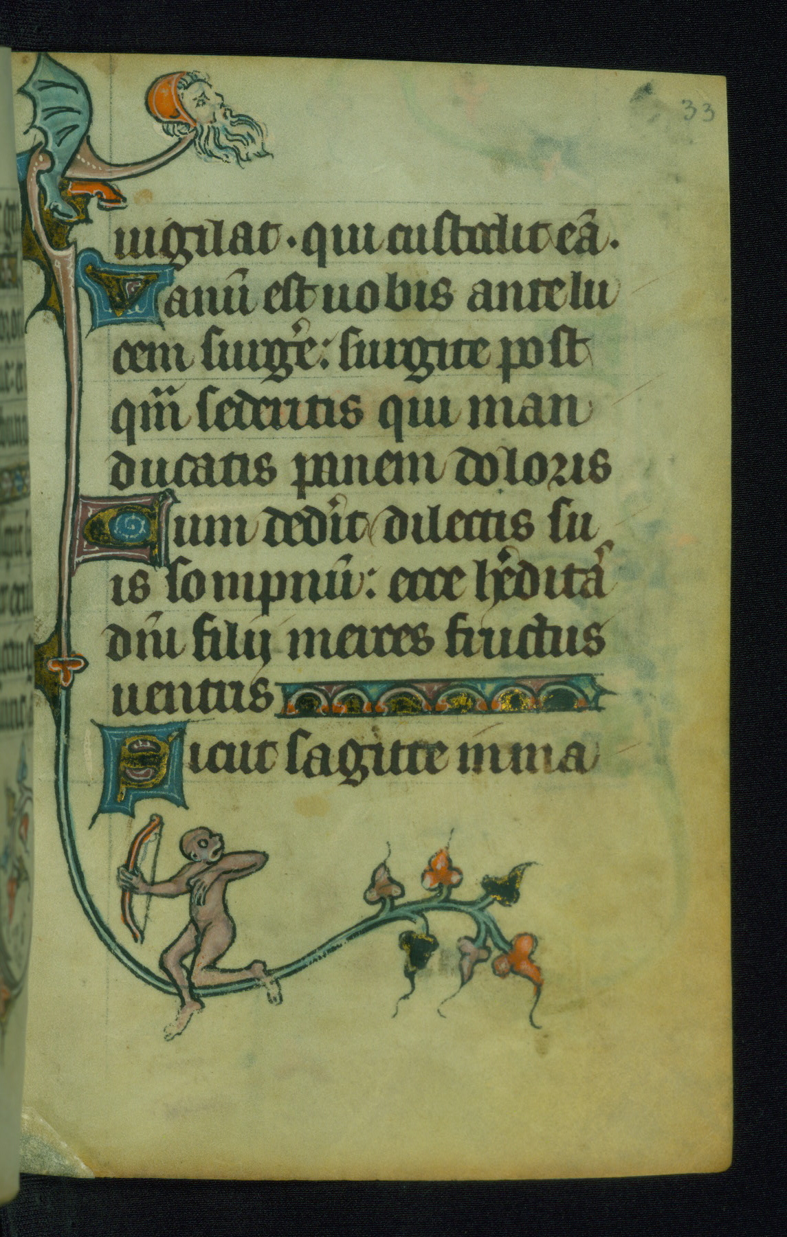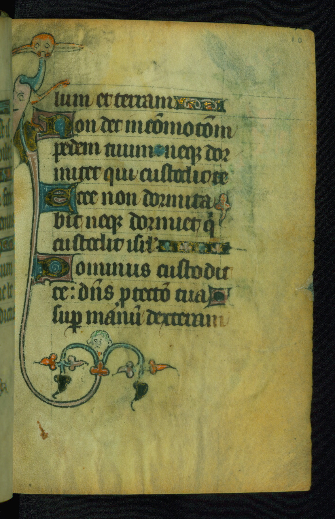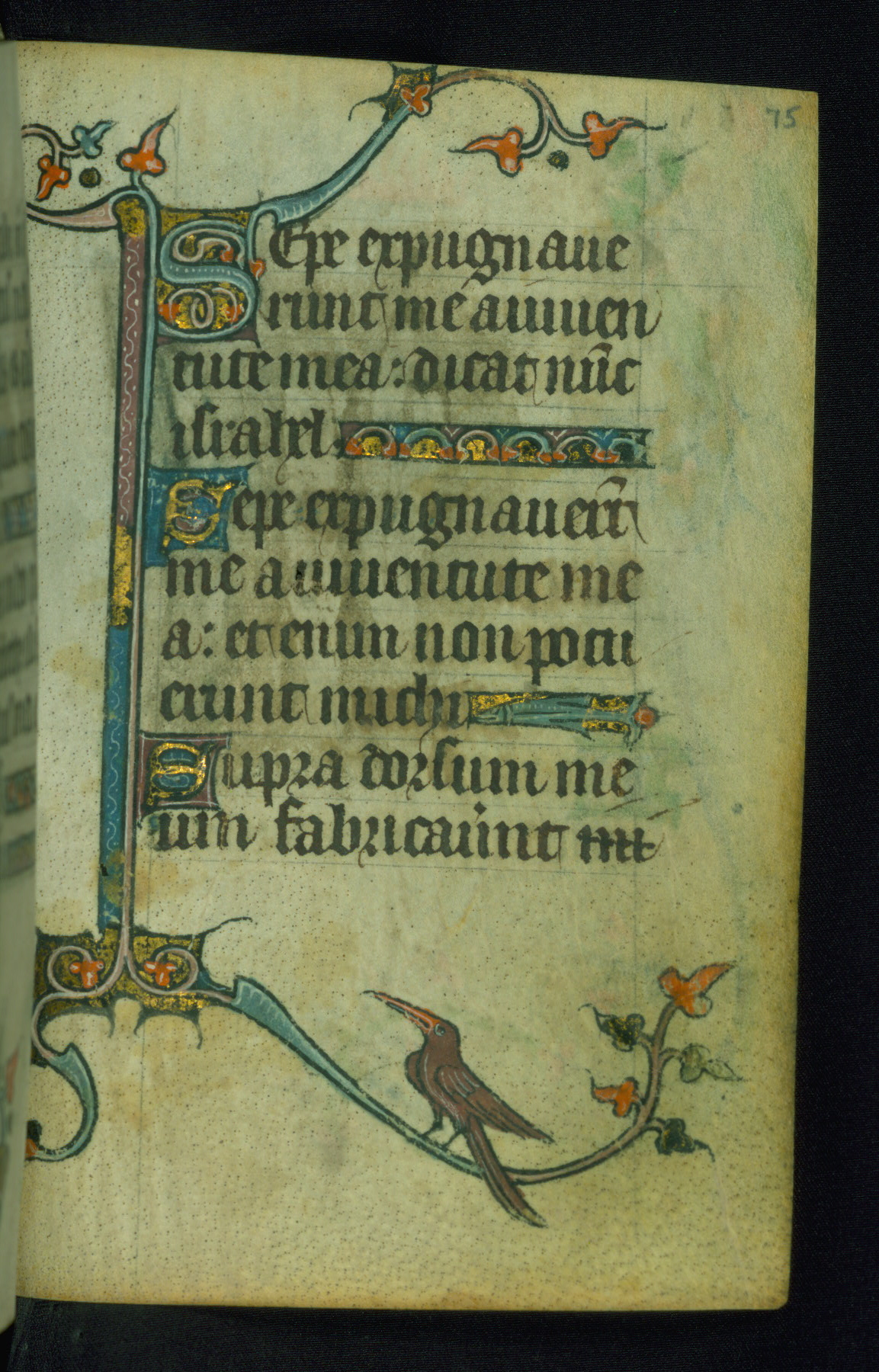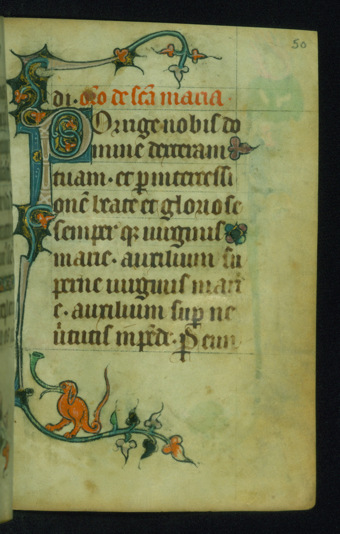 This Book of Hours was made ca. 1310-20, likely in Ghent. It was badly rebound with a sixteenth-century Flemish binding by Léon Gruel in Paris at the end of the nineteenth or early twentieth century, and the initials of Gruel and Engelmann are printed on the bookplate on the front pastedown. The manuscript lacks its calendar, and the text is incomplete and misbound. In the fourteenth century a prayer for Communion, written in French, was added at the end of the book. Initials in gold, blue and pink mark the divisions of the text. The manuscript is richly illuminated with drolleries; painted on the borders of each folio, they would have amused the reader with their playful animals, hybrids, and human figures.
