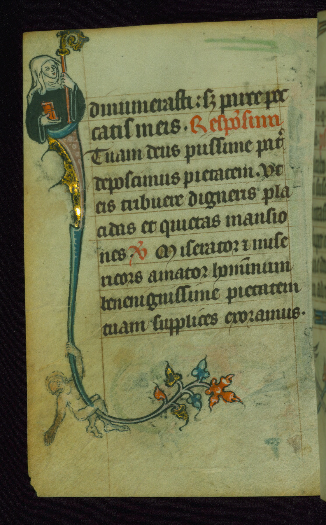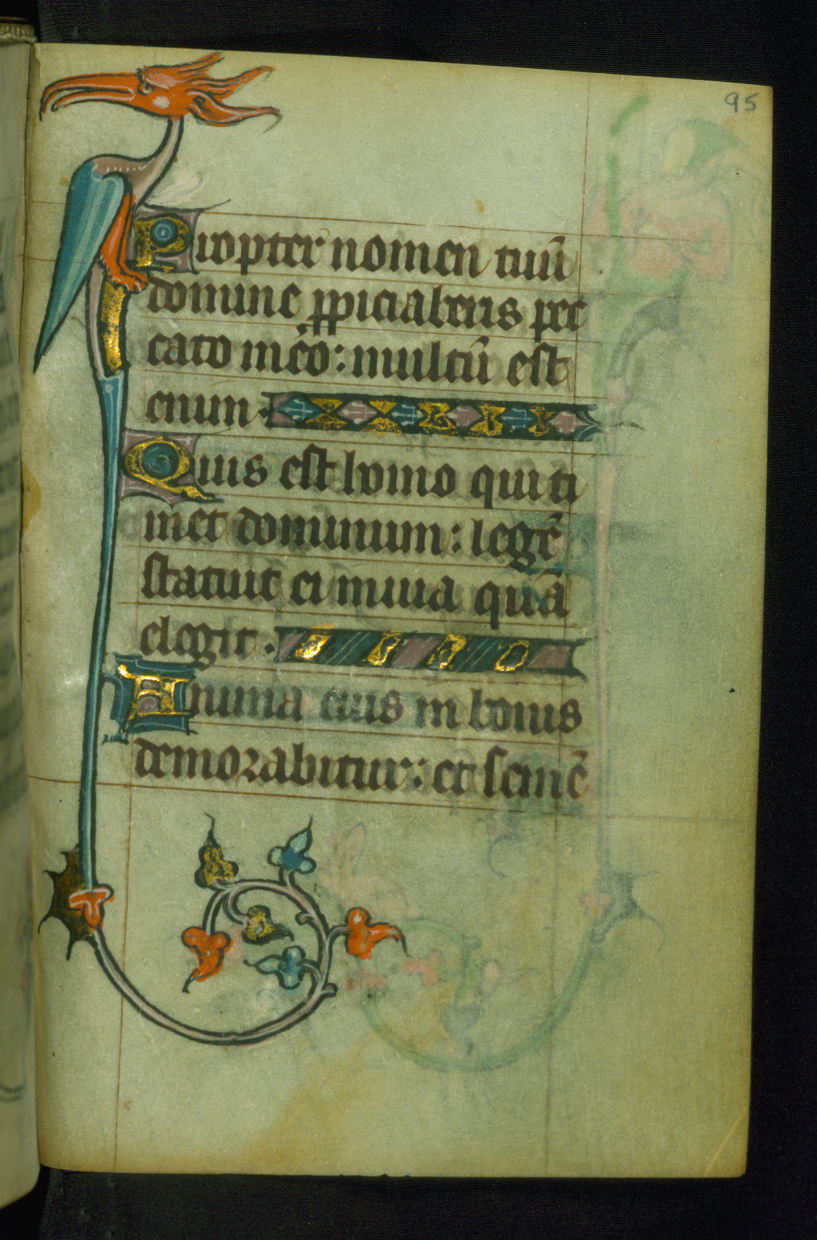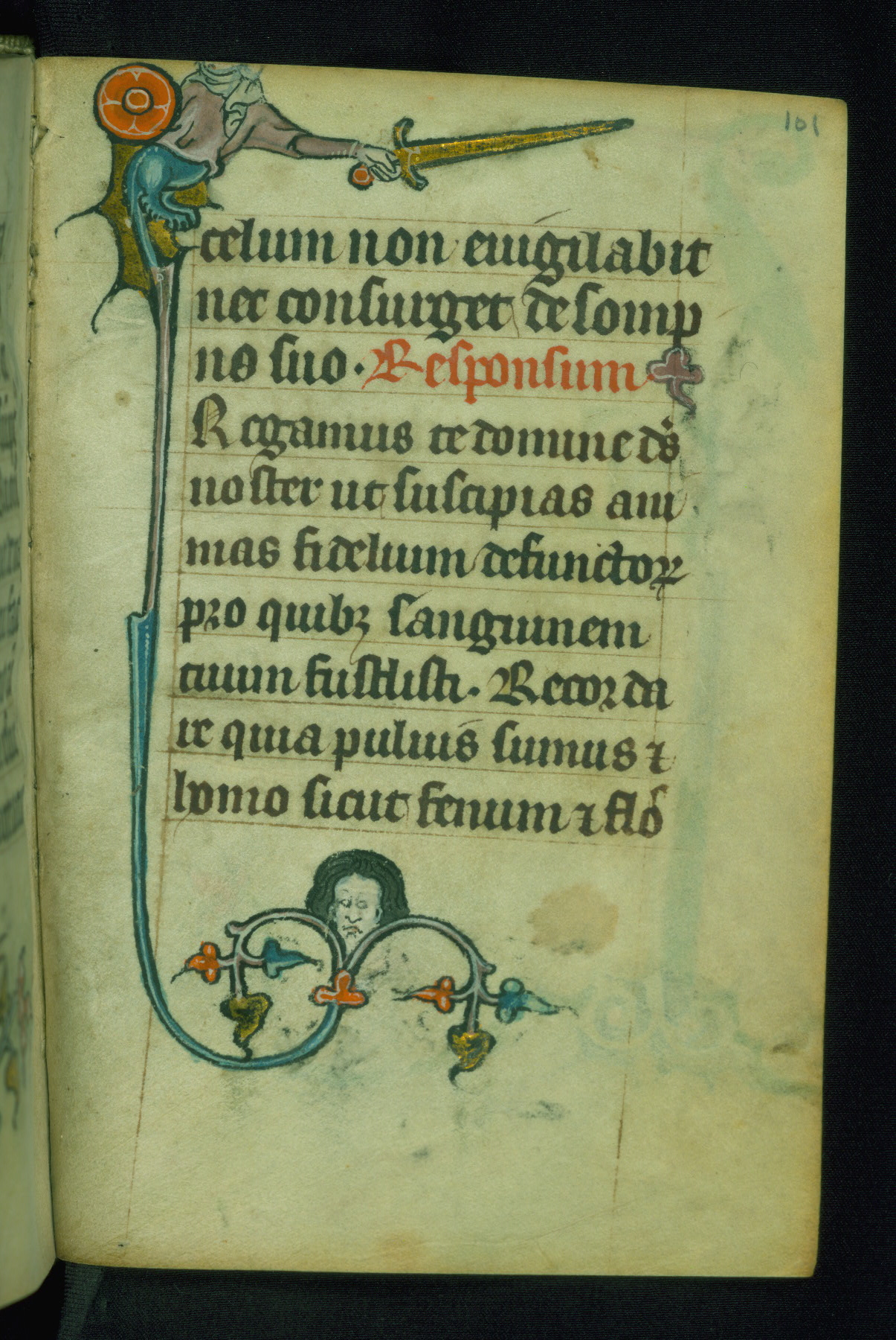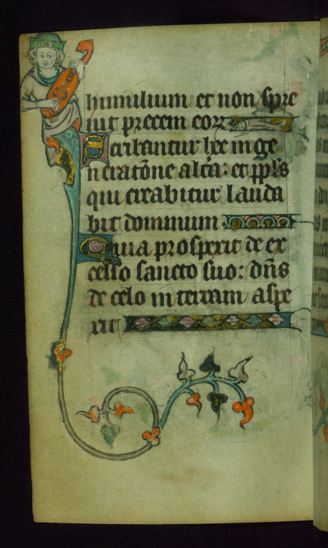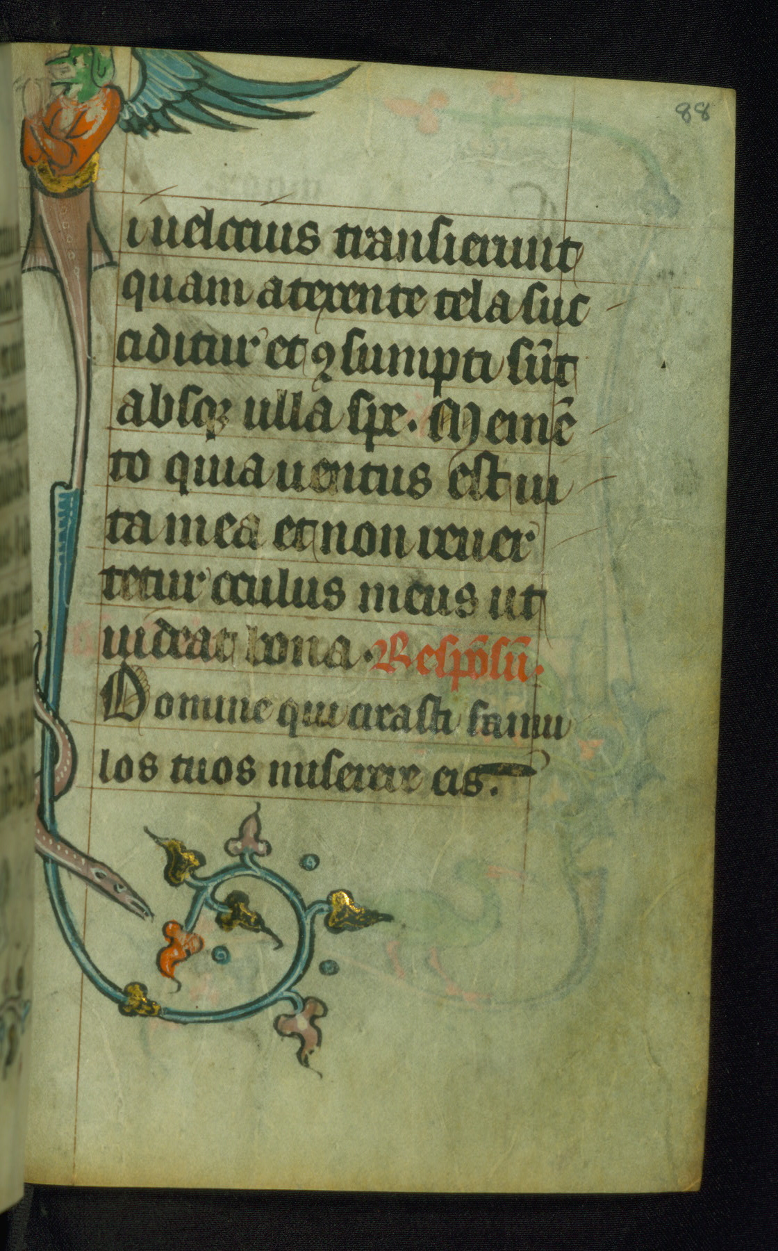 This Book of Hours was made ca. 1310-20, likely in Ghent. It was badly rebound with a sixteenth-century Flemish binding by Léon Gruel in Paris at the end of the nineteenth or early twentieth century, and the initials of Gruel and Engelmann are printed on the bookplate on the front pastedown. The manuscript lacks its calendar, and the text is incomplete and misbound. In the fourteenth century a prayer for Communion, written in French, was added at the end of the book. Initials in gold, blue and pink mark the divisions of the text. The manuscript is richly illuminated with drolleries; painted on the borders of each folio, they would have amused the reader with their playful animals, hybrids, and human figures.