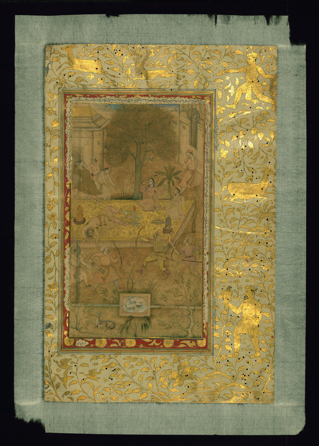 This leaf depicting the scene of a fatal quarrel over a prostitute comes from a manuscript of Akbarnāmah (a biography of the Mughal Emperor Akbar [r. 963 AH / 1556 CE -- 1014 AH / 1605 CE]) by his prime minster Abū al- Faz̤l ibn Mubārak (d. 1011 AH / 1602 CE). It was produced in Mughal India at the end of the tenth century AH / sixteenth CE. The work is pasted (like W.684) on a leaf from Farhang-i Jahāngīrī (a Persian-language dictionary) by Jamāl al-Dīn Ḥusayn Injū Shīrāzī (d. 1035 AH / 1625-6 CE). The text is written in black nastaʿlīq script with lemmata in red.
