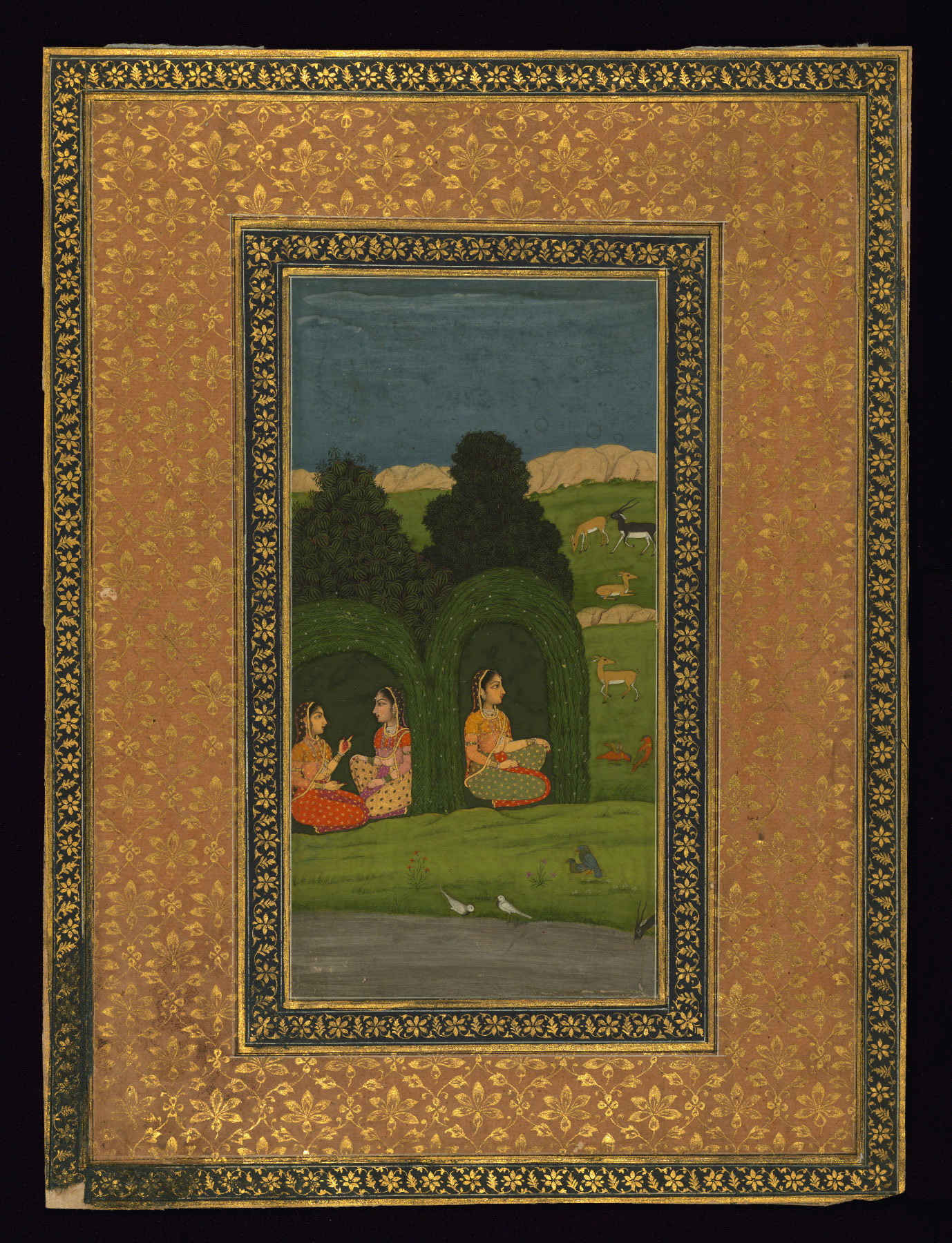 This painting, dating to the twelfth century AH / eighteenth CE, depicts three women seated within two leafy bowers. The Nayaka (female lover or heroine) sits alone, while her two female companions, known as sakhis, converse in the other bower. The painting may represent Utka nayaka, a classification for heroines who are awaiting or yearning for their lovers. Often, they are shown on a bed of flowers or leaves that they have prepared in expectation of meeting their lovers. In the landscape are animals engaged in various activities. An outcrop of rocks in the distance forms a horizon, above which is a blue sky streaked with light gray or white washes to suggest a thin layer of high clouds.