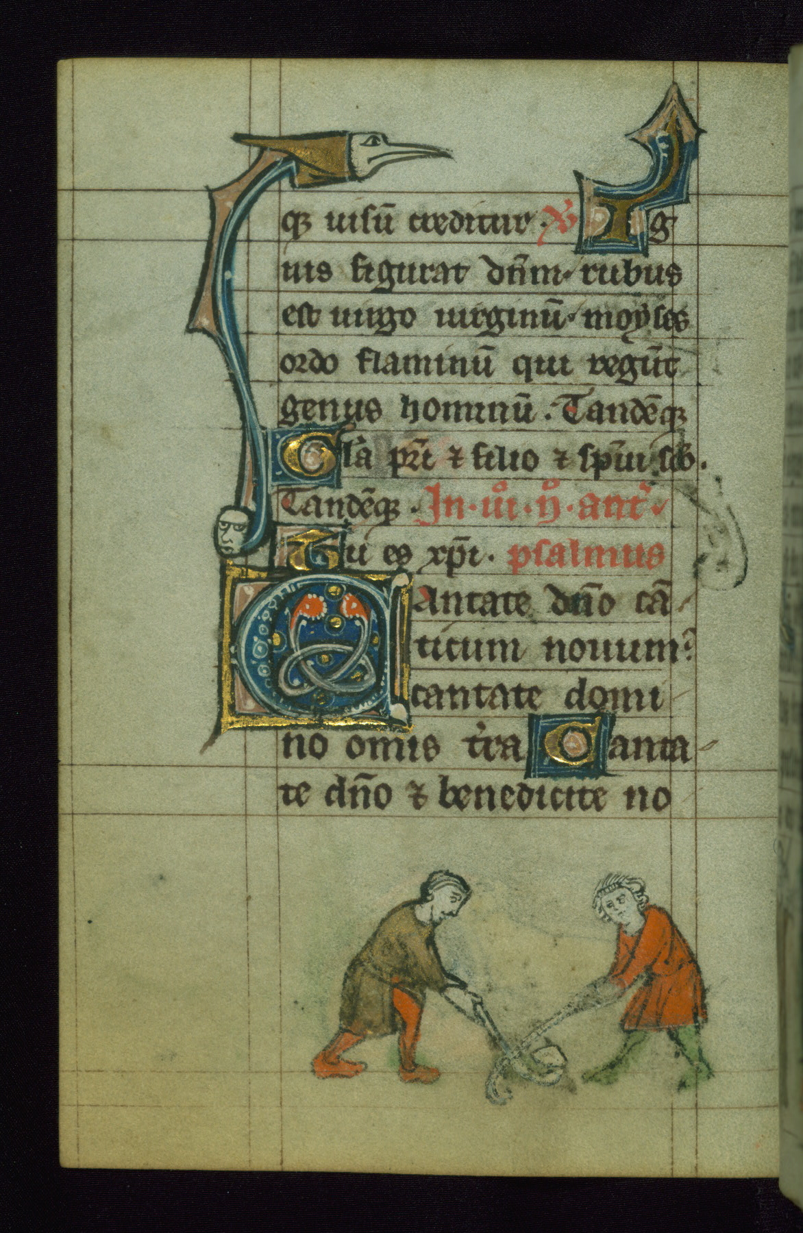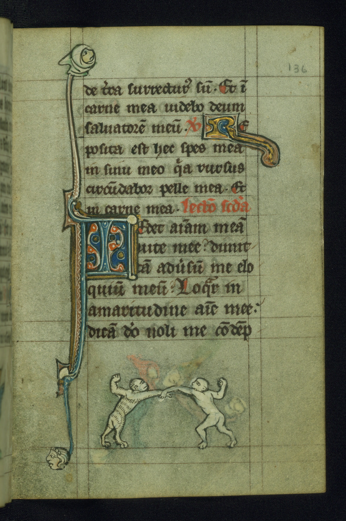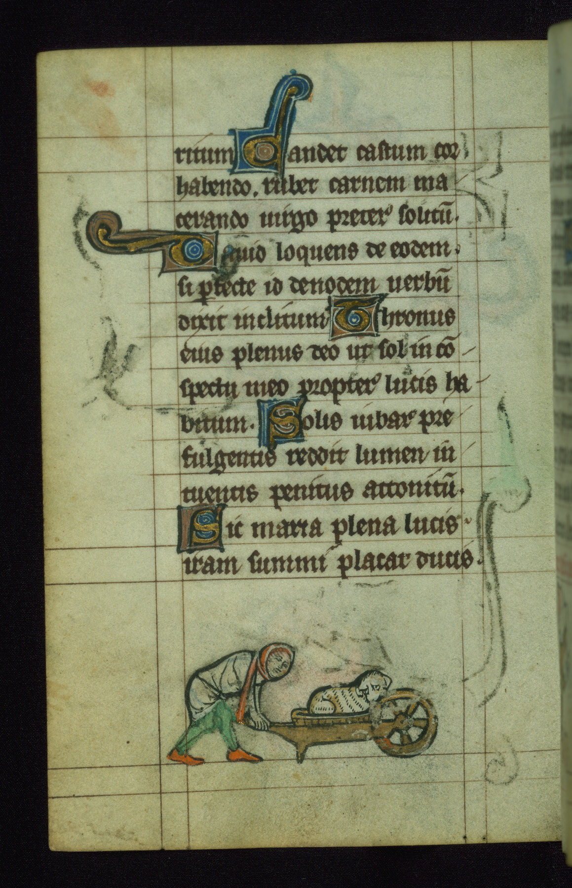 - Decoration note: One full-page initial; larger initials (3 lines) and smaller initials (1 line) for major and minor divisions of the text, respectively; drolleries throughout
