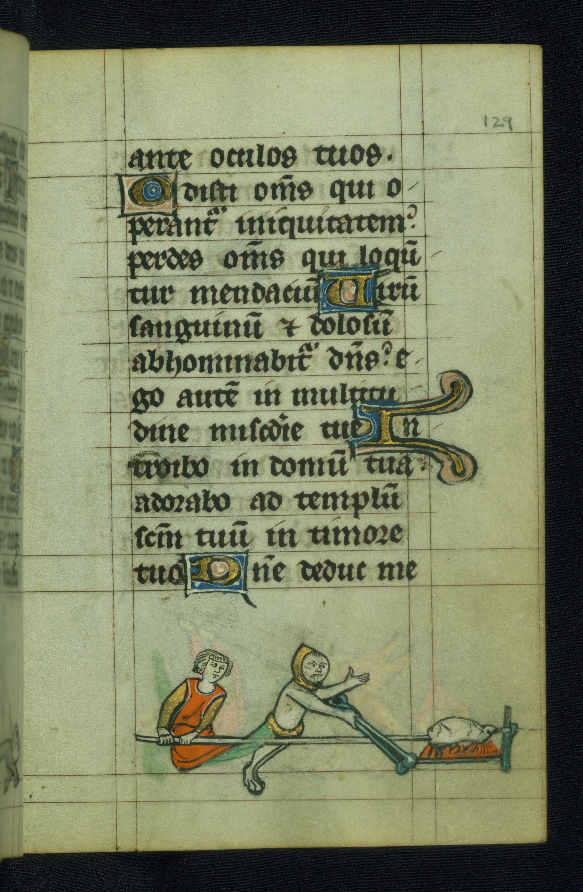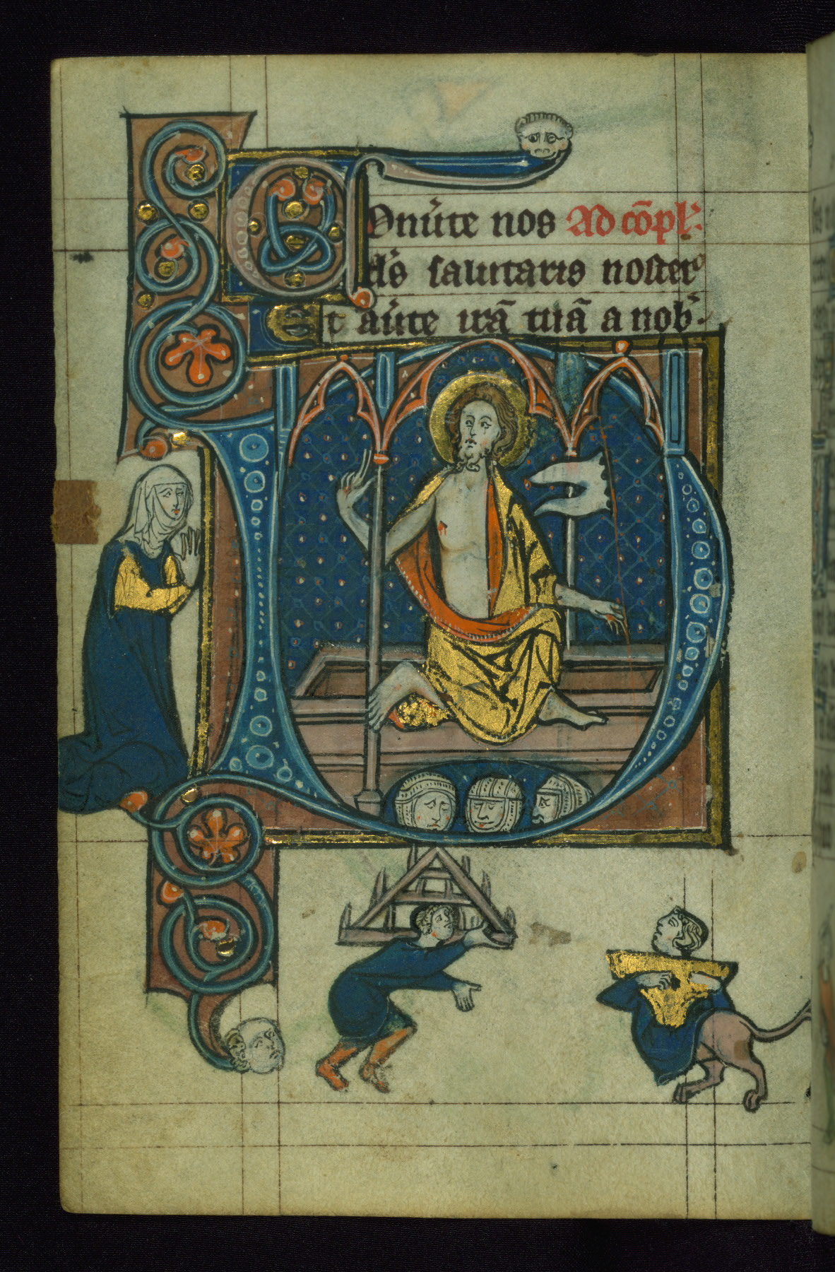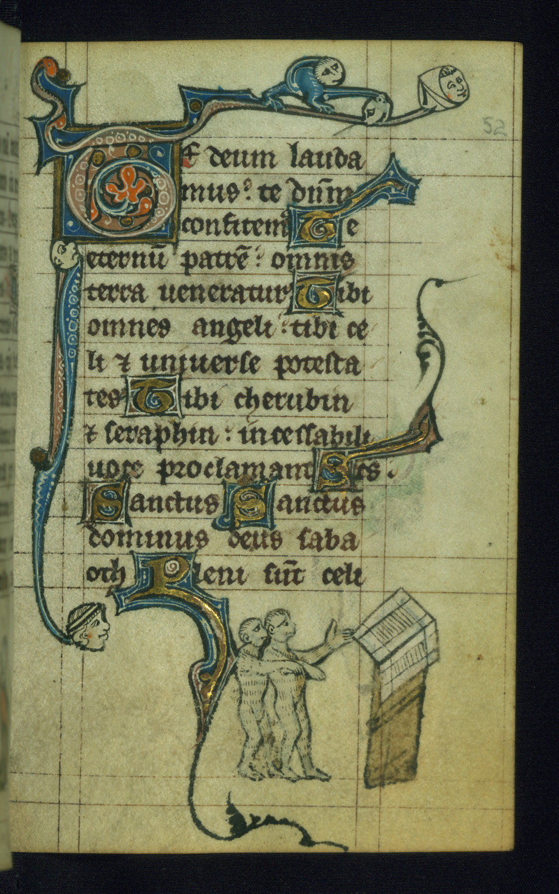 - Decoration note: One full-page initial; larger initials (3 lines) and smaller initials (1 line) for major and minor divisions of the text, respectively; drolleries throughout