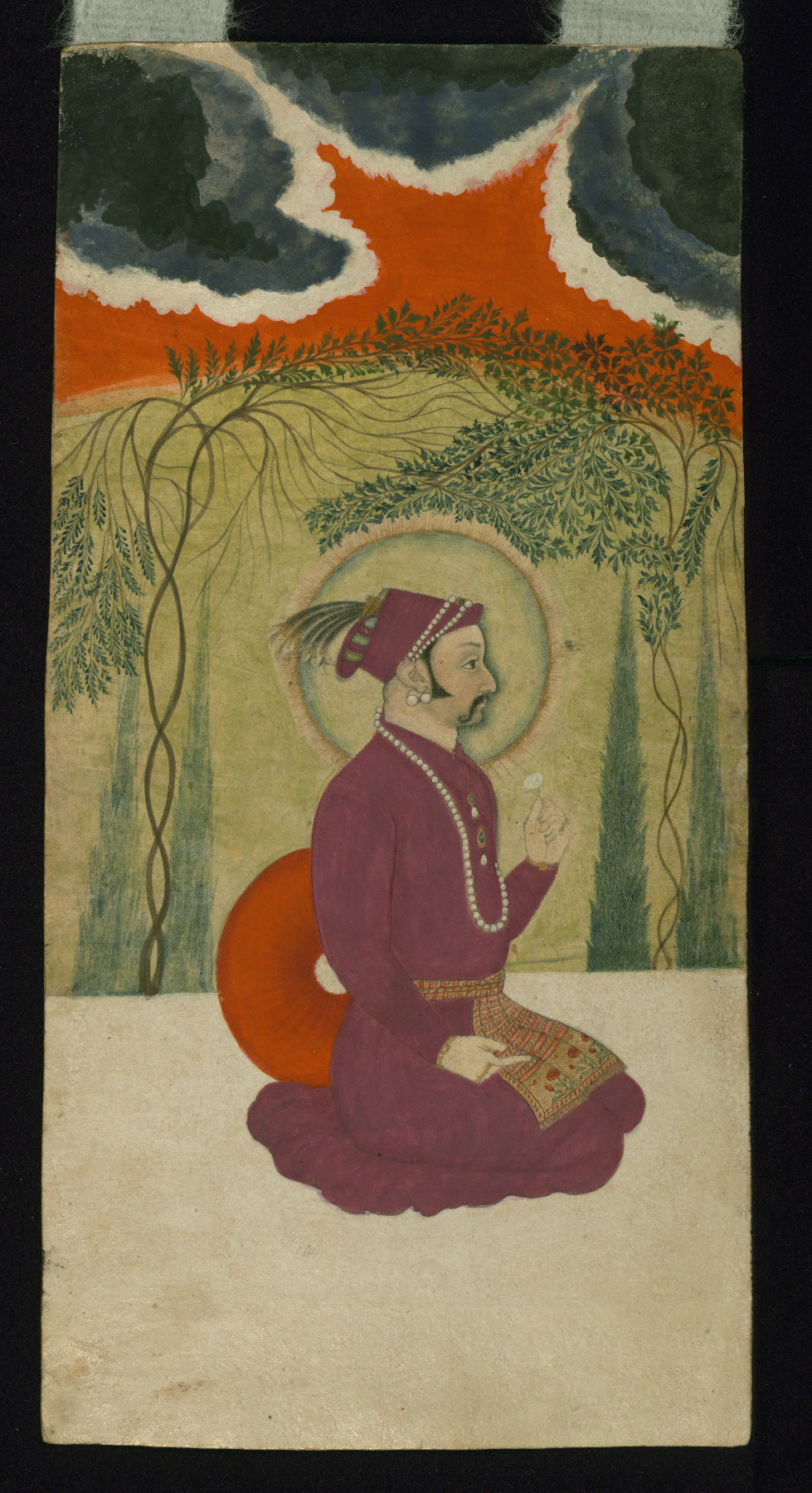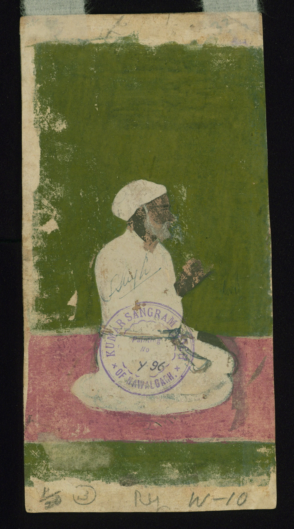 This painting depicts a seated official resting against an orange bolster. It is attributable to the twelfth century AH / eighteenth CE and was produced in India. On the back is another portrait, painted at a later stage.