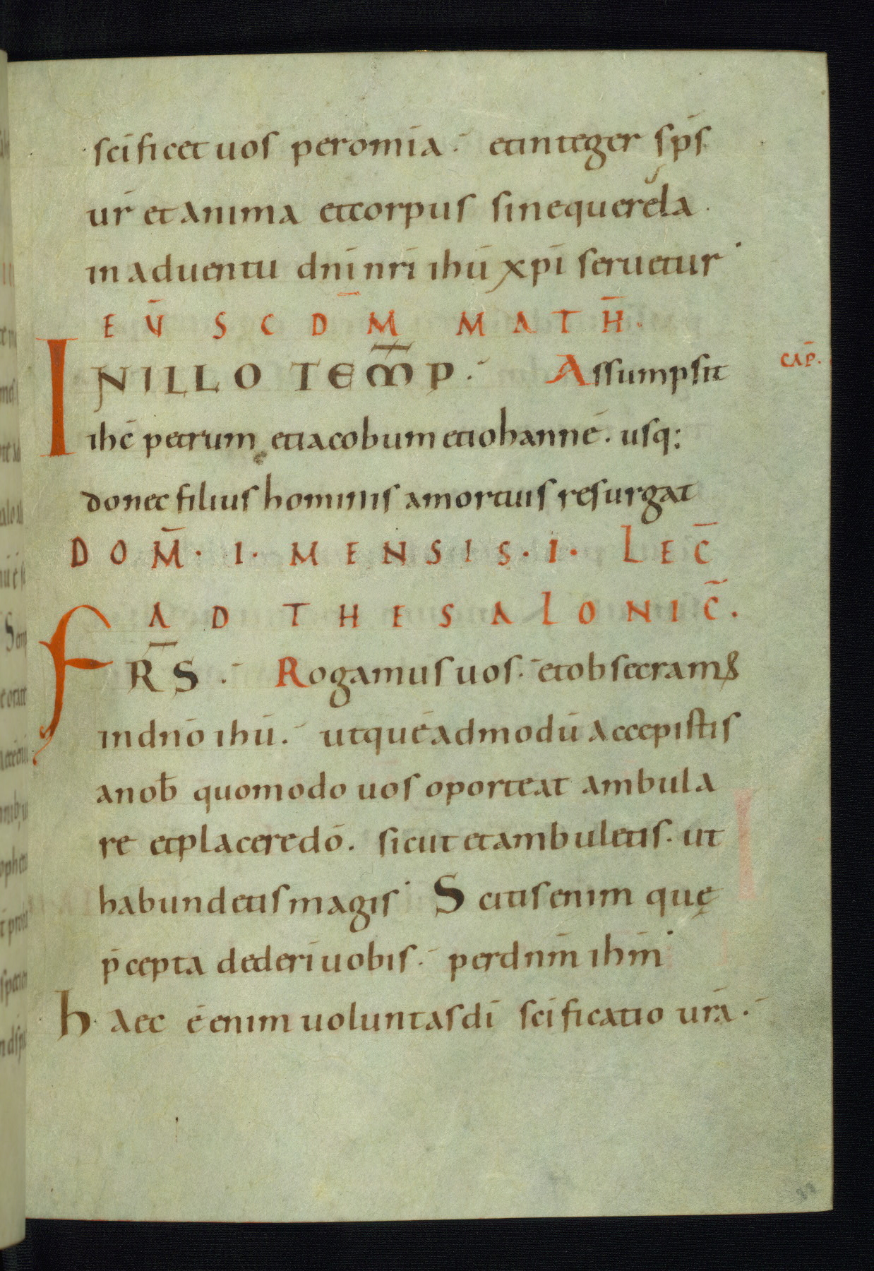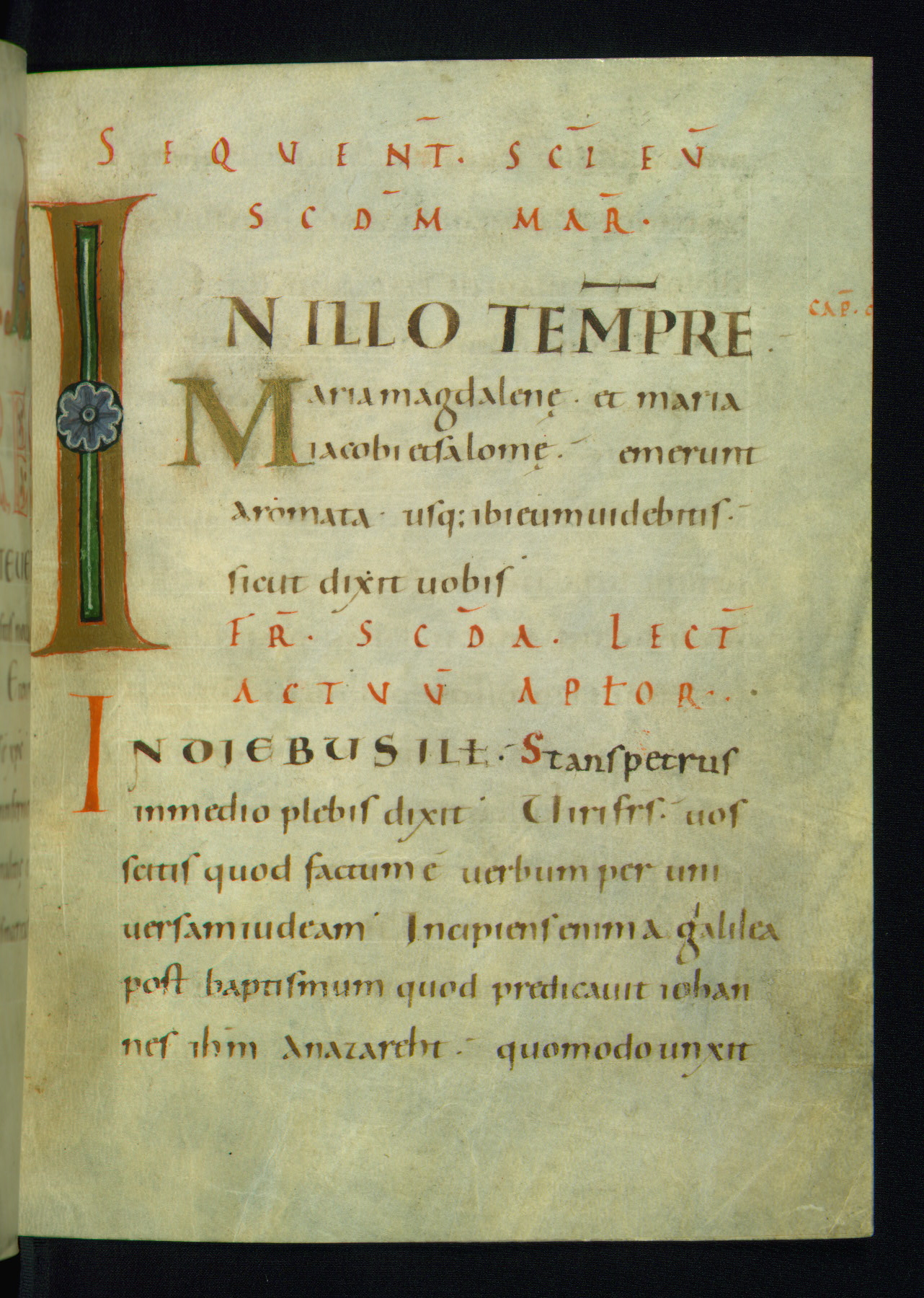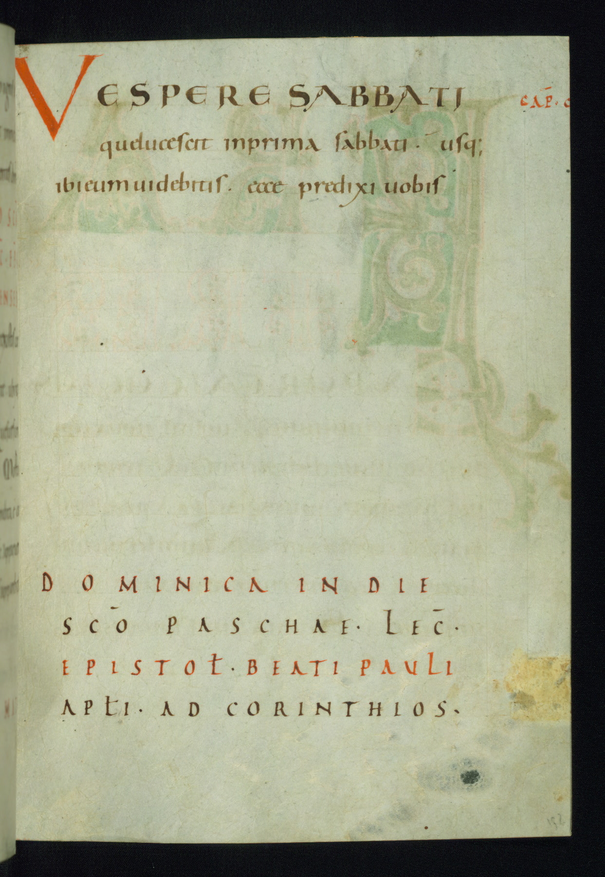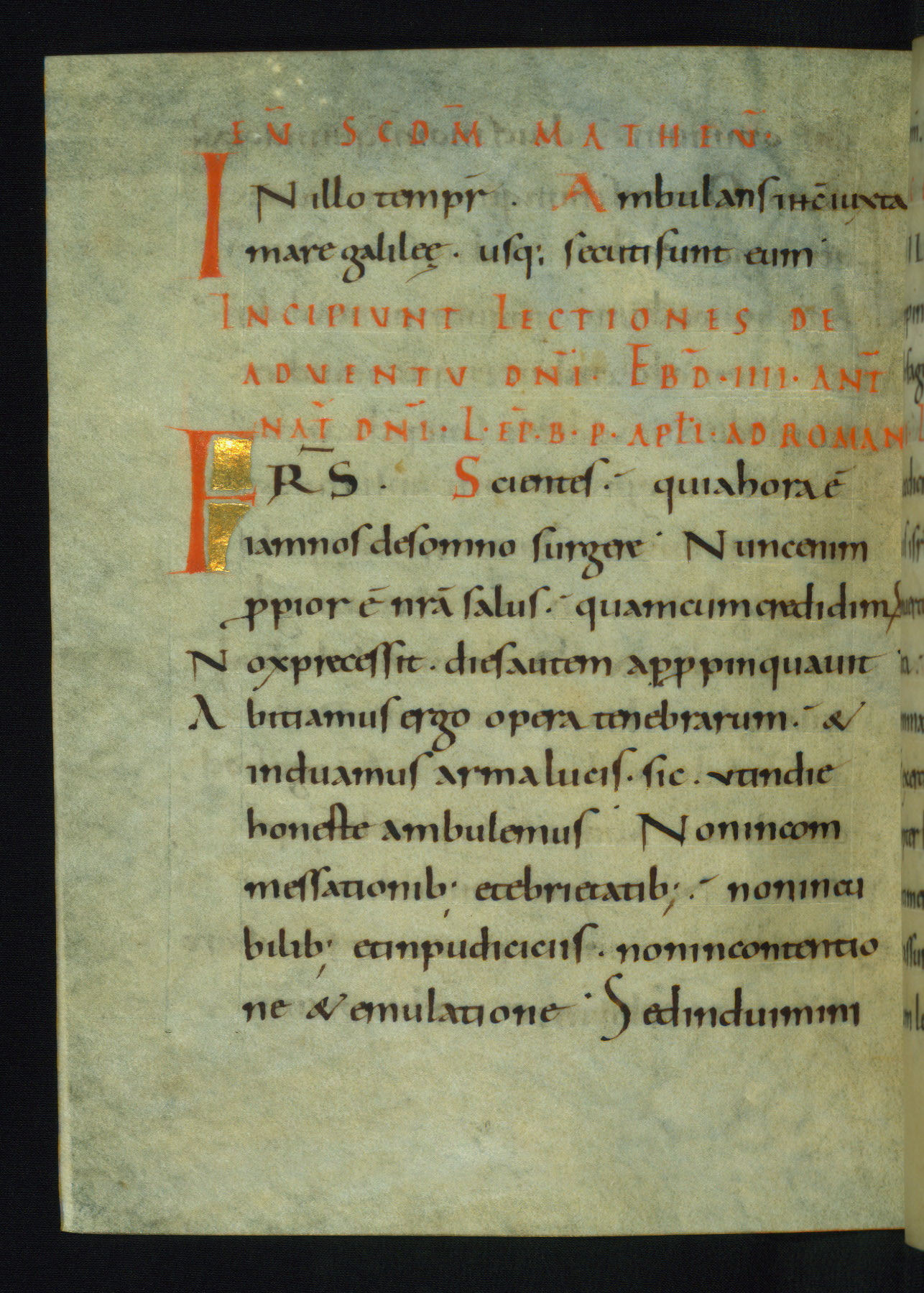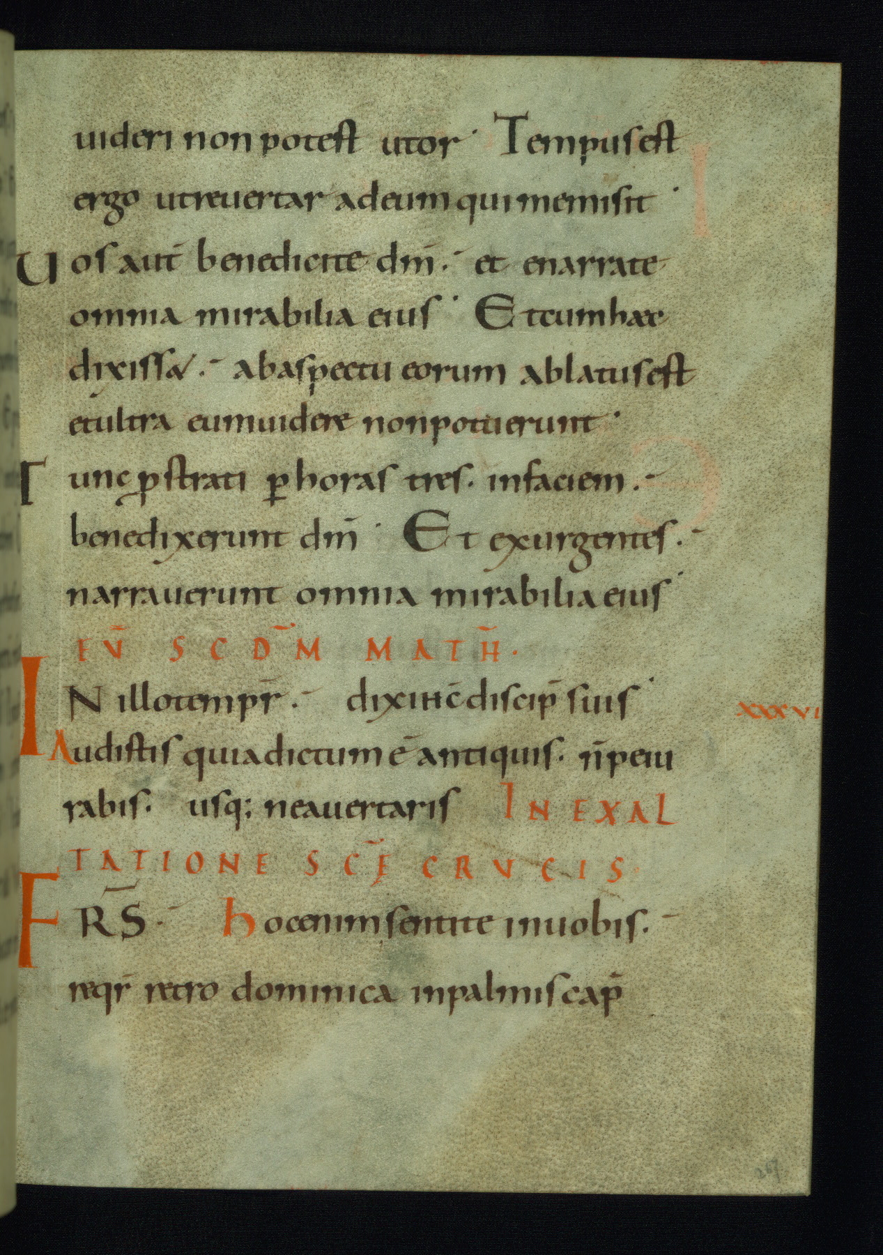 This Lectionary was created ca. 1000 in Trier. Written in a clear Caroline minuscule, it contains decorated initials at the openings of important readings. A set of illuminated letters marks the beginning of the Epistle and Gospel lessons for Easter; they display the hierarchy of scripts with capital letters decorated with gold leaf or drawn in red ink, followed by uncial and Caroline minuscule. Initials in orange, sometimes filled with gold, mark the divisions of the text. The book has been stylistically compared with Ottonian manuscripts, especially with a Psalter preserved in Trier (Stadtbibliothek, Ms. 7) illuminated by the so-called Master of the Registrum Gregorii.
