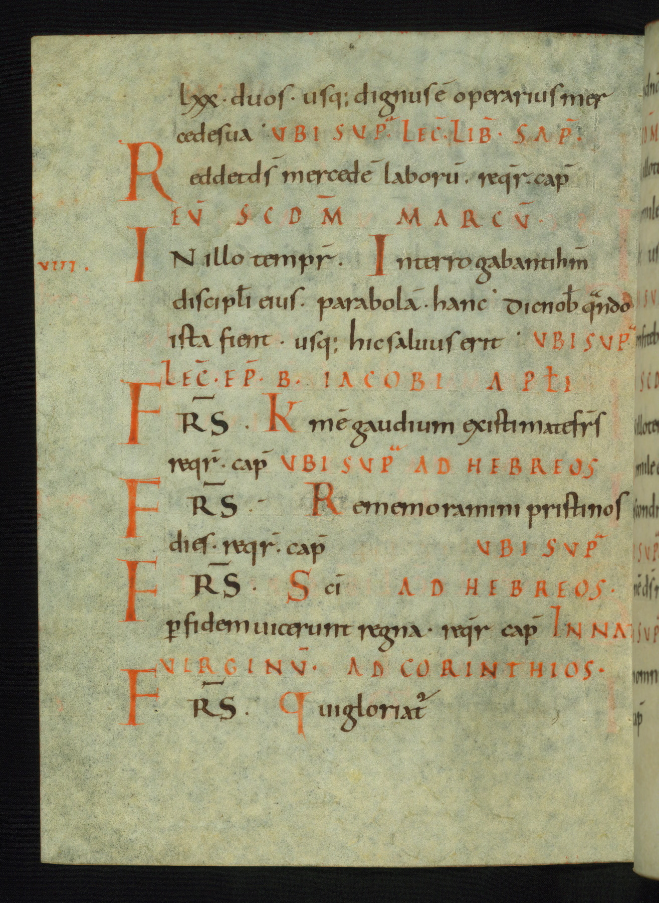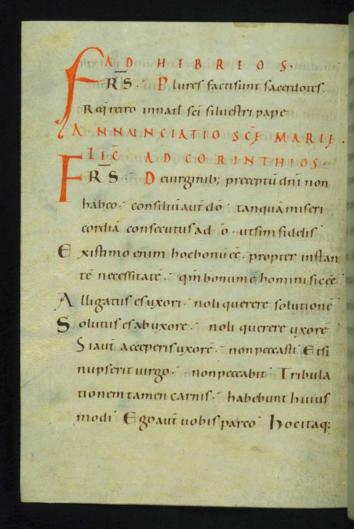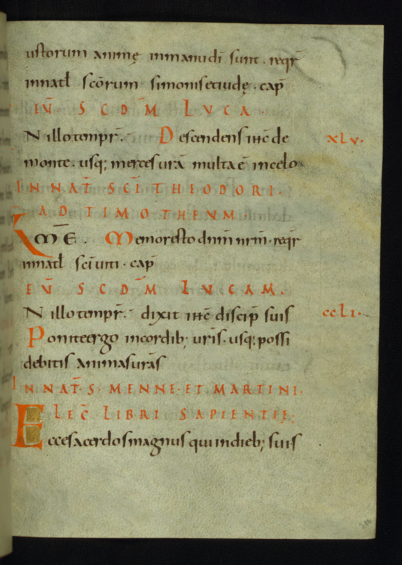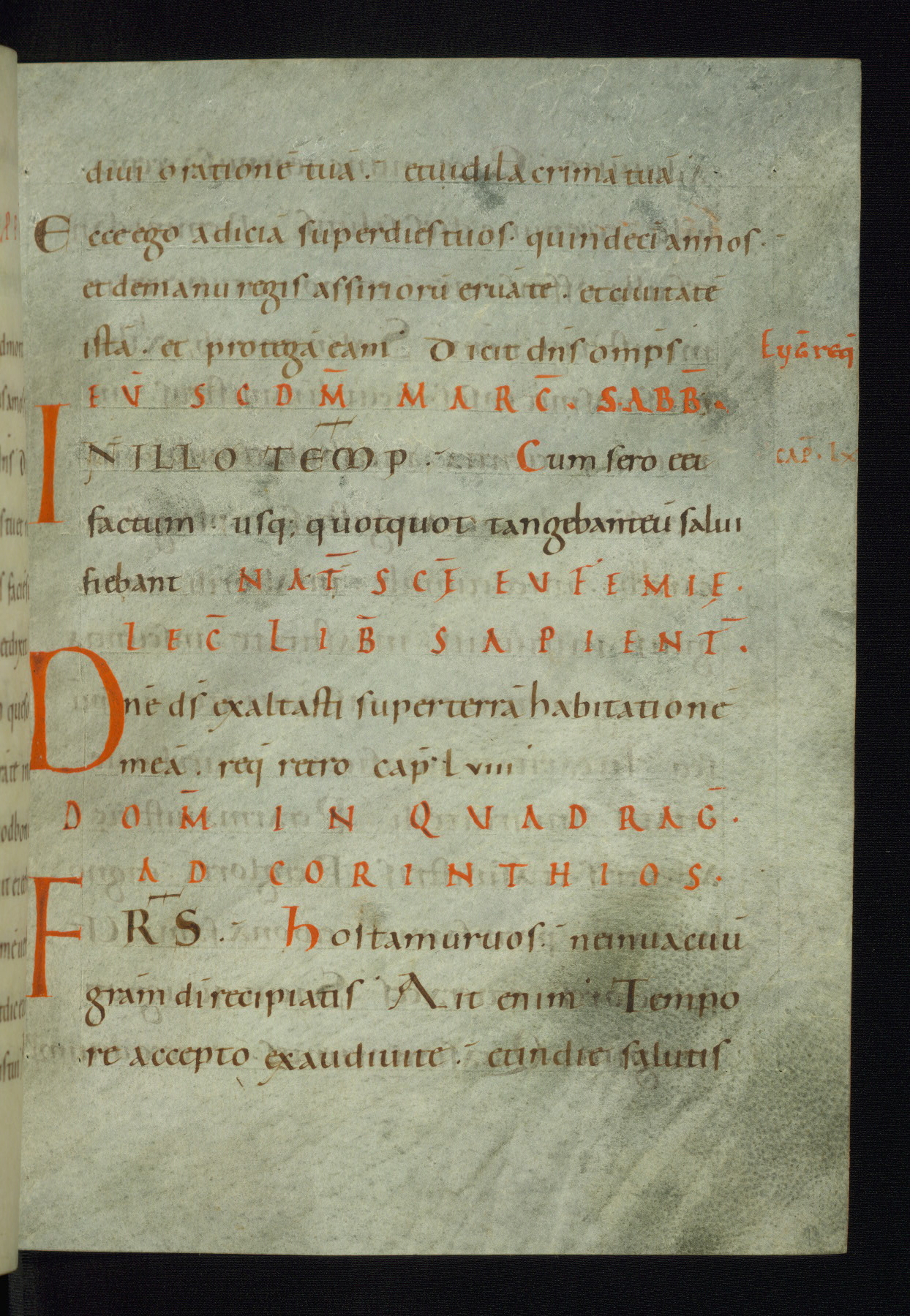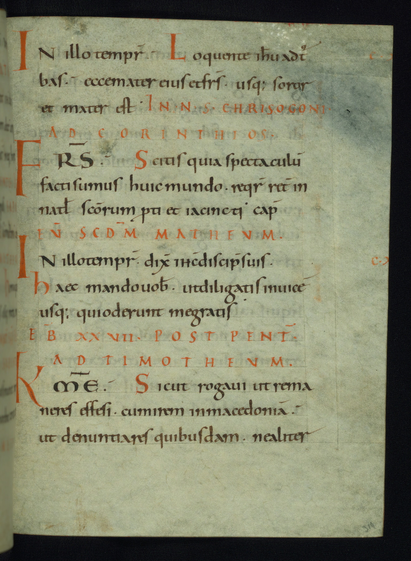 This Lectionary was created ca. 1000 in Trier. Written in a clear Caroline minuscule, it contains decorated initials at the openings of important readings. A set of illuminated letters marks the beginning of the Epistle and Gospel lessons for Easter; they display the hierarchy of scripts with capital letters decorated with gold leaf or drawn in red ink, followed by uncial and Caroline minuscule. Initials in orange, sometimes filled with gold, mark the divisions of the text. The book has been stylistically compared with Ottonian manuscripts, especially with a Psalter preserved in Trier (Stadtbibliothek, Ms. 7) illuminated by the so-called Master of the Registrum Gregorii.
